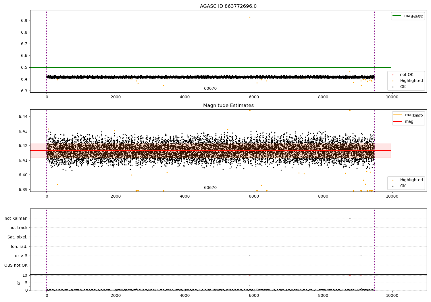 | OBSID | Time | Row | Col | N | Nok | Nout | ftrack | fdr3 | fdr5 | fok | ⟨ δ mag ⟩ 100s | ⟨ mag ⟩ | σmag | Comments |