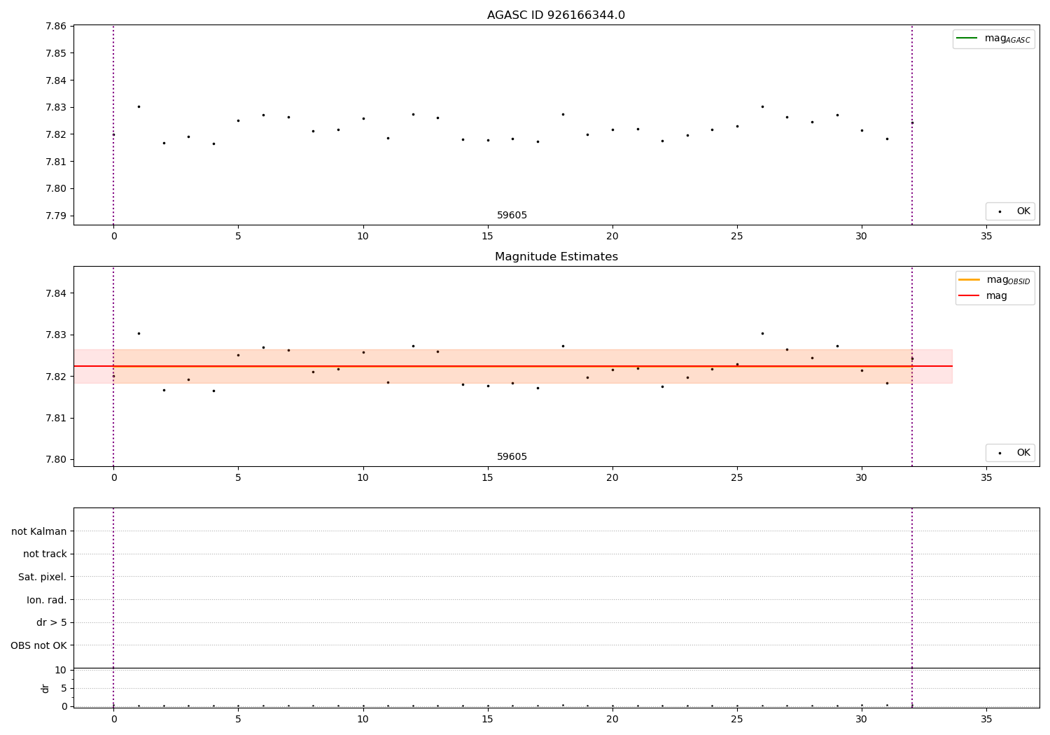| OBSID | Time | Row | Col | N | Nok | Nout | ftrack | fdr3 | fdr5 | fok | ⟨ δ mag ⟩ 100s | ⟨ mag ⟩ | σmag | Comments |