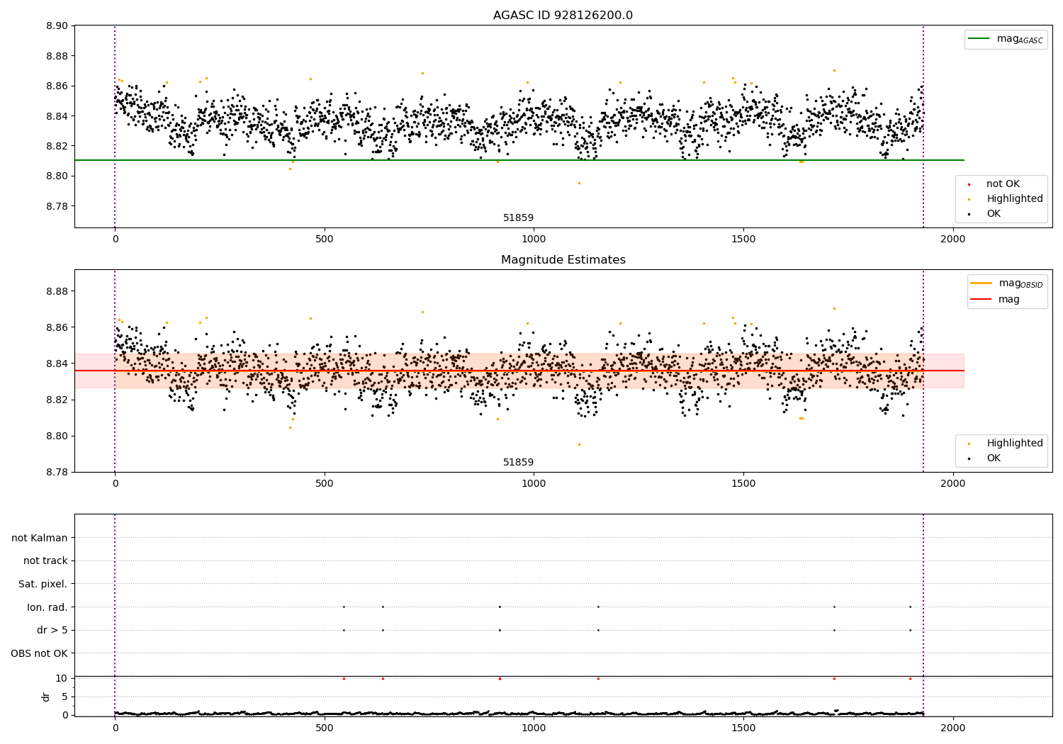| OBSID | Time | Row | Col | N | Nok | Nout | ftrack | fdr3 | fdr5 | fok | ⟨ δ mag ⟩ 100s | ⟨ mag ⟩ | σmag | Comments |