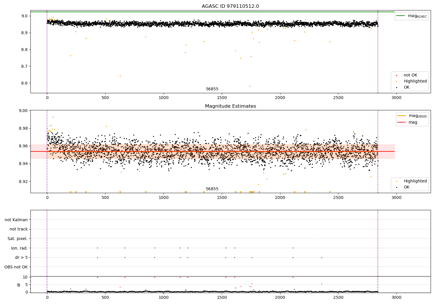 | OBSID | Time | Row | Col | N | Nok | Nout | ftrack | fdr3 | fdr5 | fok | ⟨ δ mag ⟩ 100s | ⟨ mag ⟩ | σmag | Comments |