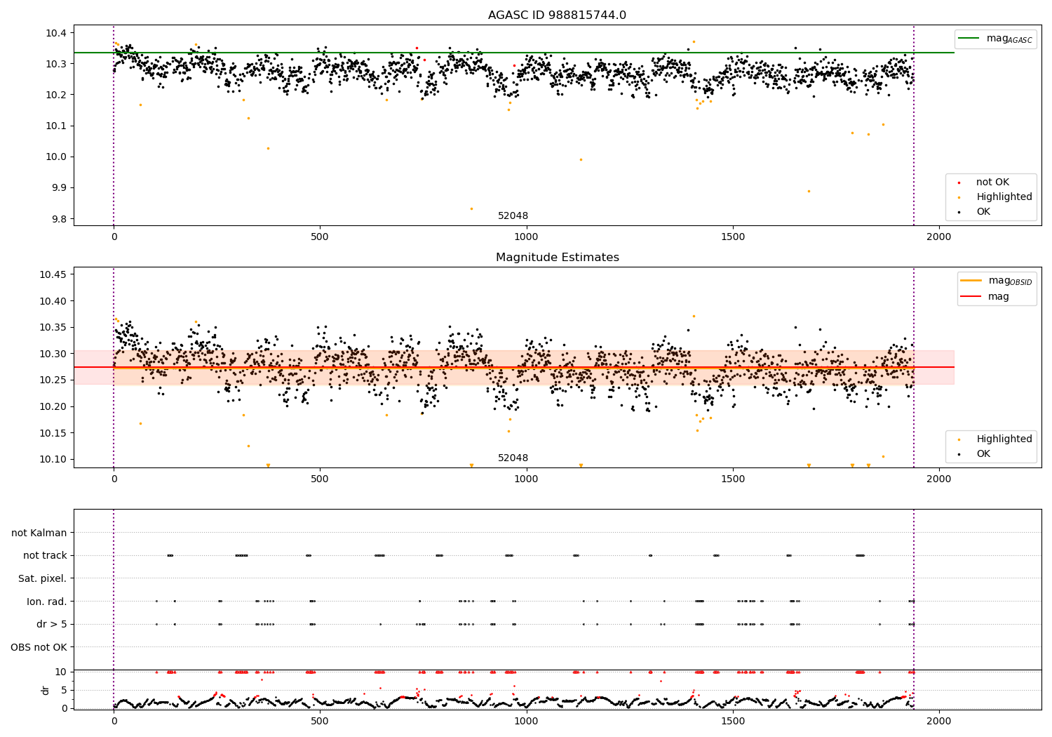 | OBSID | Time | Row | Col | N | Nok | Nout | ftrack | fdr3 | fdr5 | fok | ⟨ δ mag ⟩ 100s | ⟨ mag ⟩ | σmag | Comments |