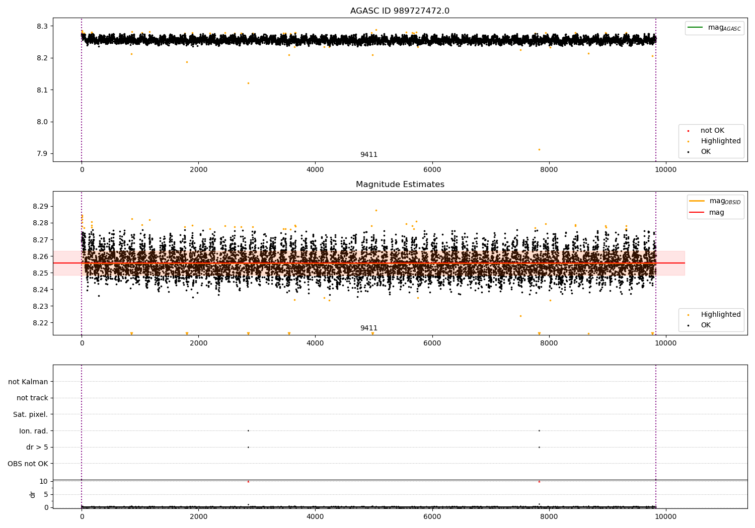| OBSID | Time | Row | Col | N | Nok | Nout | ftrack | fdr3 | fdr5 | fok | ⟨ δ mag ⟩ 100s | ⟨ mag ⟩ | σmag | Comments |