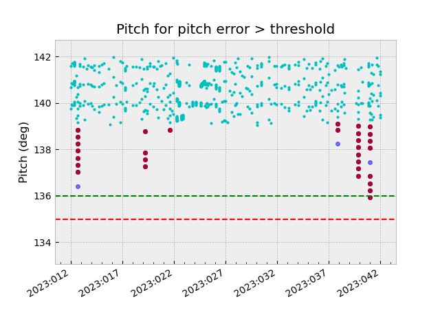 exclude_intervals: - 2018:086:04:26:00.000 2018:086:04:28:00.000 - 2018:293:01:16:00.000 2018:293:01:46:00.000 - 2021:295:03:44:20.000 2021:295:03:44:30.000 - 2021:296:10:40:00.000 2021:297:00:00:00.000 - 2022:293:16:00:00.000 2022:296:16:00:00.000 - 2023:044:17:41:38.757 2023:048:03:49:31.349 spm_pitch_limit: 135.0 spm_pitch_warning: 136.0 get_large_pitch_roll_error_intervals: err_min: 2.0 # Minimum pitch / roll error dt_join: 10 # Join adjacent intervals within this time (secs) plot_pitch_for_data_with_large_errors: plot_pitch_min: 120.0 plot_roll_pitch_vs_time: plot_errs: false max_pitch_roll_time_plots: 10 plot_delta_vs_pitch_roll: err_lim: 2.0 # Allowed pitch/roll error within SPM limit plot_pitch_roll_spm_mp_constraints: err_caution: 1.0 err_warning: 2.0