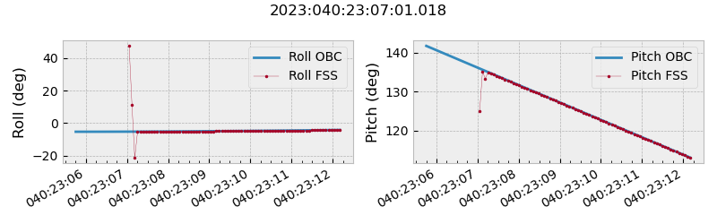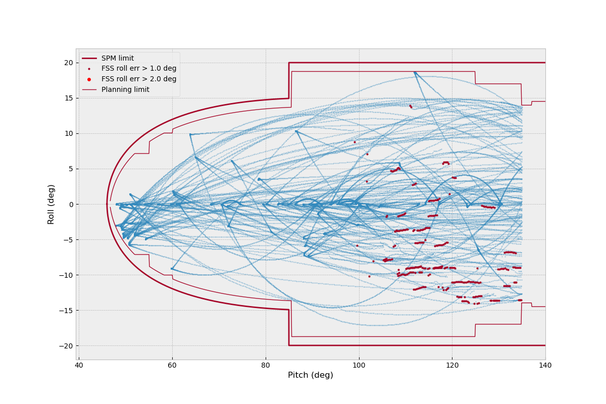 The plots below show the sun pitch angle for data points where the FSS-B derived off-nominal roll or pitch is different from the true off-nominal roll or pitch by more than 2.0 degrees. In other words, points when the FSS is reporting erroneous values. This is an expected situation outside of the nominal FSS FOV and when the FSS Sun Presence flag is False, but is anomalous for times when FSS Sun Presence is True (which means the OBC is allowed to use the data in active safing monitors).