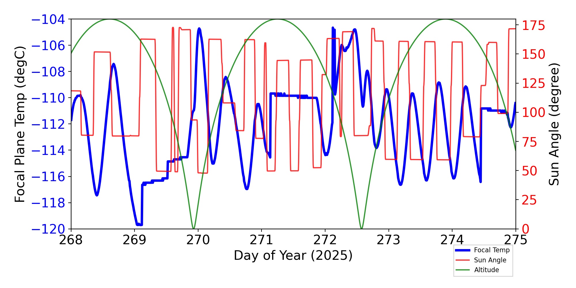 Weekly focal plane temperature with sun angle, earth angle, and altitude overplotted. Sun angle is the solar array angle, that is the angle between the sun and the optical axis (+X axis). The earth angle is the angle between earth and the ACIS radiator (+Z axis). Altitude varies from 34 kkm to 128 kkm.