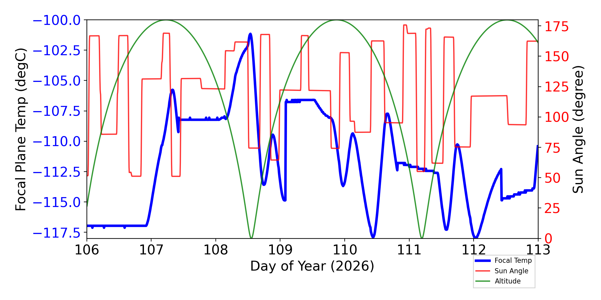 Weekly focal plane temperature with sun angle, earth angle, and altitude overplotted. Sun angle is the solar array angle, that is the angle between the sun and the optical axis (+X axis). The earth angle is the angle between earth and the ACIS radiator (+Z axis). Altitude varies from 34 kkm to 128 kkm.