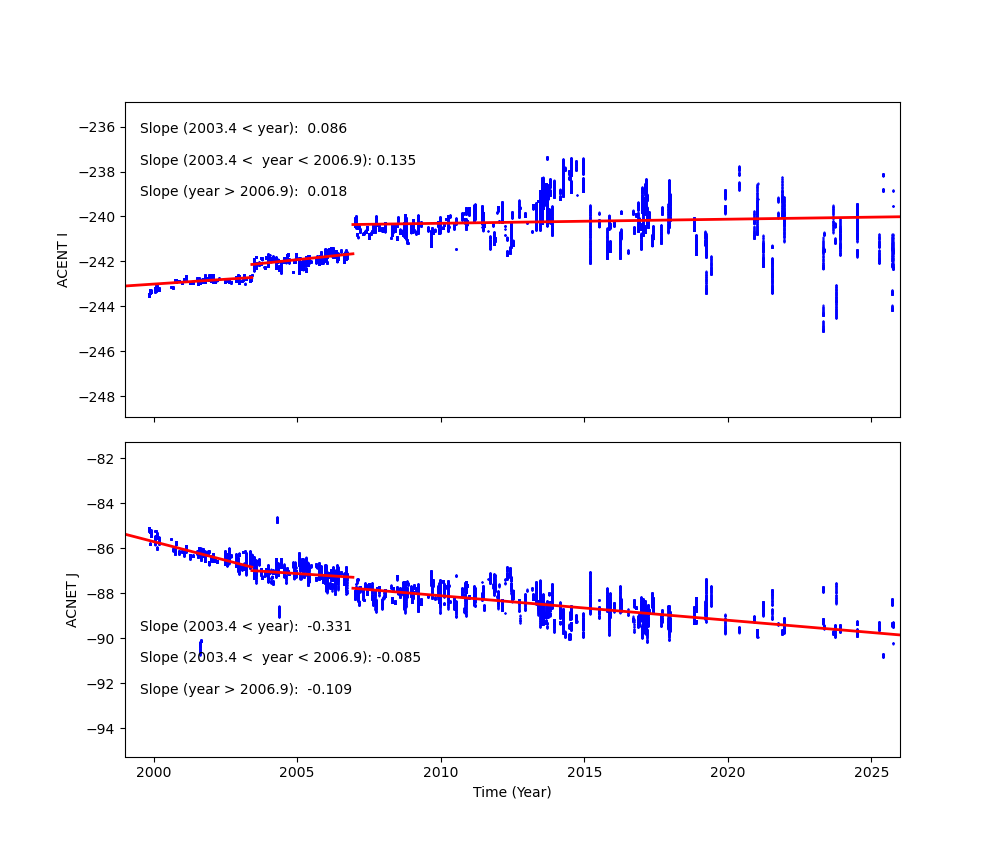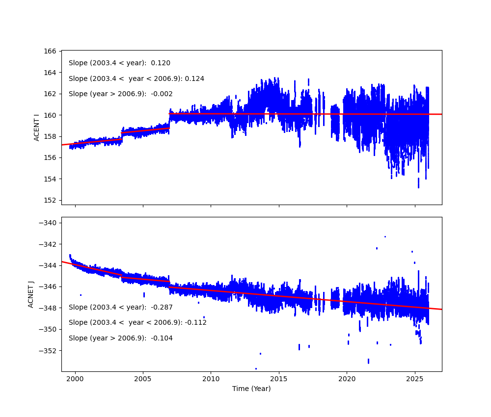 Fid light positions on ACA drift with time. The drift trends of Fid light 2 with ACIS-I and ACIS-S configurations are shown below.