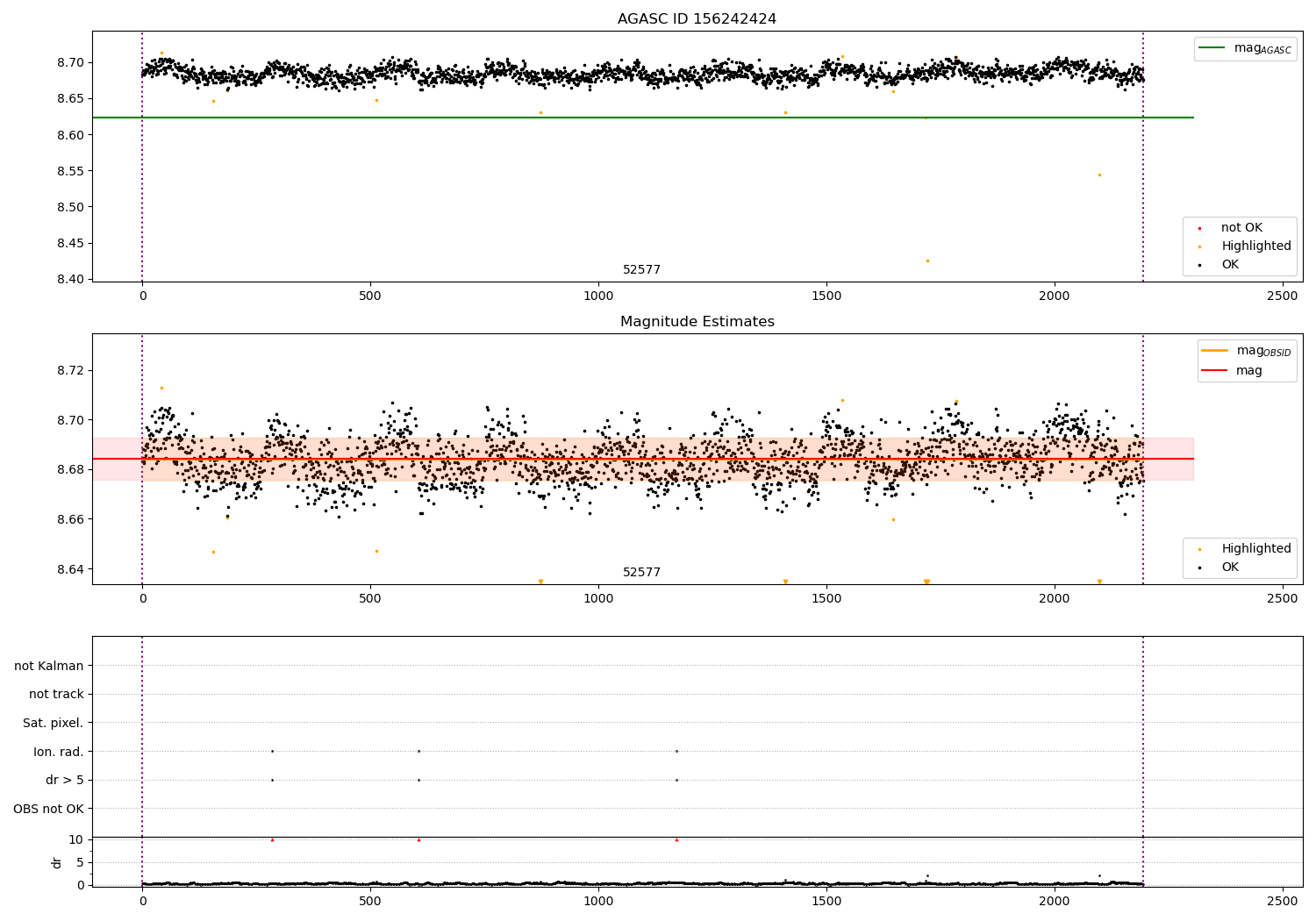 OBSID | Time | Row | Col | N | Nok | Nout | ftrack | fdr3 | fdr5 | fok | ⟨ δ mag ⟩ 100s | ⟨ mag ⟩ | σmag | Comments |