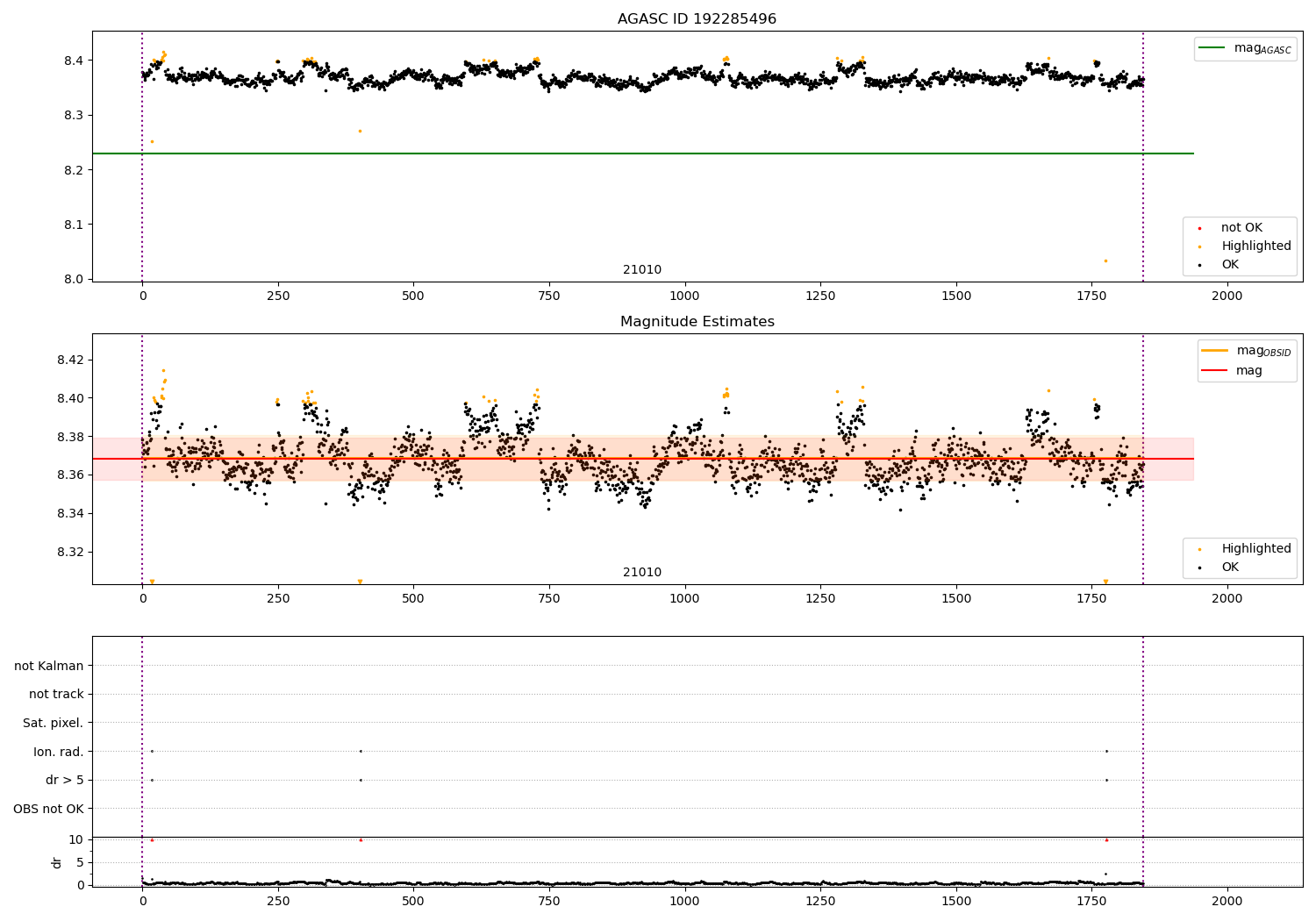 | OBSID | Time | Row | Col | N | Nok | Nout | ftrack | fdr3 | fdr5 | fok | ⟨ δ mag ⟩ 100s | ⟨ mag ⟩ | σmag | Comments |