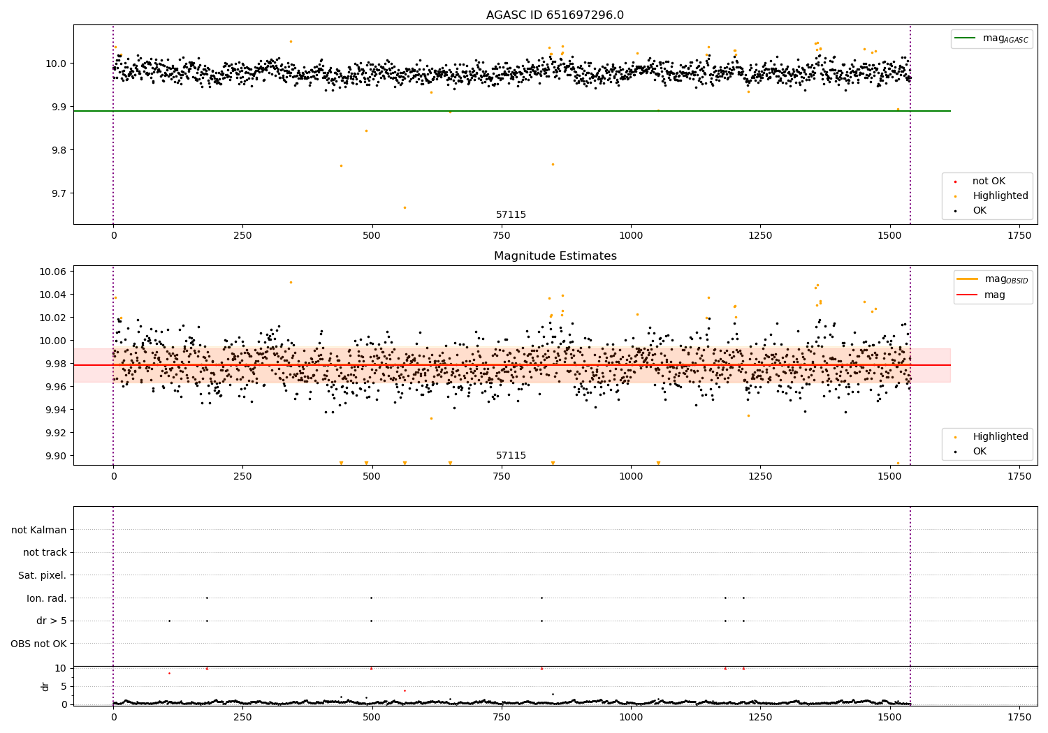 | OBSID | Time | Row | Col | N | Nok | Nout | ftrack | fdr3 | fdr5 | fok | ⟨ δ mag ⟩ 100s | ⟨ mag ⟩ | σmag | Comments |