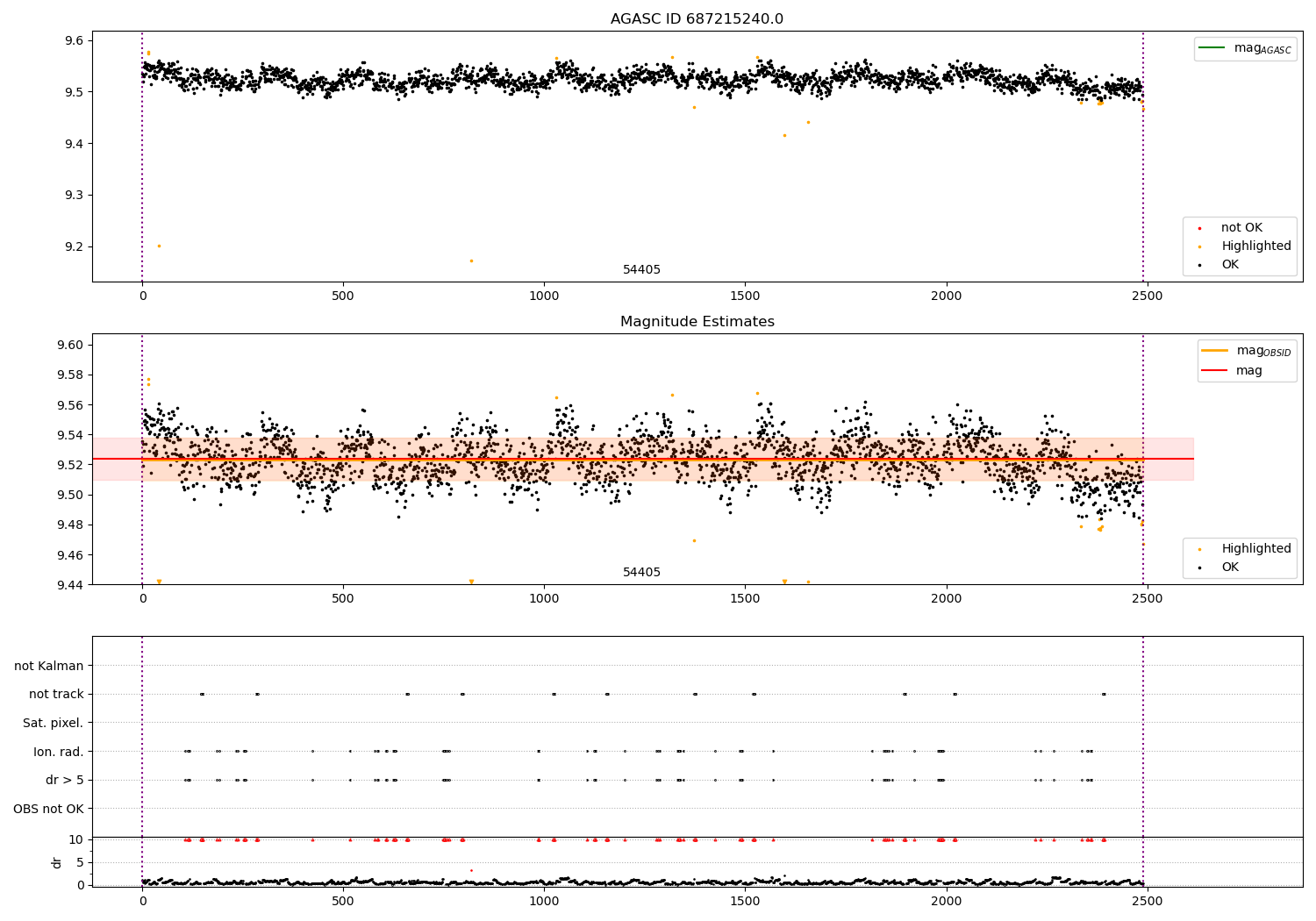 OBSID | Time | Row | Col | N | Nok | Nout | ftrack | fdr3 | fdr5 | fok | ⟨ δ mag ⟩ 100s | ⟨ mag ⟩ | σmag | Comments |
