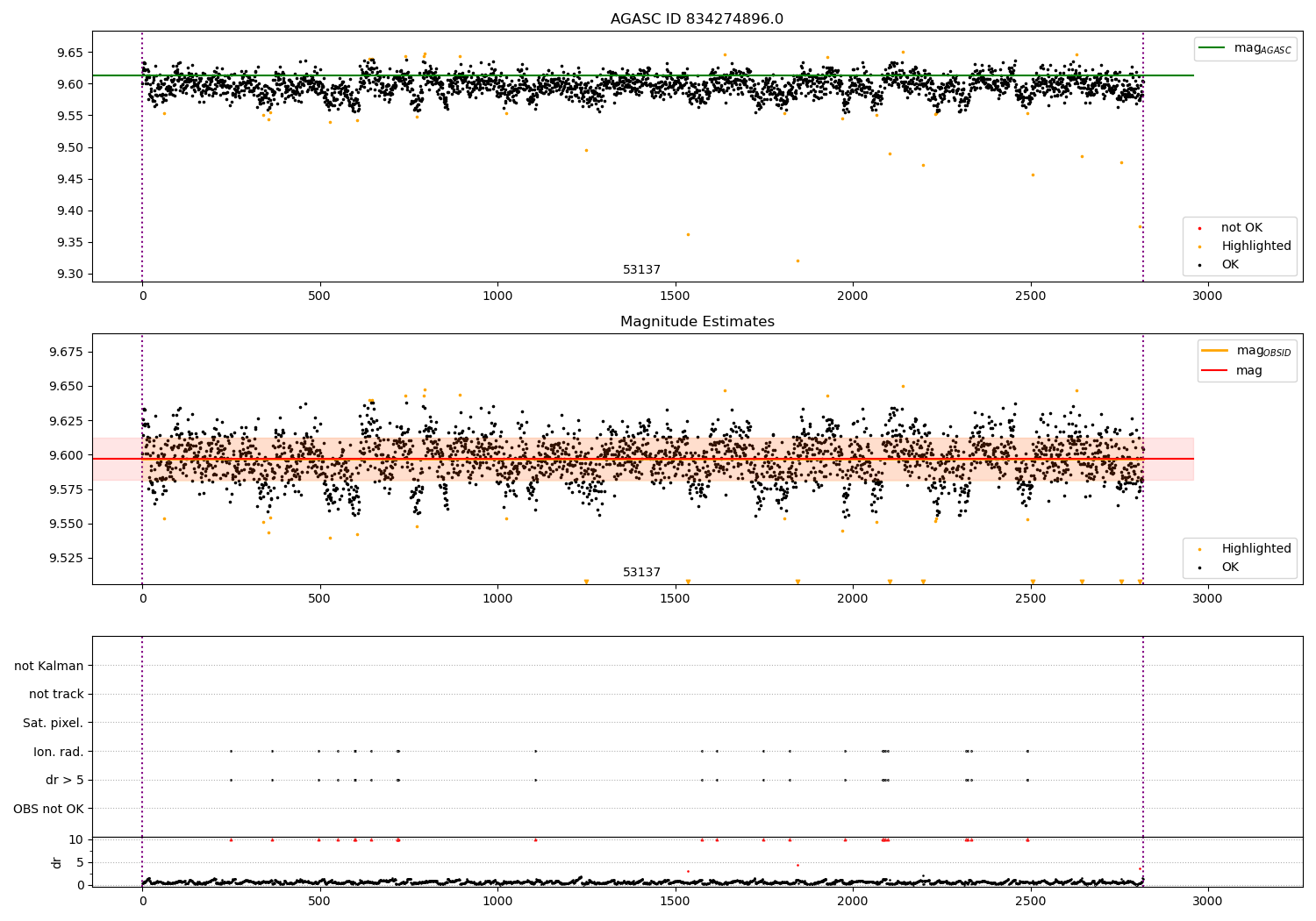 | OBSID | Time | Row | Col | N | Nok | Nout | ftrack | fdr3 | fdr5 | fok | ⟨ δ mag ⟩ 100s | ⟨ mag ⟩ | σmag | Comments |