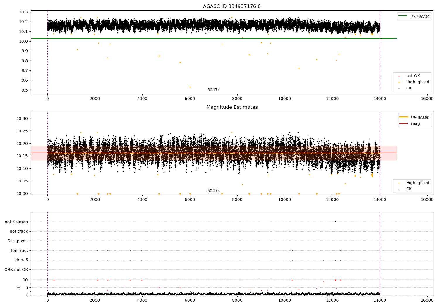 | OBSID | Time | Row | Col | N | Nok | Nout | ftrack | fdr3 | fdr5 | fok | ⟨ δ mag ⟩ 100s | ⟨ mag ⟩ | σmag | Comments |