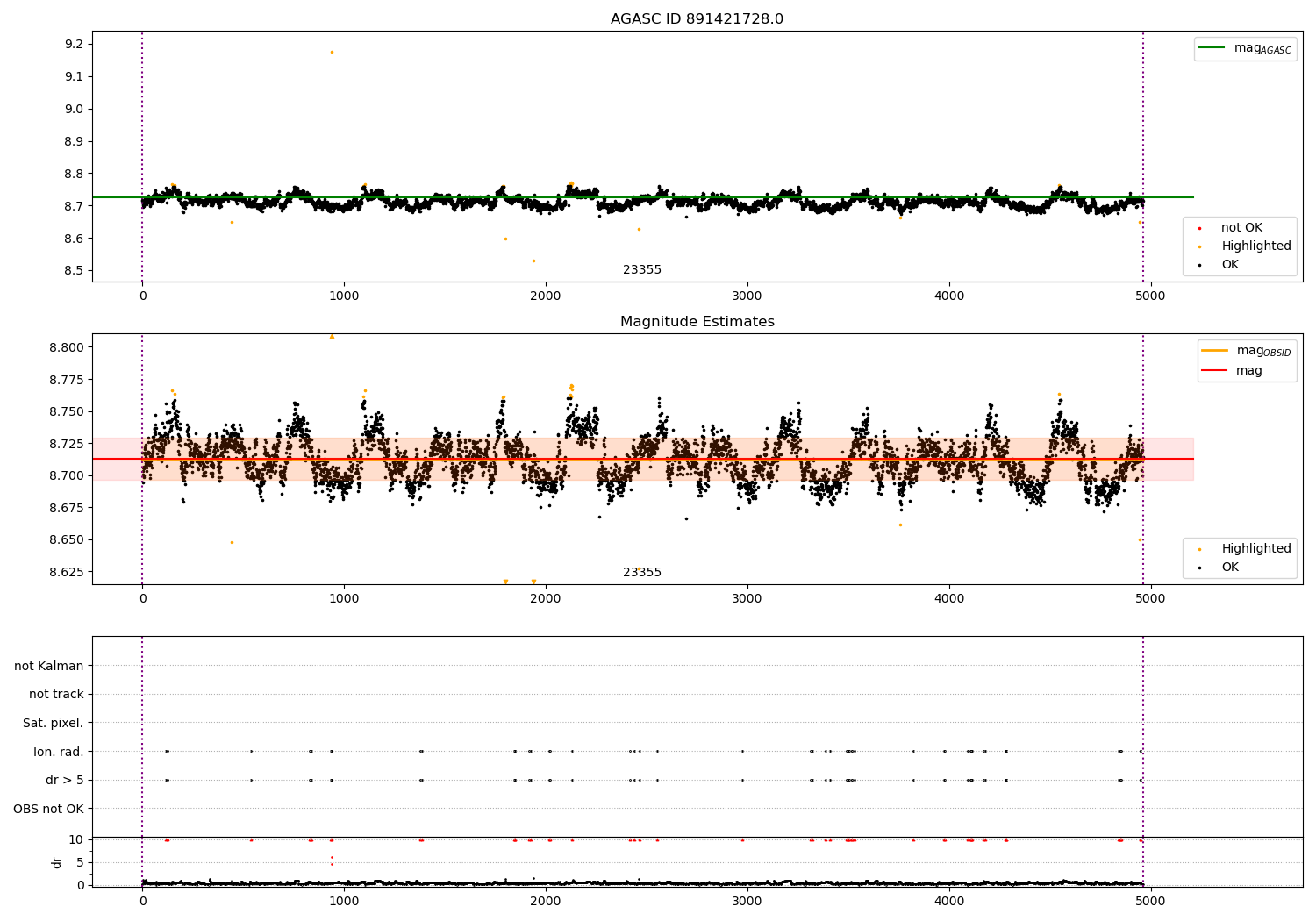 OBSID | Time | Row | Col | N | Nok | Nout | ftrack | fdr3 | fdr5 | fok | ⟨ δ mag ⟩ 100s | ⟨ mag ⟩ | σmag | Comments |