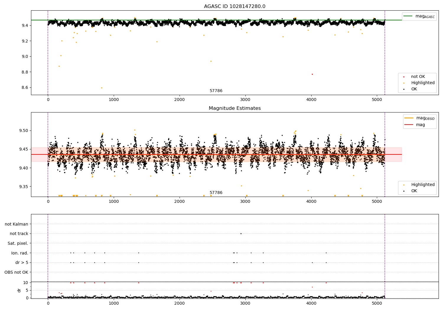 | OBSID | Time | Row | Col | N | Nok | Nout | ftrack | fdr3 | fdr5 | fok | ⟨ δ mag ⟩ 100s | ⟨ mag ⟩ | σmag | Comments |