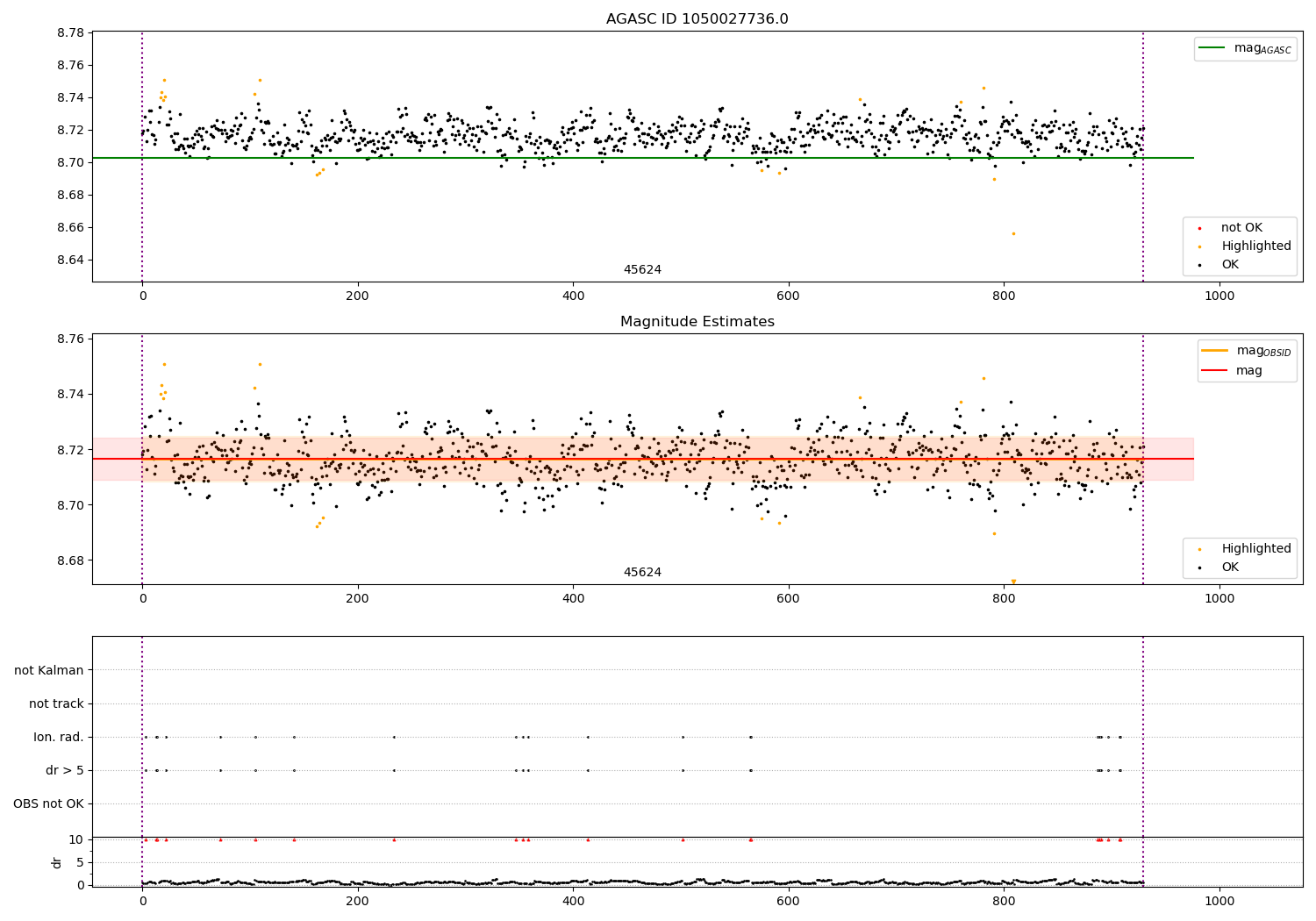 | OBSID | Time | Slot | Row | Col | N | Nok | Nout | ftrack | fdr3 | fdr5 | fok | ⟨ δ mag ⟩ 100s | ⟨ mag ⟩ | σmag | Comments |