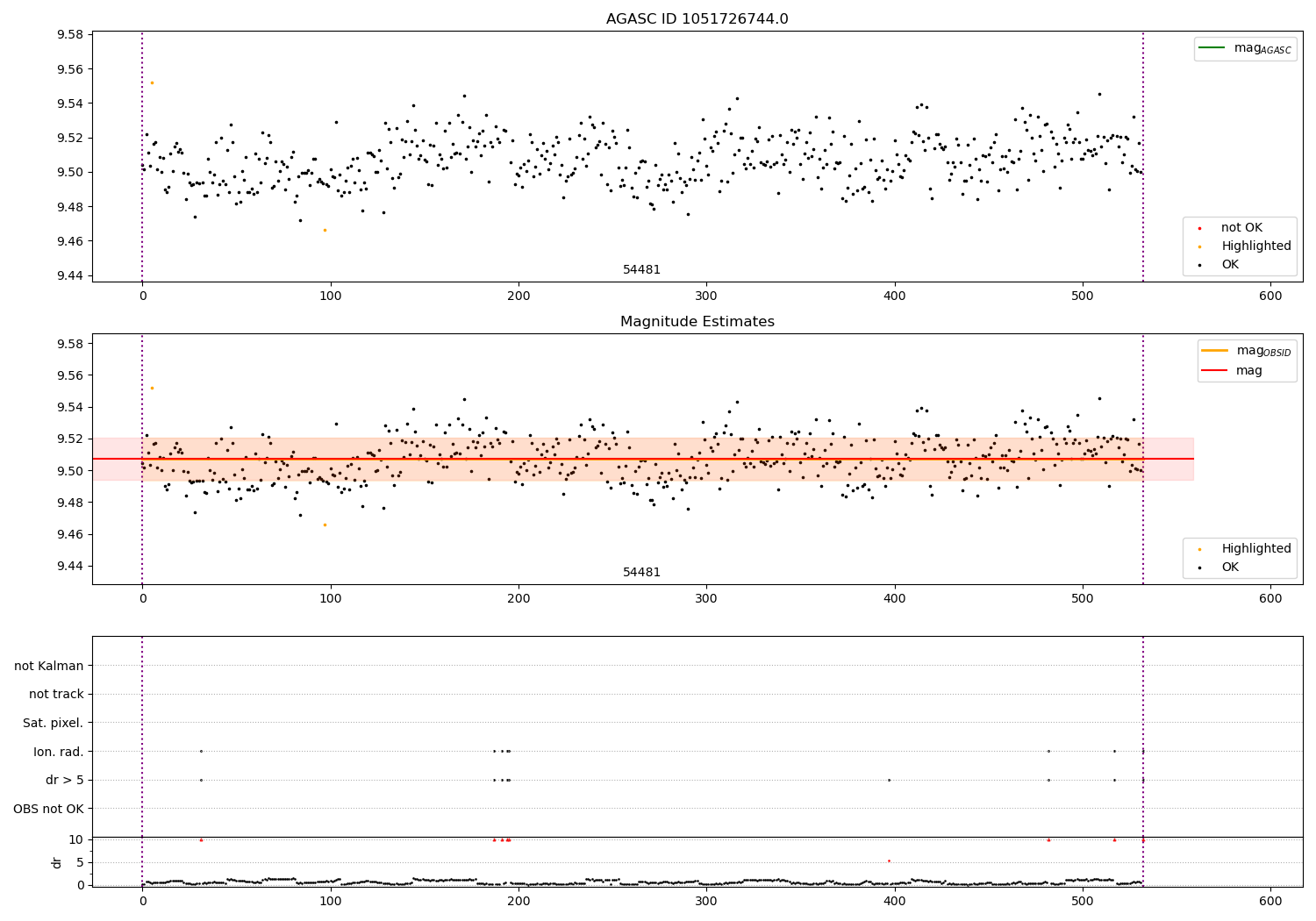 | OBSID | Time | Row | Col | N | Nok | Nout | ftrack | fdr3 | fdr5 | fok | ⟨ δ mag ⟩ 100s | ⟨ mag ⟩ | σmag | Comments |