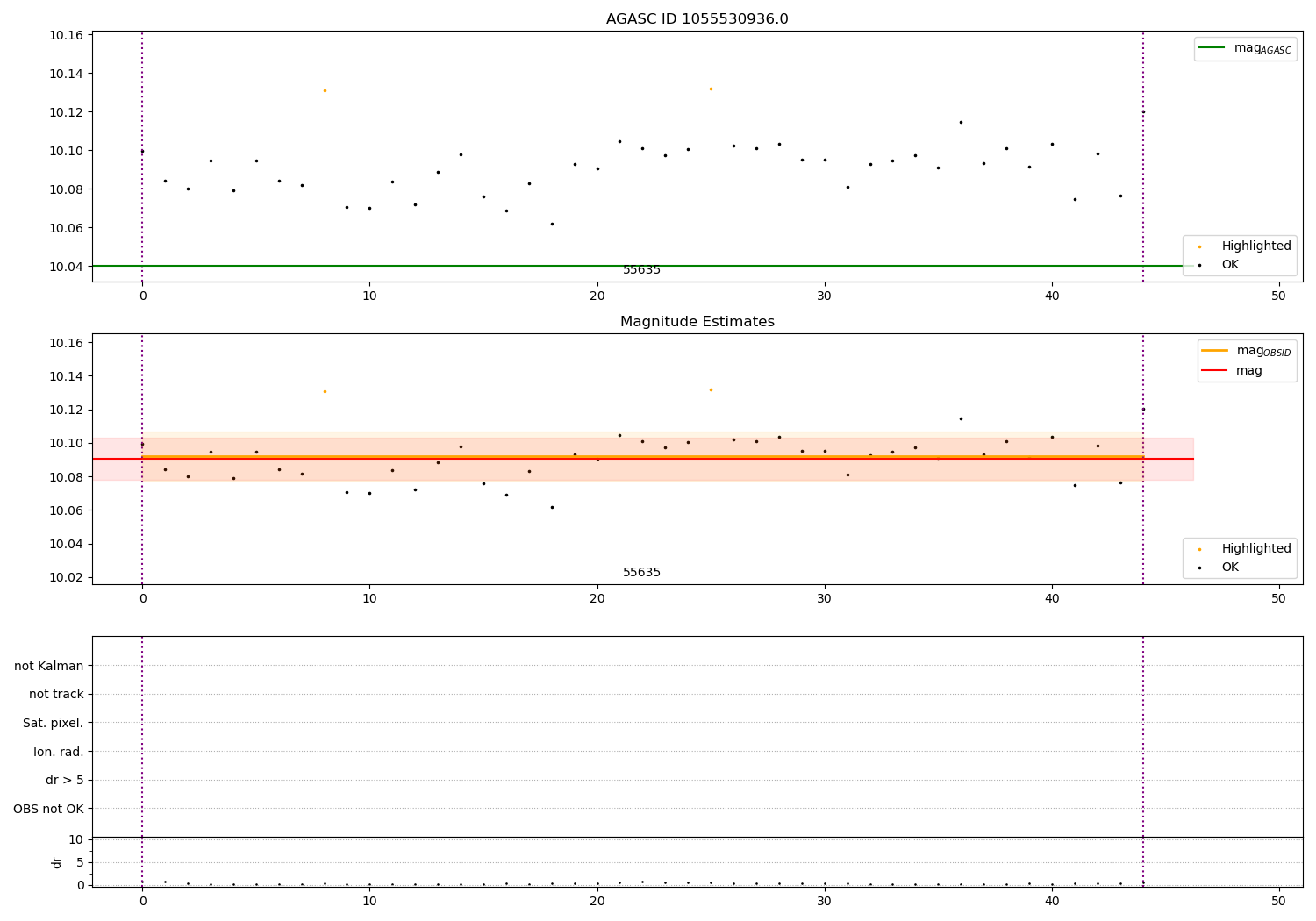 | OBSID | Time | Row | Col | N | Nok | Nout | ftrack | fdr3 | fdr5 | fok | ⟨ δ mag ⟩ 100s | ⟨ mag ⟩ | σmag | Comments |