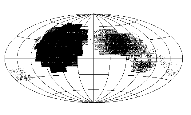 Figure 2. Same as Fig. 1, but for two of the 98-minute orbits of AXAF-S about two months after launch. The large dark forbidden region near (5h,+20deg) is caused by the presence of the Sun, while the Moon appears near (1h,0deg), and the orbital plane (which is partially obscured by the Earth) can be seen as a grey great circle. The restriction to a `normal observing zone' within +/-20deg of the orbital plane has not been taken into account in this diagram since observations outside this region are permitted.