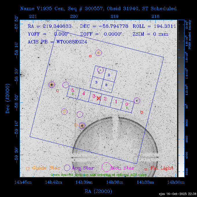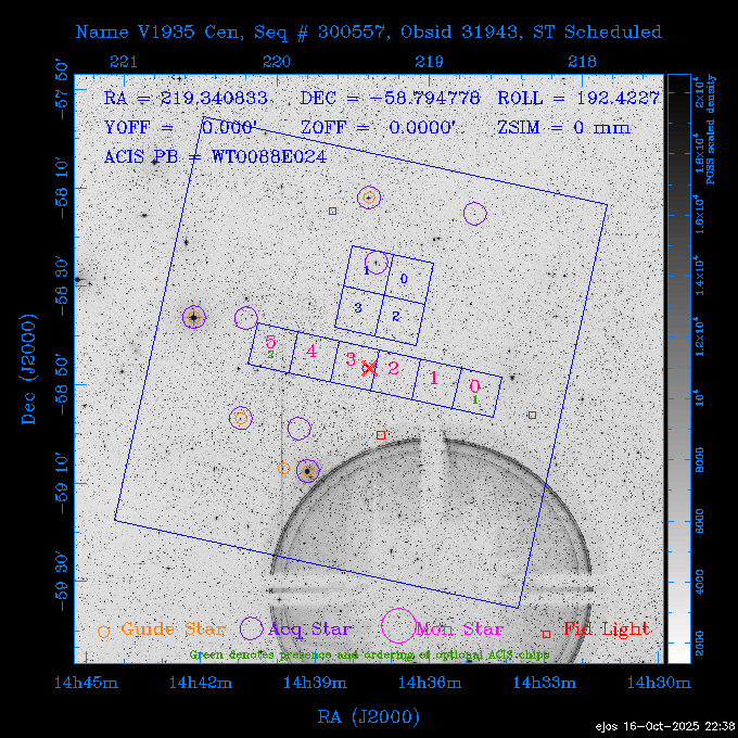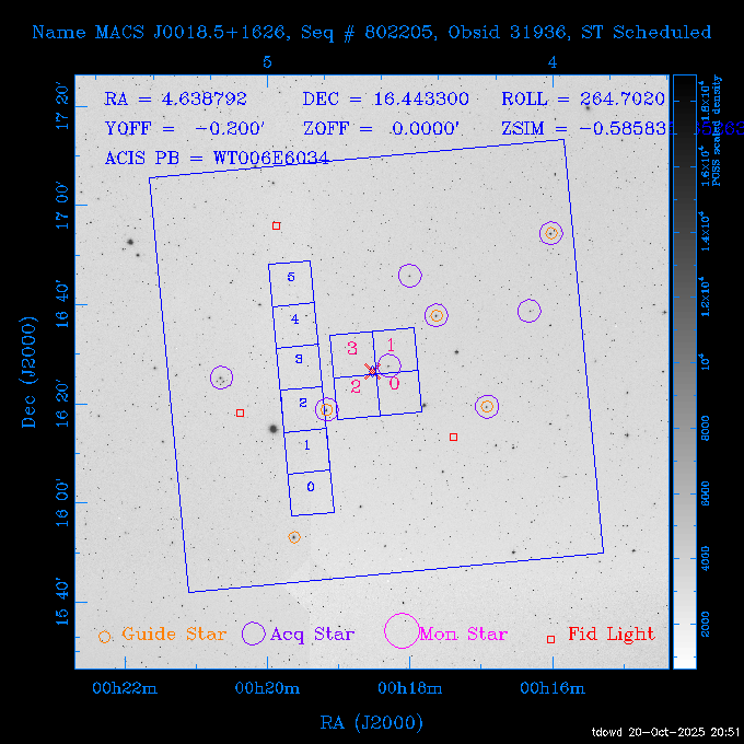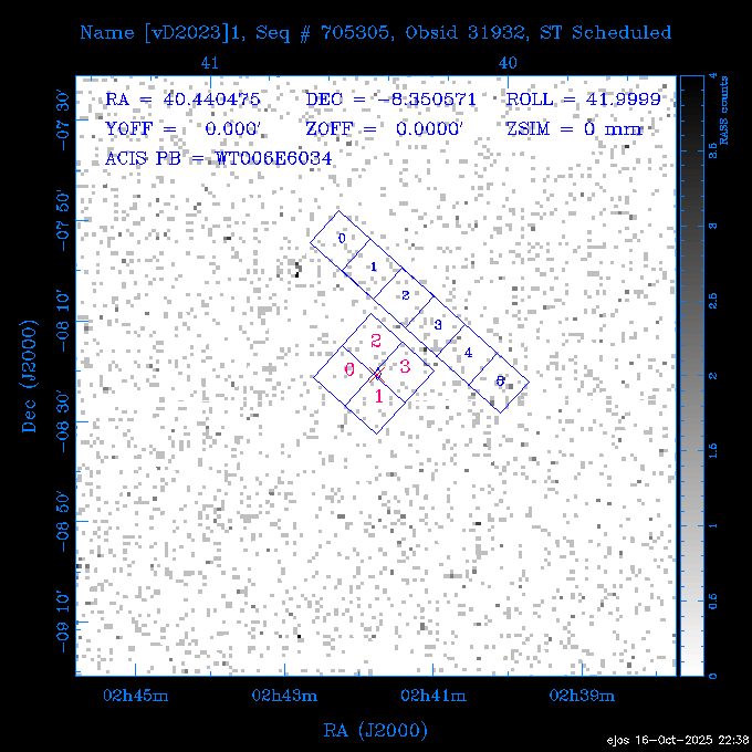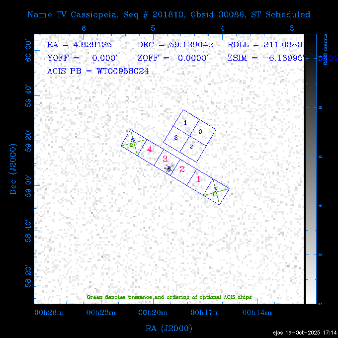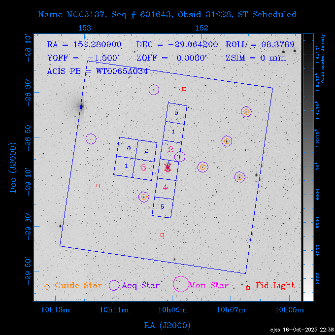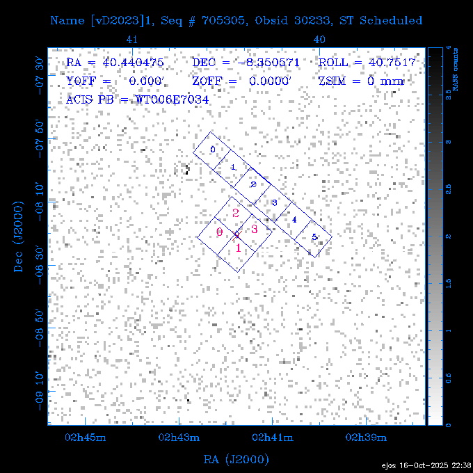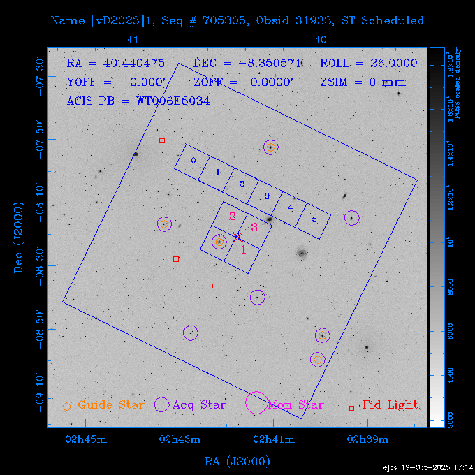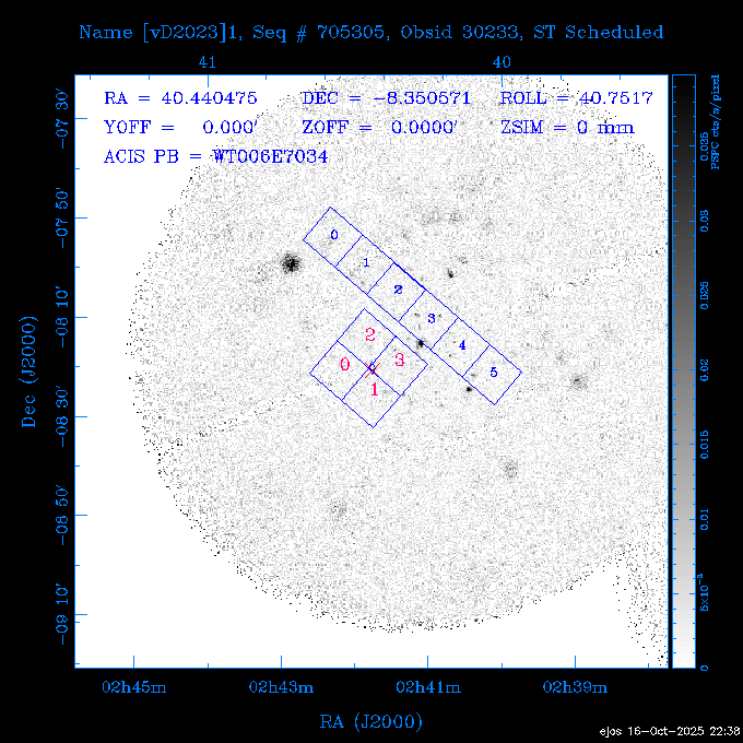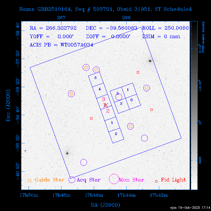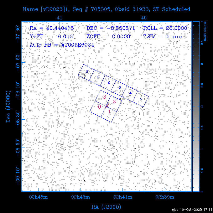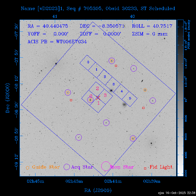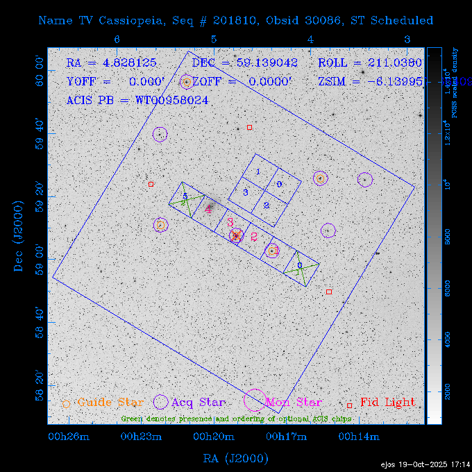 Seq # NB ObsID Constr. Target Start Time SI Grat Active Chips RA Dec Roll Pitch Slew Overlays ------ --- ----- ------- -------------------- --------------------- ----- ------ ---- ----------------- -------- -------- ------ ------ ------ ------------- 705305 31933 0 [vD2023]1 2025:294:20:08:04.815 10.0 ACIS-I NONE I0,I1,I2,I3 40.4405 -8.3506 26.00 156.12 106.02 dss pspc rass 503701 DDT 31951 2 GRB251016A 2025:294:23:37:17.202 10.0 ACIS-S NONE S2,S3 266.3028 -39.5601 250.00 59.94 121.68 dss pspc rass 705305 31934 0 [vD2023]1 2025:295:03:06:29.587 10.0 ACIS-I NONE I0,I1,I2,I3 40.4405 -8.3506 26.00 156.20 121.68 dss pspc rass 503701 DDT 31953 2 GRB251016A 2025:295:06:35:41.972 10.0 ACIS-S NONE S2,S3 266.3028 -39.5601 250.00 59.67 121.68 dss pspc rass ---- 42018 CAL-ER (IAT02) 2025:295:09:48:15.701 0.0 -- -- 1.1358 -44.3023 330.64 119.89 67.03 705402 31683 0 SDSS J014837.63+0600 2025:295:10:19:04.482 10.0 ACIS-I NONE I0,I1,I2,I3 27.1568 6.0056 20.00 174.86 67.33 dss pspc rass 201896 CCT 31926 0 V* CE Ant 2025:295:13:50:10.718 5.0 ACIS-S NONE S2,S3 160.6248 -33.6713 106.84 47.85 130.22 dss pspc rass 601635 30147 0 NGC1546 2025:295:15:43:50.207 31.4 ACIS-S NONE I3,S2,S3,S4 63.6518 -56.0609 37.53 106.17 66.71 dss pspc rass ---- 42017 CAL-ER (PER05) 2025:296:00:59:31.652 3.0 -- -- 30.4489 8.4611 46.07 175.88 73.84 ---- 42016 CAL-ER (PER06) 2025:296:07:00:00.000 3.0 -- -- 85.6457 -59.5880 56.58 95.34 82.87 ---- 42015 CAL-ER (PER07) 2025:296:08:12:49.320 3.0 -- -- 77.9432 -27.1745 58.45 117.90 33.64 ---- 42014 CAL-ER (PER08) 2025:296:11:00:00.000 3.0 -- -- 150.5000 -5.3000 79.77 56.99 72.11 ---- 42013 CAL-ER (PER09) 2025:296:12:32:09.276 3.0 -- -- 32.6476 8.8853 60.42 174.66 119.95 201818 30519 4 WR 11 2025:296:14:21:34.515 20.0 ACIS-S HETG S0,S1,S2,S3,S4,S5 122.3831 -47.3366 85.33 78.58 97.34 dss pspc rass ---- 42012 CAL-ER (IAT03) 2025:296:20:23:47.938 0.0 -- -- 354.0000 -42.0000 321.47 117.85 80.51 802205 30411 0 MACS J0018.5+1626 2025:296:20:58:23.800 10.0 ACIS-I NONE I0,I1,I2,I3 4.6388 16.4433 261.16 156.62 84.36 dss pspc rass 503554 31002 0 PSR J1813-1246 2025:297:00:21:39.653 14.0 ACIS-I NONE I0,I1,I2,I3 273.3490 -12.7668 271.00 63.34 94.94 dss pspc rass 802237 30539 0 1RXS J021649.0+70355 2025:297:04:55:29.176 30.0 ACIS-I NONE I0,I1,I2,I3 34.2042 70.5978 185.96 121.03 112.46 dss pspc rass 201810 30086 0 TV Cassiopeia 2025:297:13:46:14.340 30.0 ACIS-S HETG S1,S2,S3,S4 4.8281 59.1390 211.02 129.42 16.72 dss pspc rass 705503 CCT 31952 0 2MASX J20043345-1113 2025:297:22:42:22.066 10.0 ACIS-S NONE S2,S3 301.1394 -11.2311 282.14 89.51 92.83 dss pspc rass 705402 31937 0 SDSS J014837.63+0600 2025:298:02:05:43.173 10.0 ACIS-I NONE I0,I1,I2,I3 27.1568 6.0056 330.00 173.57 95.33 dss pspc rass 601672 29862 0 AM0126-525 2025:298:05:21:46.828 37.7 ACIS-S NONE I3,S2,S3,S4 22.1054 -52.6358 349.97 114.96 62.52 dss pspc rass ---- 42011 CAL-ER (PER10) 2025:298:16:20:36.491 3.0 -- -- 30.9395 8.2226 13.73 175.88 64.17 ---- 42010 CAL-ER (PER11) 2025:298:23:00:00.000 3.0 -- -- 343.2184 -44.6733 310.94 108.90 80.21 ---- 42009 CAL-ER (PER12) 2025:299:01:55:00.000 0.9 -- -- 30.9395 8.2226 7.78 175.82 77.42 ---- 42008 CAL-ER (PER13) 2025:299:02:54:27.240 3.0 -- -- 166.2000 -47.0000 118.25 50.63 127.22 ---- 42007 CAL-ER (PER14) 2025:299:04:32:05.061 0.9 -- -- 256.3285 3.7973 290.31 48.37 144.59 802205 31935 0 MACS J0018.5+1626 2025:299:06:22:05.286 10.0 ACIS-I NONE I0,I1,I2,I3 4.6388 16.4433 264.35 154.62 106.37 dss pspc rass 705501 CCT 31923 0 2MASXiJ1802473-14545 2025:299:09:46:04.551 10.0 ACIS-S NONE S2,S3,S4 270.6974 -14.9152 275.66 58.20 98.19 dss pspc rass 802205 31936 0 MACS J0018.5+1626 2025:299:13:10:03.464 10.0 ACIS-I NONE I0,I1,I2,I3 4.6388 16.4433 264.72 154.39 98.17 dss pspc rass 201897 CCT 31927 0 HEP G355.212-00.921 2025:299:16:36:18.238 10.0 ACIS-I NONE I0,I1,I2,I3 264.3604 -33.4878 259.97 52.74 108.36 dss pspc rass 705402 31938 0 SDSS J014837.63+0600 2025:299:20:05:28.282 10.0 ACIS-I NONE I0,I1,I2,I3 27.1568 6.0056 330.12 172.31 121.50 dss pspc rass