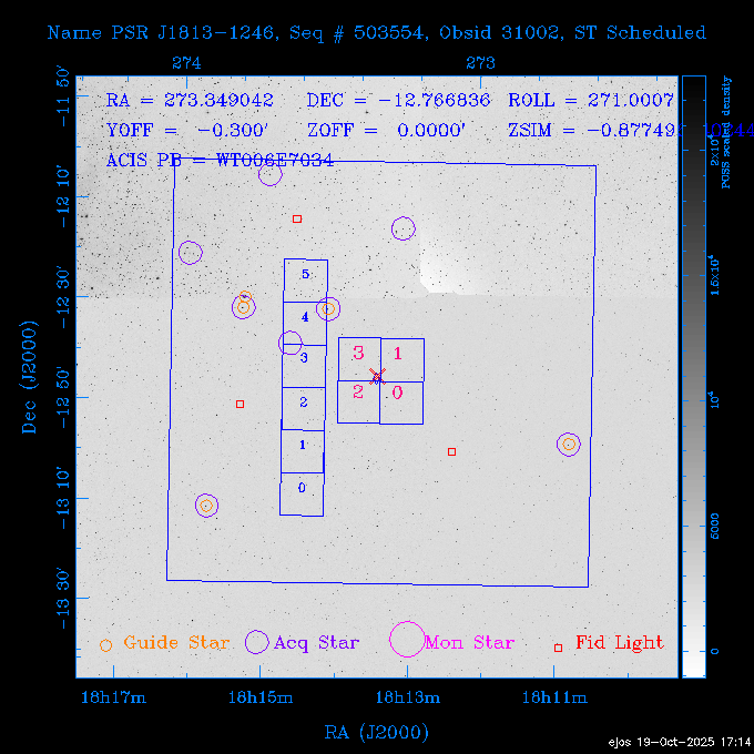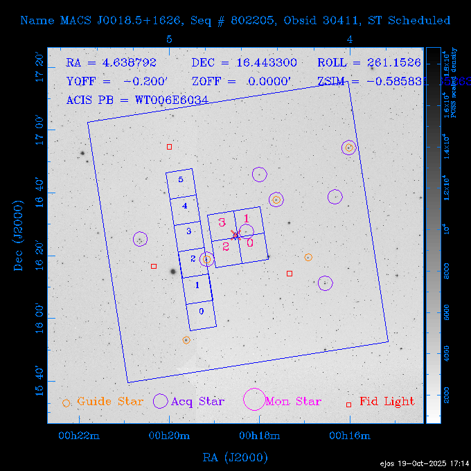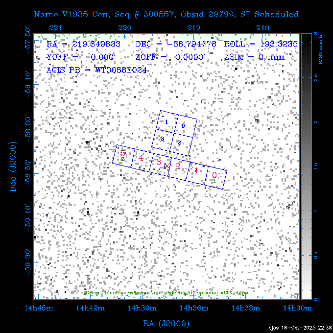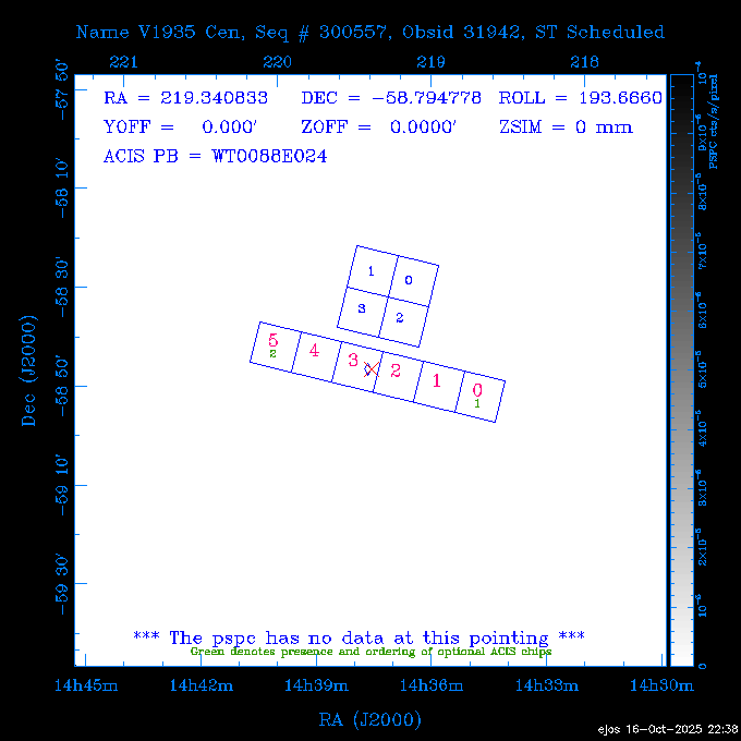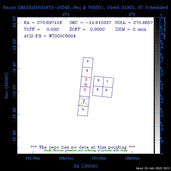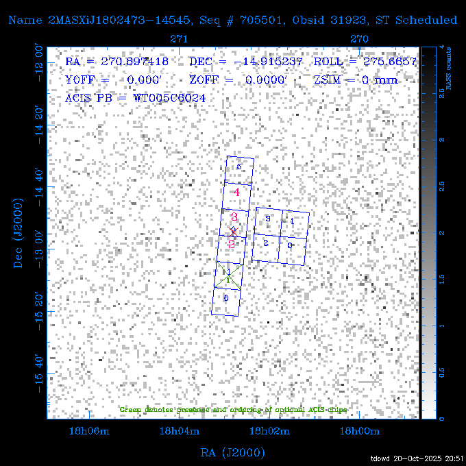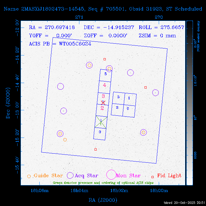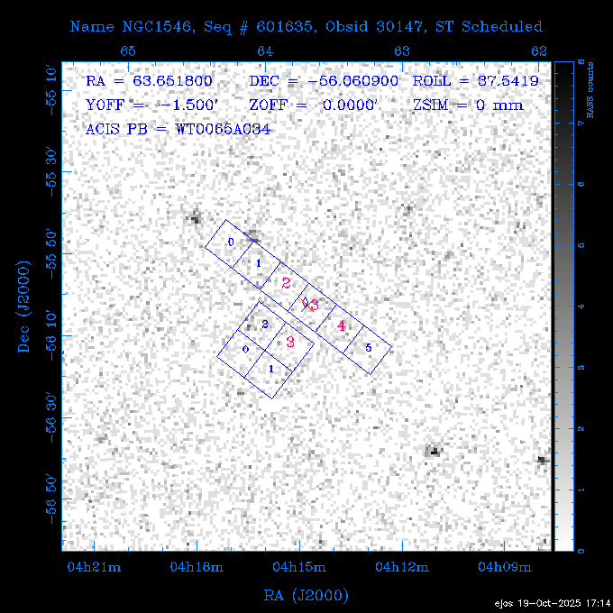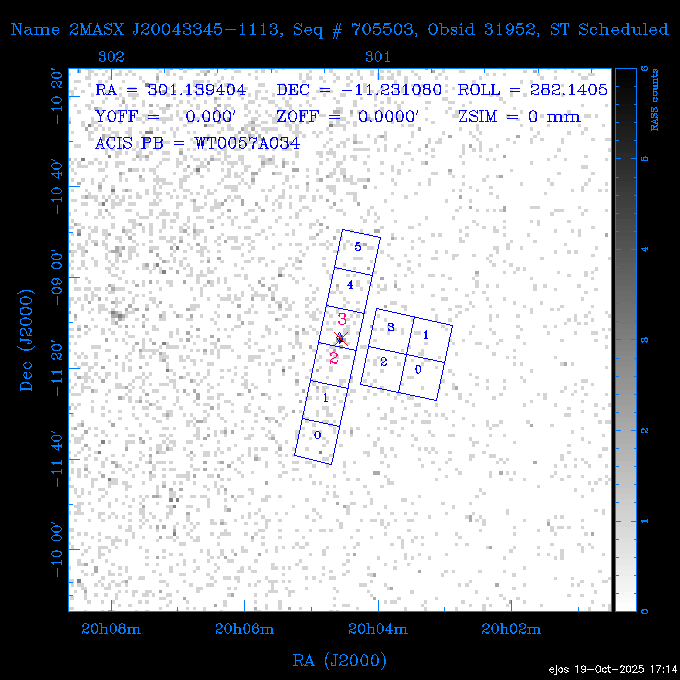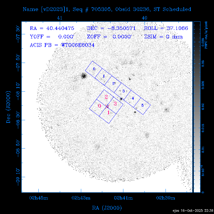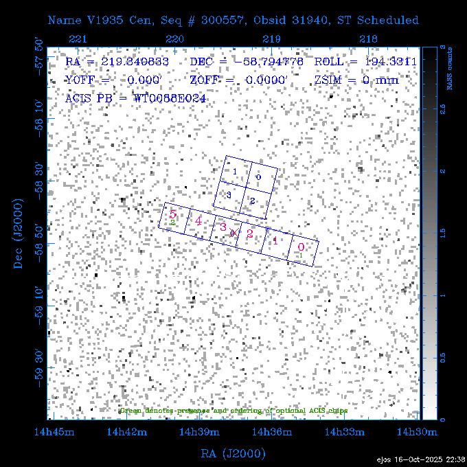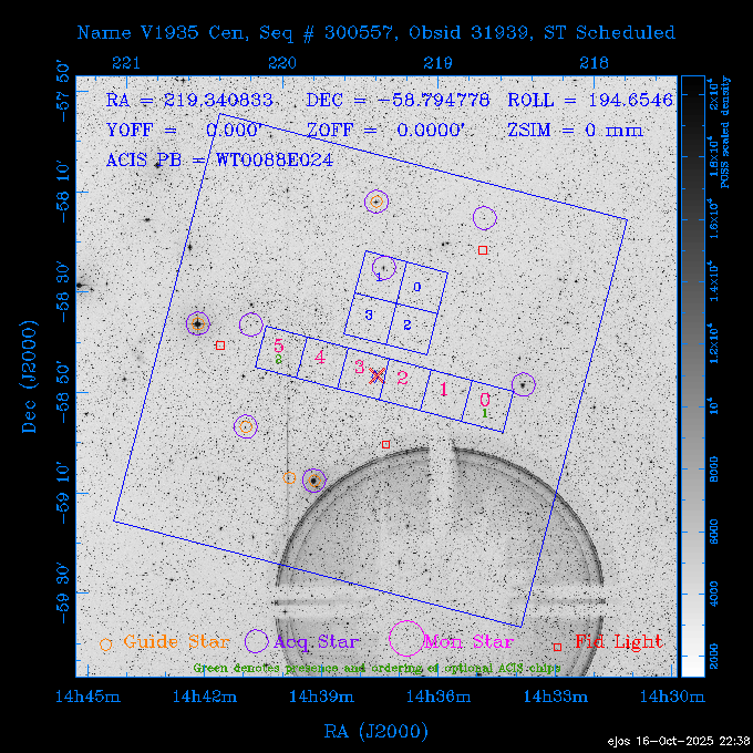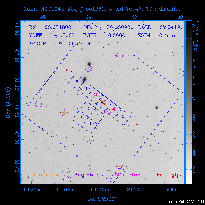 Seq # NB ObsID Constr. Target Start Time SI Grat Active Chips RA Dec Roll Pitch Slew Overlays ------ --- ----- ------- -------------------- --------------------- ----- ------ ---- ----------------- -------- -------- ------ ------ ------ ------------- 705305 31933 0 [vD2023]1 2025:294:20:08:04.815 10.0 ACIS-I NONE I0,I1,I2,I3 40.4405 -8.3506 26.00 156.12 106.02 dss pspc rass 503701 DDT 31951 2 GRB251016A 2025:294:23:37:17.202 10.0 ACIS-S NONE S2,S3 266.3028 -39.5601 250.00 59.94 121.68 dss pspc rass 705305 31934 0 [vD2023]1 2025:295:03:06:29.587 10.0 ACIS-I NONE I0,I1,I2,I3 40.4405 -8.3506 26.00 156.20 121.68 dss pspc rass 503701 DDT 31953 2 GRB251016A 2025:295:06:35:41.972 10.0 ACIS-S NONE S2,S3 266.3028 -39.5601 250.00 59.67 121.68 dss pspc rass ---- 42018 CAL-ER (IAT02) 2025:295:09:48:15.701 0.0 -- -- 1.1358 -44.3023 330.64 119.89 67.03 705402 31683 0 SDSS J014837.63+0600 2025:295:10:19:04.482 10.0 ACIS-I NONE I0,I1,I2,I3 27.1568 6.0056 20.00 174.86 67.33 dss pspc rass 201896 CCT 31926 0 V* CE Ant 2025:295:13:50:10.718 5.0 ACIS-S NONE S2,S3 160.6248 -33.6713 106.84 47.85 130.22 dss pspc rass 601635 30147 0 NGC1546 2025:295:15:43:50.207 31.4 ACIS-S NONE I3,S2,S3,S4 63.6518 -56.0609 37.53 106.17 66.71 dss pspc rass ---- 42017 CAL-ER (PER05) 2025:296:00:59:31.652 3.0 -- -- 30.4489 8.4611 46.07 175.88 73.84 ---- 42016 CAL-ER (PER06) 2025:296:07:00:00.000 3.0 -- -- 85.6457 -59.5880 56.58 95.34 82.87 ---- 42015 CAL-ER (PER07) 2025:296:08:12:49.320 3.0 -- -- 77.9432 -27.1745 58.45 117.90 33.64 ---- 42014 CAL-ER (PER08) 2025:296:11:00:00.000 3.0 -- -- 150.5000 -5.3000 79.77 56.99 72.11 ---- 42013 CAL-ER (PER09) 2025:296:12:32:09.276 3.0 -- -- 32.6476 8.8853 60.42 174.66 119.95 201818 30519 4 WR 11 2025:296:14:21:34.515 20.0 ACIS-S HETG S0,S1,S2,S3,S4,S5 122.3831 -47.3366 85.33 78.58 97.34 dss pspc rass ---- 42012 CAL-ER (IAT03) 2025:296:20:23:47.938 0.0 -- -- 354.0000 -42.0000 321.47 117.85 80.51 802205 30411 0 MACS J0018.5+1626 2025:296:20:58:23.800 10.0 ACIS-I NONE I0,I1,I2,I3 4.6388 16.4433 261.16 156.62 84.36 dss pspc rass 503554 31002 0 PSR J1813-1246 2025:297:00:21:39.653 14.0 ACIS-I NONE I0,I1,I2,I3 273.3490 -12.7668 271.00 63.34 94.94 dss pspc rass 802237 30539 0 1RXS J021649.0+70355 2025:297:04:55:29.176 30.0 ACIS-I NONE I0,I1,I2,I3 34.2042 70.5978 185.96 121.03 112.46 dss pspc rass 201810 30086 0 TV Cassiopeia 2025:297:13:46:14.340 30.0 ACIS-S HETG S1,S2,S3,S4 4.8281 59.1390 211.02 129.42 16.72 dss pspc rass 705503 CCT 31952 0 2MASX J20043345-1113 2025:297:22:42:22.066 10.0 ACIS-S NONE S2,S3 301.1394 -11.2311 282.14 89.51 92.83 dss pspc rass 705402 31937 0 SDSS J014837.63+0600 2025:298:02:05:43.173 10.0 ACIS-I NONE I0,I1,I2,I3 27.1568 6.0056 330.00 173.57 95.33 dss pspc rass 601672 29862 0 AM0126-525 2025:298:05:21:46.828 37.7 ACIS-S NONE I3,S2,S3,S4 22.1054 -52.6358 349.97 114.96 62.52 dss pspc rass ---- 42011 CAL-ER (PER10) 2025:298:16:20:36.491 3.0 -- -- 30.9395 8.2226 13.73 175.88 64.17 ---- 42010 CAL-ER (PER11) 2025:298:23:00:00.000 3.0 -- -- 343.2184 -44.6733 310.94 108.90 80.21 ---- 42009 CAL-ER (PER12) 2025:299:01:55:00.000 0.9 -- -- 30.9395 8.2226 7.78 175.82 77.42 ---- 42008 CAL-ER (PER13) 2025:299:02:54:27.240 3.0 -- -- 166.2000 -47.0000 118.25 50.63 127.22 ---- 42007 CAL-ER (PER14) 2025:299:04:32:05.061 0.9 -- -- 256.3285 3.7973 290.31 48.37 144.59 802205 31935 0 MACS J0018.5+1626 2025:299:06:22:05.286 10.0 ACIS-I NONE I0,I1,I2,I3 4.6388 16.4433 264.35 154.62 106.37 dss pspc rass 705501 CCT 31923 0 2MASXiJ1802473-14545 2025:299:09:46:04.551 10.0 ACIS-S NONE S2,S3,S4 270.6974 -14.9152 275.66 58.20 98.19 dss pspc rass 802205 31936 0 MACS J0018.5+1626 2025:299:13:10:03.464 10.0 ACIS-I NONE I0,I1,I2,I3 4.6388 16.4433 264.72 154.39 98.17 dss pspc rass 201897 CCT 31927 0 HEP G355.212-00.921 2025:299:16:36:18.238 10.0 ACIS-I NONE I0,I1,I2,I3 264.3604 -33.4878 259.97 52.74 108.36 dss pspc rass 705402 31938 0 SDSS J014837.63+0600 2025:299:20:05:28.282 10.0 ACIS-I NONE I0,I1,I2,I3 27.1568 6.0056 330.12 172.31 121.50 dss pspc rass