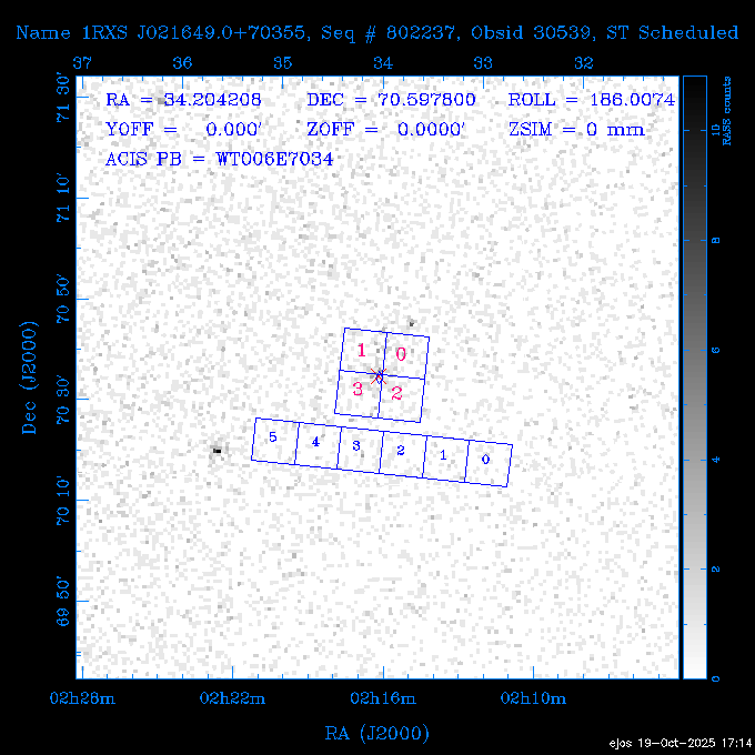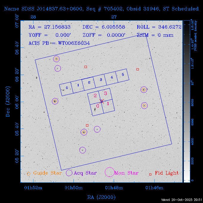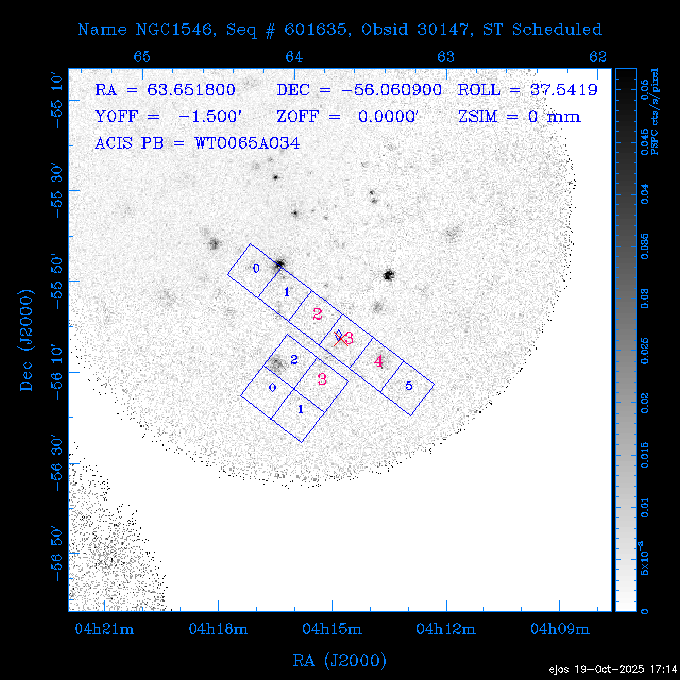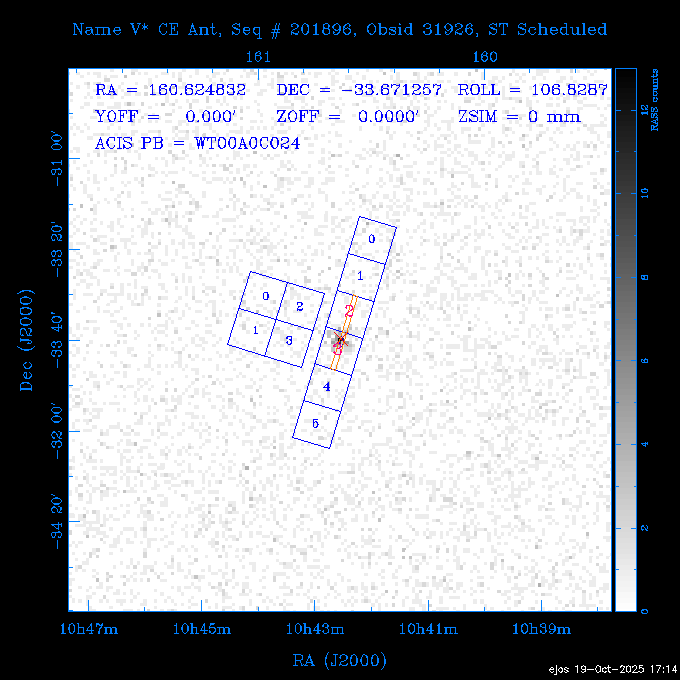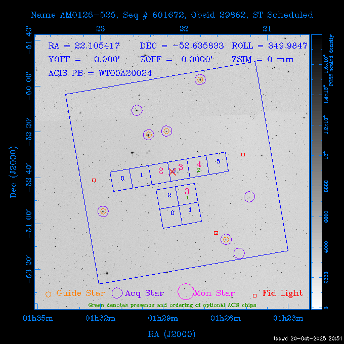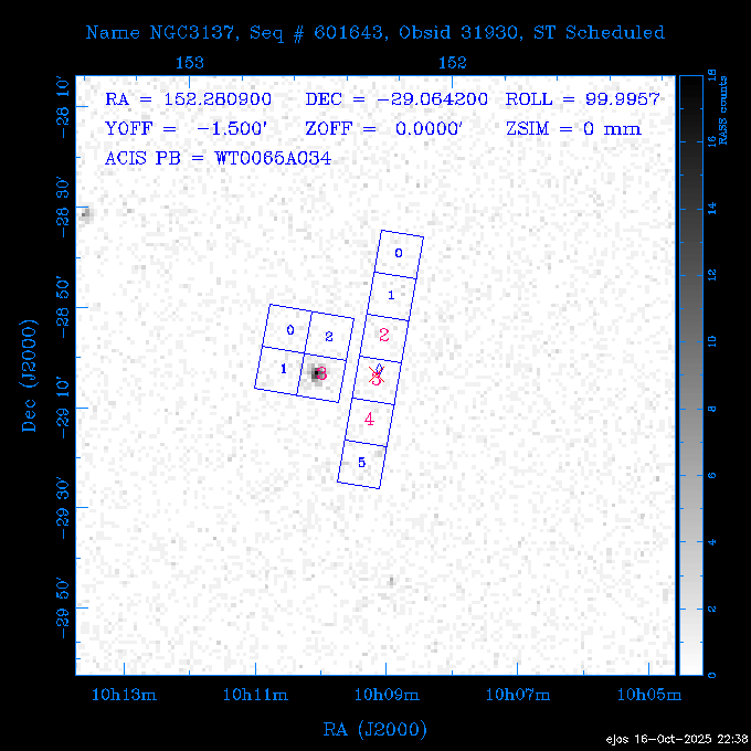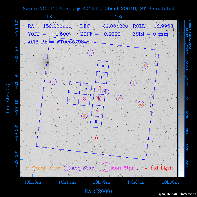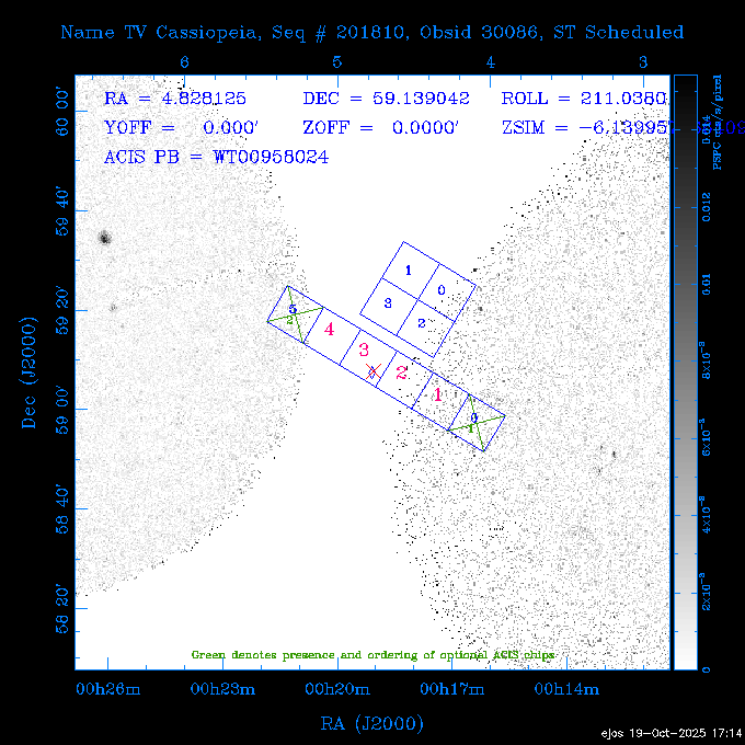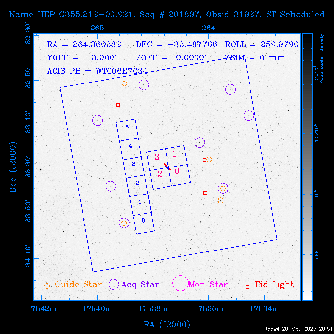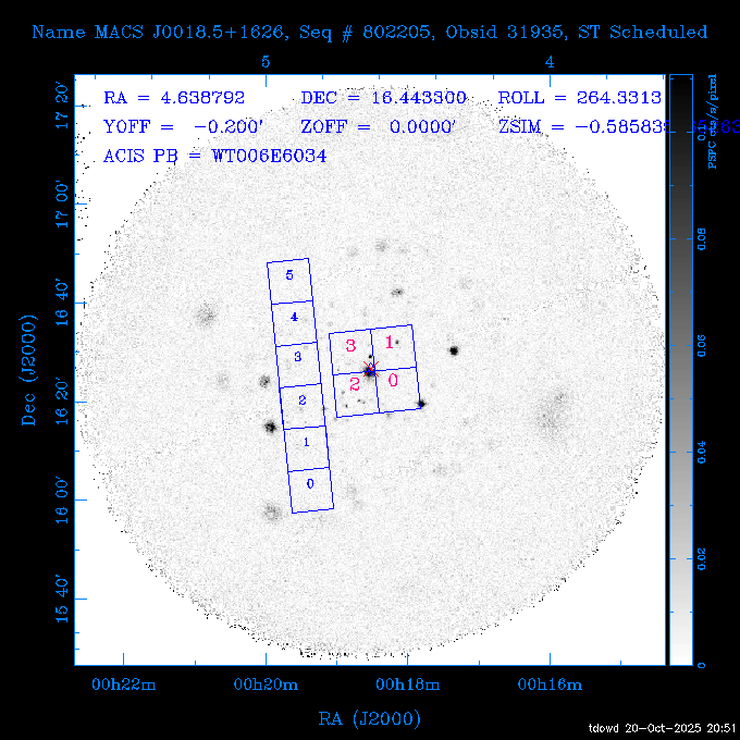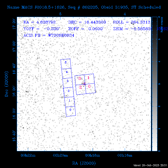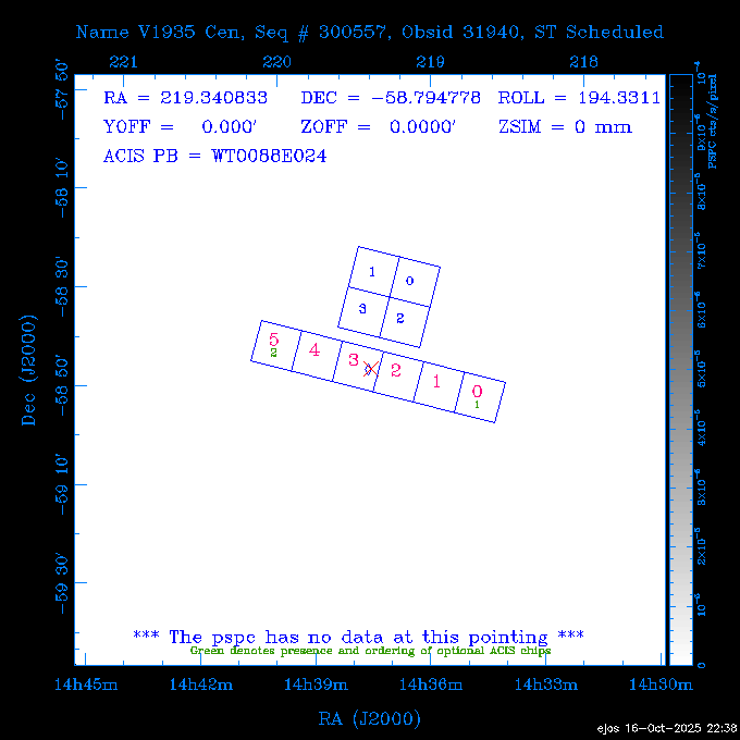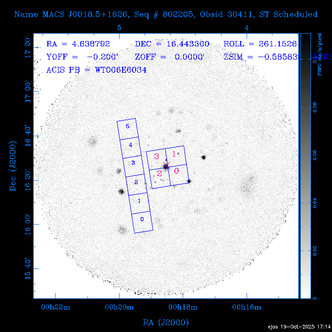 Seq # NB ObsID Constr. Target Start Time SI Grat Active Chips RA Dec Roll Pitch Slew Overlays ------ --- ----- ------- -------------------- --------------------- ----- ------ ---- ----------------- -------- -------- ------ ------ ------ ------------- 705305 31933 0 [vD2023]1 2025:294:20:08:04.815 10.0 ACIS-I NONE I0,I1,I2,I3 40.4405 -8.3506 26.00 156.12 106.02 dss pspc rass 503701 DDT 31951 2 GRB251016A 2025:294:23:37:17.202 10.0 ACIS-S NONE S2,S3 266.3028 -39.5601 250.00 59.94 121.68 dss pspc rass 705305 31934 0 [vD2023]1 2025:295:03:06:29.587 10.0 ACIS-I NONE I0,I1,I2,I3 40.4405 -8.3506 26.00 156.20 121.68 dss pspc rass 503701 DDT 31953 2 GRB251016A 2025:295:06:35:41.972 10.0 ACIS-S NONE S2,S3 266.3028 -39.5601 250.00 59.67 121.68 dss pspc rass ---- 42018 CAL-ER (IAT02) 2025:295:09:48:15.701 0.0 -- -- 1.1358 -44.3023 330.64 119.89 67.03 705402 31683 0 SDSS J014837.63+0600 2025:295:10:19:04.482 10.0 ACIS-I NONE I0,I1,I2,I3 27.1568 6.0056 20.00 174.86 67.33 dss pspc rass 201896 CCT 31926 0 V* CE Ant 2025:295:13:50:10.718 5.0 ACIS-S NONE S2,S3 160.6248 -33.6713 106.84 47.85 130.22 dss pspc rass 601635 30147 0 NGC1546 2025:295:15:43:50.207 31.4 ACIS-S NONE I3,S2,S3,S4 63.6518 -56.0609 37.53 106.17 66.71 dss pspc rass ---- 42017 CAL-ER (PER05) 2025:296:00:59:31.652 3.0 -- -- 30.4489 8.4611 46.07 175.88 73.84 ---- 42016 CAL-ER (PER06) 2025:296:07:00:00.000 3.0 -- -- 85.6457 -59.5880 56.58 95.34 82.87 ---- 42015 CAL-ER (PER07) 2025:296:08:12:49.320 3.0 -- -- 77.9432 -27.1745 58.45 117.90 33.64 ---- 42014 CAL-ER (PER08) 2025:296:11:00:00.000 3.0 -- -- 150.5000 -5.3000 79.77 56.99 72.11 ---- 42013 CAL-ER (PER09) 2025:296:12:32:09.276 3.0 -- -- 32.6476 8.8853 60.42 174.66 119.95 201818 30519 4 WR 11 2025:296:14:21:34.515 20.0 ACIS-S HETG S0,S1,S2,S3,S4,S5 122.3831 -47.3366 85.33 78.58 97.34 dss pspc rass ---- 42012 CAL-ER (IAT03) 2025:296:20:23:47.938 0.0 -- -- 354.0000 -42.0000 321.47 117.85 80.51 802205 30411 0 MACS J0018.5+1626 2025:296:20:58:23.800 10.0 ACIS-I NONE I0,I1,I2,I3 4.6388 16.4433 261.16 156.62 84.36 dss pspc rass 503554 31002 0 PSR J1813-1246 2025:297:00:21:39.653 14.0 ACIS-I NONE I0,I1,I2,I3 273.3490 -12.7668 271.00 63.34 94.94 dss pspc rass 802237 30539 0 1RXS J021649.0+70355 2025:297:04:55:29.176 30.0 ACIS-I NONE I0,I1,I2,I3 34.2042 70.5978 185.96 121.03 112.46 dss pspc rass 201810 30086 0 TV Cassiopeia 2025:297:13:46:14.340 30.0 ACIS-S HETG S1,S2,S3,S4 4.8281 59.1390 211.02 129.42 16.72 dss pspc rass 705503 CCT 31952 0 2MASX J20043345-1113 2025:297:22:42:22.066 10.0 ACIS-S NONE S2,S3 301.1394 -11.2311 282.14 89.51 92.83 dss pspc rass 705402 31937 0 SDSS J014837.63+0600 2025:298:02:05:43.173 10.0 ACIS-I NONE I0,I1,I2,I3 27.1568 6.0056 330.00 173.57 95.33 dss pspc rass 601672 29862 0 AM0126-525 2025:298:05:21:46.828 37.7 ACIS-S NONE I3,S2,S3,S4 22.1054 -52.6358 349.97 114.96 62.52 dss pspc rass ---- 42011 CAL-ER (PER10) 2025:298:16:20:36.491 3.0 -- -- 30.9395 8.2226 13.73 175.88 64.17 ---- 42010 CAL-ER (PER11) 2025:298:23:00:00.000 3.0 -- -- 343.2184 -44.6733 310.94 108.90 80.21 ---- 42009 CAL-ER (PER12) 2025:299:01:55:00.000 0.9 -- -- 30.9395 8.2226 7.78 175.82 77.42 ---- 42008 CAL-ER (PER13) 2025:299:02:54:27.240 3.0 -- -- 166.2000 -47.0000 118.25 50.63 127.22 ---- 42007 CAL-ER (PER14) 2025:299:04:32:05.061 0.9 -- -- 256.3285 3.7973 290.31 48.37 144.59 802205 31935 0 MACS J0018.5+1626 2025:299:06:22:05.286 10.0 ACIS-I NONE I0,I1,I2,I3 4.6388 16.4433 264.35 154.62 106.37 dss pspc rass 705501 CCT 31923 0 2MASXiJ1802473-14545 2025:299:09:46:04.551 10.0 ACIS-S NONE S2,S3,S4 270.6974 -14.9152 275.66 58.20 98.19 dss pspc rass 802205 31936 0 MACS J0018.5+1626 2025:299:13:10:03.464 10.0 ACIS-I NONE I0,I1,I2,I3 4.6388 16.4433 264.72 154.39 98.17 dss pspc rass 201897 CCT 31927 0 HEP G355.212-00.921 2025:299:16:36:18.238 10.0 ACIS-I NONE I0,I1,I2,I3 264.3604 -33.4878 259.97 52.74 108.36 dss pspc rass 705402 31938 0 SDSS J014837.63+0600 2025:299:20:05:28.282 10.0 ACIS-I NONE I0,I1,I2,I3 27.1568 6.0056 330.12 172.31 121.50 dss pspc rass