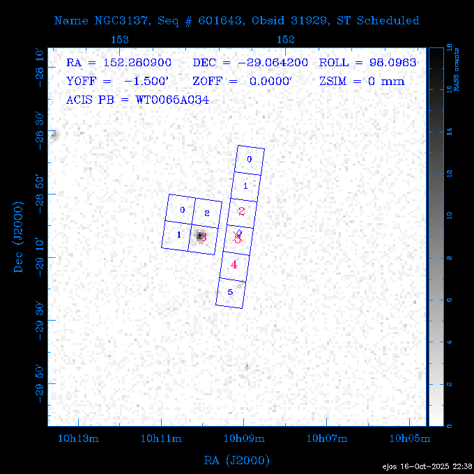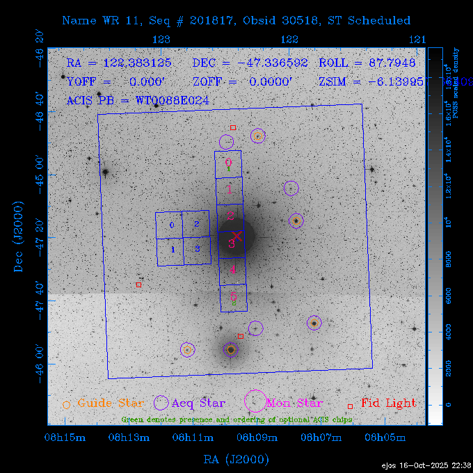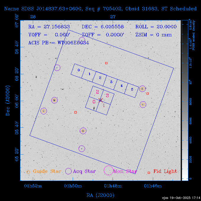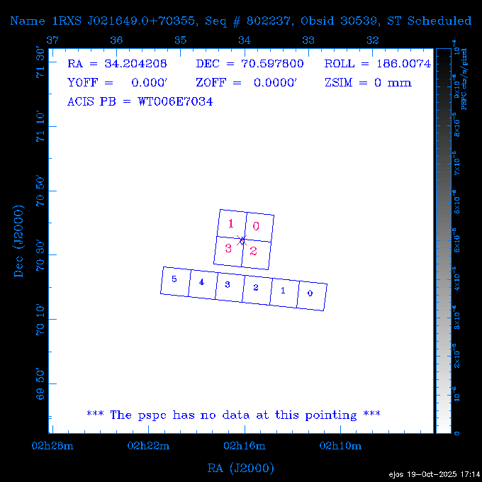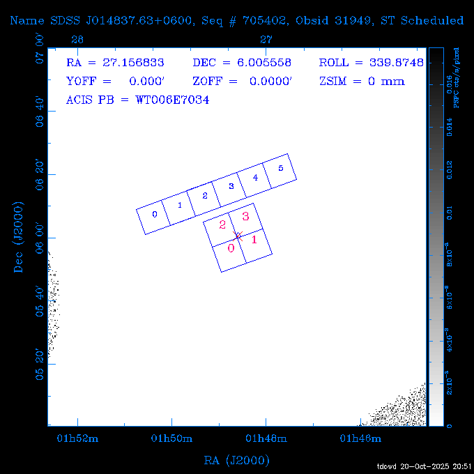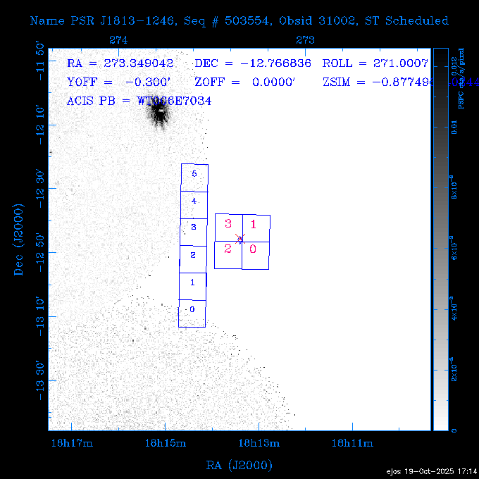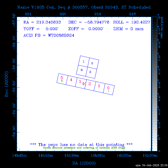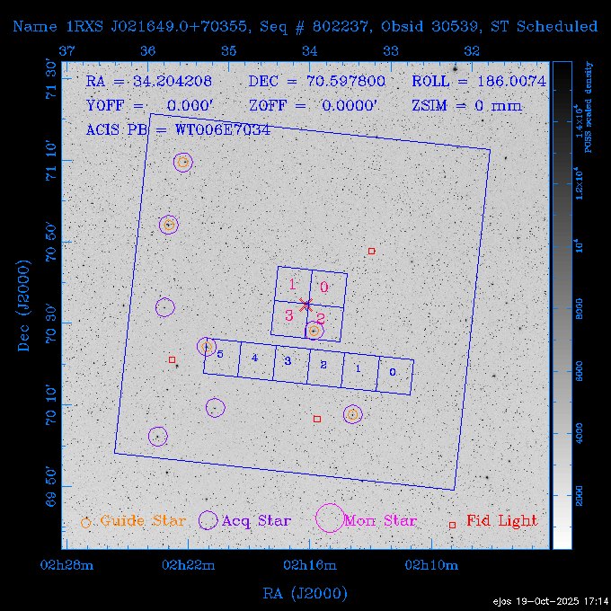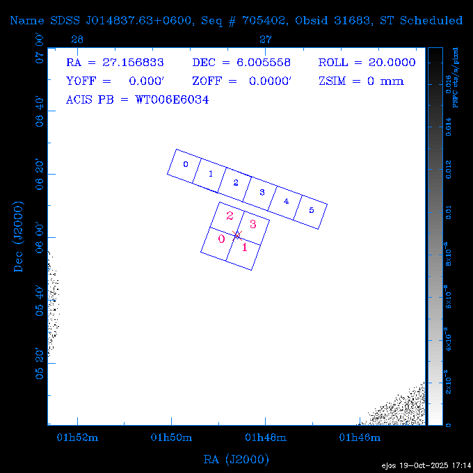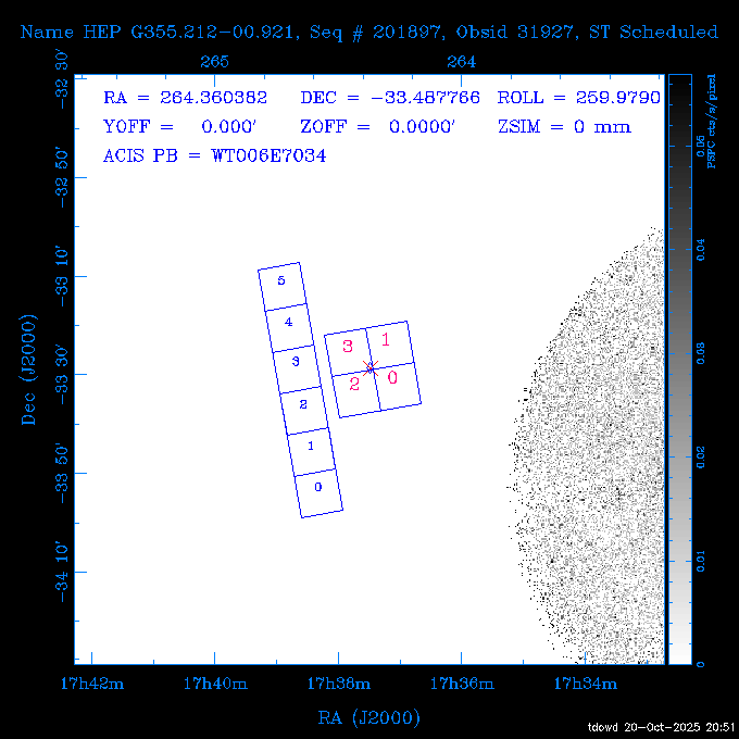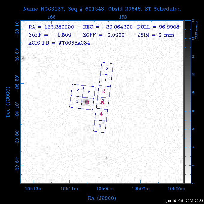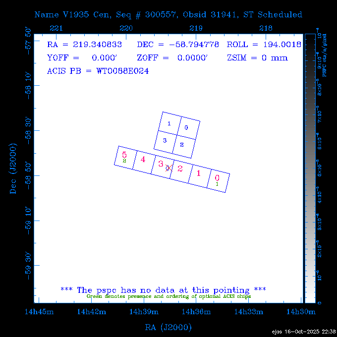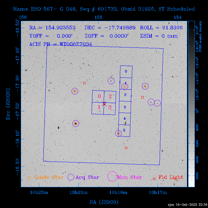 Seq # NB ObsID Constr. Target Start Time SI Grat Active Chips RA Dec Roll Pitch Slew Overlays ------ --- ----- ------- -------------------- --------------------- ----- ------ ---- ----------------- -------- -------- ------ ------ ------ ------------- 705305 31933 0 [vD2023]1 2025:294:20:08:04.815 10.0 ACIS-I NONE I0,I1,I2,I3 40.4405 -8.3506 26.00 156.12 106.02 dss pspc rass 503701 DDT 31951 2 GRB251016A 2025:294:23:37:17.202 10.0 ACIS-S NONE S2,S3 266.3028 -39.5601 250.00 59.94 121.68 dss pspc rass 705305 31934 0 [vD2023]1 2025:295:03:06:29.587 10.0 ACIS-I NONE I0,I1,I2,I3 40.4405 -8.3506 26.00 156.20 121.68 dss pspc rass 503701 DDT 31953 2 GRB251016A 2025:295:06:35:41.972 10.0 ACIS-S NONE S2,S3 266.3028 -39.5601 250.00 59.67 121.68 dss pspc rass ---- 42018 CAL-ER (IAT02) 2025:295:09:48:15.701 0.0 -- -- 1.1358 -44.3023 330.64 119.89 67.03 705402 31683 0 SDSS J014837.63+0600 2025:295:10:19:04.482 10.0 ACIS-I NONE I0,I1,I2,I3 27.1568 6.0056 20.00 174.86 67.33 dss pspc rass 201896 CCT 31926 0 V* CE Ant 2025:295:13:50:10.718 5.0 ACIS-S NONE S2,S3 160.6248 -33.6713 106.84 47.85 130.22 dss pspc rass 601635 30147 0 NGC1546 2025:295:15:43:50.207 31.4 ACIS-S NONE I3,S2,S3,S4 63.6518 -56.0609 37.53 106.17 66.71 dss pspc rass ---- 42017 CAL-ER (PER05) 2025:296:00:59:31.652 3.0 -- -- 30.4489 8.4611 46.07 175.88 73.84 ---- 42016 CAL-ER (PER06) 2025:296:07:00:00.000 3.0 -- -- 85.6457 -59.5880 56.58 95.34 82.87 ---- 42015 CAL-ER (PER07) 2025:296:08:12:49.320 3.0 -- -- 77.9432 -27.1745 58.45 117.90 33.64 ---- 42014 CAL-ER (PER08) 2025:296:11:00:00.000 3.0 -- -- 150.5000 -5.3000 79.77 56.99 72.11 ---- 42013 CAL-ER (PER09) 2025:296:12:32:09.276 3.0 -- -- 32.6476 8.8853 60.42 174.66 119.95 201818 30519 4 WR 11 2025:296:14:21:34.515 20.0 ACIS-S HETG S0,S1,S2,S3,S4,S5 122.3831 -47.3366 85.33 78.58 97.34 dss pspc rass ---- 42012 CAL-ER (IAT03) 2025:296:20:23:47.938 0.0 -- -- 354.0000 -42.0000 321.47 117.85 80.51 802205 30411 0 MACS J0018.5+1626 2025:296:20:58:23.800 10.0 ACIS-I NONE I0,I1,I2,I3 4.6388 16.4433 261.16 156.62 84.36 dss pspc rass 503554 31002 0 PSR J1813-1246 2025:297:00:21:39.653 14.0 ACIS-I NONE I0,I1,I2,I3 273.3490 -12.7668 271.00 63.34 94.94 dss pspc rass 802237 30539 0 1RXS J021649.0+70355 2025:297:04:55:29.176 30.0 ACIS-I NONE I0,I1,I2,I3 34.2042 70.5978 185.96 121.03 112.46 dss pspc rass 201810 30086 0 TV Cassiopeia 2025:297:13:46:14.340 30.0 ACIS-S HETG S1,S2,S3,S4 4.8281 59.1390 211.02 129.42 16.72 dss pspc rass 705503 CCT 31952 0 2MASX J20043345-1113 2025:297:22:42:22.066 10.0 ACIS-S NONE S2,S3 301.1394 -11.2311 282.14 89.51 92.83 dss pspc rass 705402 31937 0 SDSS J014837.63+0600 2025:298:02:05:43.173 10.0 ACIS-I NONE I0,I1,I2,I3 27.1568 6.0056 330.00 173.57 95.33 dss pspc rass 601672 29862 0 AM0126-525 2025:298:05:21:46.828 37.7 ACIS-S NONE I3,S2,S3,S4 22.1054 -52.6358 349.97 114.96 62.52 dss pspc rass ---- 42011 CAL-ER (PER10) 2025:298:16:20:36.491 3.0 -- -- 30.9395 8.2226 13.73 175.88 64.17 ---- 42010 CAL-ER (PER11) 2025:298:23:00:00.000 3.0 -- -- 343.2184 -44.6733 310.94 108.90 80.21 ---- 42009 CAL-ER (PER12) 2025:299:01:55:00.000 0.9 -- -- 30.9395 8.2226 7.78 175.82 77.42 ---- 42008 CAL-ER (PER13) 2025:299:02:54:27.240 3.0 -- -- 166.2000 -47.0000 118.25 50.63 127.22 ---- 42007 CAL-ER (PER14) 2025:299:04:32:05.061 0.9 -- -- 256.3285 3.7973 290.31 48.37 144.59 802205 31935 0 MACS J0018.5+1626 2025:299:06:22:05.286 10.0 ACIS-I NONE I0,I1,I2,I3 4.6388 16.4433 264.35 154.62 106.37 dss pspc rass 705501 CCT 31923 0 2MASXiJ1802473-14545 2025:299:09:46:04.551 10.0 ACIS-S NONE S2,S3,S4 270.6974 -14.9152 275.66 58.20 98.19 dss pspc rass 802205 31936 0 MACS J0018.5+1626 2025:299:13:10:03.464 10.0 ACIS-I NONE I0,I1,I2,I3 4.6388 16.4433 264.72 154.39 98.17 dss pspc rass 201897 CCT 31927 0 HEP G355.212-00.921 2025:299:16:36:18.238 10.0 ACIS-I NONE I0,I1,I2,I3 264.3604 -33.4878 259.97 52.74 108.36 dss pspc rass 705402 31938 0 SDSS J014837.63+0600 2025:299:20:05:28.282 10.0 ACIS-I NONE I0,I1,I2,I3 27.1568 6.0056 330.12 172.31 121.50 dss pspc rass