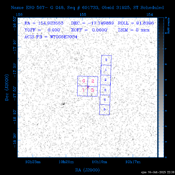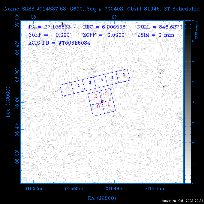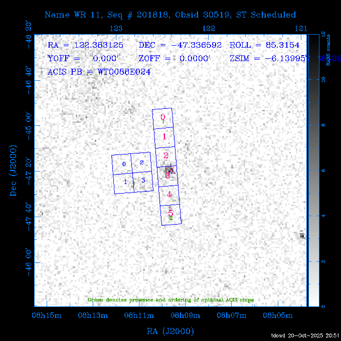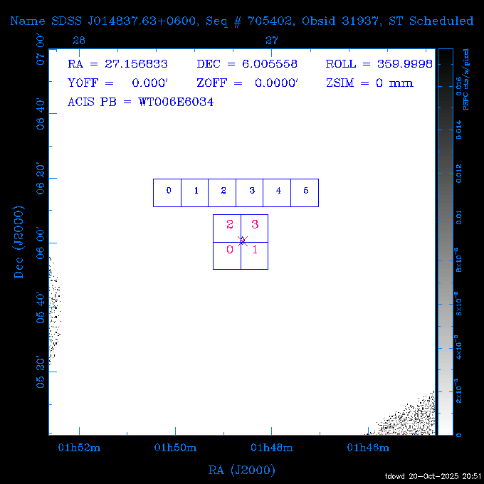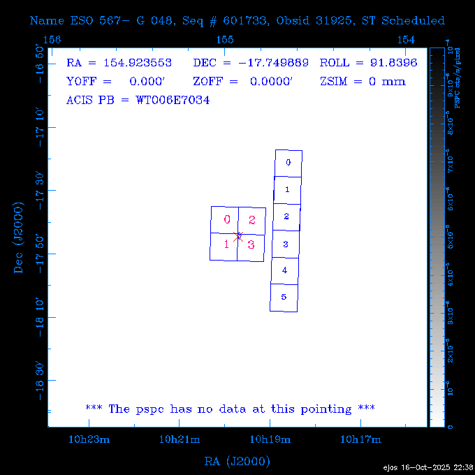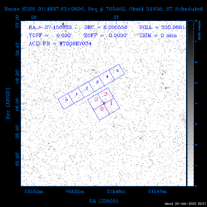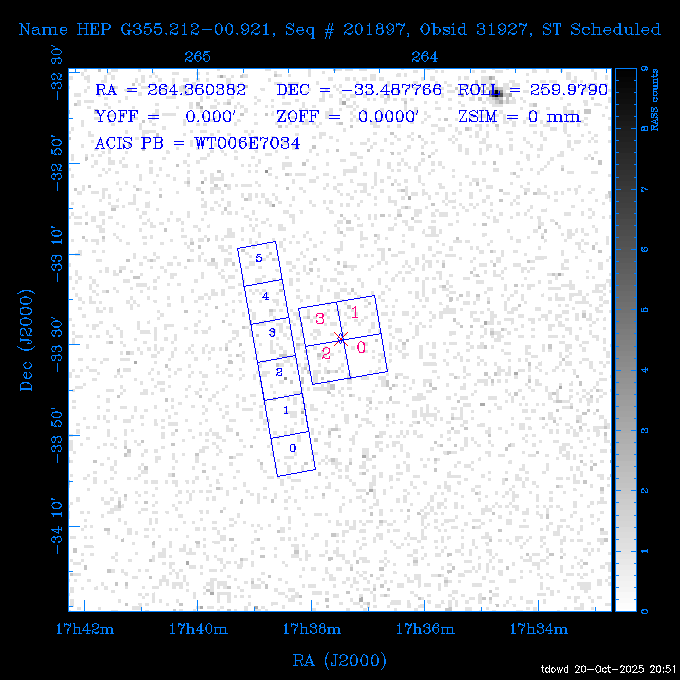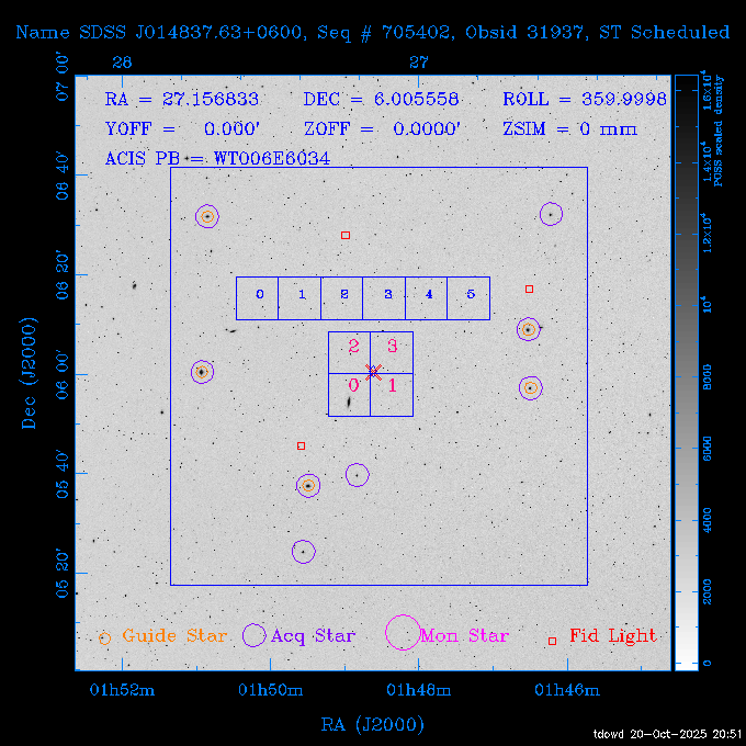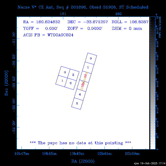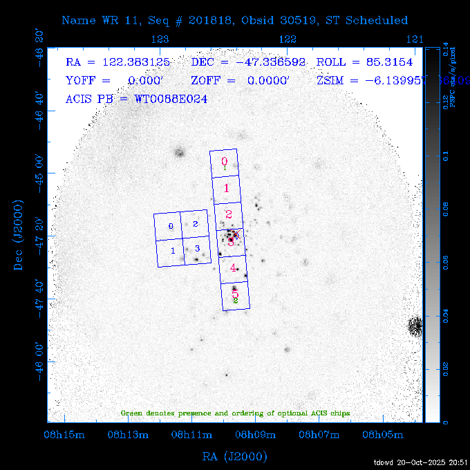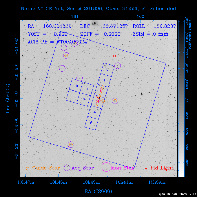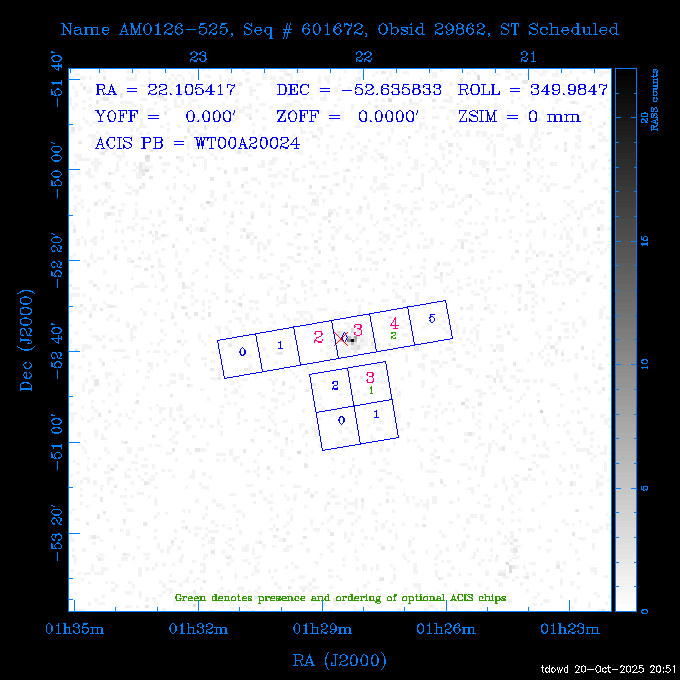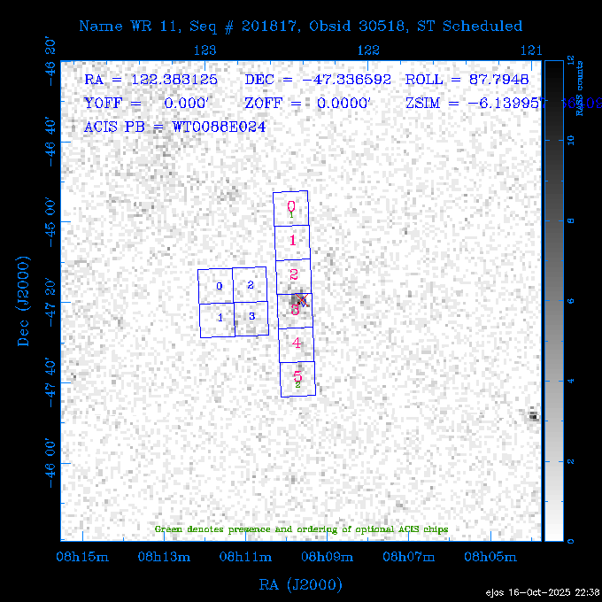 Seq # NB ObsID Constr. Target Start Time SI Grat Active Chips RA Dec Roll Pitch Slew Overlays ------ --- ----- ------- -------------------- --------------------- ----- ------ ---- ----------------- -------- -------- ------ ------ ------ ------------- 705305 31933 0 [vD2023]1 2025:294:20:08:04.815 10.0 ACIS-I NONE I0,I1,I2,I3 40.4405 -8.3506 26.00 156.12 106.02 dss pspc rass 503701 DDT 31951 2 GRB251016A 2025:294:23:37:17.202 10.0 ACIS-S NONE S2,S3 266.3028 -39.5601 250.00 59.94 121.68 dss pspc rass 705305 31934 0 [vD2023]1 2025:295:03:06:29.587 10.0 ACIS-I NONE I0,I1,I2,I3 40.4405 -8.3506 26.00 156.20 121.68 dss pspc rass 503701 DDT 31953 2 GRB251016A 2025:295:06:35:41.972 10.0 ACIS-S NONE S2,S3 266.3028 -39.5601 250.00 59.67 121.68 dss pspc rass ---- 42018 CAL-ER (IAT02) 2025:295:09:48:15.701 0.0 -- -- 1.1358 -44.3023 330.64 119.89 67.03 705402 31683 0 SDSS J014837.63+0600 2025:295:10:19:04.482 10.0 ACIS-I NONE I0,I1,I2,I3 27.1568 6.0056 20.00 174.86 67.33 dss pspc rass 201896 CCT 31926 0 V* CE Ant 2025:295:13:50:10.718 5.0 ACIS-S NONE S2,S3 160.6248 -33.6713 106.84 47.85 130.22 dss pspc rass 601635 30147 0 NGC1546 2025:295:15:43:50.207 31.4 ACIS-S NONE I3,S2,S3,S4 63.6518 -56.0609 37.53 106.17 66.71 dss pspc rass ---- 42017 CAL-ER (PER05) 2025:296:00:59:31.652 3.0 -- -- 30.4489 8.4611 46.07 175.88 73.84 ---- 42016 CAL-ER (PER06) 2025:296:07:00:00.000 3.0 -- -- 85.6457 -59.5880 56.58 95.34 82.87 ---- 42015 CAL-ER (PER07) 2025:296:08:12:49.320 3.0 -- -- 77.9432 -27.1745 58.45 117.90 33.64 ---- 42014 CAL-ER (PER08) 2025:296:11:00:00.000 3.0 -- -- 150.5000 -5.3000 79.77 56.99 72.11 ---- 42013 CAL-ER (PER09) 2025:296:12:32:09.276 3.0 -- -- 32.6476 8.8853 60.42 174.66 119.95 201818 30519 4 WR 11 2025:296:14:21:34.515 20.0 ACIS-S HETG S0,S1,S2,S3,S4,S5 122.3831 -47.3366 85.33 78.58 97.34 dss pspc rass ---- 42012 CAL-ER (IAT03) 2025:296:20:23:47.938 0.0 -- -- 354.0000 -42.0000 321.47 117.85 80.51 802205 30411 0 MACS J0018.5+1626 2025:296:20:58:23.800 10.0 ACIS-I NONE I0,I1,I2,I3 4.6388 16.4433 261.16 156.62 84.36 dss pspc rass 503554 31002 0 PSR J1813-1246 2025:297:00:21:39.653 14.0 ACIS-I NONE I0,I1,I2,I3 273.3490 -12.7668 271.00 63.34 94.94 dss pspc rass 802237 30539 0 1RXS J021649.0+70355 2025:297:04:55:29.176 30.0 ACIS-I NONE I0,I1,I2,I3 34.2042 70.5978 185.96 121.03 112.46 dss pspc rass 201810 30086 0 TV Cassiopeia 2025:297:13:46:14.340 30.0 ACIS-S HETG S1,S2,S3,S4 4.8281 59.1390 211.02 129.42 16.72 dss pspc rass 705503 CCT 31952 0 2MASX J20043345-1113 2025:297:22:42:22.066 10.0 ACIS-S NONE S2,S3 301.1394 -11.2311 282.14 89.51 92.83 dss pspc rass 705402 31937 0 SDSS J014837.63+0600 2025:298:02:05:43.173 10.0 ACIS-I NONE I0,I1,I2,I3 27.1568 6.0056 330.00 173.57 95.33 dss pspc rass 601672 29862 0 AM0126-525 2025:298:05:21:46.828 37.7 ACIS-S NONE I3,S2,S3,S4 22.1054 -52.6358 349.97 114.96 62.52 dss pspc rass ---- 42011 CAL-ER (PER10) 2025:298:16:20:36.491 3.0 -- -- 30.9395 8.2226 13.73 175.88 64.17 ---- 42010 CAL-ER (PER11) 2025:298:23:00:00.000 3.0 -- -- 343.2184 -44.6733 310.94 108.90 80.21 ---- 42009 CAL-ER (PER12) 2025:299:01:55:00.000 0.9 -- -- 30.9395 8.2226 7.78 175.82 77.42 ---- 42008 CAL-ER (PER13) 2025:299:02:54:27.240 3.0 -- -- 166.2000 -47.0000 118.25 50.63 127.22 ---- 42007 CAL-ER (PER14) 2025:299:04:32:05.061 0.9 -- -- 256.3285 3.7973 290.31 48.37 144.59 802205 31935 0 MACS J0018.5+1626 2025:299:06:22:05.286 10.0 ACIS-I NONE I0,I1,I2,I3 4.6388 16.4433 264.35 154.62 106.37 dss pspc rass 705501 CCT 31923 0 2MASXiJ1802473-14545 2025:299:09:46:04.551 10.0 ACIS-S NONE S2,S3,S4 270.6974 -14.9152 275.66 58.20 98.19 dss pspc rass 802205 31936 0 MACS J0018.5+1626 2025:299:13:10:03.464 10.0 ACIS-I NONE I0,I1,I2,I3 4.6388 16.4433 264.72 154.39 98.17 dss pspc rass 201897 CCT 31927 0 HEP G355.212-00.921 2025:299:16:36:18.238 10.0 ACIS-I NONE I0,I1,I2,I3 264.3604 -33.4878 259.97 52.74 108.36 dss pspc rass 705402 31938 0 SDSS J014837.63+0600 2025:299:20:05:28.282 10.0 ACIS-I NONE I0,I1,I2,I3 27.1568 6.0056 330.12 172.31 121.50 dss pspc rass