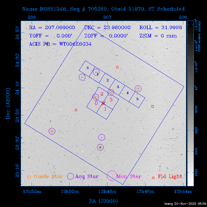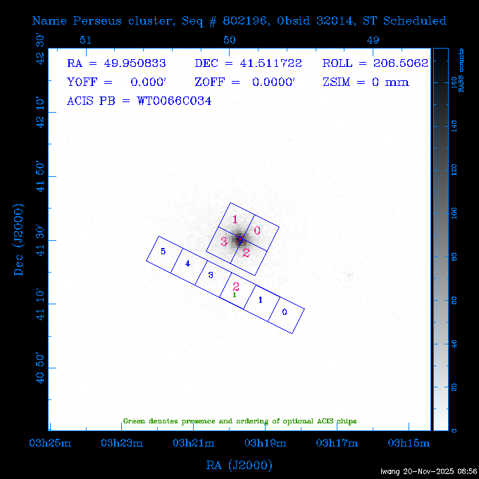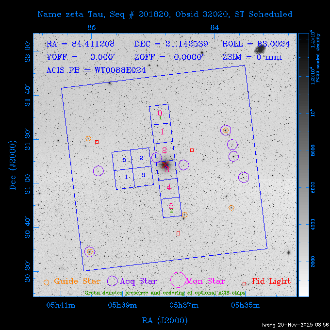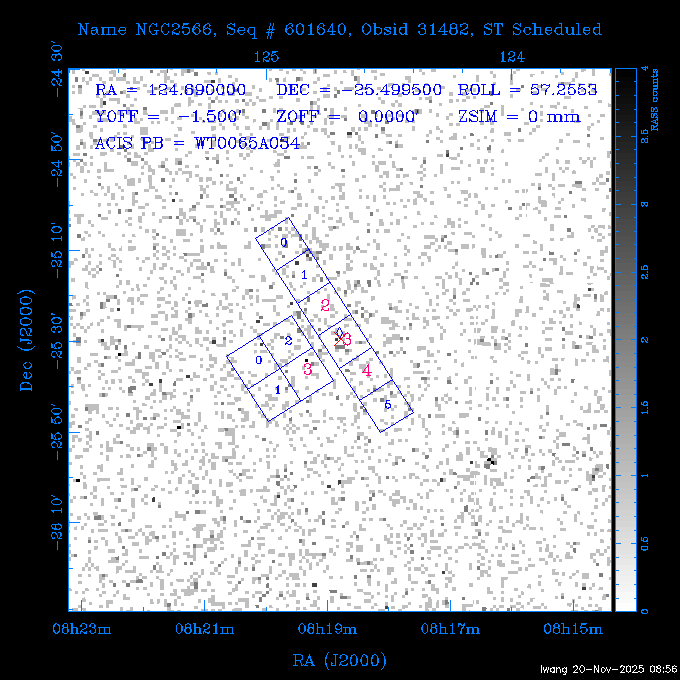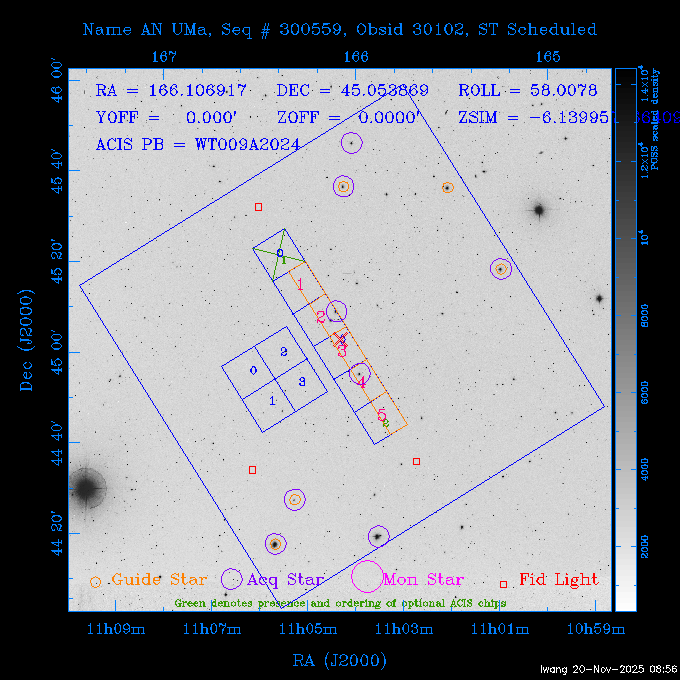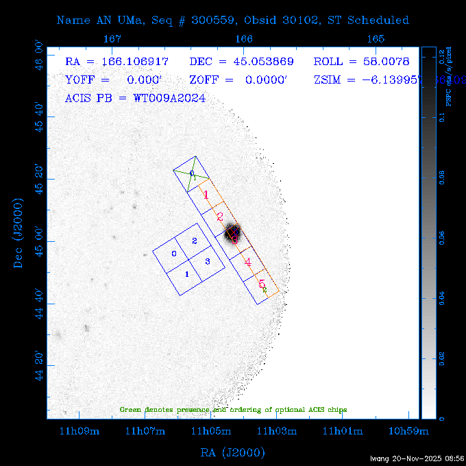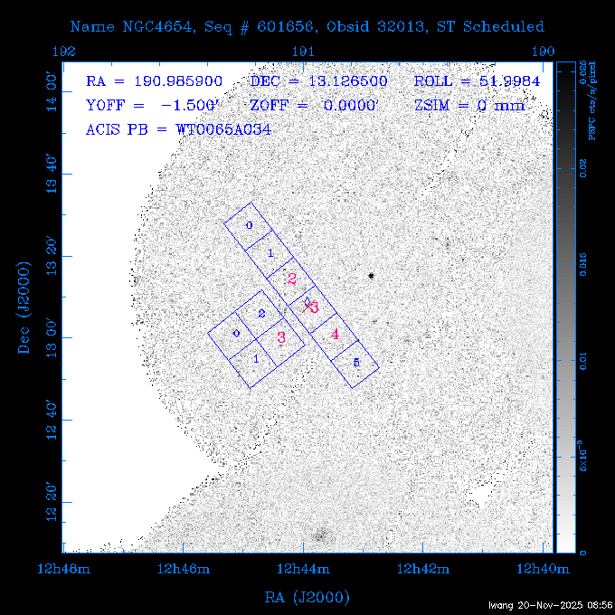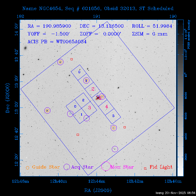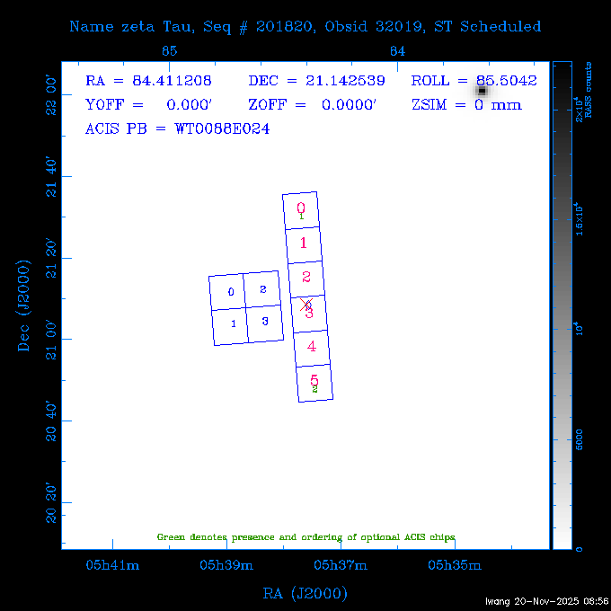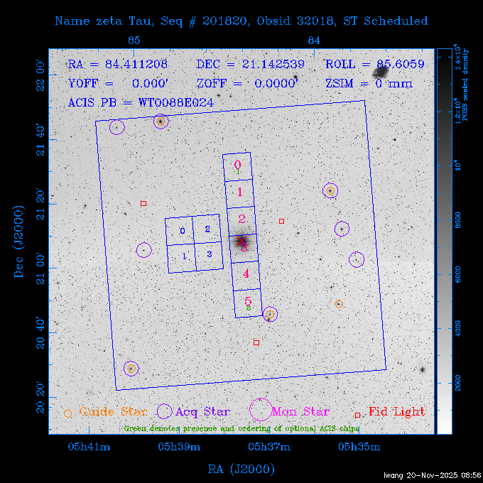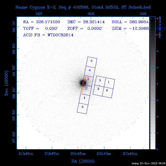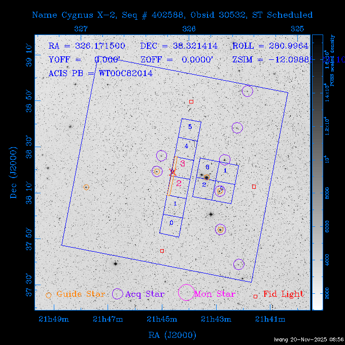 Seq # NB ObsID Constr. Target Start Time SI Grat Active Chips RA Dec Roll Pitch Slew Overlays ------ --- ----- ------- -------------------- --------------------- ----- ------ ---- ----------------- -------- -------- ------ ------ ------ ------------- ---- 41932 CAL-ER (PER01) 2025:327:21:33:05.077 3.0 -- -- 71.6435 18.9281 80.40 168.33 52.13 ---- 41931 CAL-ER (PER02) 2025:328:02:00:00.000 3.0 -- -- 184.7000 -33.6000 90.51 50.00 119.73 ---- 41930 CAL-ER (PER03) 2025:328:04:00:00.000 3.0 -- -- 81.4000 32.6000 108.00 157.18 118.31 705269 31879 0 BOSS1348 2025:328:06:32:54.070 14.5 ACIS-I NONE I0,I1,I2,I3 207.0600 23.9800 32.00 54.74 103.61 dss pspc rass 802196 30281 0 Perseus cluster 2025:328:11:15:30.689 10.0 ACIS-I NONE I0,I1,I2,I3,S2 49.9508 41.5117 205.09 157.42 114.50 dss pspc rass 705279 29991 0 NGC 4051 2025:328:14:38:37.605 33.0 ACIS-S HETG S2,S3 180.7900 44.5313 44.01 84.66 94.27 dss pspc rass 802196 32014 0 Perseus cluster 2025:329:00:25:12.501 10.0 ACIS-I NONE I0,I1,I2,I3,S2 49.9508 41.5117 206.50 157.36 94.87 dss pspc rass 705279 32010 0 NGC 4051 2025:329:03:48:16.092 13.0 ACIS-S HETG S2,S3 180.7900 44.5313 46.01 85.08 94.02 dss pspc rass 802196 32015 0 Perseus cluster 2025:329:08:01:24.175 10.0 ACIS-I NONE I0,I1,I2,I3,S2 49.9508 41.5117 207.30 157.30 94.36 dss pspc rass ---- 41929 CAL-ER (IAT01) 2025:329:11:08:58.342 0.9 -- -- 61.1063 28.6896 179.34 172.13 26.58 705269 32021 0 BOSS1348 2025:329:12:07:08.316 14.5 ACIS-I NONE I0,I1,I2,I3 207.0600 23.9800 32.00 55.68 121.42 dss pspc rass 802196 30317 0 Perseus cluster 2025:329:16:49:53.411 11.0 ACIS-I NONE I0,I1,I2,I3,S2 49.9508 41.5117 208.22 157.23 115.13 dss pspc rass 300559 30102 0 AN UMa 2025:329:20:29:02.671 33.0 ACIS-S HETG S1,S2,S3,S4,S5 166.1069 45.0539 58.00 94.86 91.44 dss pspc rass 802196 32016 0 Perseus cluster 2025:330:06:13:47.811 12.0 ACIS-I NONE I0,I1,I2,I3 49.9508 41.5117 197.99 157.10 86.64 dss pspc rass ---- 41928 CAL-ER (PER04) 2025:330:09:51:33.379 3.0 -- -- 61.0659 28.0381 187.13 172.87 16.85 ---- 41927 CAL-ER (PER05) 2025:330:17:20:00.000 3.0 -- -- 29.5000 53.0000 230.98 139.30 40.70 ---- 41926 CAL-ER (PER06) 2025:330:21:30:00.000 3.0 -- -- 233.5566 26.9258 11.20 48.77 97.43 402588 30532 0 Cygnus X-2 2025:330:23:29:00.063 42.1 ACIS-S HETG S2,S3 326.1715 38.3214 281.01 98.07 80.82 dss pspc rass 802196 31987 0 Perseus cluster 2025:331:11:42:51.227 9.7 ACIS-I NONE I0,I1,I2,I3,S2 49.9508 41.5117 212.78 156.81 62.17 dss pspc rass ---- 41925 CAL-ER (IAT02) 2025:331:14:59:15.270 0.9 -- -- 246.2937 51.6839 357.10 72.95 86.55 503530 30121 0 PSR J1015-5719 2025:331:16:02:38.792 10.0 ACIS-I NONE I0,I1,I2,I3 153.9082 -57.3202 70.58 71.92 144.94 dss pspc rass 201820 30521 1 zeta Tau 2025:331:19:28:11.788 12.5 ACIS-S HETG S0,S1,S2,S3,S4,S5 84.4112 21.1425 85.79 160.53 105.22 dss pspc rass 503530 32011 0 PSR J1015-5719 2025:331:23:35:22.614 10.0 ACIS-I NONE I0,I1,I2,I3 153.9082 -57.3202 71.08 72.05 105.06 dss pspc rass 601640 31482 0 NGC2566 2025:332:02:47:19.614 20.0 ACIS-S NONE I3,S2,S3,S4 124.6900 -25.4995 57.26 104.65 38.60 dss pspc rass 201820 32018 1 zeta Tau 2025:332:08:54:07.778 12.5 ACIS-S HETG S0,S1,S2,S3,S4,S5 84.4112 21.1425 85.60 161.08 67.24 dss pspc rass 503530 32012 0 PSR J1015-5719 2025:332:13:01:17.798 10.0 ACIS-I NONE I0,I1,I2,I3 153.9082 -57.3202 71.07 72.29 105.00 dss pspc rass ---- 41924 CAL-ER (IAT03) 2025:332:16:15:49.673 0.9 -- -- 183.3000 -9.6000 70.75 59.73 55.64 201820 32019 1 zeta Tau 2025:332:17:09:36.167 12.5 ACIS-S HETG S0,S1,S2,S3,S4,S5 84.4112 21.1425 85.50 161.42 101.66 dss pspc rass 503613 P1 31135 0 1eRASS J120844.7+144 2025:332:21:14:00.315 14.3 ACIS-S NONE I2,I3,S2,S3,S4 182.1869 14.8056 60.72 71.16 92.56 dss pspc rass ---- 41923 CAL-ER (PER08) 2025:333:01:48:39.382 3.0 -- -- 75.7882 27.1417 117.43 168.53 97.38 ---- 41922 CAL-ER (PER09) 2025:333:03:30:15.536 3.0 -- -- 53.7206 18.3580 288.21 169.01 162.46 ---- 41921 CAL-ER (PER07) 2025:333:05:52:00.000 3.0 -- -- 299.4000 -19.8000 281.98 50.64 118.36 ---- 41920 CAL-ER (PER10) 2025:333:10:13:43.171 1.0 -- -- 53.9381 19.2905 283.64 169.16 118.73 ---- 41919 CAL-ER (PER11) 2025:333:11:21:05.673 3.0 -- -- 76.3346 27.0763 116.67 168.53 158.44 601656 30174 0 NGC4654 2025:333:13:19:25.441 14.5 ACIS-S NONE I3,S2,S3,S4 190.9859 13.1265 52.00 63.65 105.19 dss pspc rass 201820 32020 1 zeta Tau 2025:333:17:58:58.869 10.0 ACIS-S HETG S0,S1,S2,S3,S4,S5 84.4112 21.1425 83.00 162.49 100.76 dss pspc rass 601656 32013 0 NGC4654 2025:333:21:23:32.298 14.2 ACIS-S NONE I3,S2,S3,S4 190.9859 13.1265 52.00 63.98 100.76 dss pspc rass 802196 32017 0 Perseus cluster 2025:334:02:03:15.585 10.0 ACIS-I NONE I0,I1,I2,I3 49.9508 41.5117 203.99 155.98 120.25 dss pspc rass 601737 CCT 32009 0 NGC 5523 2025:334:05:30:30.862 10.5 ACIS-I NONE I0,I1,I2,I3 213.7180 25.3176 31.00 56.53 112.90 dss pspc rass 802196 31988 0 Perseus cluster 2025:334:09:06:15.579 9.7 ACIS-I NONE I0,I1,I2,I3,S2 49.9508 41.5117 208.99 155.88 113.60 dss pspc rass 705473 P1 31438 0 IRAS 14026+4341 2025:334:12:24:37.680 10.5 ACIS-S NONE S2,S3 211.1617 43.4521 34.18 72.76 95.41 dss pspc rass 802196 31989 0 Perseus cluster 2025:334:15:56:09.083 9.8 ACIS-I NONE I0,I1,I2,I3,S2 49.9508 41.5117 203.99 155.77 94.61 dss pspc rass 705438 P1 31291 0 NGC 6740 2025:334:19:16:02.163 10.0 ACIS-S NONE S2,S3 285.2105 28.7712 319.45 62.68 94.73 dss pspc rass 802196 31990 0 Perseus cluster 2025:334:22:39:15.242 9.8 ACIS-I NONE I0,I1,I2,I3,S2 49.9508 41.5117 203.99 155.66 94.73 dss pspc rass