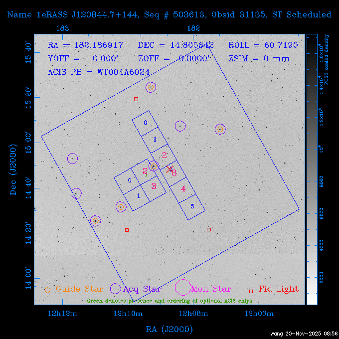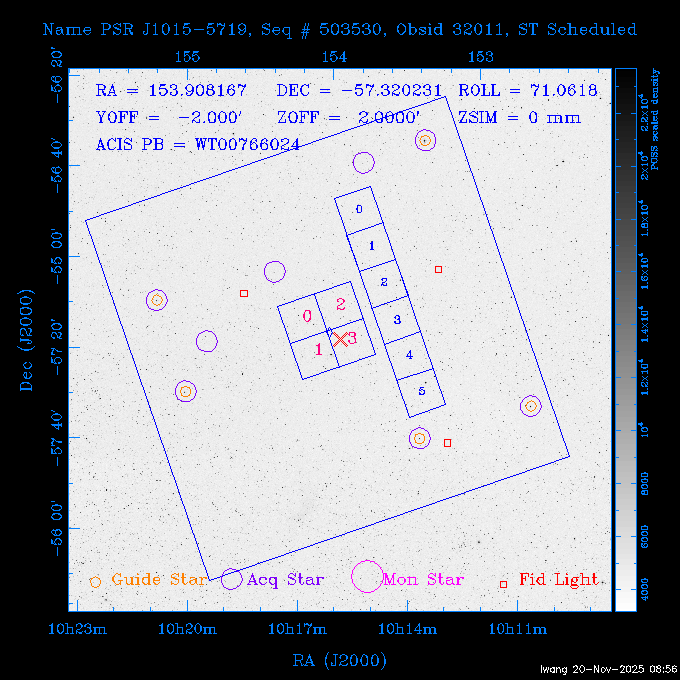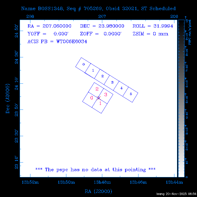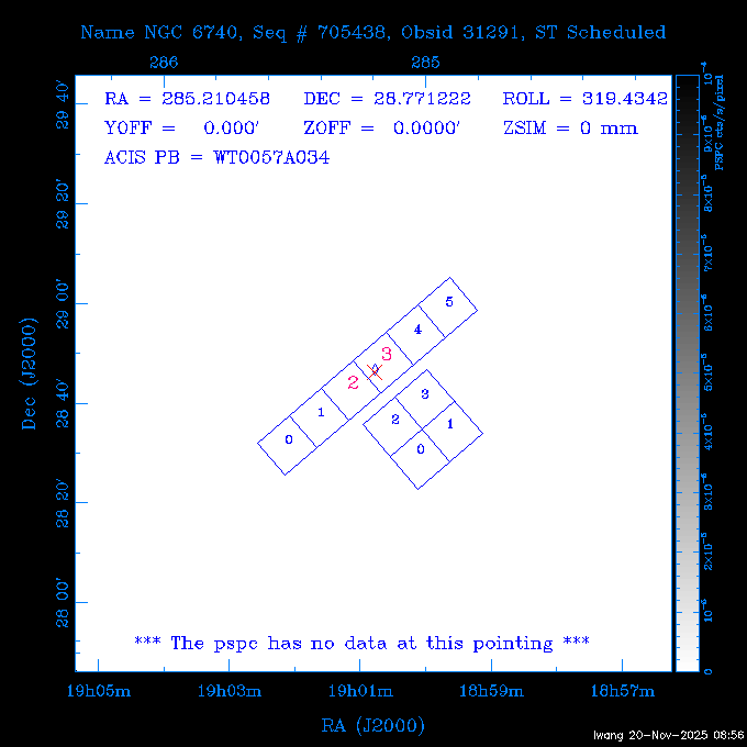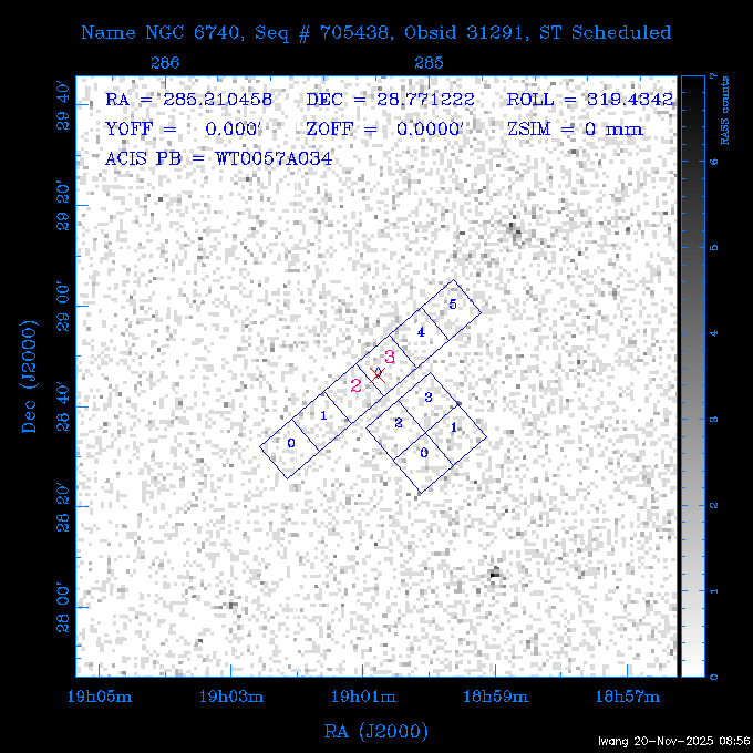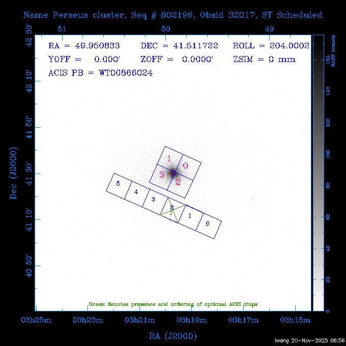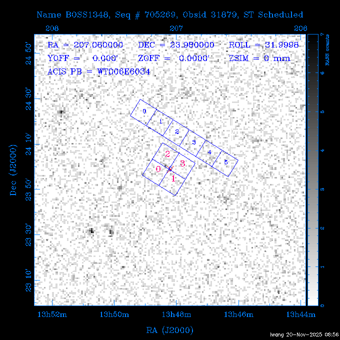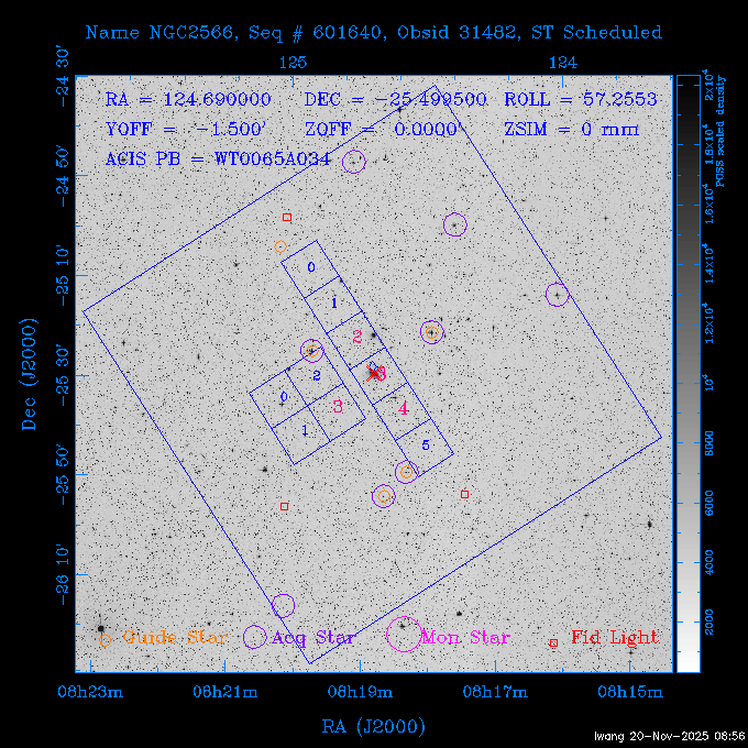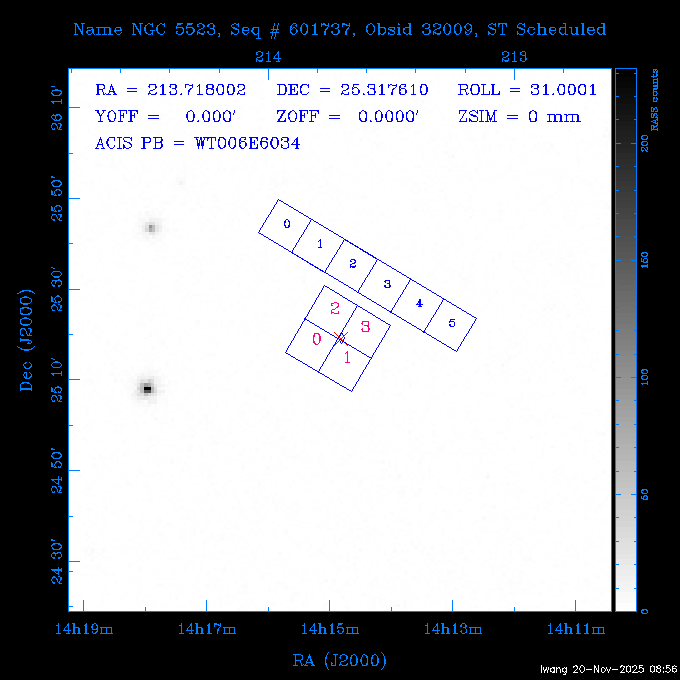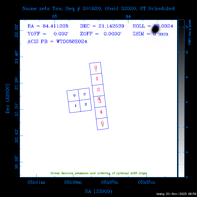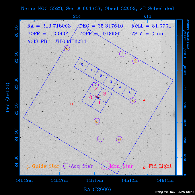 Seq # NB ObsID Constr. Target Start Time SI Grat Active Chips RA Dec Roll Pitch Slew Overlays ------ --- ----- ------- -------------------- --------------------- ----- ------ ---- ----------------- -------- -------- ------ ------ ------ ------------- ---- 41932 CAL-ER (PER01) 2025:327:21:33:05.077 3.0 -- -- 71.6435 18.9281 80.40 168.33 52.13 ---- 41931 CAL-ER (PER02) 2025:328:02:00:00.000 3.0 -- -- 184.7000 -33.6000 90.51 50.00 119.73 ---- 41930 CAL-ER (PER03) 2025:328:04:00:00.000 3.0 -- -- 81.4000 32.6000 108.00 157.18 118.31 705269 31879 0 BOSS1348 2025:328:06:32:54.070 14.5 ACIS-I NONE I0,I1,I2,I3 207.0600 23.9800 32.00 54.74 103.61 dss pspc rass 802196 30281 0 Perseus cluster 2025:328:11:15:30.689 10.0 ACIS-I NONE I0,I1,I2,I3,S2 49.9508 41.5117 205.09 157.42 114.50 dss pspc rass 705279 29991 0 NGC 4051 2025:328:14:38:37.605 33.0 ACIS-S HETG S2,S3 180.7900 44.5313 44.01 84.66 94.27 dss pspc rass 802196 32014 0 Perseus cluster 2025:329:00:25:12.501 10.0 ACIS-I NONE I0,I1,I2,I3,S2 49.9508 41.5117 206.50 157.36 94.87 dss pspc rass 705279 32010 0 NGC 4051 2025:329:03:48:16.092 13.0 ACIS-S HETG S2,S3 180.7900 44.5313 46.01 85.08 94.02 dss pspc rass 802196 32015 0 Perseus cluster 2025:329:08:01:24.175 10.0 ACIS-I NONE I0,I1,I2,I3,S2 49.9508 41.5117 207.30 157.30 94.36 dss pspc rass ---- 41929 CAL-ER (IAT01) 2025:329:11:08:58.342 0.9 -- -- 61.1063 28.6896 179.34 172.13 26.58 705269 32021 0 BOSS1348 2025:329:12:07:08.316 14.5 ACIS-I NONE I0,I1,I2,I3 207.0600 23.9800 32.00 55.68 121.42 dss pspc rass 802196 30317 0 Perseus cluster 2025:329:16:49:53.411 11.0 ACIS-I NONE I0,I1,I2,I3,S2 49.9508 41.5117 208.22 157.23 115.13 dss pspc rass 300559 30102 0 AN UMa 2025:329:20:29:02.671 33.0 ACIS-S HETG S1,S2,S3,S4,S5 166.1069 45.0539 58.00 94.86 91.44 dss pspc rass 802196 32016 0 Perseus cluster 2025:330:06:13:47.811 12.0 ACIS-I NONE I0,I1,I2,I3 49.9508 41.5117 197.99 157.10 86.64 dss pspc rass ---- 41928 CAL-ER (PER04) 2025:330:09:51:33.379 3.0 -- -- 61.0659 28.0381 187.13 172.87 16.85 ---- 41927 CAL-ER (PER05) 2025:330:17:20:00.000 3.0 -- -- 29.5000 53.0000 230.98 139.30 40.70 ---- 41926 CAL-ER (PER06) 2025:330:21:30:00.000 3.0 -- -- 233.5566 26.9258 11.20 48.77 97.43 402588 30532 0 Cygnus X-2 2025:330:23:29:00.063 42.1 ACIS-S HETG S2,S3 326.1715 38.3214 281.01 98.07 80.82 dss pspc rass 802196 31987 0 Perseus cluster 2025:331:11:42:51.227 9.7 ACIS-I NONE I0,I1,I2,I3,S2 49.9508 41.5117 212.78 156.81 62.17 dss pspc rass ---- 41925 CAL-ER (IAT02) 2025:331:14:59:15.270 0.9 -- -- 246.2937 51.6839 357.10 72.95 86.55 503530 30121 0 PSR J1015-5719 2025:331:16:02:38.792 10.0 ACIS-I NONE I0,I1,I2,I3 153.9082 -57.3202 70.58 71.92 144.94 dss pspc rass 201820 30521 1 zeta Tau 2025:331:19:28:11.788 12.5 ACIS-S HETG S0,S1,S2,S3,S4,S5 84.4112 21.1425 85.79 160.53 105.22 dss pspc rass 503530 32011 0 PSR J1015-5719 2025:331:23:35:22.614 10.0 ACIS-I NONE I0,I1,I2,I3 153.9082 -57.3202 71.08 72.05 105.06 dss pspc rass 601640 31482 0 NGC2566 2025:332:02:47:19.614 20.0 ACIS-S NONE I3,S2,S3,S4 124.6900 -25.4995 57.26 104.65 38.60 dss pspc rass 201820 32018 1 zeta Tau 2025:332:08:54:07.778 12.5 ACIS-S HETG S0,S1,S2,S3,S4,S5 84.4112 21.1425 85.60 161.08 67.24 dss pspc rass 503530 32012 0 PSR J1015-5719 2025:332:13:01:17.798 10.0 ACIS-I NONE I0,I1,I2,I3 153.9082 -57.3202 71.07 72.29 105.00 dss pspc rass ---- 41924 CAL-ER (IAT03) 2025:332:16:15:49.673 0.9 -- -- 183.3000 -9.6000 70.75 59.73 55.64 201820 32019 1 zeta Tau 2025:332:17:09:36.167 12.5 ACIS-S HETG S0,S1,S2,S3,S4,S5 84.4112 21.1425 85.50 161.42 101.66 dss pspc rass 503613 P1 31135 0 1eRASS J120844.7+144 2025:332:21:14:00.315 14.3 ACIS-S NONE I2,I3,S2,S3,S4 182.1869 14.8056 60.72 71.16 92.56 dss pspc rass ---- 41923 CAL-ER (PER08) 2025:333:01:48:39.382 3.0 -- -- 75.7882 27.1417 117.43 168.53 97.38 ---- 41922 CAL-ER (PER09) 2025:333:03:30:15.536 3.0 -- -- 53.7206 18.3580 288.21 169.01 162.46 ---- 41921 CAL-ER (PER07) 2025:333:05:52:00.000 3.0 -- -- 299.4000 -19.8000 281.98 50.64 118.36 ---- 41920 CAL-ER (PER10) 2025:333:10:13:43.171 1.0 -- -- 53.9381 19.2905 283.64 169.16 118.73 ---- 41919 CAL-ER (PER11) 2025:333:11:21:05.673 3.0 -- -- 76.3346 27.0763 116.67 168.53 158.44 601656 30174 0 NGC4654 2025:333:13:19:25.441 14.5 ACIS-S NONE I3,S2,S3,S4 190.9859 13.1265 52.00 63.65 105.19 dss pspc rass 201820 32020 1 zeta Tau 2025:333:17:58:58.869 10.0 ACIS-S HETG S0,S1,S2,S3,S4,S5 84.4112 21.1425 83.00 162.49 100.76 dss pspc rass 601656 32013 0 NGC4654 2025:333:21:23:32.298 14.2 ACIS-S NONE I3,S2,S3,S4 190.9859 13.1265 52.00 63.98 100.76 dss pspc rass 802196 32017 0 Perseus cluster 2025:334:02:03:15.585 10.0 ACIS-I NONE I0,I1,I2,I3 49.9508 41.5117 203.99 155.98 120.25 dss pspc rass 601737 CCT 32009 0 NGC 5523 2025:334:05:30:30.862 10.5 ACIS-I NONE I0,I1,I2,I3 213.7180 25.3176 31.00 56.53 112.90 dss pspc rass 802196 31988 0 Perseus cluster 2025:334:09:06:15.579 9.7 ACIS-I NONE I0,I1,I2,I3,S2 49.9508 41.5117 208.99 155.88 113.60 dss pspc rass 705473 P1 31438 0 IRAS 14026+4341 2025:334:12:24:37.680 10.5 ACIS-S NONE S2,S3 211.1617 43.4521 34.18 72.76 95.41 dss pspc rass 802196 31989 0 Perseus cluster 2025:334:15:56:09.083 9.8 ACIS-I NONE I0,I1,I2,I3,S2 49.9508 41.5117 203.99 155.77 94.61 dss pspc rass 705438 P1 31291 0 NGC 6740 2025:334:19:16:02.163 10.0 ACIS-S NONE S2,S3 285.2105 28.7712 319.45 62.68 94.73 dss pspc rass 802196 31990 0 Perseus cluster 2025:334:22:39:15.242 9.8 ACIS-I NONE I0,I1,I2,I3,S2 49.9508 41.5117 203.99 155.66 94.73 dss pspc rass