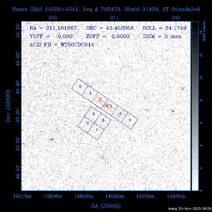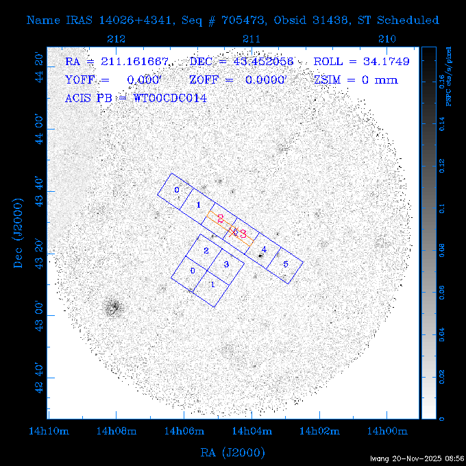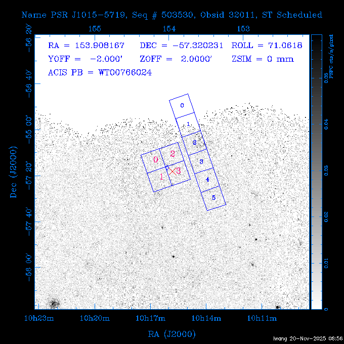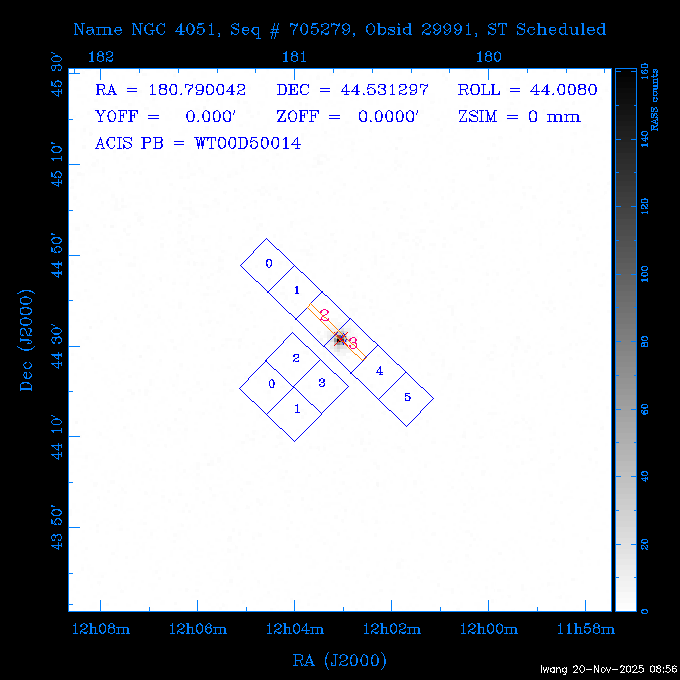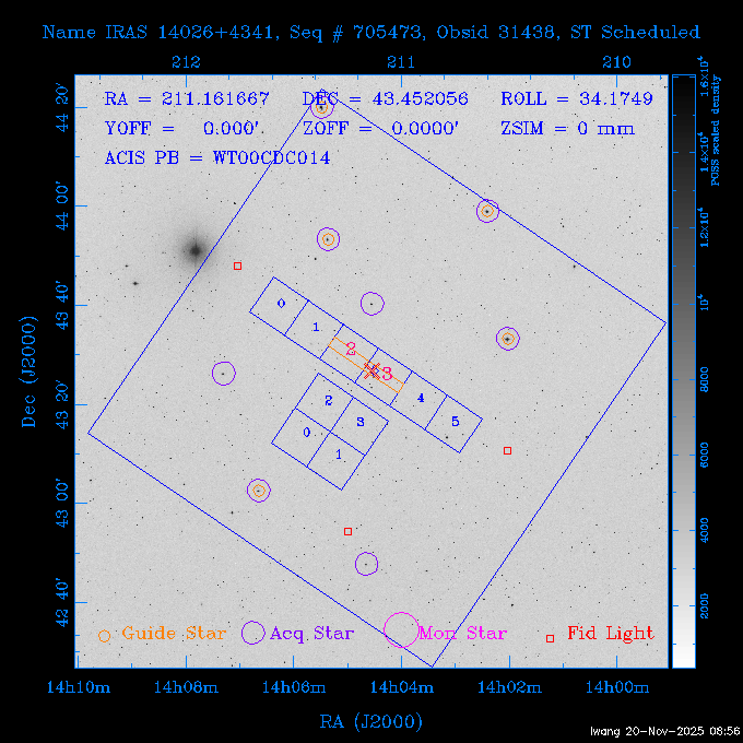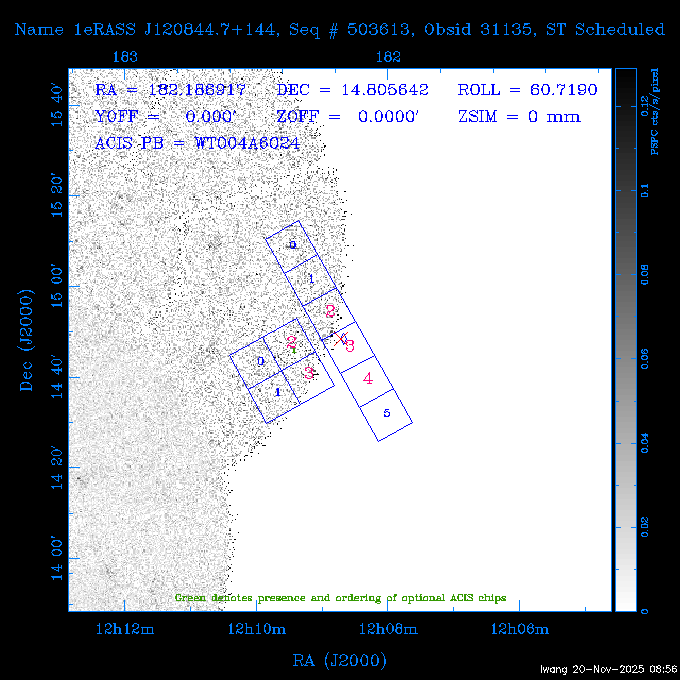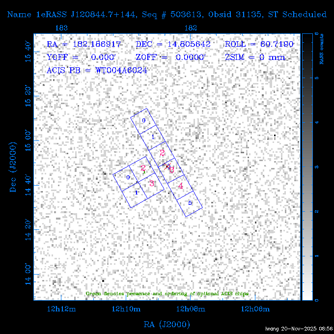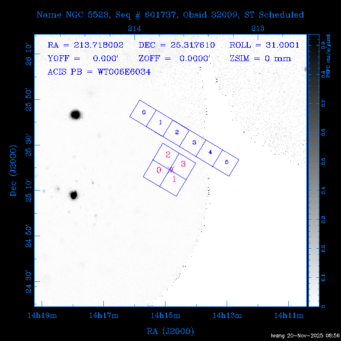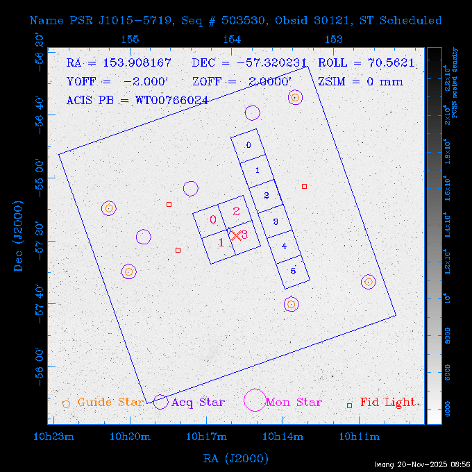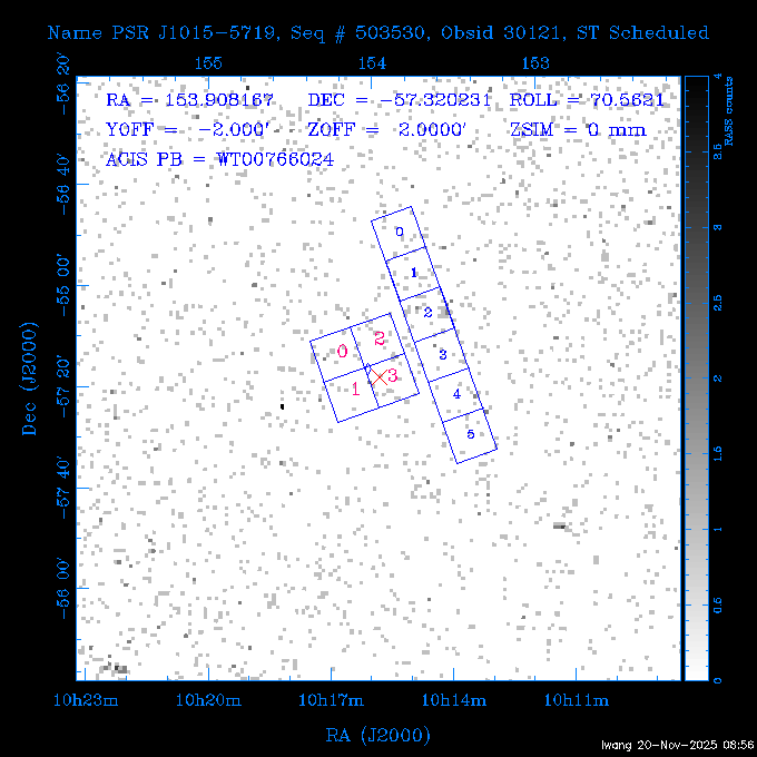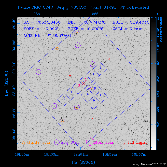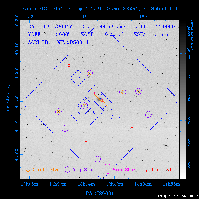 Seq # NB ObsID Constr. Target Start Time SI Grat Active Chips RA Dec Roll Pitch Slew Overlays ------ --- ----- ------- -------------------- --------------------- ----- ------ ---- ----------------- -------- -------- ------ ------ ------ ------------- ---- 41932 CAL-ER (PER01) 2025:327:21:33:05.077 3.0 -- -- 71.6435 18.9281 80.40 168.33 52.13 ---- 41931 CAL-ER (PER02) 2025:328:02:00:00.000 3.0 -- -- 184.7000 -33.6000 90.51 50.00 119.73 ---- 41930 CAL-ER (PER03) 2025:328:04:00:00.000 3.0 -- -- 81.4000 32.6000 108.00 157.18 118.31 705269 31879 0 BOSS1348 2025:328:06:32:54.070 14.5 ACIS-I NONE I0,I1,I2,I3 207.0600 23.9800 32.00 54.74 103.61 dss pspc rass 802196 30281 0 Perseus cluster 2025:328:11:15:30.689 10.0 ACIS-I NONE I0,I1,I2,I3,S2 49.9508 41.5117 205.09 157.42 114.50 dss pspc rass 705279 29991 0 NGC 4051 2025:328:14:38:37.605 33.0 ACIS-S HETG S2,S3 180.7900 44.5313 44.01 84.66 94.27 dss pspc rass 802196 32014 0 Perseus cluster 2025:329:00:25:12.501 10.0 ACIS-I NONE I0,I1,I2,I3,S2 49.9508 41.5117 206.50 157.36 94.87 dss pspc rass 705279 32010 0 NGC 4051 2025:329:03:48:16.092 13.0 ACIS-S HETG S2,S3 180.7900 44.5313 46.01 85.08 94.02 dss pspc rass 802196 32015 0 Perseus cluster 2025:329:08:01:24.175 10.0 ACIS-I NONE I0,I1,I2,I3,S2 49.9508 41.5117 207.30 157.30 94.36 dss pspc rass ---- 41929 CAL-ER (IAT01) 2025:329:11:08:58.342 0.9 -- -- 61.1063 28.6896 179.34 172.13 26.58 705269 32021 0 BOSS1348 2025:329:12:07:08.316 14.5 ACIS-I NONE I0,I1,I2,I3 207.0600 23.9800 32.00 55.68 121.42 dss pspc rass 802196 30317 0 Perseus cluster 2025:329:16:49:53.411 11.0 ACIS-I NONE I0,I1,I2,I3,S2 49.9508 41.5117 208.22 157.23 115.13 dss pspc rass 300559 30102 0 AN UMa 2025:329:20:29:02.671 33.0 ACIS-S HETG S1,S2,S3,S4,S5 166.1069 45.0539 58.00 94.86 91.44 dss pspc rass 802196 32016 0 Perseus cluster 2025:330:06:13:47.811 12.0 ACIS-I NONE I0,I1,I2,I3 49.9508 41.5117 197.99 157.10 86.64 dss pspc rass ---- 41928 CAL-ER (PER04) 2025:330:09:51:33.379 3.0 -- -- 61.0659 28.0381 187.13 172.87 16.85 ---- 41927 CAL-ER (PER05) 2025:330:17:20:00.000 3.0 -- -- 29.5000 53.0000 230.98 139.30 40.70 ---- 41926 CAL-ER (PER06) 2025:330:21:30:00.000 3.0 -- -- 233.5566 26.9258 11.20 48.77 97.43 402588 30532 0 Cygnus X-2 2025:330:23:29:00.063 42.1 ACIS-S HETG S2,S3 326.1715 38.3214 281.01 98.07 80.82 dss pspc rass 802196 31987 0 Perseus cluster 2025:331:11:42:51.227 9.7 ACIS-I NONE I0,I1,I2,I3,S2 49.9508 41.5117 212.78 156.81 62.17 dss pspc rass ---- 41925 CAL-ER (IAT02) 2025:331:14:59:15.270 0.9 -- -- 246.2937 51.6839 357.10 72.95 86.55 503530 30121 0 PSR J1015-5719 2025:331:16:02:38.792 10.0 ACIS-I NONE I0,I1,I2,I3 153.9082 -57.3202 70.58 71.92 144.94 dss pspc rass 201820 30521 1 zeta Tau 2025:331:19:28:11.788 12.5 ACIS-S HETG S0,S1,S2,S3,S4,S5 84.4112 21.1425 85.79 160.53 105.22 dss pspc rass 503530 32011 0 PSR J1015-5719 2025:331:23:35:22.614 10.0 ACIS-I NONE I0,I1,I2,I3 153.9082 -57.3202 71.08 72.05 105.06 dss pspc rass 601640 31482 0 NGC2566 2025:332:02:47:19.614 20.0 ACIS-S NONE I3,S2,S3,S4 124.6900 -25.4995 57.26 104.65 38.60 dss pspc rass 201820 32018 1 zeta Tau 2025:332:08:54:07.778 12.5 ACIS-S HETG S0,S1,S2,S3,S4,S5 84.4112 21.1425 85.60 161.08 67.24 dss pspc rass 503530 32012 0 PSR J1015-5719 2025:332:13:01:17.798 10.0 ACIS-I NONE I0,I1,I2,I3 153.9082 -57.3202 71.07 72.29 105.00 dss pspc rass ---- 41924 CAL-ER (IAT03) 2025:332:16:15:49.673 0.9 -- -- 183.3000 -9.6000 70.75 59.73 55.64 201820 32019 1 zeta Tau 2025:332:17:09:36.167 12.5 ACIS-S HETG S0,S1,S2,S3,S4,S5 84.4112 21.1425 85.50 161.42 101.66 dss pspc rass 503613 P1 31135 0 1eRASS J120844.7+144 2025:332:21:14:00.315 14.3 ACIS-S NONE I2,I3,S2,S3,S4 182.1869 14.8056 60.72 71.16 92.56 dss pspc rass ---- 41923 CAL-ER (PER08) 2025:333:01:48:39.382 3.0 -- -- 75.7882 27.1417 117.43 168.53 97.38 ---- 41922 CAL-ER (PER09) 2025:333:03:30:15.536 3.0 -- -- 53.7206 18.3580 288.21 169.01 162.46 ---- 41921 CAL-ER (PER07) 2025:333:05:52:00.000 3.0 -- -- 299.4000 -19.8000 281.98 50.64 118.36 ---- 41920 CAL-ER (PER10) 2025:333:10:13:43.171 1.0 -- -- 53.9381 19.2905 283.64 169.16 118.73 ---- 41919 CAL-ER (PER11) 2025:333:11:21:05.673 3.0 -- -- 76.3346 27.0763 116.67 168.53 158.44 601656 30174 0 NGC4654 2025:333:13:19:25.441 14.5 ACIS-S NONE I3,S2,S3,S4 190.9859 13.1265 52.00 63.65 105.19 dss pspc rass 201820 32020 1 zeta Tau 2025:333:17:58:58.869 10.0 ACIS-S HETG S0,S1,S2,S3,S4,S5 84.4112 21.1425 83.00 162.49 100.76 dss pspc rass 601656 32013 0 NGC4654 2025:333:21:23:32.298 14.2 ACIS-S NONE I3,S2,S3,S4 190.9859 13.1265 52.00 63.98 100.76 dss pspc rass 802196 32017 0 Perseus cluster 2025:334:02:03:15.585 10.0 ACIS-I NONE I0,I1,I2,I3 49.9508 41.5117 203.99 155.98 120.25 dss pspc rass 601737 CCT 32009 0 NGC 5523 2025:334:05:30:30.862 10.5 ACIS-I NONE I0,I1,I2,I3 213.7180 25.3176 31.00 56.53 112.90 dss pspc rass 802196 31988 0 Perseus cluster 2025:334:09:06:15.579 9.7 ACIS-I NONE I0,I1,I2,I3,S2 49.9508 41.5117 208.99 155.88 113.60 dss pspc rass 705473 P1 31438 0 IRAS 14026+4341 2025:334:12:24:37.680 10.5 ACIS-S NONE S2,S3 211.1617 43.4521 34.18 72.76 95.41 dss pspc rass 802196 31989 0 Perseus cluster 2025:334:15:56:09.083 9.8 ACIS-I NONE I0,I1,I2,I3,S2 49.9508 41.5117 203.99 155.77 94.61 dss pspc rass 705438 P1 31291 0 NGC 6740 2025:334:19:16:02.163 10.0 ACIS-S NONE S2,S3 285.2105 28.7712 319.45 62.68 94.73 dss pspc rass 802196 31990 0 Perseus cluster 2025:334:22:39:15.242 9.8 ACIS-I NONE I0,I1,I2,I3,S2 49.9508 41.5117 203.99 155.66 94.73 dss pspc rass