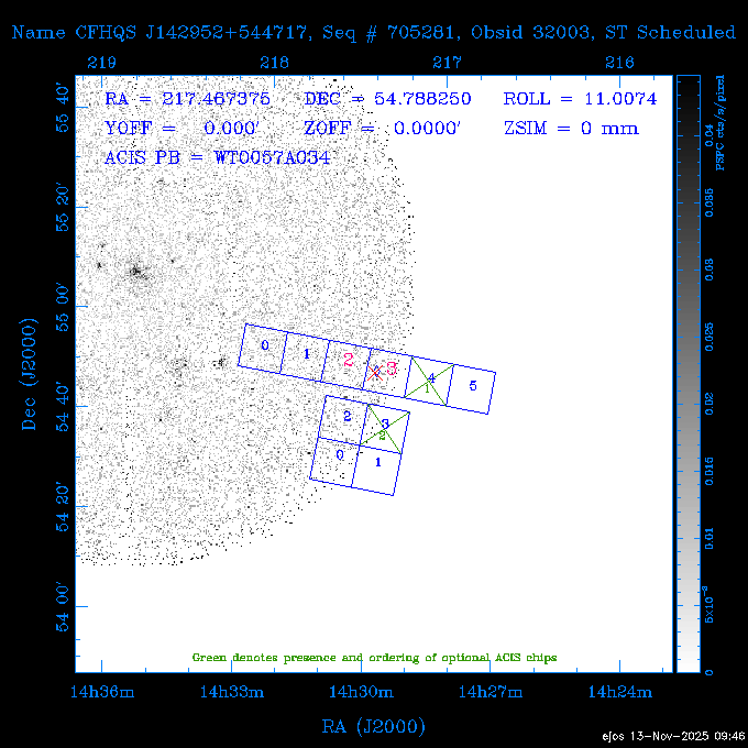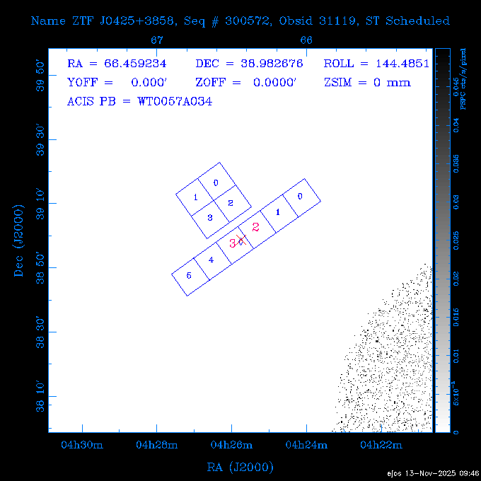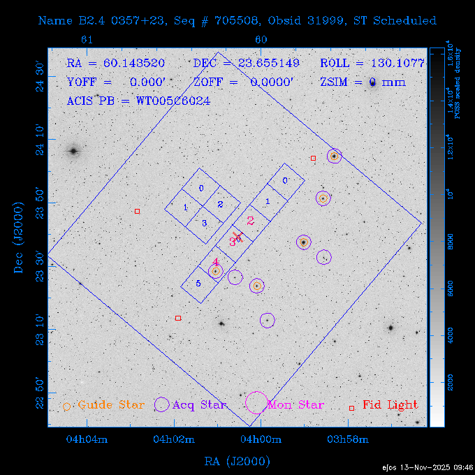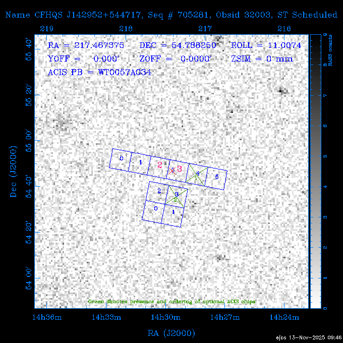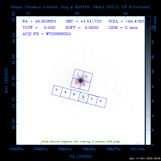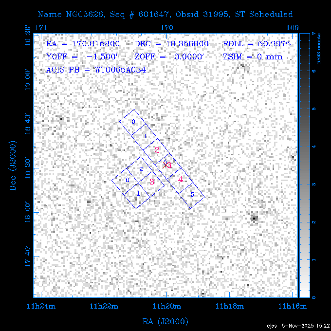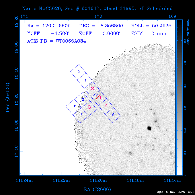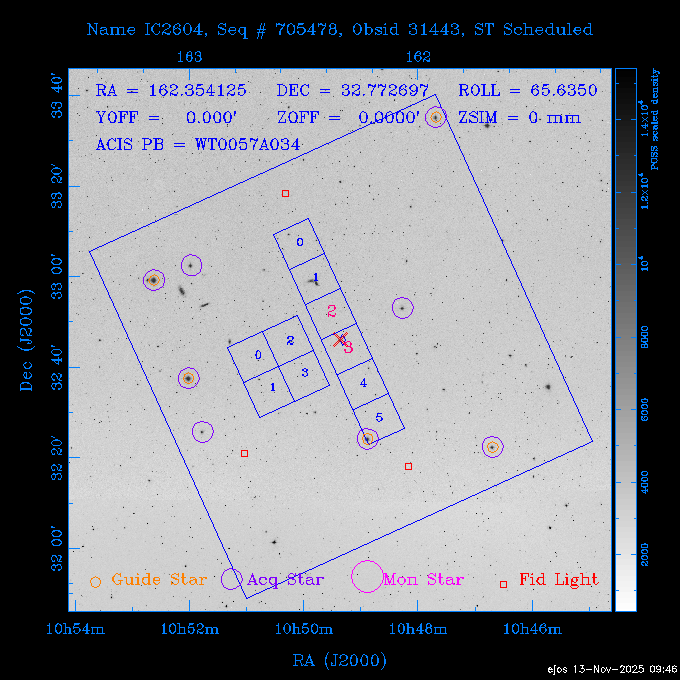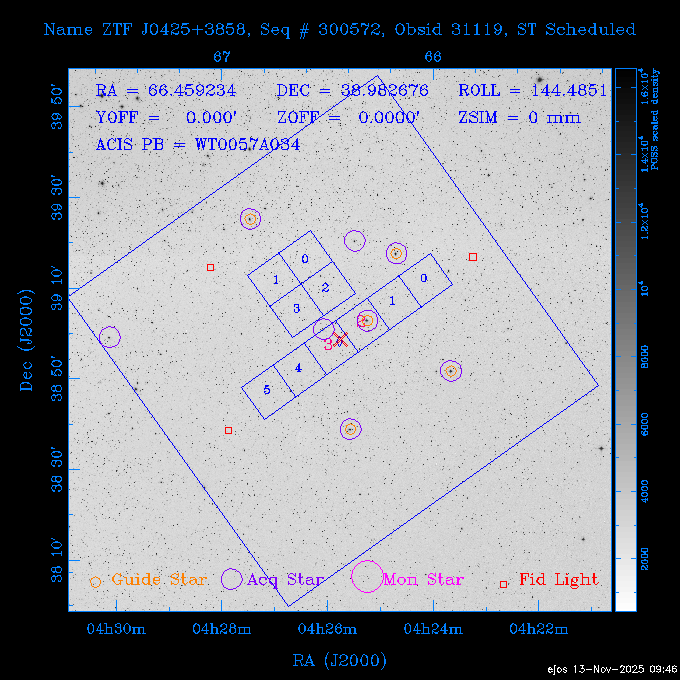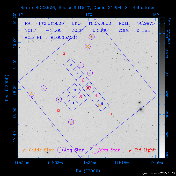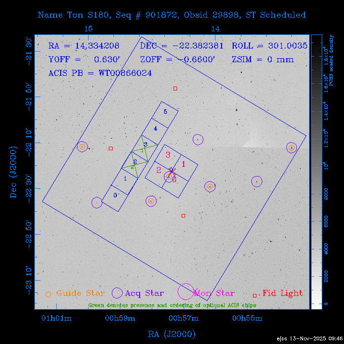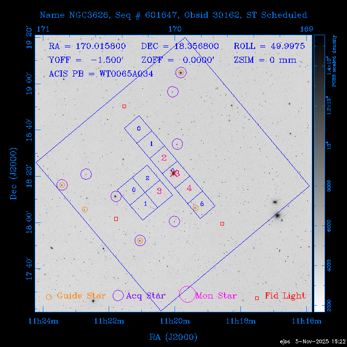 Seq # NB ObsID Constr. Target Start Time SI Grat Active Chips RA Dec Roll Pitch Slew Overlays ------ --- ----- ------- -------------------- --------------------- ----- ------ ---- ----------------- -------- -------- ------ ------ ------ ------------- 601645 31970 0 NGC3511 2025:312:18:37:32.079 16.5 ACIS-S NONE I3,S2,S3,S4 165.8490 -23.0866 85.39 54.49 120.46 dss pspc rass 601706 31980 0 NGC 1140 2025:312:23:53:44.415 10.8 ACIS-S NONE S2,S3 43.6397 -10.0287 10.00 153.15 115.68 dss pspc rass 503702 DDT 31983 0 GRB251013C 2025:313:03:29:41.478 38.7 ACIS-S NONE S2,S3 345.8356 -0.2103 289.69 120.11 92.03 dss pspc rass 705214 29926 0 SDSS J022226.11-0857 2025:313:14:45:26.002 12.6 ACIS-S NONE S2,S3 35.6088 -8.9504 341.02 152.58 67.84 dss pspc rass 705505 CCT 31968 0 2MASS J17422050-5146 2025:313:18:53:36.279 10.0 ACIS-S NONE S2,S3 265.5855 -51.7728 238.25 47.32 105.77 dss pspc rass 705402 31981 0 SDSS J014837.63+0600 2025:313:22:21:08.998 12.0 ACIS-I NONE I0,I1,I2,I3 27.1568 6.0056 303.95 159.41 114.20 dss pspc rass ---- 41970 CAL-ER (IAT02) 2025:314:02:26:12.066 0.9 -- -- 48.9007 31.7372 165.79 164.96 132.98 705450 P1 31303 0 SDSS J103149.70+2325 2025:314:03:19:04.424 10.0 ACIS-S NONE S2,S3 157.9571 23.4174 64.65 77.08 97.60 dss pspc rass 601634 29639 0 IC1954 2025:314:06:47:24.980 20.6 ACIS-S NONE I3,S2,S3,S4 52.8808 -51.9049 7.78 110.62 117.79 dss pspc rass ---- 41969 CAL-ER (PER01) 2025:314:13:04:43.364 3.0 -- -- 47.8372 15.4226 50.72 177.16 79.52 ---- 41968 CAL-ER (CAL01) 2025:314:14:38:59.218 5.0 -- -- 184.7978 -54.5910 123.79 48.68 129.44 ---- 41967 CAL-ER (CAL01) 2025:314:16:46:32.507 3.0 -- -- 47.8372 15.4226 48.12 177.26 129.25 ---- 41966 CAL-ER (CAL01) 2025:314:18:14:34.173 0.9 -- -- 48.2533 21.2685 149.24 175.35 101.38 ---- 41965 CAL-ER (PER05) 2025:314:18:55:17.209 0.9 -- -- 41.4384 43.4796 189.37 153.52 42.81 ---- 41964 CAL-ER (PER02) 2025:314:21:30:00.000 3.0 -- -- 238.4000 29.2000 343.89 48.03 105.70 ---- 41963 CAL-ER (PER03) 2025:314:22:48:12.717 3.0 -- -- 193.7100 19.0924 43.07 48.29 57.20 ---- 41962 CAL-ER (PER04) 2025:315:00:24:00.000 0.9 -- -- 48.2533 21.2685 151.71 175.56 127.70 601647 30161 0 NGC3626 2025:315:02:04:48.850 15.0 ACIS-S NONE I3,S2,S3,S4 170.0158 18.3568 59.00 65.71 113.27 dss pspc rass 802196 29631 0 Perseus cluster 2025:315:06:52:54.787 12.0 ACIS-I NONE I0,I1,I2,I3,S2 49.9508 41.5117 171.48 155.71 101.70 dss pspc rass 601647 30162 0 NGC3626 2025:315:10:51:30.113 14.0 ACIS-S NONE I3,S2,S3,S4 170.0158 18.3568 50.00 66.07 103.90 dss pspc rass 802196 31987 0 Perseus cluster 2025:315:15:23:09.889 10.0 ACIS-I NONE I0,I1,I2,I3,S2 49.9508 41.5117 166.98 155.86 102.73 dss pspc rass 601647 31994 0 NGC3626 2025:315:18:48:06.438 14.0 ACIS-S NONE I3,S2,S3,S4 170.0158 18.3568 51.00 66.38 102.49 dss pspc rass 802196 31988 0 Perseus cluster 2025:315:23:19:42.990 10.0 ACIS-I NONE I0,I1,I2,I3,S2 49.9508 41.5117 166.98 155.98 102.49 dss pspc rass 601647 31995 0 NGC3626 2025:316:02:44:39.539 14.0 ACIS-S NONE I3,S2,S3,S4 170.0158 18.3568 51.00 66.70 102.49 dss pspc rass ---- 41961 CAL-ER (IAT04) 2025:316:07:04:20.188 0.0 -- -- 109.0000 -14.1000 64.21 111.34 69.05 601730 31231 0 SDSS J031426.10-0108 2025:316:07:37:35.527 12.6 ACIS-S NONE S2,S3 48.6088 -1.1463 3.69 161.07 78.33 dss pspc rass ---- 41960 CAL-ER (CAL01) 2025:316:11:35:58.883 0.0 -- -- 109.0000 -14.1000 64.08 111.49 78.25 705017 31488 0 NGC 4579 2025:316:12:10:41.743 14.0 ACIS-S HETG S0,S1,S2,S3,S4,S5 189.4317 11.8181 51.00 47.84 84.89 dss pspc rass 802196 31989 0 Perseus cluster 2025:316:16:45:10.325 10.0 ACIS-I NONE I0,I1,I2,I3,S2 49.9508 41.5117 166.98 156.22 115.39 dss pspc rass 802201 30377 0 Abell 795 2025:316:20:07:23.852 28.9 ACIS-S NONE I3,S1,S2,S3 141.0221 14.1726 71.92 91.37 90.26 dss pspc rass ---- 41959 CAL-ER (PER06) 2025:317:04:43:33.093 3.0 -- -- 50.4662 19.2637 121.72 177.50 87.29 ---- 41958 CAL-ER (CAL01) 2025:317:06:01:57.825 0.9 -- -- 48.2533 21.2685 180.52 176.68 58.10 ---- 41957 CAL-ER (CAL01) 2025:317:07:01:46.214 3.0 -- -- 238.4000 29.2000 347.10 48.15 128.80 ---- 41956 CAL-ER (CAL01) 2025:317:08:35:52.633 0.9 -- -- 48.2533 21.2685 182.43 176.70 128.73 ---- 41955 CAL-ER (CAL01) 2025:317:11:00:00.000 0.9 -- -- 41.4384 43.4796 195.40 153.82 24.69 ---- 41954 CAL-ER (CAL01) 2025:317:13:40:00.000 0.9 -- -- 238.4000 29.2000 347.51 48.15 105.67 ---- 41953 CAL-ER (CAL01) 2025:317:15:36:00.000 0.9 -- -- 48.2533 21.2685 188.02 176.76 128.61 705279 30224 0 NGC 4051 2025:317:17:11:09.043 20.0 ACIS-S HETG S2,S3 180.7900 44.5313 46.01 76.35 106.50 dss pspc rass 802196 31990 0 Perseus cluster 2025:317:23:18:35.332 10.0 ACIS-I NONE I0,I1,I2,I3,S2 49.9508 41.5117 166.98 156.63 83.72 dss pspc rass ---- 41952 CAL-ER (IAT03) 2025:318:02:27:30.362 0.0 -- -- 97.4548 36.8560 100.33 133.88 50.63 705273 29985 0 MCG-5-23-16 2025:318:03:02:24.106 16.0 ACIS-S HETG S3 146.9172 -30.9489 70.00 74.32 85.71 dss pspc rass 705224 29936 3 NGC 1358 2025:318:08:04:48.414 15.0 ACIS-S NONE I2,I3,S2,S3,S4 53.4153 -5.0895 20.00 156.30 91.07 dss pspc rass 705273 31993 0 MCG-5-23-16 2025:318:12:50:32.723 16.0 ACIS-S HETG S3 146.9172 -30.9489 70.00 74.61 91.07 dss pspc rass 705224 31992 3 NGC 1358 2025:318:17:52:57.032 15.0 ACIS-S NONE I2,I3,S2,S3,S4 53.4153 -5.0895 20.00 156.25 91.07 dss pspc rass 601736 CCT 31986 0 ESO 320- G 014 2025:318:22:42:55.783 10.0 ACIS-I NONE I0,I1,I2,I3 174.4718 -39.2203 96.92 51.99 110.16 dss pspc rass 601634 31991 0 IC1954 2025:319:02:02:02.360 30.0 ACIS-S NONE I3,S2,S3,S4 52.8808 -51.9049 2.75 109.59 76.24 dss pspc rass 705507 CCT 31985 0 NGC7172_s1 2025:319:10:51:17.109 11.0 ACIS-S NONE S2,S3 330.3965 -31.8897 290.84 88.27 61.86 dss pspc rass 601730 31997 0 SDSS J031426.10-0108 2025:319:14:29:14.336 19.1 ACIS-S NONE S2,S3 48.6088 -1.1463 354.12 160.17 86.04 dss pspc rass ---- 41951 CAL-ER (CAL01) 2025:319:20:12:25.152 3.0 -- -- 47.8372 15.4226 317.61 175.64 40.07 ---- 41950 CAL-ER (PER07) 2025:319:21:46:23.542 3.0 -- -- 277.5648 -47.4307 249.03 47.46 128.13 ---- 41949 CAL-ER (PER09) 2025:319:23:21:38.78