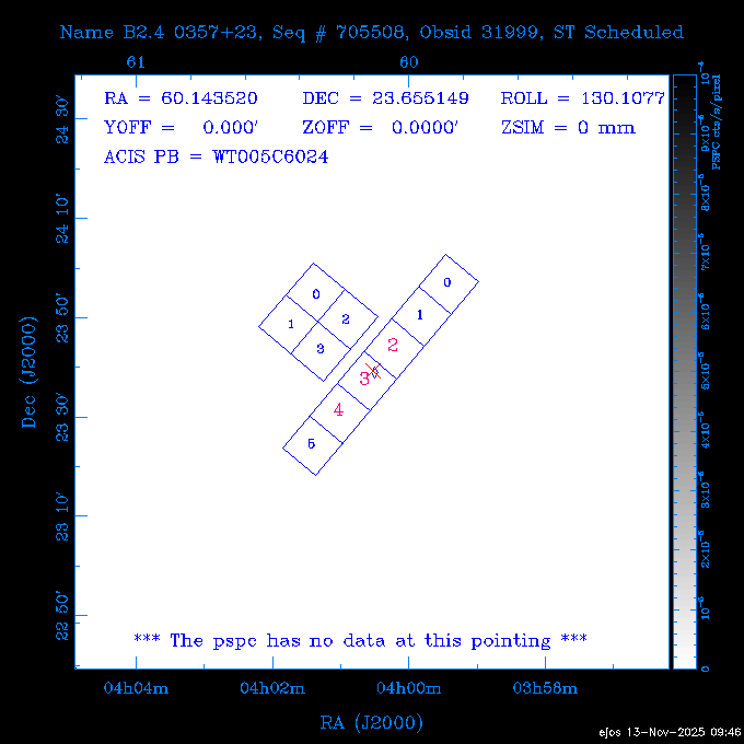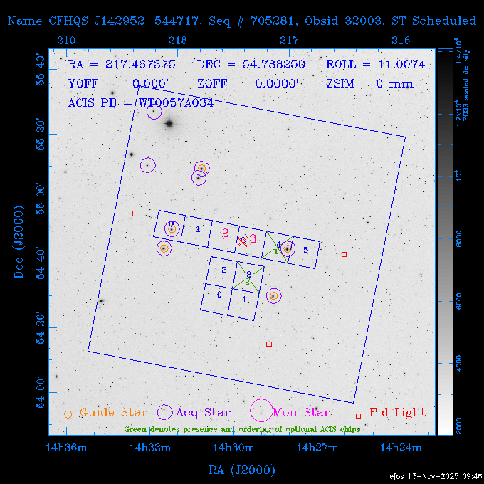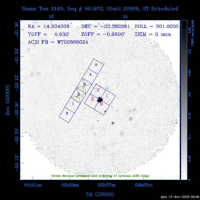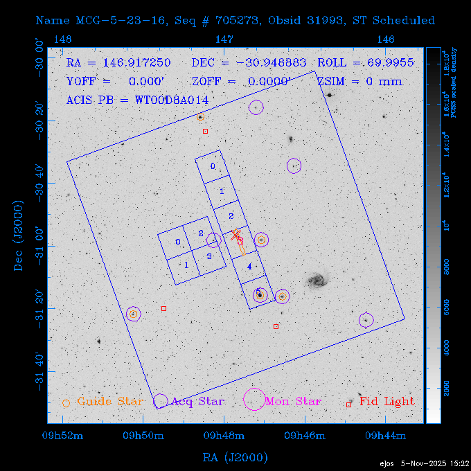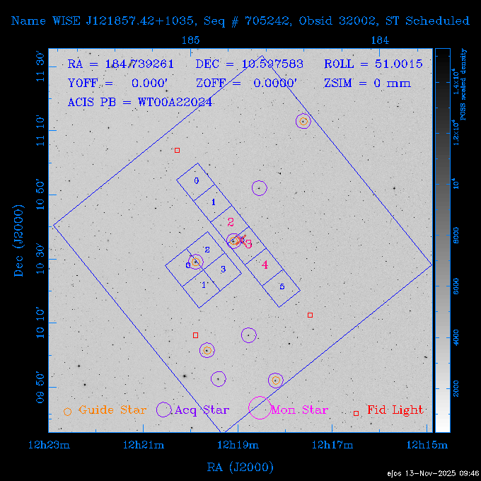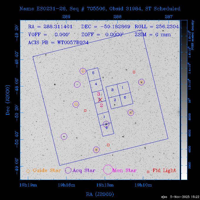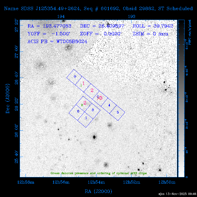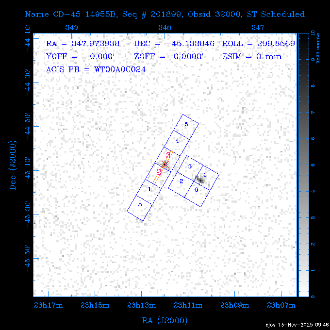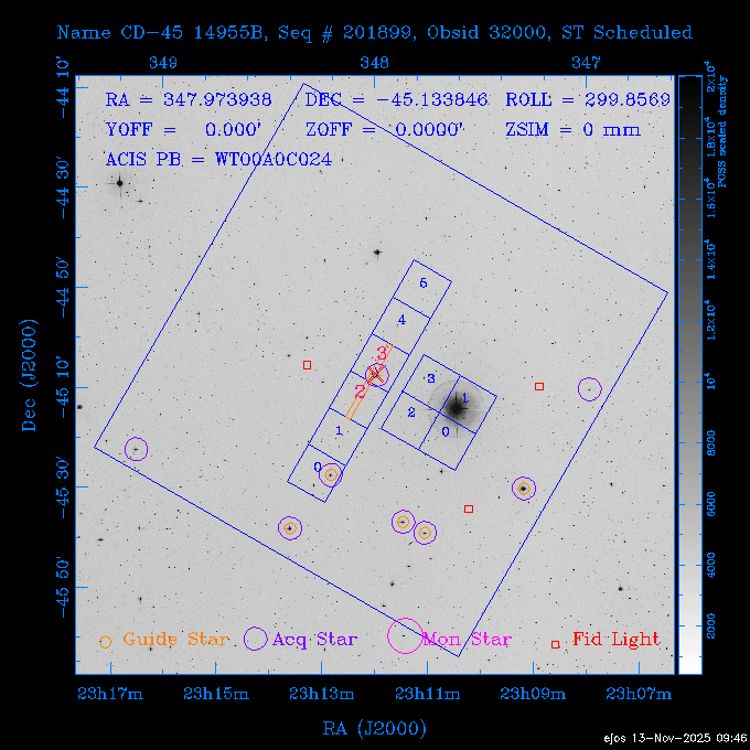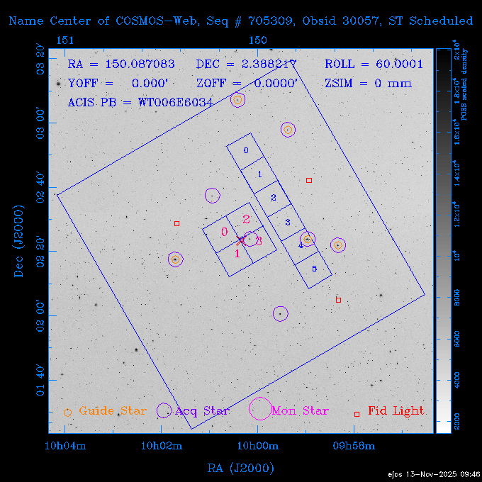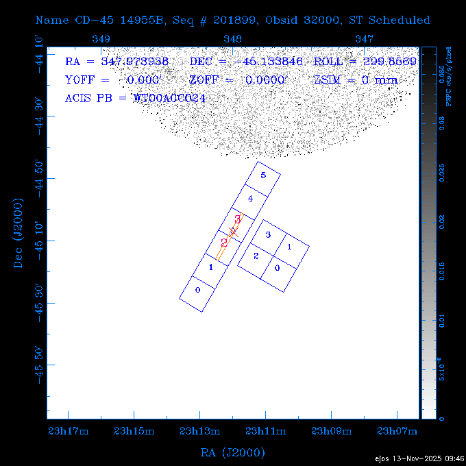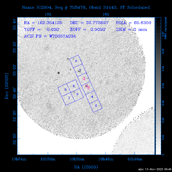Seq # NB ObsID Constr. Target Start Time SI Grat Active Chips RA Dec Roll Pitch Slew Overlays ------ --- ----- ------- -------------------- --------------------- ----- ------ ---- ----------------- -------- -------- ------ ------ ------ ------------- 601645 31970 0 NGC3511 2025:312:18:37:32.079 16.5 ACIS-S NONE I3,S2,S3,S4 165.8490 -23.0866 85.39 54.49 120.46 dss pspc rass 601706 31980 0 NGC 1140 2025:312:23:53:44.415 10.8 ACIS-S NONE S2,S3 43.6397 -10.0287 10.00 153.15 115.68 dss pspc rass 503702 DDT 31983 0 GRB251013C 2025:313:03:29:41.478 38.7 ACIS-S NONE S2,S3 345.8356 -0.2103 289.69 120.11 92.03 dss pspc rass 705214 29926 0 SDSS J022226.11-0857 2025:313:14:45:26.002 12.6 ACIS-S NONE S2,S3 35.6088 -8.9504 341.02 152.58 67.84 dss pspc rass 705505 CCT 31968 0 2MASS J17422050-5146 2025:313:18:53:36.279 10.0 ACIS-S NONE S2,S3 265.5855 -51.7728 238.25 47.32 105.77 dss pspc rass 705402 31981 0 SDSS J014837.63+0600 2025:313:22:21:08.998 12.0 ACIS-I NONE I0,I1,I2,I3 27.1568 6.0056 303.95 159.41 114.20 dss pspc rass ---- 41970 CAL-ER (IAT02) 2025:314:02:26:12.066 0.9 -- -- 48.9007 31.7372 165.79 164.96 132.98 705450 P1 31303 0 SDSS J103149.70+2325 2025:314:03:19:04.424 10.0 ACIS-S NONE S2,S3 157.9571 23.4174 64.65 77.08 97.60 dss pspc rass 601634 29639 0 IC1954 2025:314:06:47:24.980 20.6 ACIS-S NONE I3,S2,S3,S4 52.8808 -51.9049 7.78 110.62 117.79 dss pspc rass ---- 41969 CAL-ER (PER01) 2025:314:13:04:43.364 3.0 -- -- 47.8372 15.4226 50.72 177.16 79.52 ---- 41968 CAL-ER (CAL01) 2025:314:14:38:59.218 5.0 -- -- 184.7978 -54.5910 123.79 48.68 129.44 ---- 41967 CAL-ER (CAL01) 2025:314:16:46:32.507 3.0 -- -- 47.8372 15.4226 48.12 177.26 129.25 ---- 41966 CAL-ER (CAL01) 2025:314:18:14:34.173 0.9 -- -- 48.2533 21.2685 149.24 175.35 101.38 ---- 41965 CAL-ER (PER05) 2025:314:18:55:17.209 0.9 -- -- 41.4384 43.4796 189.37 153.52 42.81 ---- 41964 CAL-ER (PER02) 2025:314:21:30:00.000 3.0 -- -- 238.4000 29.2000 343.89 48.03 105.70 ---- 41963 CAL-ER (PER03) 2025:314:22:48:12.717 3.0 -- -- 193.7100 19.0924 43.07 48.29 57.20 ---- 41962 CAL-ER (PER04) 2025:315:00:24:00.000 0.9 -- -- 48.2533 21.2685 151.71 175.56 127.70 601647 30161 0 NGC3626 2025:315:02:04:48.850 15.0 ACIS-S NONE I3,S2,S3,S4 170.0158 18.3568 59.00 65.71 113.27 dss pspc rass 802196 29631 0 Perseus cluster 2025:315:06:52:54.787 12.0 ACIS-I NONE I0,I1,I2,I3,S2 49.9508 41.5117 171.48 155.71 101.70 dss pspc rass 601647 30162 0 NGC3626 2025:315:10:51:30.113 14.0 ACIS-S NONE I3,S2,S3,S4 170.0158 18.3568 50.00 66.07 103.90 dss pspc rass 802196 31987 0 Perseus cluster 2025:315:15:23:09.889 10.0 ACIS-I NONE I0,I1,I2,I3,S2 49.9508 41.5117 166.98 155.86 102.73 dss pspc rass 601647 31994 0 NGC3626 2025:315:18:48:06.438 14.0 ACIS-S NONE I3,S2,S3,S4 170.0158 18.3568 51.00 66.38 102.49 dss pspc rass 802196 31988 0 Perseus cluster 2025:315:23:19:42.990 10.0 ACIS-I NONE I0,I1,I2,I3,S2 49.9508 41.5117 166.98 155.98 102.49 dss pspc rass 601647 31995 0 NGC3626 2025:316:02:44:39.539 14.0 ACIS-S NONE I3,S2,S3,S4 170.0158 18.3568 51.00 66.70 102.49 dss pspc rass ---- 41961 CAL-ER (IAT04) 2025:316:07:04:20.188 0.0 -- -- 109.0000 -14.1000 64.21 111.34 69.05 601730 31231 0 SDSS J031426.10-0108 2025:316:07:37:35.527 12.6 ACIS-S NONE S2,S3 48.6088 -1.1463 3.69 161.07 78.33 dss pspc rass ---- 41960 CAL-ER (CAL01) 2025:316:11:35:58.883 0.0 -- -- 109.0000 -14.1000 64.08 111.49 78.25 705017 31488 0 NGC 4579 2025:316:12:10:41.743 14.0 ACIS-S HETG S0,S1,S2,S3,S4,S5 189.4317 11.8181 51.00 47.84 84.89 dss pspc rass 802196 31989 0 Perseus cluster 2025:316:16:45:10.325 10.0 ACIS-I NONE I0,I1,I2,I3,S2 49.9508 41.5117 166.98 156.22 115.39 dss pspc rass 802201 30377 0 Abell 795 2025:316:20:07:23.852 28.9 ACIS-S NONE I3,S1,S2,S3 141.0221 14.1726 71.92 91.37 90.26 dss pspc rass ---- 41959 CAL-ER (PER06) 2025:317:04:43:33.093 3.0 -- -- 50.4662 19.2637 121.72 177.50 87.29 ---- 41958 CAL-ER (CAL01) 2025:317:06:01:57.825 0.9 -- -- 48.2533 21.2685 180.52 176.68 58.10 ---- 41957 CAL-ER (CAL01) 2025:317:07:01:46.214 3.0 -- -- 238.4000 29.2000 347.10 48.15 128.80 ---- 41956 CAL-ER (CAL01) 2025:317:08:35:52.633 0.9 -- -- 48.2533 21.2685 182.43 176.70 128.73 ---- 41955 CAL-ER (CAL01) 2025:317:11:00:00.000 0.9 -- -- 41.4384 43.4796 195.40 153.82 24.69 ---- 41954 CAL-ER (CAL01) 2025:317:13:40:00.000 0.9 -- -- 238.4000 29.2000 347.51 48.15 105.67 ---- 41953 CAL-ER (CAL01) 2025:317:15:36:00.000 0.9 -- -- 48.2533 21.2685 188.02 176.76 128.61 705279 30224 0 NGC 4051 2025:317:17:11:09.043 20.0 ACIS-S HETG S2,S3 180.7900 44.5313 46.01 76.35 106.50 dss pspc rass 802196 31990 0 Perseus cluster 2025:317:23:18:35.332 10.0 ACIS-I NONE I0,I1,I2,I3,S2 49.9508 41.5117 166.98 156.63 83.72 dss pspc rass ---- 41952 CAL-ER (IAT03) 2025:318:02:27:30.362 0.0 -- -- 97.4548 36.8560 100.33 133.88 50.63 705273 29985 0 MCG-5-23-16 2025:318:03:02:24.106 16.0 ACIS-S HETG S3 146.9172 -30.9489 70.00 74.32 85.71 dss pspc rass 705224 29936 3 NGC 1358 2025:318:08:04:48.414 15.0 ACIS-S NONE I2,I3,S2,S3,S4 53.4153 -5.0895 20.00 156.30 91.07 dss pspc rass 705273 31993 0 MCG-5-23-16 2025:318:12:50:32.723 16.0 ACIS-S HETG S3 146.9172 -30.9489 70.00 74.61 91.07 dss pspc rass 705224 31992 3 NGC 1358 2025:318:17:52:57.032 15.0 ACIS-S NONE I2,I3,S2,S3,S4 53.4153 -5.0895 20.00 156.25 91.07 dss pspc rass 601736 CCT 31986 0 ESO 320- G 014 2025:318:22:42:55.783 10.0 ACIS-I NONE I0,I1,I2,I3 174.4718 -39.2203 96.92 51.99 110.16 dss pspc rass 601634 31991 0 IC1954 2025:319:02:02:02.360 30.0 ACIS-S NONE I3,S2,S3,S4 52.8808 -51.9049 2.75 109.59 76.24 dss pspc rass 705507 CCT 31985 0 NGC7172_s1 2025:319:10:51:17.109 11.0 ACIS-S NONE S2,S3 330.3965 -31.8897 290.84 88.27 61.86 dss pspc rass 601730 31997 0 SDSS J031426.10-0108 2025:319:14:29:14.336 19.1 ACIS-S NONE S2,S3 48.6088 -1.1463 354.12 160.17 86.04 dss pspc rass ---- 41951 CAL-ER (CAL01) 2025:319:20:12:25.152 3.0 -- -- 47.8372 15.4226 317.61 175.64 40.07 ---- 41950 CAL-ER (PER07) 2025:319:21:46:23.542 3.0 -- -- 277.5648 -47.4307 249.03 47.46 128.13 ---- 41949 CAL-ER (PER09) 2025:319:23:21:38.78