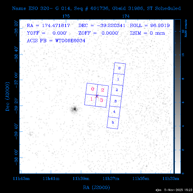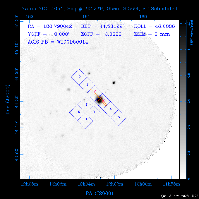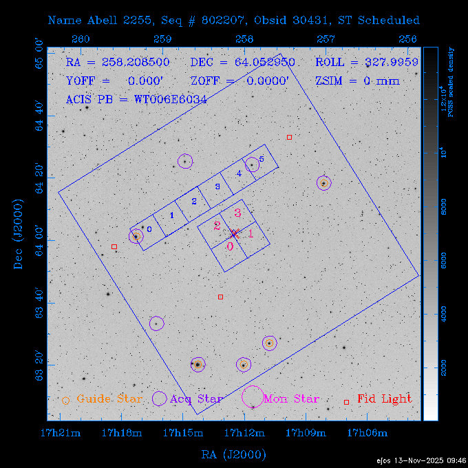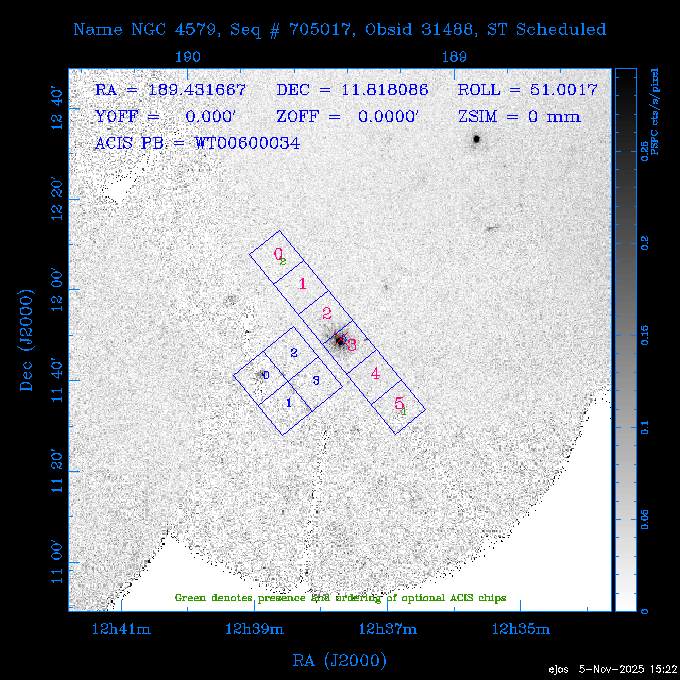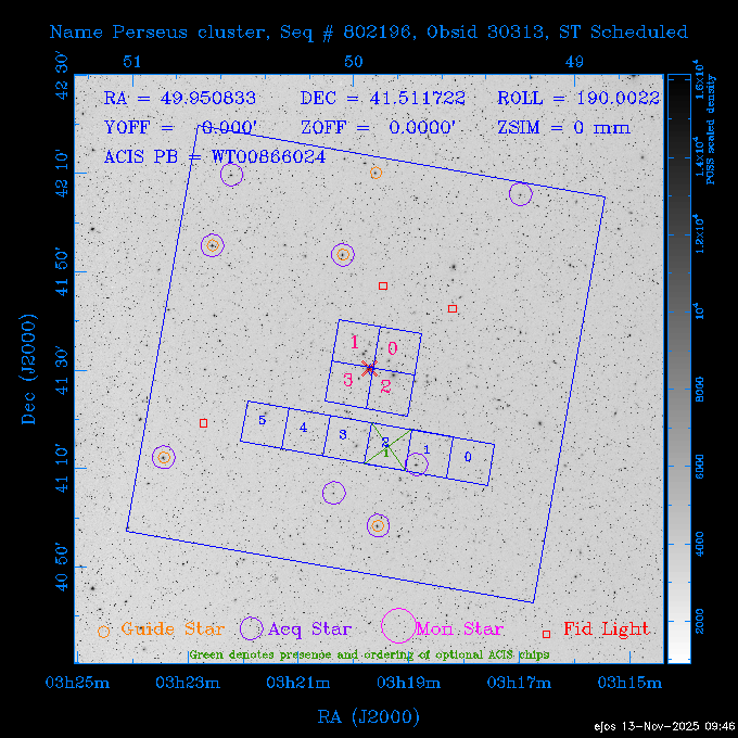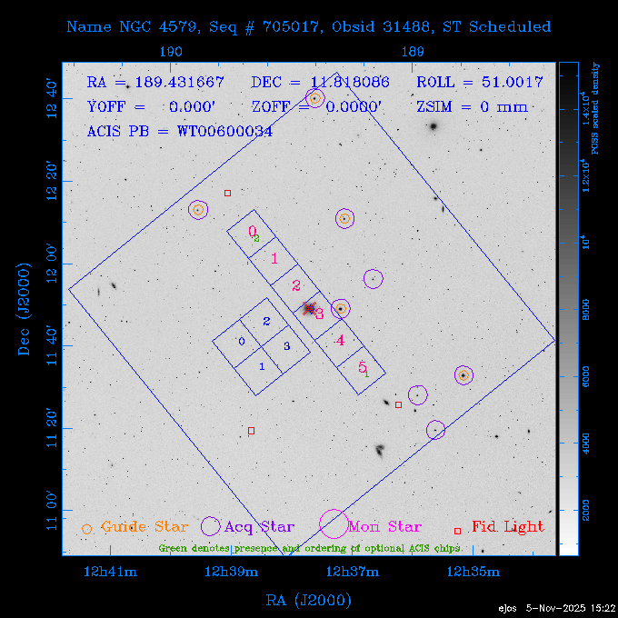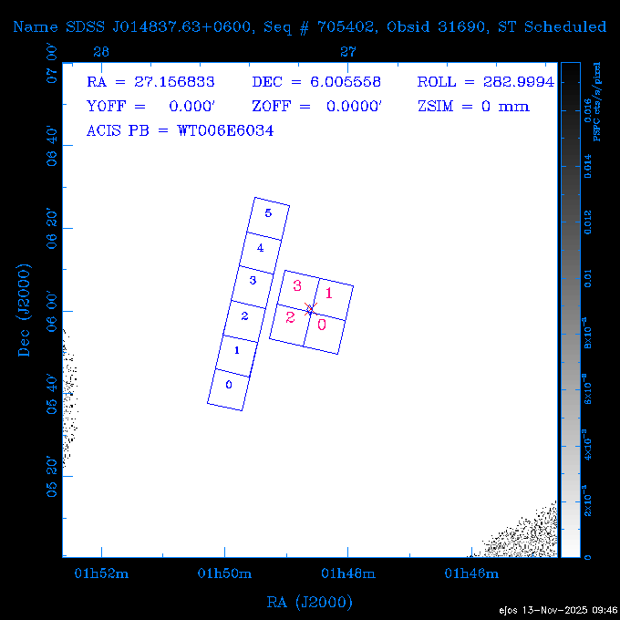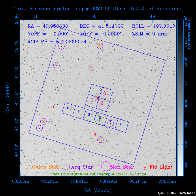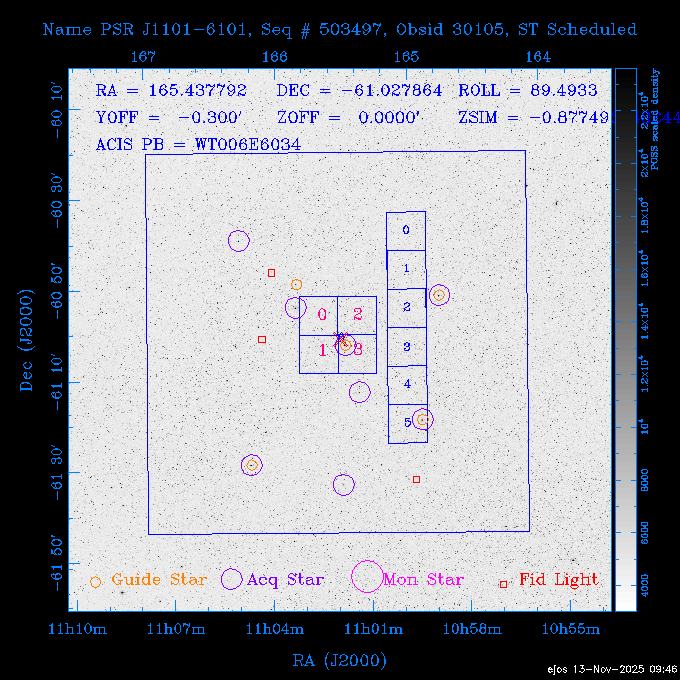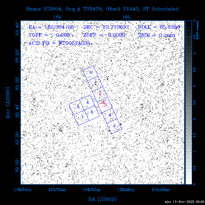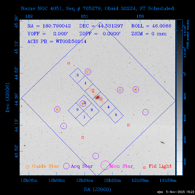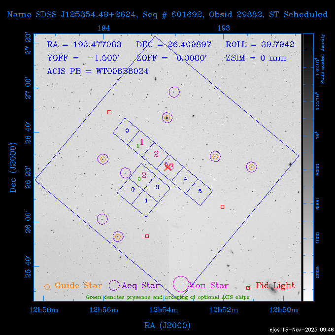 Seq # NB ObsID Constr. Target Start Time SI Grat Active Chips RA Dec Roll Pitch Slew Overlays ------ --- ----- ------- -------------------- --------------------- ----- ------ ---- ----------------- -------- -------- ------ ------ ------ ------------- 601645 31970 0 NGC3511 2025:312:18:37:32.079 16.5 ACIS-S NONE I3,S2,S3,S4 165.8490 -23.0866 85.39 54.49 120.46 dss pspc rass 601706 31980 0 NGC 1140 2025:312:23:53:44.415 10.8 ACIS-S NONE S2,S3 43.6397 -10.0287 10.00 153.15 115.68 dss pspc rass 503702 DDT 31983 0 GRB251013C 2025:313:03:29:41.478 38.7 ACIS-S NONE S2,S3 345.8356 -0.2103 289.69 120.11 92.03 dss pspc rass 705214 29926 0 SDSS J022226.11-0857 2025:313:14:45:26.002 12.6 ACIS-S NONE S2,S3 35.6088 -8.9504 341.02 152.58 67.84 dss pspc rass 705505 CCT 31968 0 2MASS J17422050-5146 2025:313:18:53:36.279 10.0 ACIS-S NONE S2,S3 265.5855 -51.7728 238.25 47.32 105.77 dss pspc rass 705402 31981 0 SDSS J014837.63+0600 2025:313:22:21:08.998 12.0 ACIS-I NONE I0,I1,I2,I3 27.1568 6.0056 303.95 159.41 114.20 dss pspc rass ---- 41970 CAL-ER (IAT02) 2025:314:02:26:12.066 0.9 -- -- 48.9007 31.7372 165.79 164.96 132.98 705450 P1 31303 0 SDSS J103149.70+2325 2025:314:03:19:04.424 10.0 ACIS-S NONE S2,S3 157.9571 23.4174 64.65 77.08 97.60 dss pspc rass 601634 29639 0 IC1954 2025:314:06:47:24.980 20.6 ACIS-S NONE I3,S2,S3,S4 52.8808 -51.9049 7.78 110.62 117.79 dss pspc rass ---- 41969 CAL-ER (PER01) 2025:314:13:04:43.364 3.0 -- -- 47.8372 15.4226 50.72 177.16 79.52 ---- 41968 CAL-ER (CAL01) 2025:314:14:38:59.218 5.0 -- -- 184.7978 -54.5910 123.79 48.68 129.44 ---- 41967 CAL-ER (CAL01) 2025:314:16:46:32.507 3.0 -- -- 47.8372 15.4226 48.12 177.26 129.25 ---- 41966 CAL-ER (CAL01) 2025:314:18:14:34.173 0.9 -- -- 48.2533 21.2685 149.24 175.35 101.38 ---- 41965 CAL-ER (PER05) 2025:314:18:55:17.209 0.9 -- -- 41.4384 43.4796 189.37 153.52 42.81 ---- 41964 CAL-ER (PER02) 2025:314:21:30:00.000 3.0 -- -- 238.4000 29.2000 343.89 48.03 105.70 ---- 41963 CAL-ER (PER03) 2025:314:22:48:12.717 3.0 -- -- 193.7100 19.0924 43.07 48.29 57.20 ---- 41962 CAL-ER (PER04) 2025:315:00:24:00.000 0.9 -- -- 48.2533 21.2685 151.71 175.56 127.70 601647 30161 0 NGC3626 2025:315:02:04:48.850 15.0 ACIS-S NONE I3,S2,S3,S4 170.0158 18.3568 59.00 65.71 113.27 dss pspc rass 802196 29631 0 Perseus cluster 2025:315:06:52:54.787 12.0 ACIS-I NONE I0,I1,I2,I3,S2 49.9508 41.5117 171.48 155.71 101.70 dss pspc rass 601647 30162 0 NGC3626 2025:315:10:51:30.113 14.0 ACIS-S NONE I3,S2,S3,S4 170.0158 18.3568 50.00 66.07 103.90 dss pspc rass 802196 31987 0 Perseus cluster 2025:315:15:23:09.889 10.0 ACIS-I NONE I0,I1,I2,I3,S2 49.9508 41.5117 166.98 155.86 102.73 dss pspc rass 601647 31994 0 NGC3626 2025:315:18:48:06.438 14.0 ACIS-S NONE I3,S2,S3,S4 170.0158 18.3568 51.00 66.38 102.49 dss pspc rass 802196 31988 0 Perseus cluster 2025:315:23:19:42.990 10.0 ACIS-I NONE I0,I1,I2,I3,S2 49.9508 41.5117 166.98 155.98 102.49 dss pspc rass 601647 31995 0 NGC3626 2025:316:02:44:39.539 14.0 ACIS-S NONE I3,S2,S3,S4 170.0158 18.3568 51.00 66.70 102.49 dss pspc rass ---- 41961 CAL-ER (IAT04) 2025:316:07:04:20.188 0.0 -- -- 109.0000 -14.1000 64.21 111.34 69.05 601730 31231 0 SDSS J031426.10-0108 2025:316:07:37:35.527 12.6 ACIS-S NONE S2,S3 48.6088 -1.1463 3.69 161.07 78.33 dss pspc rass ---- 41960 CAL-ER (CAL01) 2025:316:11:35:58.883 0.0 -- -- 109.0000 -14.1000 64.08 111.49 78.25 705017 31488 0 NGC 4579 2025:316:12:10:41.743 14.0 ACIS-S HETG S0,S1,S2,S3,S4,S5 189.4317 11.8181 51.00 47.84 84.89 dss pspc rass 802196 31989 0 Perseus cluster 2025:316:16:45:10.325 10.0 ACIS-I NONE I0,I1,I2,I3,S2 49.9508 41.5117 166.98 156.22 115.39 dss pspc rass 802201 30377 0 Abell 795 2025:316:20:07:23.852 28.9 ACIS-S NONE I3,S1,S2,S3 141.0221 14.1726 71.92 91.37 90.26 dss pspc rass ---- 41959 CAL-ER (PER06) 2025:317:04:43:33.093 3.0 -- -- 50.4662 19.2637 121.72 177.50 87.29 ---- 41958 CAL-ER (CAL01) 2025:317:06:01:57.825 0.9 -- -- 48.2533 21.2685 180.52 176.68 58.10 ---- 41957 CAL-ER (CAL01) 2025:317:07:01:46.214 3.0 -- -- 238.4000 29.2000 347.10 48.15 128.80 ---- 41956 CAL-ER (CAL01) 2025:317:08:35:52.633 0.9 -- -- 48.2533 21.2685 182.43 176.70 128.73 ---- 41955 CAL-ER (CAL01) 2025:317:11:00:00.000 0.9 -- -- 41.4384 43.4796 195.40 153.82 24.69 ---- 41954 CAL-ER (CAL01) 2025:317:13:40:00.000 0.9 -- -- 238.4000 29.2000 347.51 48.15 105.67 ---- 41953 CAL-ER (CAL01) 2025:317:15:36:00.000 0.9 -- -- 48.2533 21.2685 188.02 176.76 128.61 705279 30224 0 NGC 4051 2025:317:17:11:09.043 20.0 ACIS-S HETG S2,S3 180.7900 44.5313 46.01 76.35 106.50 dss pspc rass 802196 31990 0 Perseus cluster 2025:317:23:18:35.332 10.0 ACIS-I NONE I0,I1,I2,I3,S2 49.9508 41.5117 166.98 156.63 83.72 dss pspc rass ---- 41952 CAL-ER (IAT03) 2025:318:02:27:30.362 0.0 -- -- 97.4548 36.8560 100.33 133.88 50.63 705273 29985 0 MCG-5-23-16 2025:318:03:02:24.106 16.0 ACIS-S HETG S3 146.9172 -30.9489 70.00 74.32 85.71 dss pspc rass 705224 29936 3 NGC 1358 2025:318:08:04:48.414 15.0 ACIS-S NONE I2,I3,S2,S3,S4 53.4153 -5.0895 20.00 156.30 91.07 dss pspc rass 705273 31993 0 MCG-5-23-16 2025:318:12:50:32.723 16.0 ACIS-S HETG S3 146.9172 -30.9489 70.00 74.61 91.07 dss pspc rass 705224 31992 3 NGC 1358 2025:318:17:52:57.032 15.0 ACIS-S NONE I2,I3,S2,S3,S4 53.4153 -5.0895 20.00 156.25 91.07 dss pspc rass 601736 CCT 31986 0 ESO 320- G 014 2025:318:22:42:55.783 10.0 ACIS-I NONE I0,I1,I2,I3 174.4718 -39.2203 96.92 51.99 110.16 dss pspc rass 601634 31991 0 IC1954 2025:319:02:02:02.360 30.0 ACIS-S NONE I3,S2,S3,S4 52.8808 -51.9049 2.75 109.59 76.24 dss pspc rass 705507 CCT 31985 0 NGC7172_s1 2025:319:10:51:17.109 11.0 ACIS-S NONE S2,S3 330.3965 -31.8897 290.84 88.27 61.86 dss pspc rass 601730 31997 0 SDSS J031426.10-0108 2025:319:14:29:14.336 19.1 ACIS-S NONE S2,S3 48.6088 -1.1463 354.12 160.17 86.04 dss pspc rass ---- 41951 CAL-ER (CAL01) 2025:319:20:12:25.152 3.0 -- -- 47.8372 15.4226 317.61 175.64 40.07 ---- 41950 CAL-ER (PER07) 2025:319:21:46:23.542 3.0 -- -- 277.5648 -47.4307 249.03 47.46 128.13 ---- 41949 CAL-ER (PER09) 2025:319:23:21:38.78