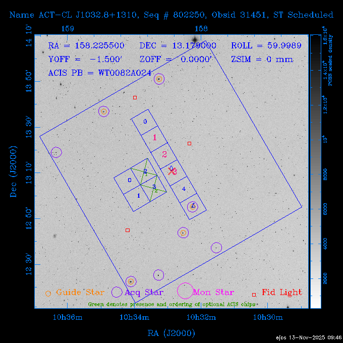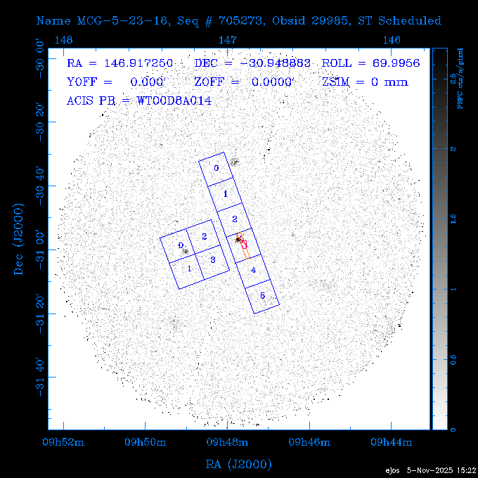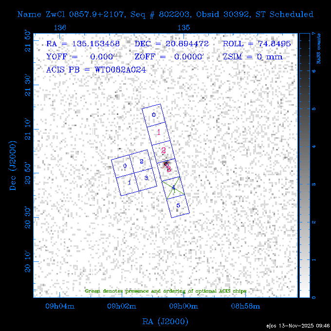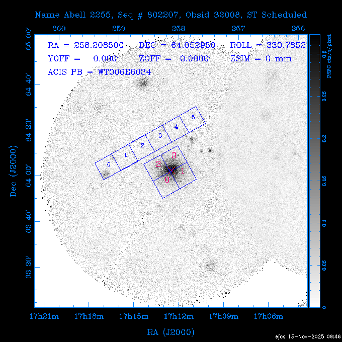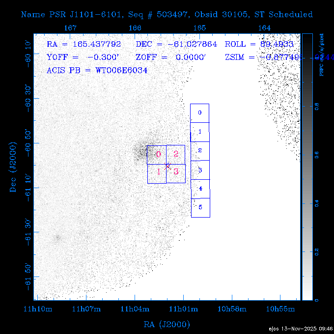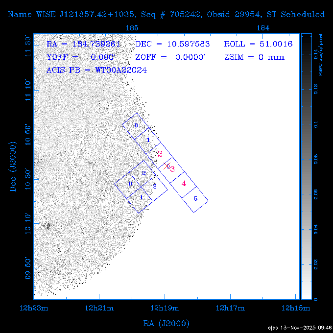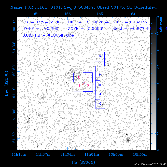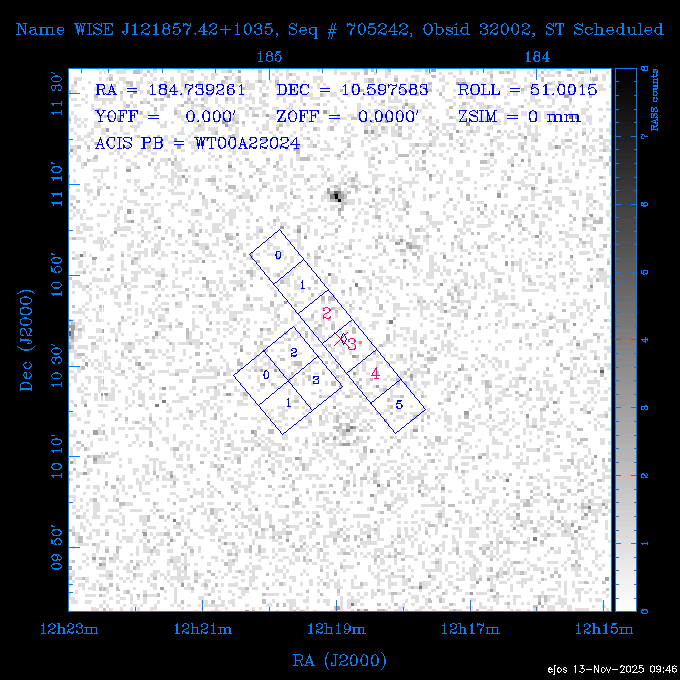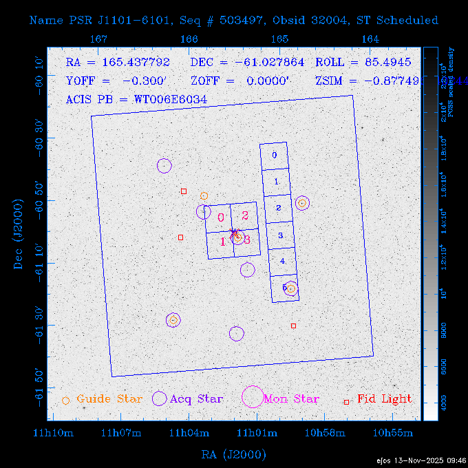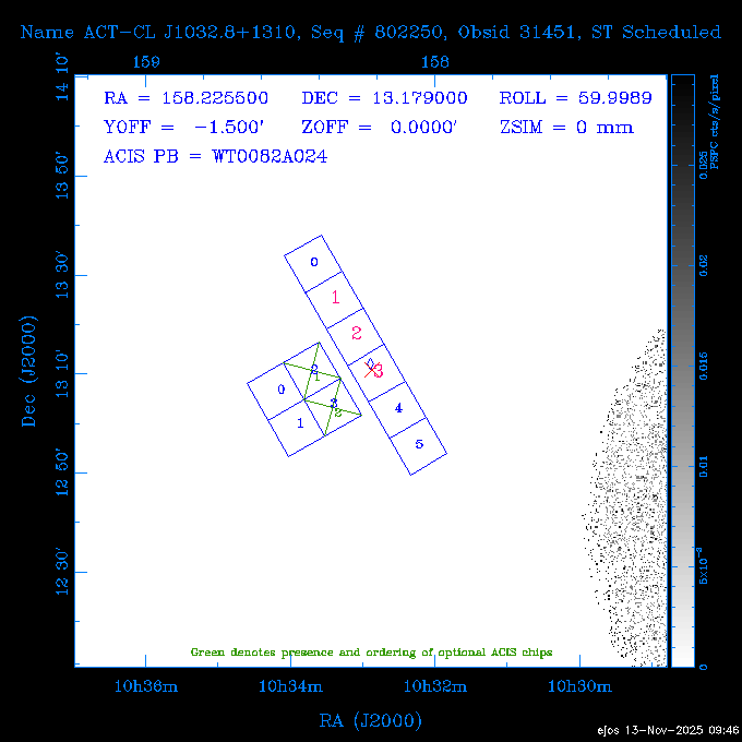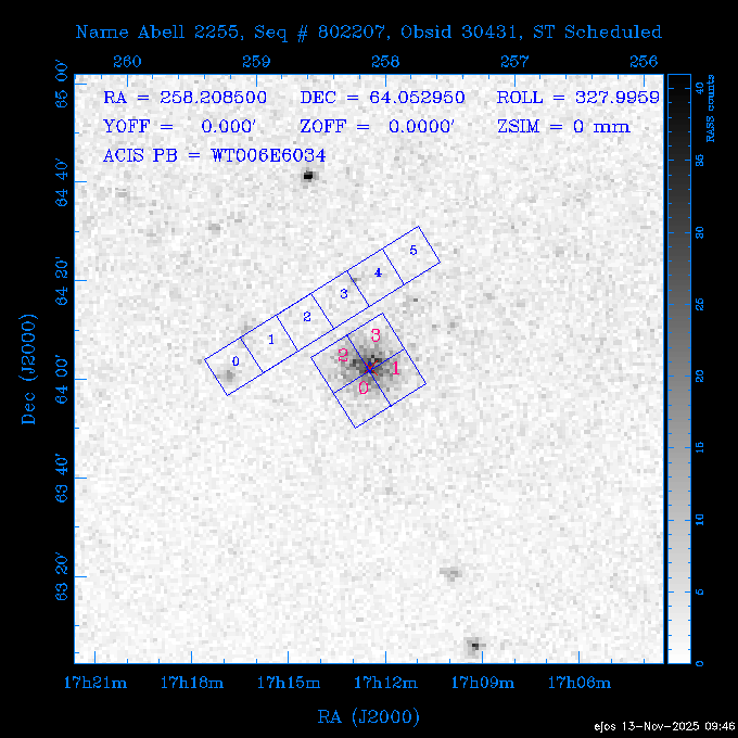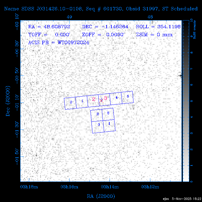 Seq # NB ObsID Constr. Target Start Time SI Grat Active Chips RA Dec Roll Pitch Slew Overlays ------ --- ----- ------- -------------------- --------------------- ----- ------ ---- ----------------- -------- -------- ------ ------ ------ ------------- 601645 31970 0 NGC3511 2025:312:18:37:32.079 16.5 ACIS-S NONE I3,S2,S3,S4 165.8490 -23.0866 85.39 54.49 120.46 dss pspc rass 601706 31980 0 NGC 1140 2025:312:23:53:44.415 10.8 ACIS-S NONE S2,S3 43.6397 -10.0287 10.00 153.15 115.68 dss pspc rass 503702 DDT 31983 0 GRB251013C 2025:313:03:29:41.478 38.7 ACIS-S NONE S2,S3 345.8356 -0.2103 289.69 120.11 92.03 dss pspc rass 705214 29926 0 SDSS J022226.11-0857 2025:313:14:45:26.002 12.6 ACIS-S NONE S2,S3 35.6088 -8.9504 341.02 152.58 67.84 dss pspc rass 705505 CCT 31968 0 2MASS J17422050-5146 2025:313:18:53:36.279 10.0 ACIS-S NONE S2,S3 265.5855 -51.7728 238.25 47.32 105.77 dss pspc rass 705402 31981 0 SDSS J014837.63+0600 2025:313:22:21:08.998 12.0 ACIS-I NONE I0,I1,I2,I3 27.1568 6.0056 303.95 159.41 114.20 dss pspc rass ---- 41970 CAL-ER (IAT02) 2025:314:02:26:12.066 0.9 -- -- 48.9007 31.7372 165.79 164.96 132.98 705450 P1 31303 0 SDSS J103149.70+2325 2025:314:03:19:04.424 10.0 ACIS-S NONE S2,S3 157.9571 23.4174 64.65 77.08 97.60 dss pspc rass 601634 29639 0 IC1954 2025:314:06:47:24.980 20.6 ACIS-S NONE I3,S2,S3,S4 52.8808 -51.9049 7.78 110.62 117.79 dss pspc rass ---- 41969 CAL-ER (PER01) 2025:314:13:04:43.364 3.0 -- -- 47.8372 15.4226 50.72 177.16 79.52 ---- 41968 CAL-ER (CAL01) 2025:314:14:38:59.218 5.0 -- -- 184.7978 -54.5910 123.79 48.68 129.44 ---- 41967 CAL-ER (CAL01) 2025:314:16:46:32.507 3.0 -- -- 47.8372 15.4226 48.12 177.26 129.25 ---- 41966 CAL-ER (CAL01) 2025:314:18:14:34.173 0.9 -- -- 48.2533 21.2685 149.24 175.35 101.38 ---- 41965 CAL-ER (PER05) 2025:314:18:55:17.209 0.9 -- -- 41.4384 43.4796 189.37 153.52 42.81 ---- 41964 CAL-ER (PER02) 2025:314:21:30:00.000 3.0 -- -- 238.4000 29.2000 343.89 48.03 105.70 ---- 41963 CAL-ER (PER03) 2025:314:22:48:12.717 3.0 -- -- 193.7100 19.0924 43.07 48.29 57.20 ---- 41962 CAL-ER (PER04) 2025:315:00:24:00.000 0.9 -- -- 48.2533 21.2685 151.71 175.56 127.70 601647 30161 0 NGC3626 2025:315:02:04:48.850 15.0 ACIS-S NONE I3,S2,S3,S4 170.0158 18.3568 59.00 65.71 113.27 dss pspc rass 802196 29631 0 Perseus cluster 2025:315:06:52:54.787 12.0 ACIS-I NONE I0,I1,I2,I3,S2 49.9508 41.5117 171.48 155.71 101.70 dss pspc rass 601647 30162 0 NGC3626 2025:315:10:51:30.113 14.0 ACIS-S NONE I3,S2,S3,S4 170.0158 18.3568 50.00 66.07 103.90 dss pspc rass 802196 31987 0 Perseus cluster 2025:315:15:23:09.889 10.0 ACIS-I NONE I0,I1,I2,I3,S2 49.9508 41.5117 166.98 155.86 102.73 dss pspc rass 601647 31994 0 NGC3626 2025:315:18:48:06.438 14.0 ACIS-S NONE I3,S2,S3,S4 170.0158 18.3568 51.00 66.38 102.49 dss pspc rass 802196 31988 0 Perseus cluster 2025:315:23:19:42.990 10.0 ACIS-I NONE I0,I1,I2,I3,S2 49.9508 41.5117 166.98 155.98 102.49 dss pspc rass 601647 31995 0 NGC3626 2025:316:02:44:39.539 14.0 ACIS-S NONE I3,S2,S3,S4 170.0158 18.3568 51.00 66.70 102.49 dss pspc rass ---- 41961 CAL-ER (IAT04) 2025:316:07:04:20.188 0.0 -- -- 109.0000 -14.1000 64.21 111.34 69.05 601730 31231 0 SDSS J031426.10-0108 2025:316:07:37:35.527 12.6 ACIS-S NONE S2,S3 48.6088 -1.1463 3.69 161.07 78.33 dss pspc rass ---- 41960 CAL-ER (CAL01) 2025:316:11:35:58.883 0.0 -- -- 109.0000 -14.1000 64.08 111.49 78.25 705017 31488 0 NGC 4579 2025:316:12:10:41.743 14.0 ACIS-S HETG S0,S1,S2,S3,S4,S5 189.4317 11.8181 51.00 47.84 84.89 dss pspc rass 802196 31989 0 Perseus cluster 2025:316:16:45:10.325 10.0 ACIS-I NONE I0,I1,I2,I3,S2 49.9508 41.5117 166.98 156.22 115.39 dss pspc rass 802201 30377 0 Abell 795 2025:316:20:07:23.852 28.9 ACIS-S NONE I3,S1,S2,S3 141.0221 14.1726 71.92 91.37 90.26 dss pspc rass ---- 41959 CAL-ER (PER06) 2025:317:04:43:33.093 3.0 -- -- 50.4662 19.2637 121.72 177.50 87.29 ---- 41958 CAL-ER (CAL01) 2025:317:06:01:57.825 0.9 -- -- 48.2533 21.2685 180.52 176.68 58.10 ---- 41957 CAL-ER (CAL01) 2025:317:07:01:46.214 3.0 -- -- 238.4000 29.2000 347.10 48.15 128.80 ---- 41956 CAL-ER (CAL01) 2025:317:08:35:52.633 0.9 -- -- 48.2533 21.2685 182.43 176.70 128.73 ---- 41955 CAL-ER (CAL01) 2025:317:11:00:00.000 0.9 -- -- 41.4384 43.4796 195.40 153.82 24.69 ---- 41954 CAL-ER (CAL01) 2025:317:13:40:00.000 0.9 -- -- 238.4000 29.2000 347.51 48.15 105.67 ---- 41953 CAL-ER (CAL01) 2025:317:15:36:00.000 0.9 -- -- 48.2533 21.2685 188.02 176.76 128.61 705279 30224 0 NGC 4051 2025:317:17:11:09.043 20.0 ACIS-S HETG S2,S3 180.7900 44.5313 46.01 76.35 106.50 dss pspc rass 802196 31990 0 Perseus cluster 2025:317:23:18:35.332 10.0 ACIS-I NONE I0,I1,I2,I3,S2 49.9508 41.5117 166.98 156.63 83.72 dss pspc rass ---- 41952 CAL-ER (IAT03) 2025:318:02:27:30.362 0.0 -- -- 97.4548 36.8560 100.33 133.88 50.63 705273 29985 0 MCG-5-23-16 2025:318:03:02:24.106 16.0 ACIS-S HETG S3 146.9172 -30.9489 70.00 74.32 85.71 dss pspc rass 705224 29936 3 NGC 1358 2025:318:08:04:48.414 15.0 ACIS-S NONE I2,I3,S2,S3,S4 53.4153 -5.0895 20.00 156.30 91.07 dss pspc rass 705273 31993 0 MCG-5-23-16 2025:318:12:50:32.723 16.0 ACIS-S HETG S3 146.9172 -30.9489 70.00 74.61 91.07 dss pspc rass 705224 31992 3 NGC 1358 2025:318:17:52:57.032 15.0 ACIS-S NONE I2,I3,S2,S3,S4 53.4153 -5.0895 20.00 156.25 91.07 dss pspc rass 601736 CCT 31986 0 ESO 320- G 014 2025:318:22:42:55.783 10.0 ACIS-I NONE I0,I1,I2,I3 174.4718 -39.2203 96.92 51.99 110.16 dss pspc rass 601634 31991 0 IC1954 2025:319:02:02:02.360 30.0 ACIS-S NONE I3,S2,S3,S4 52.8808 -51.9049 2.75 109.59 76.24 dss pspc rass 705507 CCT 31985 0 NGC7172_s1 2025:319:10:51:17.109 11.0 ACIS-S NONE S2,S3 330.3965 -31.8897 290.84 88.27 61.86 dss pspc rass 601730 31997 0 SDSS J031426.10-0108 2025:319:14:29:14.336 19.1 ACIS-S NONE S2,S3 48.6088 -1.1463 354.12 160.17 86.04 dss pspc rass ---- 41951 CAL-ER (CAL01) 2025:319:20:12:25.152 3.0 -- -- 47.8372 15.4226 317.61 175.64 40.07 ---- 41950 CAL-ER (PER07) 2025:319:21:46:23.542 3.0 -- -- 277.5648 -47.4307 249.03 47.46 128.13 ---- 41949 CAL-ER (PER09) 2025:319:23:21:38.78