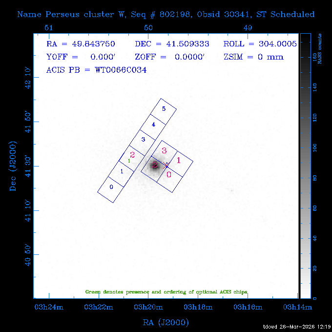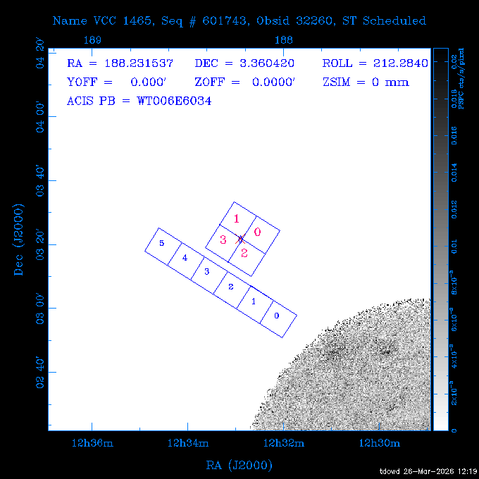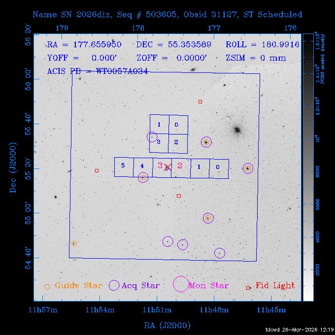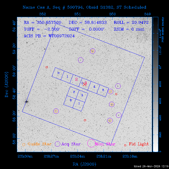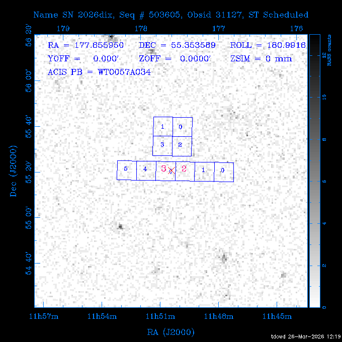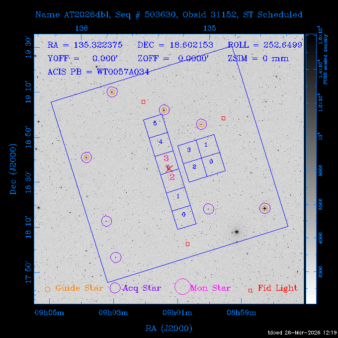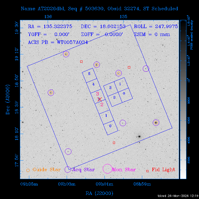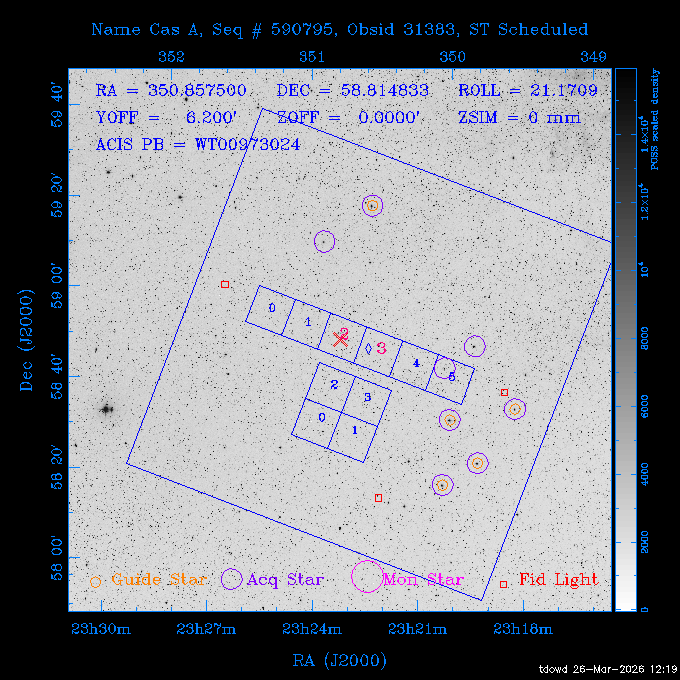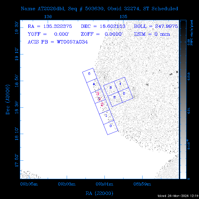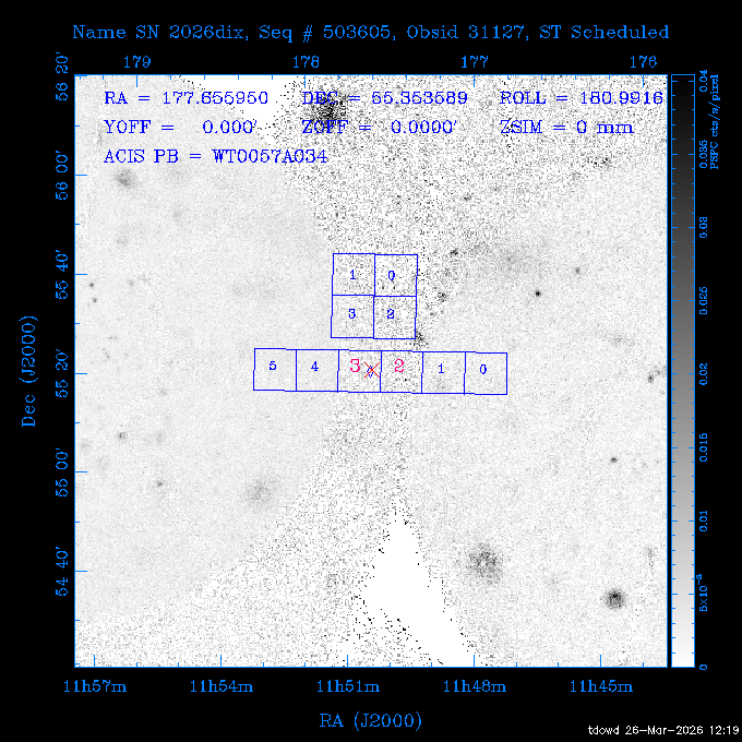 Seq # NB ObsID Constr. Target Start Time SI Grat Active Chips RA Dec Roll Pitch Slew Overlays ------ --- ----- ------- -------------------- --------------------- ----- ------ ---- ----------------- -------- -------- ------ ------ ------ ------------- 201914 CCT 32261 0 CD-31 16041 2026:088:22:15:39.237 5.0 ACIS-S NONE S2,S3 282.6854 -31.7968 95.34 88.01 90.34 dss pspc rass 503605 TOO 31127 0 SN 2026dix 2026:089:00:23:04.279 10.0 ACIS-S NONE S2,S3 177.6560 55.3536 180.96 120.48 128.63 dss pspc rass 705221 29933 0 SDSS J134234.31+1913 2026:089:03:35:39.594 6.0 ACIS-S NONE S2,S3 205.6430 19.2275 141.49 151.57 46.81 dss pspc rass 705201 29913 0 SDSS J164818.07+4155 2026:089:05:41:25.415 44.4 ACIS-S NONE S2,S3 252.0753 41.9306 110.98 106.73 45.54 dss pspc rass ---- 41588 CAL-ER (PER01) 2026:089:18:31:34.738 2.0 -- -- 191.5000 -1.4000 133.64 176.46 69.60 ---- 41587 CAL-ER (PER03) 2026:089:20:15:00.000 1.0 -- -- 324.0000 26.0000 70.58 48.42 128.37 ---- 41586 CAL-ER (PER04) 2026:089:21:30:00.000 1.0 -- -- 349.5000 -41.3000 153.58 48.58 102.26 ---- 41585 CAL-ER (PER05) 2026:089:23:00:00.000 2.0 -- -- 190.5000 -6.2000 31.73 177.32 129.00 ---- 41584 CAL-ER (PER02) 2026:090:00:10:00.000 2.0 -- -- 230.0000 -0.9000 94.97 139.05 71.51 ---- 41583 CAL-ER (PER06) 2026:090:01:30:00.000 1.0 -- -- 323.0000 23.0000 73.99 48.48 93.14 ---- 41582 CAL-ER (PER07) 2026:090:02:40:00.000 1.0 -- -- 55.2000 22.5000 285.68 48.18 125.57 ---- 41581 CAL-ER (CAL01) 2026:090:03:45:00.000 1.0 -- -- 185.2000 -3.7000 259.00 175.95 128.47 802198 30335 0 Perseus cluster W 2026:090:04:50:31.111 12.5 ACIS-I NONE I0,I1,I2,I3 49.8438 41.5093 300.02 52.13 128.65 dss pspc rass 601651 29656 0 NGC4496A 2026:090:09:01:17.973 10.0 ACIS-S NONE I3,S2,S3,S4 187.9135 3.9396 191.02 171.85 121.26 dss pspc rass 802198 32268 0 Perseus cluster W 2026:090:12:30:24.840 17.5 ACIS-I NONE I0,I1,I2,I3,S2 49.8438 41.5093 300.02 51.85 121.27 dss pspc rass 601651 32262 0 NGC4496A 2026:090:18:04:29.599 10.0 ACIS-S NONE I3,S2,S3,S4 187.9135 3.9396 193.26 171.64 121.11 dss pspc rass 802198 32269 0 Perseus cluster W 2026:090:21:33:34.362 17.8 ACIS-I NONE I0,I1,I2,I3,S2 49.8438 41.5093 300.02 51.52 121.11 dss pspc rass 601651 32263 0 NGC4496A 2026:091:03:12:37.447 10.0 ACIS-S NONE I3,S2,S3,S4 187.9135 3.9396 195.36 171.41 120.98 dss pspc rass 802198 32270 0 Perseus cluster W 2026:091:06:41:41.300 17.5 ACIS-I NONE I0,I1,I2,I3,S2 49.8438 41.5093 301.02 51.18 121.04 dss pspc rass 601651 32264 0 NGC4496A 2026:091:12:15:43.745 10.0 ACIS-S NONE I3,S2,S3,S4 187.9135 3.9396 197.28 171.17 120.93 dss pspc rass 802198 32271 0 Perseus cluster W 2026:091:15:44:46.194 17.5 ACIS-I NONE I0,I1,I2,I3,S2 49.8438 41.5093 301.02 50.85 120.93 dss pspc rass 601651 32265 0 NGC4496A 2026:091:21:18:47.560 10.0 ACIS-S NONE I3,S2,S3,S4 187.9135 3.9396 199.06 170.92 120.85 dss pspc rass 802198 32272 0 Perseus cluster W 2026:092:00:47:49.515 17.0 ACIS-I NONE I0,I1,I2,I3 49.8438 41.5093 302.02 50.52 120.90 dss pspc rass 503630 TOO 31152 3 AT2026dbl 2026:092:06:03:12.854 12.6 ACIS-S NONE S2,S3 135.3224 18.6022 252.65 120.19 74.50 dss pspc rass ---- 41580 CAL-ER (PER08) 2026:092:10:03:31.607 3.0 -- -- 189.5000 -0.4000 202.43 175.17 68.69 ---- 41579 CAL-ER (PER09) 2026:092:12:00:00.000 3.0 -- -- 49.0000 41.0000 306.74 49.32 126.28 ---- 41578 CAL-ER (PER10) 2026:092:14:00:00.000 3.0 -- -- 343.0000 -35.0000 140.32 48.08 174.28 ---- 41577 CAL-ER (CAL01) 2026:092:16:00:00.000 1.0 -- -- 212.0000 -37.0000 35.25 142.90 94.82 ---- 41576 CAL-ER (PER11) 2026:092:17:00:00.000 1.0 -- -- 25.0000 -71.0000 193.76 76.50 72.93 ---- 41575 CAL-ER (PER12) 2026:092:18:09:00.000 1.0 -- -- 107.0000 52.0000 262.70 89.37 138.02 ---- 41574 CAL-ER (CAL01) 2026:092:19:07:00.000 1.0 -- -- 191.0000 -0.8500 188.99 175.80 90.22 802198 32273 0 Perseus cluster W 2026:092:20:10:40.156 10.0 ACIS-I NONE I0,I1,I2,I3 49.8438 41.5093 303.02 49.85 127.33 dss pspc rass 601658 30177 0 NGC4694 2026:092:23:38:58.199 10.0 ACIS-S NONE I3,S2,S3,S4 192.0629 10.9835 182.00 163.95 117.60 dss pspc rass 802198 30337 0 Perseus cluster W 2026:093:03:07:16.242 15.7 ACIS-I NONE I0,I1,I2,I3,S2 49.8438 41.5093 303.02 49.61 117.60 dss pspc rass 601658 32266 0 NGC4694 2026:093:08:10:34.285 9.0 ACIS-S NONE I3,S2,S3,S4 192.0629 10.9835 182.00 163.82 117.60 dss pspc rass 802198 30340 0 Perseus cluster W 2026:093:11:22:13.391 15.0 ACIS-I NONE I0,I1,I2,I3,S2 49.8438 41.5093 304.02 49.31 117.68 dss pspc rass 601658 32267 0 NGC4694 2026:093:16:13:52.496 9.0 ACIS-S NONE I3,S2,S3,S4 192.0629 10.9835 182.00 163.69 117.68 dss pspc rass 802198 30341 0 Perseus cluster W 2026:093:19:25:31.602 10.0 ACIS-I NONE I0,I1,I2,I3,S2 49.8438 41.5093 304.02 49.02 117.68 dss pspc rass 705481 P1 31446 0 PGC016986 2026:093:22:47:38.938 7.0 ACIS-S NONE S2,S3 78.8375 -26.4678 243.00 71.37 89.80 dss pspc rass 402612 TOO 31082 3 GS 1354-64 2026:094:01:18:14.312 28.4 ACIS-S HETG S0,S1,S2,S3,S4,S5 209.5405 -64.7348 19.11 119.52 82.90 dss pspc rass 503630 TOO 32274 3 AT2026dbl 2026:094:09:54:51.352 36.5 ACIS-S NONE S2,S3 135.3224 18.6022 248.00 118.07 125.03 dss pspc rass 705472 P1 31437 0 IRAS 07598+6508 2026:094:20:29:39.485 10.0 ACIS-S NONE S2,S3 121.1271 64.9979 251.66 92.02 47.79 dss pspc rass 705407 31260 2 M 87 2026:094:23:47:10.749 5.0 ACIS-S NONE S2,S3 187.7059 12.3911 198.35 160.81 69.09 dss pspc rass ---- 41573 CAL-ER (PER13) 2026:095:01:51:33.037 3.0 -- -- 14.4000 53.7500 359.15 47.87 113.77 ---- 41572 CAL-ER (PER14) 2026:095:05:15:00.000 3.0 -- -- 194.5000 -1.4000 172.33 175.42 127.74 ---- 41571 CAL-ER (CAL01) 2026:095:08:00:00.000 3.0 -- -- 45.0000 49.0000 318.27 50.37 127.54 590794 31382 1 Cas A 2026:095:11:50:14.487 2.0 ACIS-S NONE S2,S3 350.8575 58.8148 20.97 55.74 36.76 dss pspc rass 590795 31383 1 Cas A 2026:095:12:32:04.487 2.0 ACIS-S NONE S2,S3 350.8575 58.8148 21.19 55.75 0.15 dss pspc rass 601743 CCT 32260 0 VCC 1465 2026:095:13:47:44.138 10.0 ACIS-I NONE I0,I1,I2,I3 188.2315 3.3604 212.28 168.85 120.72 dss pspc rass 802198 30343 0 Perseus cluster W 2026:095:17:16:52