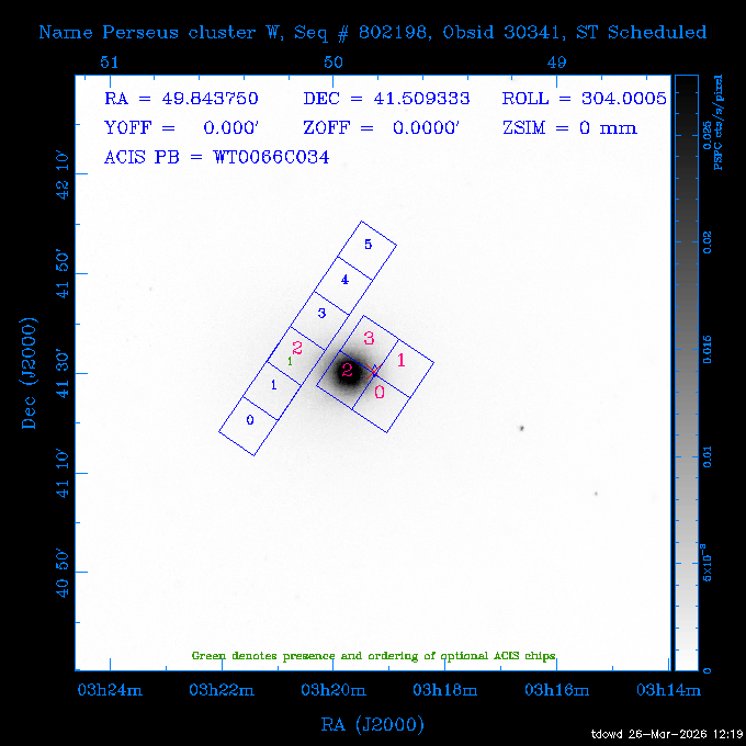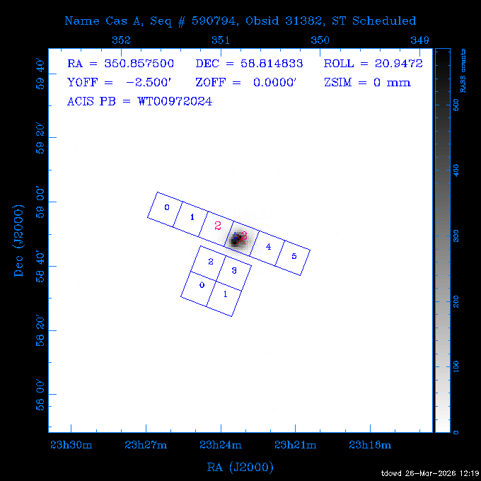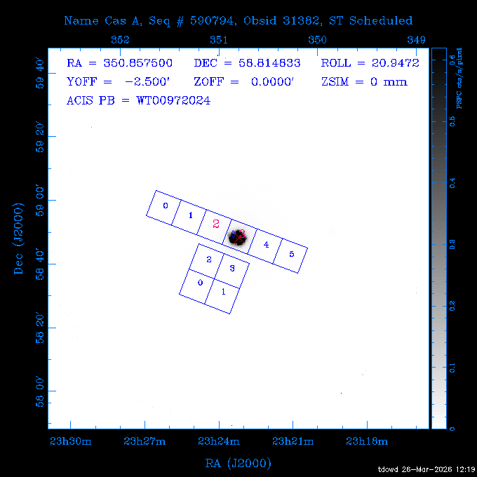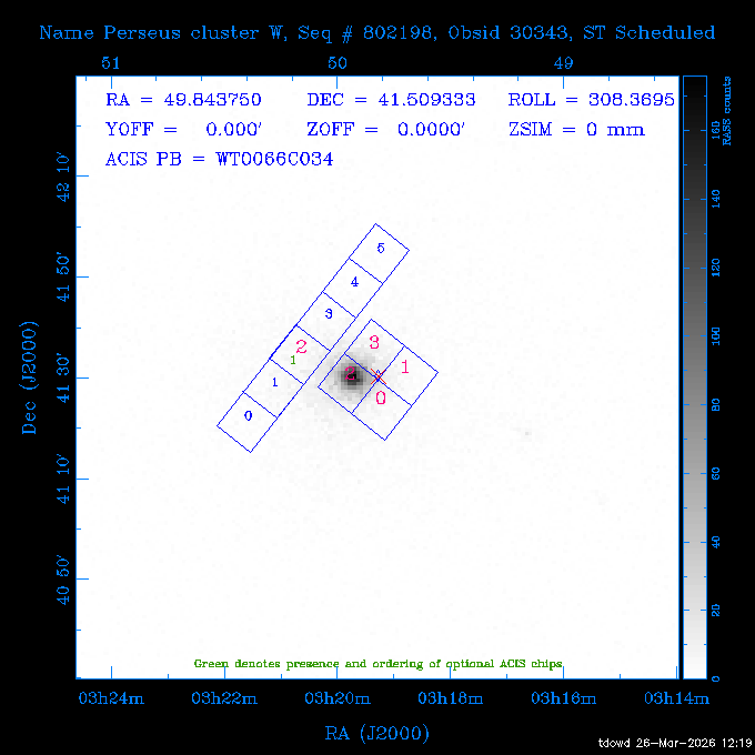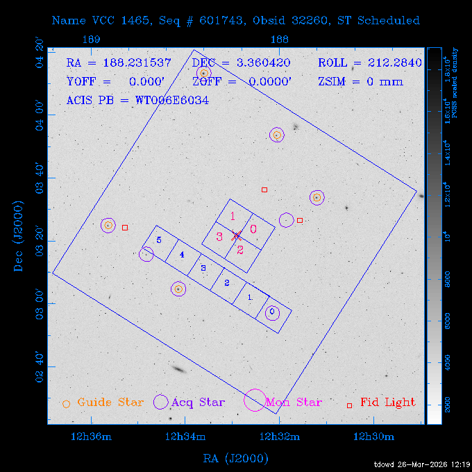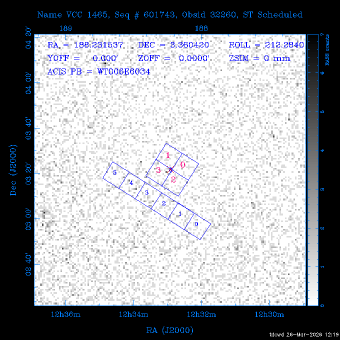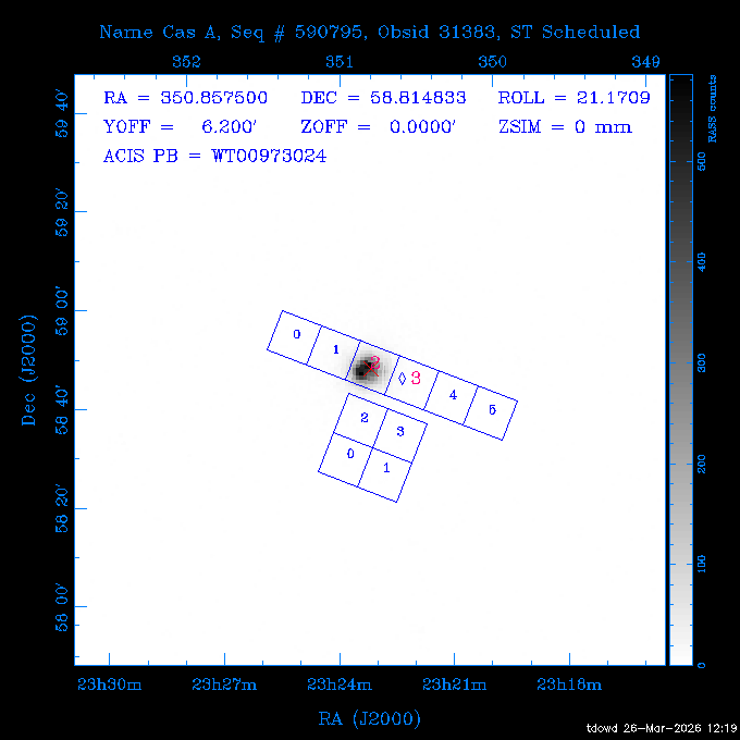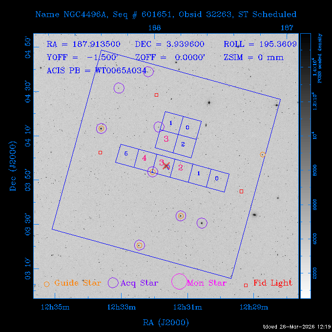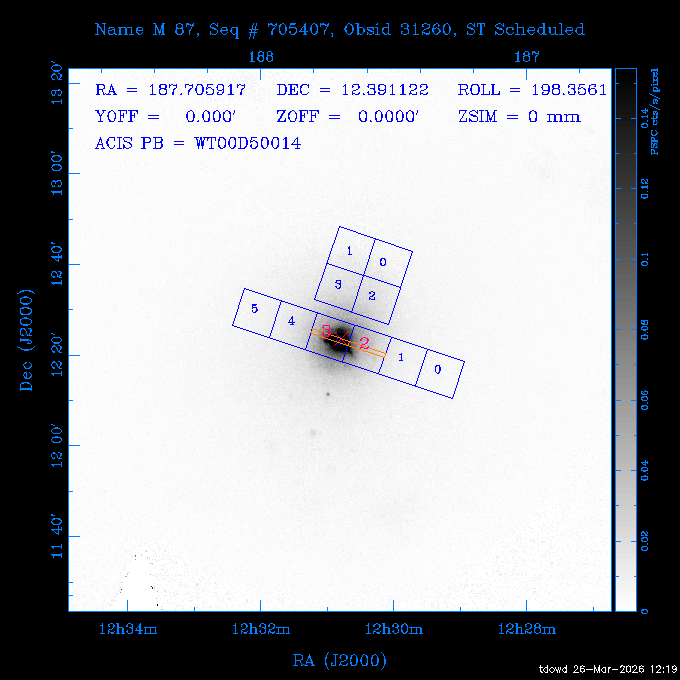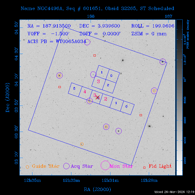 Seq # NB ObsID Constr. Target Start Time SI Grat Active Chips RA Dec Roll Pitch Slew Overlays ------ --- ----- ------- -------------------- --------------------- ----- ------ ---- ----------------- -------- -------- ------ ------ ------ ------------- 201914 CCT 32261 0 CD-31 16041 2026:088:22:15:39.237 5.0 ACIS-S NONE S2,S3 282.6854 -31.7968 95.34 88.01 90.34 dss pspc rass 503605 TOO 31127 0 SN 2026dix 2026:089:00:23:04.279 10.0 ACIS-S NONE S2,S3 177.6560 55.3536 180.96 120.48 128.63 dss pspc rass 705221 29933 0 SDSS J134234.31+1913 2026:089:03:35:39.594 6.0 ACIS-S NONE S2,S3 205.6430 19.2275 141.49 151.57 46.81 dss pspc rass 705201 29913 0 SDSS J164818.07+4155 2026:089:05:41:25.415 44.4 ACIS-S NONE S2,S3 252.0753 41.9306 110.98 106.73 45.54 dss pspc rass ---- 41588 CAL-ER (PER01) 2026:089:18:31:34.738 2.0 -- -- 191.5000 -1.4000 133.64 176.46 69.60 ---- 41587 CAL-ER (PER03) 2026:089:20:15:00.000 1.0 -- -- 324.0000 26.0000 70.58 48.42 128.37 ---- 41586 CAL-ER (PER04) 2026:089:21:30:00.000 1.0 -- -- 349.5000 -41.3000 153.58 48.58 102.26 ---- 41585 CAL-ER (PER05) 2026:089:23:00:00.000 2.0 -- -- 190.5000 -6.2000 31.73 177.32 129.00 ---- 41584 CAL-ER (PER02) 2026:090:00:10:00.000 2.0 -- -- 230.0000 -0.9000 94.97 139.05 71.51 ---- 41583 CAL-ER (PER06) 2026:090:01:30:00.000 1.0 -- -- 323.0000 23.0000 73.99 48.48 93.14 ---- 41582 CAL-ER (PER07) 2026:090:02:40:00.000 1.0 -- -- 55.2000 22.5000 285.68 48.18 125.57 ---- 41581 CAL-ER (CAL01) 2026:090:03:45:00.000 1.0 -- -- 185.2000 -3.7000 259.00 175.95 128.47 802198 30335 0 Perseus cluster W 2026:090:04:50:31.111 12.5 ACIS-I NONE I0,I1,I2,I3 49.8438 41.5093 300.02 52.13 128.65 dss pspc rass 601651 29656 0 NGC4496A 2026:090:09:01:17.973 10.0 ACIS-S NONE I3,S2,S3,S4 187.9135 3.9396 191.02 171.85 121.26 dss pspc rass 802198 32268 0 Perseus cluster W 2026:090:12:30:24.840 17.5 ACIS-I NONE I0,I1,I2,I3,S2 49.8438 41.5093 300.02 51.85 121.27 dss pspc rass 601651 32262 0 NGC4496A 2026:090:18:04:29.599 10.0 ACIS-S NONE I3,S2,S3,S4 187.9135 3.9396 193.26 171.64 121.11 dss pspc rass 802198 32269 0 Perseus cluster W 2026:090:21:33:34.362 17.8 ACIS-I NONE I0,I1,I2,I3,S2 49.8438 41.5093 300.02 51.52 121.11 dss pspc rass 601651 32263 0 NGC4496A 2026:091:03:12:37.447 10.0 ACIS-S NONE I3,S2,S3,S4 187.9135 3.9396 195.36 171.41 120.98 dss pspc rass 802198 32270 0 Perseus cluster W 2026:091:06:41:41.300 17.5 ACIS-I NONE I0,I1,I2,I3,S2 49.8438 41.5093 301.02 51.18 121.04 dss pspc rass 601651 32264 0 NGC4496A 2026:091:12:15:43.745 10.0 ACIS-S NONE I3,S2,S3,S4 187.9135 3.9396 197.28 171.17 120.93 dss pspc rass 802198 32271 0 Perseus cluster W 2026:091:15:44:46.194 17.5 ACIS-I NONE I0,I1,I2,I3,S2 49.8438 41.5093 301.02 50.85 120.93 dss pspc rass 601651 32265 0 NGC4496A 2026:091:21:18:47.560 10.0 ACIS-S NONE I3,S2,S3,S4 187.9135 3.9396 199.06 170.92 120.85 dss pspc rass 802198 32272 0 Perseus cluster W 2026:092:00:47:49.515 17.0 ACIS-I NONE I0,I1,I2,I3 49.8438 41.5093 302.02 50.52 120.90 dss pspc rass 503630 TOO 31152 3 AT2026dbl 2026:092:06:03:12.854 12.6 ACIS-S NONE S2,S3 135.3224 18.6022 252.65 120.19 74.50 dss pspc rass ---- 41580 CAL-ER (PER08) 2026:092:10:03:31.607 3.0 -- -- 189.5000 -0.4000 202.43 175.17 68.69 ---- 41579 CAL-ER (PER09) 2026:092:12:00:00.000 3.0 -- -- 49.0000 41.0000 306.74 49.32 126.28 ---- 41578 CAL-ER (PER10) 2026:092:14:00:00.000 3.0 -- -- 343.0000 -35.0000 140.32 48.08 174.28 ---- 41577 CAL-ER (CAL01) 2026:092:16:00:00.000 1.0 -- -- 212.0000 -37.0000 35.25 142.90 94.82 ---- 41576 CAL-ER (PER11) 2026:092:17:00:00.000 1.0 -- -- 25.0000 -71.0000 193.76 76.50 72.93 ---- 41575 CAL-ER (PER12) 2026:092:18:09:00.000 1.0 -- -- 107.0000 52.0000 262.70 89.37 138.02 ---- 41574 CAL-ER (CAL01) 2026:092:19:07:00.000 1.0 -- -- 191.0000 -0.8500 188.99 175.80 90.22 802198 32273 0 Perseus cluster W 2026:092:20:10:40.156 10.0 ACIS-I NONE I0,I1,I2,I3 49.8438 41.5093 303.02 49.85 127.33 dss pspc rass 601658 30177 0 NGC4694 2026:092:23:38:58.199 10.0 ACIS-S NONE I3,S2,S3,S4 192.0629 10.9835 182.00 163.95 117.60 dss pspc rass 802198 30337 0 Perseus cluster W 2026:093:03:07:16.242 15.7 ACIS-I NONE I0,I1,I2,I3,S2 49.8438 41.5093 303.02 49.61 117.60 dss pspc rass 601658 32266 0 NGC4694 2026:093:08:10:34.285 9.0 ACIS-S NONE I3,S2,S3,S4 192.0629 10.9835 182.00 163.82 117.60 dss pspc rass 802198 30340 0 Perseus cluster W 2026:093:11:22:13.391 15.0 ACIS-I NONE I0,I1,I2,I3,S2 49.8438 41.5093 304.02 49.31 117.68 dss pspc rass 601658 32267 0 NGC4694 2026:093:16:13:52.496 9.0 ACIS-S NONE I3,S2,S3,S4 192.0629 10.9835 182.00 163.69 117.68 dss pspc rass 802198 30341 0 Perseus cluster W 2026:093:19:25:31.602 10.0 ACIS-I NONE I0,I1,I2,I3,S2 49.8438 41.5093 304.02 49.02 117.68 dss pspc rass 705481 P1 31446 0 PGC016986 2026:093:22:47:38.938 7.0 ACIS-S NONE S2,S3 78.8375 -26.4678 243.00 71.37 89.80 dss pspc rass 402612 TOO 31082 3 GS 1354-64 2026:094:01:18:14.312 28.4 ACIS-S HETG S0,S1,S2,S3,S4,S5 209.5405 -64.7348 19.11 119.52 82.90 dss pspc rass 503630 TOO 32274 3 AT2026dbl 2026:094:09:54:51.352 36.5 ACIS-S NONE S2,S3 135.3224 18.6022 248.00 118.07 125.03 dss pspc rass 705472 P1 31437 0 IRAS 07598+6508 2026:094:20:29:39.485 10.0 ACIS-S NONE S2,S3 121.1271 64.9979 251.66 92.02 47.79 dss pspc rass 705407 31260 2 M 87 2026:094:23:47:10.749 5.0 ACIS-S NONE S2,S3 187.7059 12.3911 198.35 160.81 69.09 dss pspc rass ---- 41573 CAL-ER (PER13) 2026:095:01:51:33.037 3.0 -- -- 14.4000 53.7500 359.15 47.87 113.77 ---- 41572 CAL-ER (PER14) 2026:095:05:15:00.000 3.0 -- -- 194.5000 -1.4000 172.33 175.42 127.74 ---- 41571 CAL-ER (CAL01) 2026:095:08:00:00.000 3.0 -- -- 45.0000 49.0000 318.27 50.37 127.54 590794 31382 1 Cas A 2026:095:11:50:14.487 2.0 ACIS-S NONE S2,S3 350.8575 58.8148 20.97 55.74 36.76 dss pspc rass 590795 31383 1 Cas A 2026:095:12:32:04.487 2.0 ACIS-S NONE S2,S3 350.8575 58.8148 21.19 55.75 0.15 dss pspc rass 601743 CCT 32260 0 VCC 1465 2026:095:13:47:44.138 10.0 ACIS-I NONE I0,I1,I2,I3 188.2315 3.3604 212.28 168.85 120.72 dss pspc rass 802198 30343 0 Perseus cluster W 2026:095:17:16:52