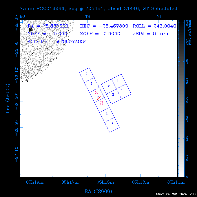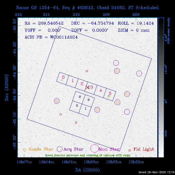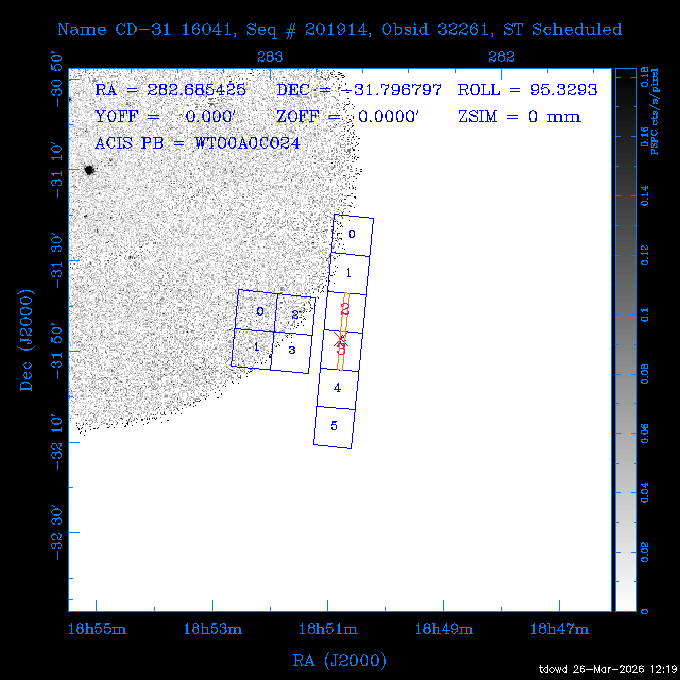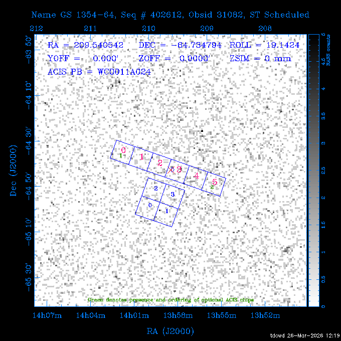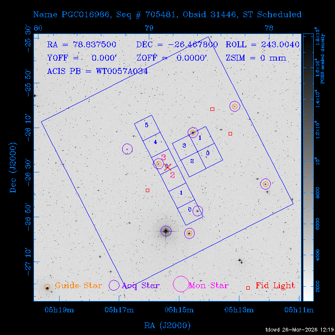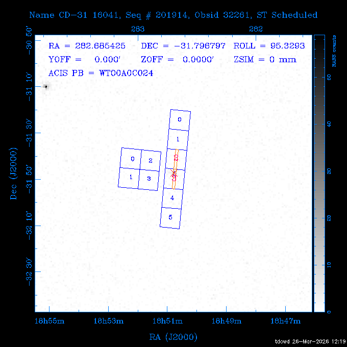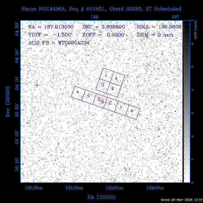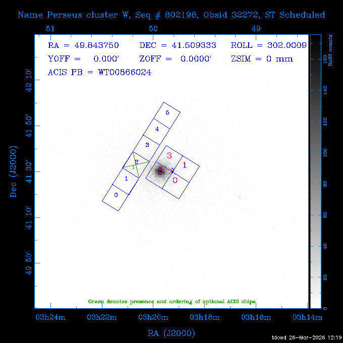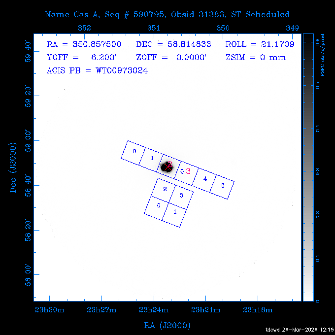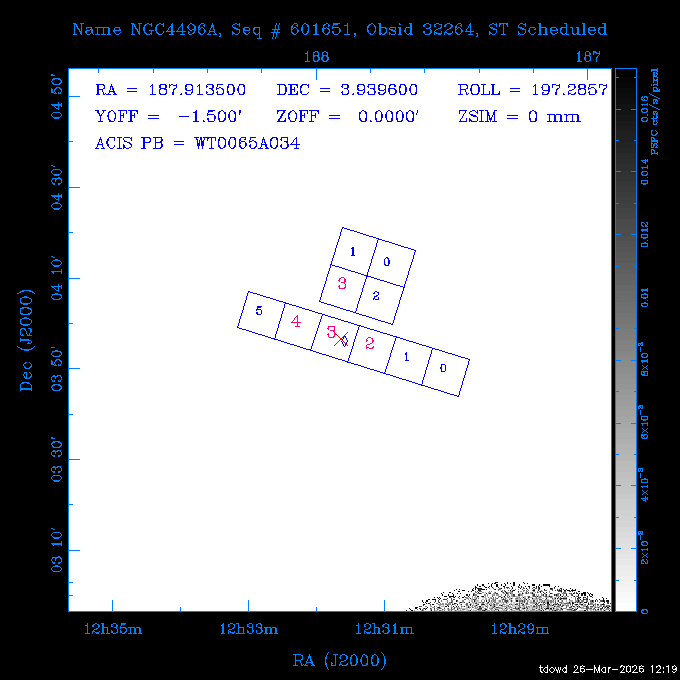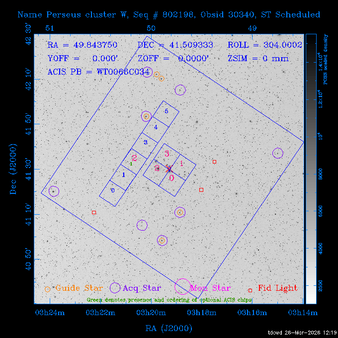 Seq # NB ObsID Constr. Target Start Time SI Grat Active Chips RA Dec Roll Pitch Slew Overlays ------ --- ----- ------- -------------------- --------------------- ----- ------ ---- ----------------- -------- -------- ------ ------ ------ ------------- 201914 CCT 32261 0 CD-31 16041 2026:088:22:15:39.237 5.0 ACIS-S NONE S2,S3 282.6854 -31.7968 95.34 88.01 90.34 dss pspc rass 503605 TOO 31127 0 SN 2026dix 2026:089:00:23:04.279 10.0 ACIS-S NONE S2,S3 177.6560 55.3536 180.96 120.48 128.63 dss pspc rass 705221 29933 0 SDSS J134234.31+1913 2026:089:03:35:39.594 6.0 ACIS-S NONE S2,S3 205.6430 19.2275 141.49 151.57 46.81 dss pspc rass 705201 29913 0 SDSS J164818.07+4155 2026:089:05:41:25.415 44.4 ACIS-S NONE S2,S3 252.0753 41.9306 110.98 106.73 45.54 dss pspc rass ---- 41588 CAL-ER (PER01) 2026:089:18:31:34.738 2.0 -- -- 191.5000 -1.4000 133.64 176.46 69.60 ---- 41587 CAL-ER (PER03) 2026:089:20:15:00.000 1.0 -- -- 324.0000 26.0000 70.58 48.42 128.37 ---- 41586 CAL-ER (PER04) 2026:089:21:30:00.000 1.0 -- -- 349.5000 -41.3000 153.58 48.58 102.26 ---- 41585 CAL-ER (PER05) 2026:089:23:00:00.000 2.0 -- -- 190.5000 -6.2000 31.73 177.32 129.00 ---- 41584 CAL-ER (PER02) 2026:090:00:10:00.000 2.0 -- -- 230.0000 -0.9000 94.97 139.05 71.51 ---- 41583 CAL-ER (PER06) 2026:090:01:30:00.000 1.0 -- -- 323.0000 23.0000 73.99 48.48 93.14 ---- 41582 CAL-ER (PER07) 2026:090:02:40:00.000 1.0 -- -- 55.2000 22.5000 285.68 48.18 125.57 ---- 41581 CAL-ER (CAL01) 2026:090:03:45:00.000 1.0 -- -- 185.2000 -3.7000 259.00 175.95 128.47 802198 30335 0 Perseus cluster W 2026:090:04:50:31.111 12.5 ACIS-I NONE I0,I1,I2,I3 49.8438 41.5093 300.02 52.13 128.65 dss pspc rass 601651 29656 0 NGC4496A 2026:090:09:01:17.973 10.0 ACIS-S NONE I3,S2,S3,S4 187.9135 3.9396 191.02 171.85 121.26 dss pspc rass 802198 32268 0 Perseus cluster W 2026:090:12:30:24.840 17.5 ACIS-I NONE I0,I1,I2,I3,S2 49.8438 41.5093 300.02 51.85 121.27 dss pspc rass 601651 32262 0 NGC4496A 2026:090:18:04:29.599 10.0 ACIS-S NONE I3,S2,S3,S4 187.9135 3.9396 193.26 171.64 121.11 dss pspc rass 802198 32269 0 Perseus cluster W 2026:090:21:33:34.362 17.8 ACIS-I NONE I0,I1,I2,I3,S2 49.8438 41.5093 300.02 51.52 121.11 dss pspc rass 601651 32263 0 NGC4496A 2026:091:03:12:37.447 10.0 ACIS-S NONE I3,S2,S3,S4 187.9135 3.9396 195.36 171.41 120.98 dss pspc rass 802198 32270 0 Perseus cluster W 2026:091:06:41:41.300 17.5 ACIS-I NONE I0,I1,I2,I3,S2 49.8438 41.5093 301.02 51.18 121.04 dss pspc rass 601651 32264 0 NGC4496A 2026:091:12:15:43.745 10.0 ACIS-S NONE I3,S2,S3,S4 187.9135 3.9396 197.28 171.17 120.93 dss pspc rass 802198 32271 0 Perseus cluster W 2026:091:15:44:46.194 17.5 ACIS-I NONE I0,I1,I2,I3,S2 49.8438 41.5093 301.02 50.85 120.93 dss pspc rass 601651 32265 0 NGC4496A 2026:091:21:18:47.560 10.0 ACIS-S NONE I3,S2,S3,S4 187.9135 3.9396 199.06 170.92 120.85 dss pspc rass 802198 32272 0 Perseus cluster W 2026:092:00:47:49.515 17.0 ACIS-I NONE I0,I1,I2,I3 49.8438 41.5093 302.02 50.52 120.90 dss pspc rass 503630 TOO 31152 3 AT2026dbl 2026:092:06:03:12.854 12.6 ACIS-S NONE S2,S3 135.3224 18.6022 252.65 120.19 74.50 dss pspc rass ---- 41580 CAL-ER (PER08) 2026:092:10:03:31.607 3.0 -- -- 189.5000 -0.4000 202.43 175.17 68.69 ---- 41579 CAL-ER (PER09) 2026:092:12:00:00.000 3.0 -- -- 49.0000 41.0000 306.74 49.32 126.28 ---- 41578 CAL-ER (PER10) 2026:092:14:00:00.000 3.0 -- -- 343.0000 -35.0000 140.32 48.08 174.28 ---- 41577 CAL-ER (CAL01) 2026:092:16:00:00.000 1.0 -- -- 212.0000 -37.0000 35.25 142.90 94.82 ---- 41576 CAL-ER (PER11) 2026:092:17:00:00.000 1.0 -- -- 25.0000 -71.0000 193.76 76.50 72.93 ---- 41575 CAL-ER (PER12) 2026:092:18:09:00.000 1.0 -- -- 107.0000 52.0000 262.70 89.37 138.02 ---- 41574 CAL-ER (CAL01) 2026:092:19:07:00.000 1.0 -- -- 191.0000 -0.8500 188.99 175.80 90.22 802198 32273 0 Perseus cluster W 2026:092:20:10:40.156 10.0 ACIS-I NONE I0,I1,I2,I3 49.8438 41.5093 303.02 49.85 127.33 dss pspc rass 601658 30177 0 NGC4694 2026:092:23:38:58.199 10.0 ACIS-S NONE I3,S2,S3,S4 192.0629 10.9835 182.00 163.95 117.60 dss pspc rass 802198 30337 0 Perseus cluster W 2026:093:03:07:16.242 15.7 ACIS-I NONE I0,I1,I2,I3,S2 49.8438 41.5093 303.02 49.61 117.60 dss pspc rass 601658 32266 0 NGC4694 2026:093:08:10:34.285 9.0 ACIS-S NONE I3,S2,S3,S4 192.0629 10.9835 182.00 163.82 117.60 dss pspc rass 802198 30340 0 Perseus cluster W 2026:093:11:22:13.391 15.0 ACIS-I NONE I0,I1,I2,I3,S2 49.8438 41.5093 304.02 49.31 117.68 dss pspc rass 601658 32267 0 NGC4694 2026:093:16:13:52.496 9.0 ACIS-S NONE I3,S2,S3,S4 192.0629 10.9835 182.00 163.69 117.68 dss pspc rass 802198 30341 0 Perseus cluster W 2026:093:19:25:31.602 10.0 ACIS-I NONE I0,I1,I2,I3,S2 49.8438 41.5093 304.02 49.02 117.68 dss pspc rass 705481 P1 31446 0 PGC016986 2026:093:22:47:38.938 7.0 ACIS-S NONE S2,S3 78.8375 -26.4678 243.00 71.37 89.80 dss pspc rass 402612 TOO 31082 3 GS 1354-64 2026:094:01:18:14.312 28.4 ACIS-S HETG S0,S1,S2,S3,S4,S5 209.5405 -64.7348 19.11 119.52 82.90 dss pspc rass 503630 TOO 32274 3 AT2026dbl 2026:094:09:54:51.352 36.5 ACIS-S NONE S2,S3 135.3224 18.6022 248.00 118.07 125.03 dss pspc rass 705472 P1 31437 0 IRAS 07598+6508 2026:094:20:29:39.485 10.0 ACIS-S NONE S2,S3 121.1271 64.9979 251.66 92.02 47.79 dss pspc rass 705407 31260 2 M 87 2026:094:23:47:10.749 5.0 ACIS-S NONE S2,S3 187.7059 12.3911 198.35 160.81 69.09 dss pspc rass ---- 41573 CAL-ER (PER13) 2026:095:01:51:33.037 3.0 -- -- 14.4000 53.7500 359.15 47.87 113.77 ---- 41572 CAL-ER (PER14) 2026:095:05:15:00.000 3.0 -- -- 194.5000 -1.4000 172.33 175.42 127.74 ---- 41571 CAL-ER (CAL01) 2026:095:08:00:00.000 3.0 -- -- 45.0000 49.0000 318.27 50.37 127.54 590794 31382 1 Cas A 2026:095:11:50:14.487 2.0 ACIS-S NONE S2,S3 350.8575 58.8148 20.97 55.74 36.76 dss pspc rass 590795 31383 1 Cas A 2026:095:12:32:04.487 2.0 ACIS-S NONE S2,S3 350.8575 58.8148 21.19 55.75 0.15 dss pspc rass 601743 CCT 32260 0 VCC 1465 2026:095:13:47:44.138 10.0 ACIS-I NONE I0,I1,I2,I3 188.2315 3.3604 212.28 168.85 120.72 dss pspc rass 802198 30343 0 Perseus cluster W 2026:095:17:16:52