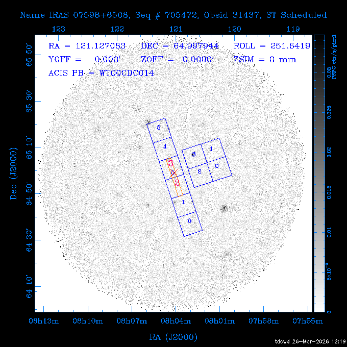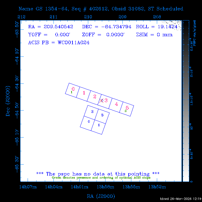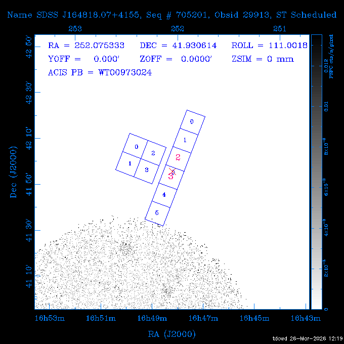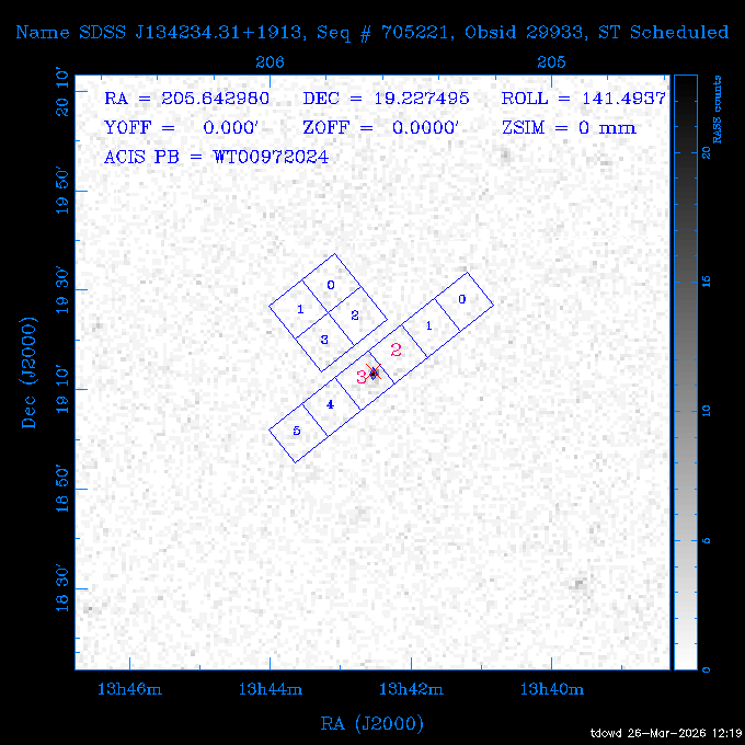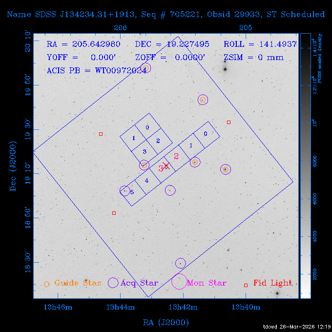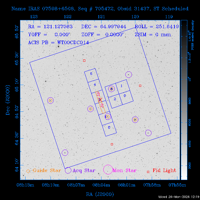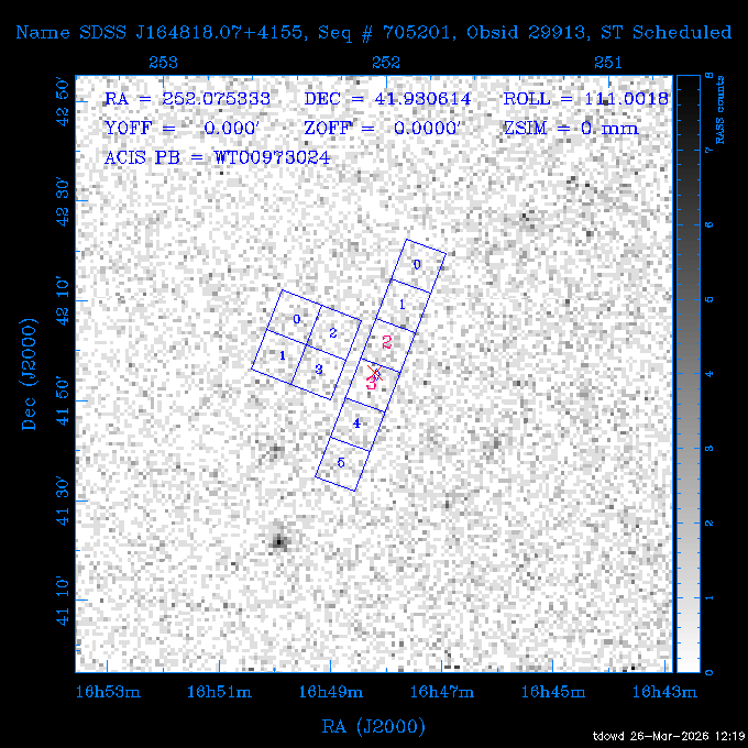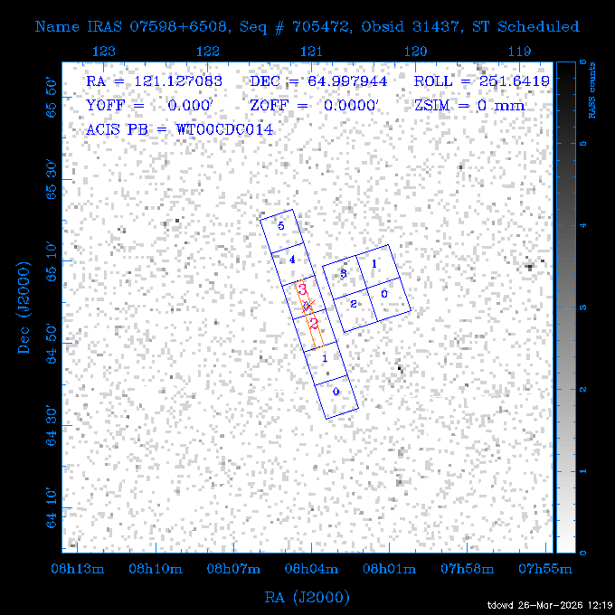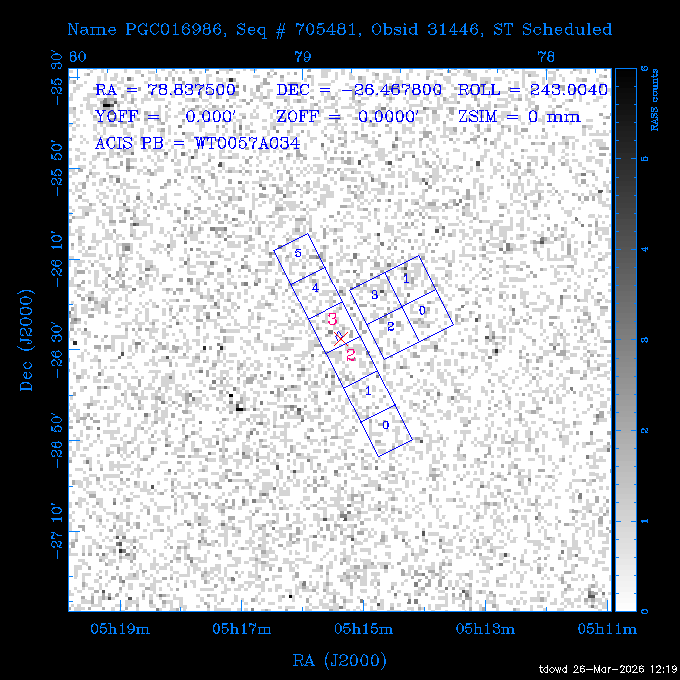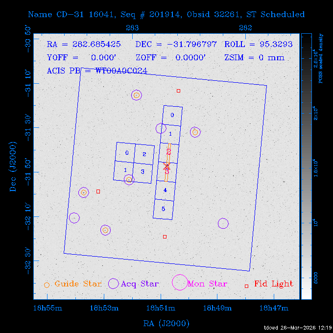 Seq # NB ObsID Constr. Target Start Time SI Grat Active Chips RA Dec Roll Pitch Slew Overlays ------ --- ----- ------- -------------------- --------------------- ----- ------ ---- ----------------- -------- -------- ------ ------ ------ ------------- 201914 CCT 32261 0 CD-31 16041 2026:088:22:15:39.237 5.0 ACIS-S NONE S2,S3 282.6854 -31.7968 95.34 88.01 90.34 dss pspc rass 503605 TOO 31127 0 SN 2026dix 2026:089:00:23:04.279 10.0 ACIS-S NONE S2,S3 177.6560 55.3536 180.96 120.48 128.63 dss pspc rass 705221 29933 0 SDSS J134234.31+1913 2026:089:03:35:39.594 6.0 ACIS-S NONE S2,S3 205.6430 19.2275 141.49 151.57 46.81 dss pspc rass 705201 29913 0 SDSS J164818.07+4155 2026:089:05:41:25.415 44.4 ACIS-S NONE S2,S3 252.0753 41.9306 110.98 106.73 45.54 dss pspc rass ---- 41588 CAL-ER (PER01) 2026:089:18:31:34.738 2.0 -- -- 191.5000 -1.4000 133.64 176.46 69.60 ---- 41587 CAL-ER (PER03) 2026:089:20:15:00.000 1.0 -- -- 324.0000 26.0000 70.58 48.42 128.37 ---- 41586 CAL-ER (PER04) 2026:089:21:30:00.000 1.0 -- -- 349.5000 -41.3000 153.58 48.58 102.26 ---- 41585 CAL-ER (PER05) 2026:089:23:00:00.000 2.0 -- -- 190.5000 -6.2000 31.73 177.32 129.00 ---- 41584 CAL-ER (PER02) 2026:090:00:10:00.000 2.0 -- -- 230.0000 -0.9000 94.97 139.05 71.51 ---- 41583 CAL-ER (PER06) 2026:090:01:30:00.000 1.0 -- -- 323.0000 23.0000 73.99 48.48 93.14 ---- 41582 CAL-ER (PER07) 2026:090:02:40:00.000 1.0 -- -- 55.2000 22.5000 285.68 48.18 125.57 ---- 41581 CAL-ER (CAL01) 2026:090:03:45:00.000 1.0 -- -- 185.2000 -3.7000 259.00 175.95 128.47 802198 30335 0 Perseus cluster W 2026:090:04:50:31.111 12.5 ACIS-I NONE I0,I1,I2,I3 49.8438 41.5093 300.02 52.13 128.65 dss pspc rass 601651 29656 0 NGC4496A 2026:090:09:01:17.973 10.0 ACIS-S NONE I3,S2,S3,S4 187.9135 3.9396 191.02 171.85 121.26 dss pspc rass 802198 32268 0 Perseus cluster W 2026:090:12:30:24.840 17.5 ACIS-I NONE I0,I1,I2,I3,S2 49.8438 41.5093 300.02 51.85 121.27 dss pspc rass 601651 32262 0 NGC4496A 2026:090:18:04:29.599 10.0 ACIS-S NONE I3,S2,S3,S4 187.9135 3.9396 193.26 171.64 121.11 dss pspc rass 802198 32269 0 Perseus cluster W 2026:090:21:33:34.362 17.8 ACIS-I NONE I0,I1,I2,I3,S2 49.8438 41.5093 300.02 51.52 121.11 dss pspc rass 601651 32263 0 NGC4496A 2026:091:03:12:37.447 10.0 ACIS-S NONE I3,S2,S3,S4 187.9135 3.9396 195.36 171.41 120.98 dss pspc rass 802198 32270 0 Perseus cluster W 2026:091:06:41:41.300 17.5 ACIS-I NONE I0,I1,I2,I3,S2 49.8438 41.5093 301.02 51.18 121.04 dss pspc rass 601651 32264 0 NGC4496A 2026:091:12:15:43.745 10.0 ACIS-S NONE I3,S2,S3,S4 187.9135 3.9396 197.28 171.17 120.93 dss pspc rass 802198 32271 0 Perseus cluster W 2026:091:15:44:46.194 17.5 ACIS-I NONE I0,I1,I2,I3,S2 49.8438 41.5093 301.02 50.85 120.93 dss pspc rass 601651 32265 0 NGC4496A 2026:091:21:18:47.560 10.0 ACIS-S NONE I3,S2,S3,S4 187.9135 3.9396 199.06 170.92 120.85 dss pspc rass 802198 32272 0 Perseus cluster W 2026:092:00:47:49.515 17.0 ACIS-I NONE I0,I1,I2,I3 49.8438 41.5093 302.02 50.52 120.90 dss pspc rass 503630 TOO 31152 3 AT2026dbl 2026:092:06:03:12.854 12.6 ACIS-S NONE S2,S3 135.3224 18.6022 252.65 120.19 74.50 dss pspc rass ---- 41580 CAL-ER (PER08) 2026:092:10:03:31.607 3.0 -- -- 189.5000 -0.4000 202.43 175.17 68.69 ---- 41579 CAL-ER (PER09) 2026:092:12:00:00.000 3.0 -- -- 49.0000 41.0000 306.74 49.32 126.28 ---- 41578 CAL-ER (PER10) 2026:092:14:00:00.000 3.0 -- -- 343.0000 -35.0000 140.32 48.08 174.28 ---- 41577 CAL-ER (CAL01) 2026:092:16:00:00.000 1.0 -- -- 212.0000 -37.0000 35.25 142.90 94.82 ---- 41576 CAL-ER (PER11) 2026:092:17:00:00.000 1.0 -- -- 25.0000 -71.0000 193.76 76.50 72.93 ---- 41575 CAL-ER (PER12) 2026:092:18:09:00.000 1.0 -- -- 107.0000 52.0000 262.70 89.37 138.02 ---- 41574 CAL-ER (CAL01) 2026:092:19:07:00.000 1.0 -- -- 191.0000 -0.8500 188.99 175.80 90.22 802198 32273 0 Perseus cluster W 2026:092:20:10:40.156 10.0 ACIS-I NONE I0,I1,I2,I3 49.8438 41.5093 303.02 49.85 127.33 dss pspc rass 601658 30177 0 NGC4694 2026:092:23:38:58.199 10.0 ACIS-S NONE I3,S2,S3,S4 192.0629 10.9835 182.00 163.95 117.60 dss pspc rass 802198 30337 0 Perseus cluster W 2026:093:03:07:16.242 15.7 ACIS-I NONE I0,I1,I2,I3,S2 49.8438 41.5093 303.02 49.61 117.60 dss pspc rass 601658 32266 0 NGC4694 2026:093:08:10:34.285 9.0 ACIS-S NONE I3,S2,S3,S4 192.0629 10.9835 182.00 163.82 117.60 dss pspc rass 802198 30340 0 Perseus cluster W 2026:093:11:22:13.391 15.0 ACIS-I NONE I0,I1,I2,I3,S2 49.8438 41.5093 304.02 49.31 117.68 dss pspc rass 601658 32267 0 NGC4694 2026:093:16:13:52.496 9.0 ACIS-S NONE I3,S2,S3,S4 192.0629 10.9835 182.00 163.69 117.68 dss pspc rass 802198 30341 0 Perseus cluster W 2026:093:19:25:31.602 10.0 ACIS-I NONE I0,I1,I2,I3,S2 49.8438 41.5093 304.02 49.02 117.68 dss pspc rass 705481 P1 31446 0 PGC016986 2026:093:22:47:38.938 7.0 ACIS-S NONE S2,S3 78.8375 -26.4678 243.00 71.37 89.80 dss pspc rass 402612 TOO 31082 3 GS 1354-64 2026:094:01:18:14.312 28.4 ACIS-S HETG S0,S1,S2,S3,S4,S5 209.5405 -64.7348 19.11 119.52 82.90 dss pspc rass 503630 TOO 32274 3 AT2026dbl 2026:094:09:54:51.352 36.5 ACIS-S NONE S2,S3 135.3224 18.6022 248.00 118.07 125.03 dss pspc rass 705472 P1 31437 0 IRAS 07598+6508 2026:094:20:29:39.485 10.0 ACIS-S NONE S2,S3 121.1271 64.9979 251.66 92.02 47.79 dss pspc rass 705407 31260 2 M 87 2026:094:23:47:10.749 5.0 ACIS-S NONE S2,S3 187.7059 12.3911 198.35 160.81 69.09 dss pspc rass ---- 41573 CAL-ER (PER13) 2026:095:01:51:33.037 3.0 -- -- 14.4000 53.7500 359.15 47.87 113.77 ---- 41572 CAL-ER (PER14) 2026:095:05:15:00.000 3.0 -- -- 194.5000 -1.4000 172.33 175.42 127.74 ---- 41571 CAL-ER (CAL01) 2026:095:08:00:00.000 3.0 -- -- 45.0000 49.0000 318.27 50.37 127.54 590794 31382 1 Cas A 2026:095:11:50:14.487 2.0 ACIS-S NONE S2,S3 350.8575 58.8148 20.97 55.74 36.76 dss pspc rass 590795 31383 1 Cas A 2026:095:12:32:04.487 2.0 ACIS-S NONE S2,S3 350.8575 58.8148 21.19 55.75 0.15 dss pspc rass 601743 CCT 32260 0 VCC 1465 2026:095:13:47:44.138 10.0 ACIS-I NONE I0,I1,I2,I3 188.2315 3.3604 212.28 168.85 120.72 dss pspc rass 802198 30343 0 Perseus cluster W 2026:095:17:16:52