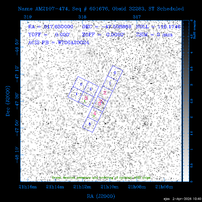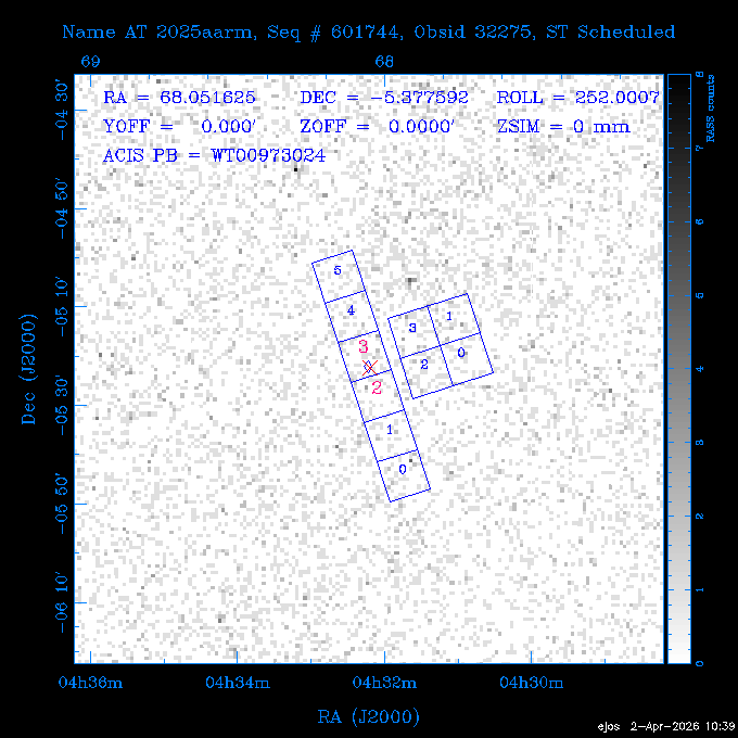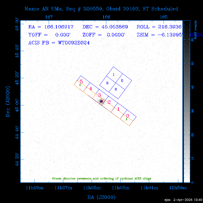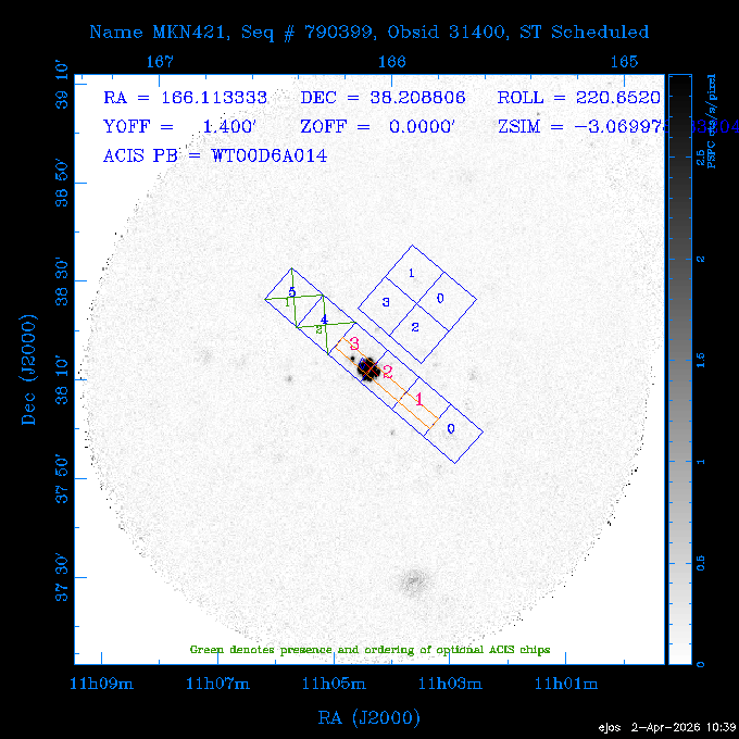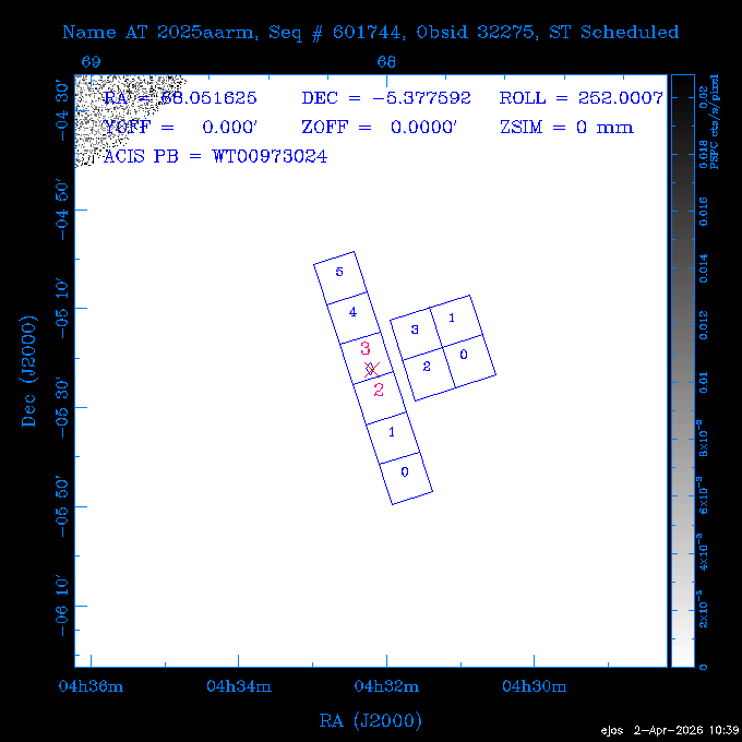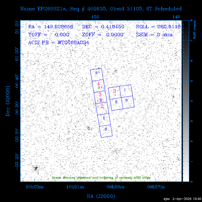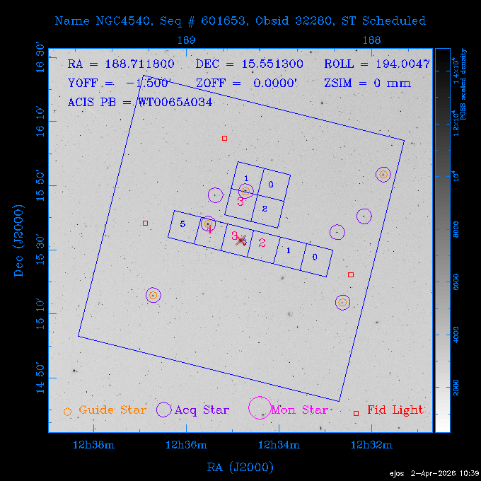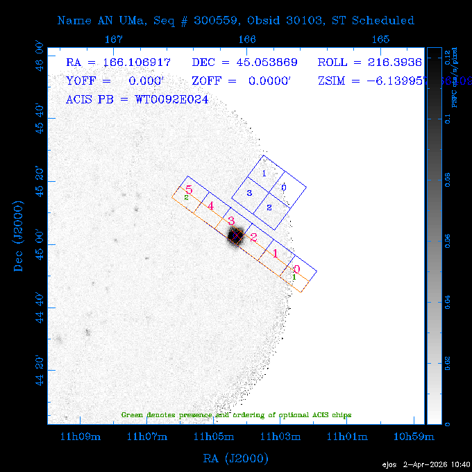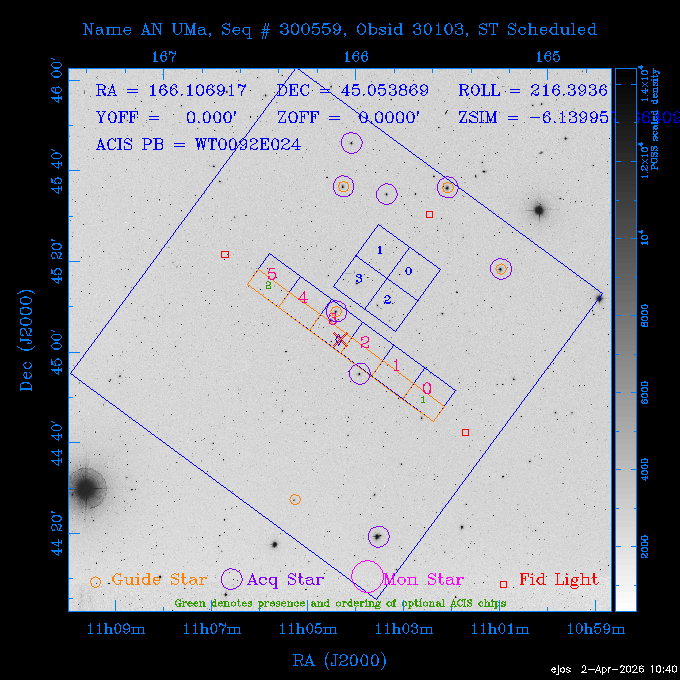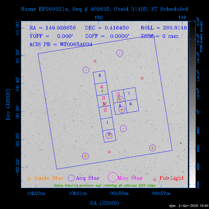 Seq # NB ObsID Constr. Target Start Time SI Grat Active Chips RA Dec Roll Pitch Slew Overlays ------ --- ----- ------- -------------------- --------------------- ----- ------ ---- ----------------- -------- -------- ------ ------ ------ ------------- 402635 TOO 31105 2 EP260321a 2026:095:22:20:38.993 20.0 ACIS-S NONE I3,S2,S3,S4 149.9287 0.4184 260.81 134.97 97.26 dss pspc rass 802236 32134 0 PSZ2G071.21+28.86 2026:096:04:38:16.307 14.0 ACIS-I NONE I0,I1,I2,I3 268.0423 44.6996 106.32 97.28 129.55 dss pspc rass 802207 30423 0 Abell 2255 2026:096:08:50:34.082 29.5 ACIS-I NONE I0,I1,I2,I3 258.2085 64.0529 116.87 95.53 20.28 dss pspc rass 601653 29658 0 NGC4540 2026:096:17:33:33.074 12.0 ACIS-S NONE I3,S2,S3,S4 188.7118 15.5513 194.00 157.02 71.17 dss pspc rass 802229 30487 0 VLSSr J031859.0+5755 2026:096:21:31:04.975 13.0 ACIS-I NONE I0,I1,I2,I3 49.7407 57.9164 314.03 57.82 99.14 dss pspc rass 601653 32278 0 NGC4540 2026:097:01:45:16.875 11.0 ACIS-S NONE I3,S2,S3,S4 188.7118 15.5513 194.00 156.80 99.14 dss pspc rass 802229 32286 0 VLSSr J031859.0+5755 2026:097:05:26:08.775 13.0 ACIS-I NONE I0,I1,I2,I3 49.7407 57.9164 313.03 57.59 99.14 dss pspc rass 601653 32279 0 NGC4540 2026:097:09:40:20.671 11.0 ACIS-S NONE I3,S2,S3,S4 188.7118 15.5513 194.00 156.58 99.14 dss pspc rass 802229 32287 0 VLSSr J031859.0+5755 2026:097:13:21:12.574 12.1 ACIS-I NONE I0,I1,I2,I3 49.7407 57.9164 314.03 57.36 99.14 dss pspc rass ---- 41570 CAL-ER (PER01) 2026:097:17:25:14.296 3.0 -- -- 195.7697 -4.8217 191.49 177.90 120.71 ---- 41569 CAL-ER (CAL01) 2026:097:18:59:53.207 0.9 -- -- 47.8740 45.5983 314.95 47.36 131.17 ---- 41568 CAL-ER (CAL01) 2026:097:21:00:00.000 3.0 -- -- 195.7697 -4.8217 194.28 177.81 131.00 ---- 41567 CAL-ER (PER02) 2026:098:01:00:00.000 0.9 -- -- 47.8740 45.5983 315.13 47.19 131.01 802229 32288 0 VLSSr J031859.0+5755 2026:098:03:04:40.437 11.0 ACIS-I NONE I0,I1,I2,I3 49.7407 57.9164 314.04 56.99 12.38 dss pspc rass 601640 30152 0 NGC2566 2026:098:06:46:47.633 28.0 ACIS-S NONE I3,S2,S3,S4 124.6900 -25.4995 265.99 109.25 104.79 dss pspc rass 300559 30103 0 AN UMa 2026:098:15:08:33.316 28.0 ACIS-S HETG S0,S1,S2,S3,S4,S5 166.1069 45.0539 216.39 120.85 88.18 dss pspc rass 201915 CCT 32277 0 2RXS J080121.5+59025 2026:098:23:21:32.480 20.0 ACIS-S NONE S2,S3 120.3365 59.0474 255.13 90.31 30.68 dss pspc rass 601661 29666 0 NGC4941 2026:099:05:30:03.462 10.5 ACIS-S NONE I3,S2,S3,S4 196.0547 -5.5516 225.40 177.60 88.57 dss pspc rass 802237 30539 0 1RXS J021649.0+70355 2026:099:09:06:57.827 18.5 ACIS-I NONE I0,I1,I2,I3 34.2042 70.5978 337.05 63.99 118.83 dss pspc rass 601661 32281 0 NGC4941 2026:099:14:56:59.466 13.0 ACIS-S NONE I3,S2,S3,S4 196.0547 -5.5516 221.00 177.24 117.87 dss pspc rass 802237 30540 0 1RXS J021649.0+70355 2026:099:19:15:07.863 19.0 ACIS-I NONE I0,I1,I2,I3 34.2042 70.5978 342.23 63.78 116.88 dss pspc rass 601661 32282 0 NGC4941 2026:100:01:13:16.236 11.9 ACIS-S NONE I3,S2,S3,S4 196.0547 -5.5516 221.00 176.85 116.88 dss pspc rass 802237 32289 0 1RXS J021649.0+70355 2026:100:05:13:03.700 10.1 ACIS-I NONE I0,I1,I2,I3 34.2042 70.5978 342.63 63.57 116.81 dss pspc rass ---- 41566 CAL-ER (PER03) 2026:100:08:31:46.141 3.0 -- -- 68.7621 16.6170 273.80 49.67 70.27 ---- 41565 CAL-ER (CAL01) 2026:100:10:02:52.846 3.0 -- -- 184.1169 -3.4038 252.16 164.86 115.25 ---- 41564 CAL-ER (CAL01) 2026:100:11:33:59.549 0.9 -- -- 68.7621 16.6170 273.76 49.55 115.25 ---- 41563 CAL-ER (CAL01) 2026:100:13:00:00.000 3.0 -- -- 184.1169 -3.4038 252.08 164.75 115.25 ---- 41562 CAL-ER (CAL01) 2026:100:16:25:00.000 0.9 -- -- 68.7621 16.6170 273.74 49.38 115.25 790399 31400 3 MKN421 2026:100:18:18:47.646 30.0 ACIS-S LETG S1,S2,S3 166.1133 38.2088 220.65 124.58 85.44 dss pspc rass 705536 CCT 32276 0 RGB_J0710p591_s1 2026:101:03:05:06.810 11.0 ACIS-S NONE S2,S3 107.7882 59.1248 264.01 82.26 42.14 dss pspc rass 601653 32280 0 NGC4540 2026:101:06:40:08.470 10.0 ACIS-S NONE I3,S2,S3,S4 188.7118 15.5513 194.00 154.00 72.87 dss pspc rass 802237 32290 0 1RXS J021649.0+70355 2026:101:10:02:46.034 10.0 ACIS-I NONE I0,I1,I2,I3 34.2042 70.5978 341.06 63.06 92.07 dss pspc rass ---- 41561 CAL-ER (IAT01) 2026:101:13:18:50.949 0.9 -- -- 250.4945 44.0483 125.07 110.47 62.62 705227 30201 0 NGC5728 2026:101:14:10:07.757 10.5 ACIS-S NONE S2,S3 220.5995 -17.2531 68.72 157.78 90.44 dss pspc rass ---- 41560 CAL-ER (IAT02) 2026:101:17:50:30.641 0.9 -- -- 188.5112 -12.1536 287.76 168.18 134.47 601744 DDT 32275 1 AT 2025aarm 2026:101:18:47:59.941 15.0 ACIS-S NONE S2,S3 68.0516 -5.3776 252.00 49.91 118.37 dss pspc rass ---- 41559 CAL-ER (CAL01) 2026:101:23:39:47.942 0.9 -- -- 188.5112 -12.1536 286.98 167.99 118.35 705227 32284 0 NGC5728 2026:102:00:41:00.707 9.5 ACIS-S NONE S2,S3 220.5995 -17.2531 68.64 158.22 135.13 dss pspc rass 601676 30186 0 AM2107-474 2026:102:03:53:21.689 15.0 ACIS-S NONE I3,S2,S3,S4 317.6300 -47.5089 116.36 78.57 83.32 dss pspc rass 705227 32285 0 NGC5728 2026:102:08:37:22.568 10.0 ACIS-S NONE S2,S3 220.5995 -17.2531 68.59 158.55 83.32 dss pspc rass 601676 32283 0 AM2107-474 2026:102:11:58:03.802 15.0 ACIS-S NONE I3,S2,S3,S4 317.6300 -47.5089 116.20 78.86 83.34 dss pspc rass 705435 P1 31288 0 2MASX J07233444-5610 2026:102:16:40:00.038 10.0 ACIS-S NONE S2,S3 110.8932 -56.1786 265.22 97.28 73.97 dss pspc rass 705430 32119 0 SDSS J093401.24+2453 2026:102:20:02:09.578 10.4 ACIS-S NONE S1,S2,S3,S4 143.5051 24.8951 246.46 114.77 89.97 dss pspc rass ---- 41558 CAL-ER (CAL01) 2026:102:23:23:47.143 0.9 -- -- 196.0559 -4.6851 229.70 173.57 59.32