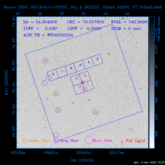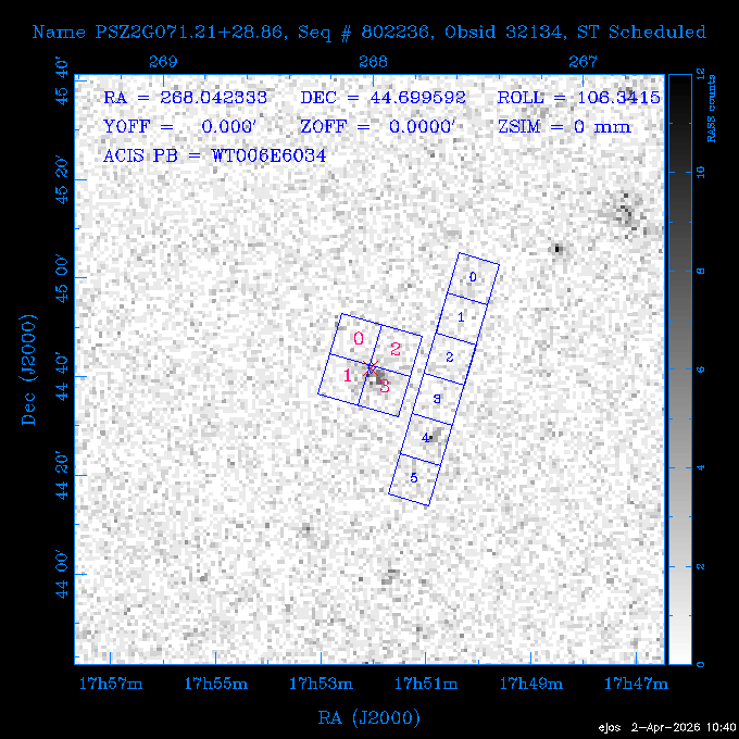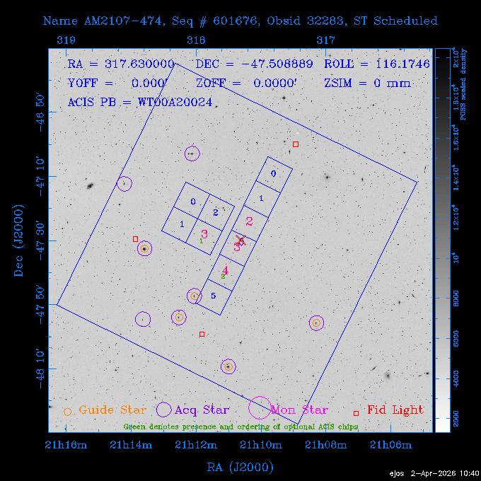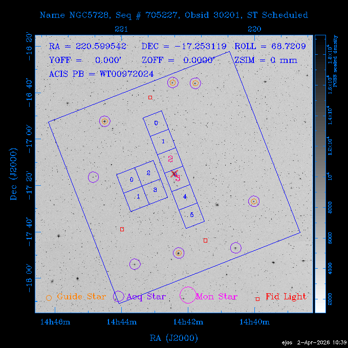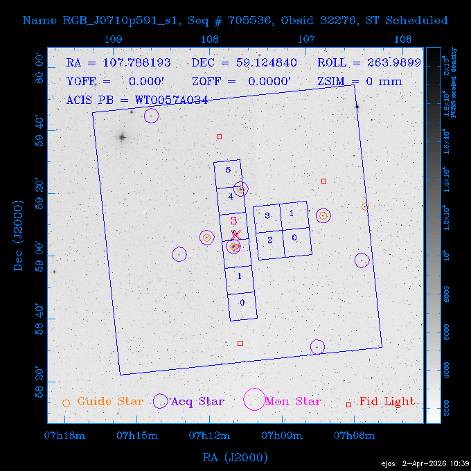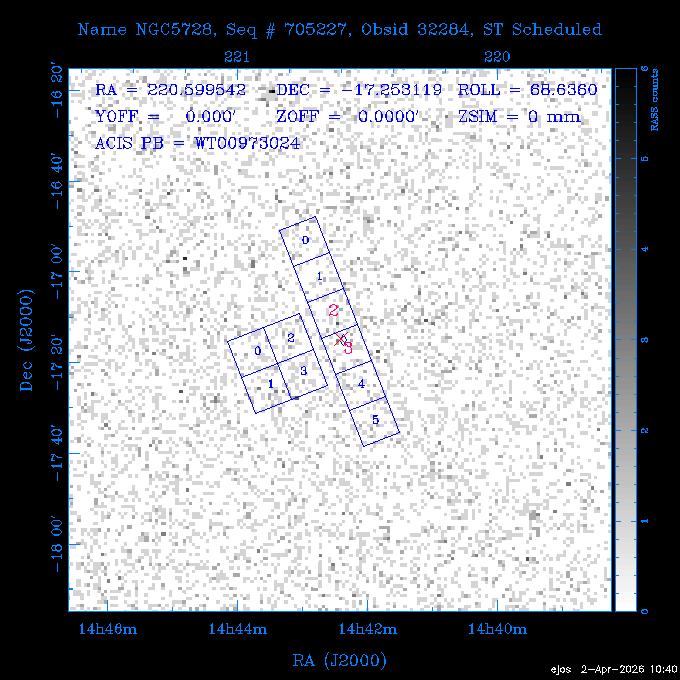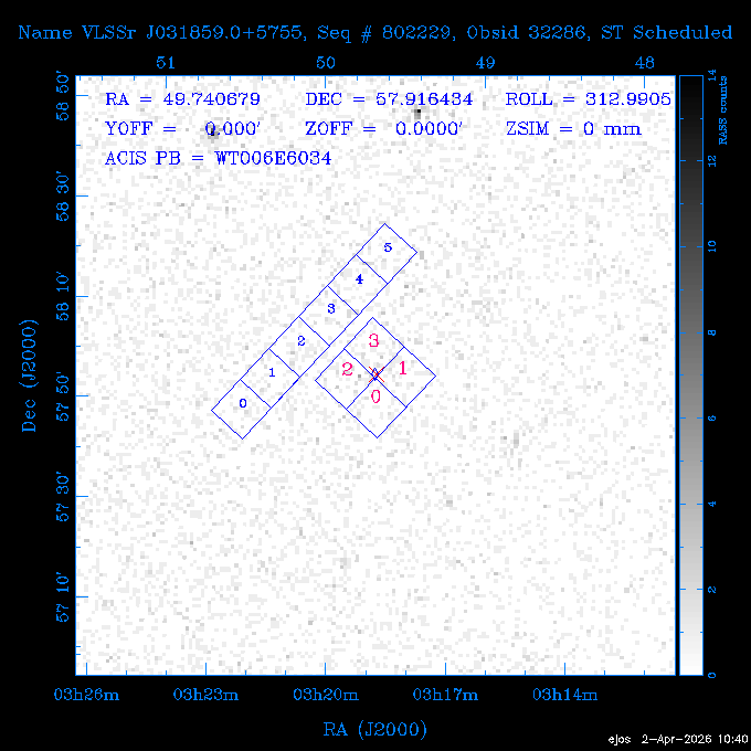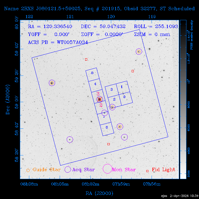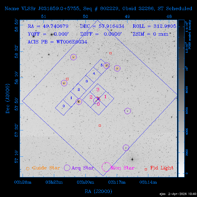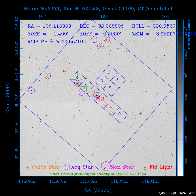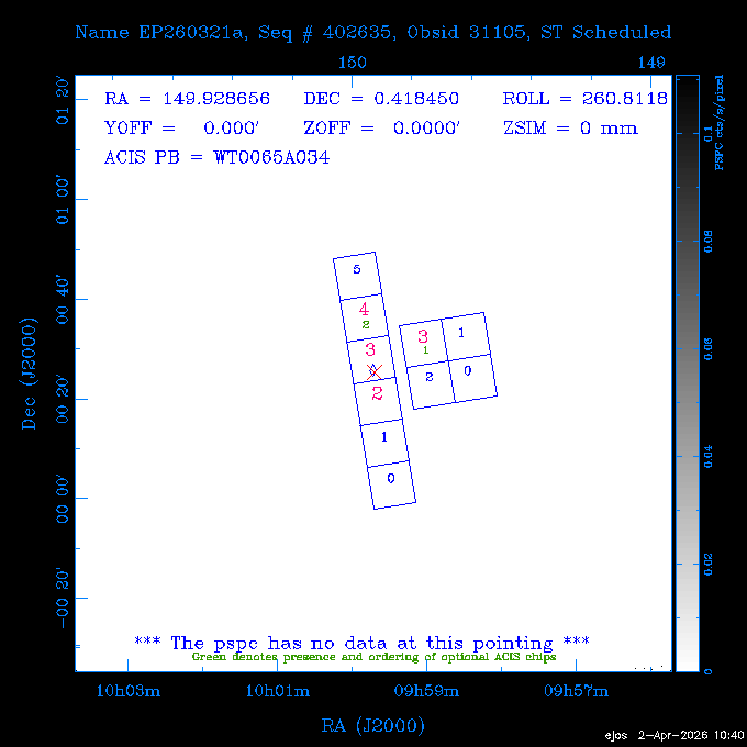 Seq # NB ObsID Constr. Target Start Time SI Grat Active Chips RA Dec Roll Pitch Slew Overlays ------ --- ----- ------- -------------------- --------------------- ----- ------ ---- ----------------- -------- -------- ------ ------ ------ ------------- 402635 TOO 31105 2 EP260321a 2026:095:22:20:38.993 20.0 ACIS-S NONE I3,S2,S3,S4 149.9287 0.4184 260.81 134.97 97.26 dss pspc rass 802236 32134 0 PSZ2G071.21+28.86 2026:096:04:38:16.307 14.0 ACIS-I NONE I0,I1,I2,I3 268.0423 44.6996 106.32 97.28 129.55 dss pspc rass 802207 30423 0 Abell 2255 2026:096:08:50:34.082 29.5 ACIS-I NONE I0,I1,I2,I3 258.2085 64.0529 116.87 95.53 20.28 dss pspc rass 601653 29658 0 NGC4540 2026:096:17:33:33.074 12.0 ACIS-S NONE I3,S2,S3,S4 188.7118 15.5513 194.00 157.02 71.17 dss pspc rass 802229 30487 0 VLSSr J031859.0+5755 2026:096:21:31:04.975 13.0 ACIS-I NONE I0,I1,I2,I3 49.7407 57.9164 314.03 57.82 99.14 dss pspc rass 601653 32278 0 NGC4540 2026:097:01:45:16.875 11.0 ACIS-S NONE I3,S2,S3,S4 188.7118 15.5513 194.00 156.80 99.14 dss pspc rass 802229 32286 0 VLSSr J031859.0+5755 2026:097:05:26:08.775 13.0 ACIS-I NONE I0,I1,I2,I3 49.7407 57.9164 313.03 57.59 99.14 dss pspc rass 601653 32279 0 NGC4540 2026:097:09:40:20.671 11.0 ACIS-S NONE I3,S2,S3,S4 188.7118 15.5513 194.00 156.58 99.14 dss pspc rass 802229 32287 0 VLSSr J031859.0+5755 2026:097:13:21:12.574 12.1 ACIS-I NONE I0,I1,I2,I3 49.7407 57.9164 314.03 57.36 99.14 dss pspc rass ---- 41570 CAL-ER (PER01) 2026:097:17:25:14.296 3.0 -- -- 195.7697 -4.8217 191.49 177.90 120.71 ---- 41569 CAL-ER (CAL01) 2026:097:18:59:53.207 0.9 -- -- 47.8740 45.5983 314.95 47.36 131.17 ---- 41568 CAL-ER (CAL01) 2026:097:21:00:00.000 3.0 -- -- 195.7697 -4.8217 194.28 177.81 131.00 ---- 41567 CAL-ER (PER02) 2026:098:01:00:00.000 0.9 -- -- 47.8740 45.5983 315.13 47.19 131.01 802229 32288 0 VLSSr J031859.0+5755 2026:098:03:04:40.437 11.0 ACIS-I NONE I0,I1,I2,I3 49.7407 57.9164 314.04 56.99 12.38 dss pspc rass 601640 30152 0 NGC2566 2026:098:06:46:47.633 28.0 ACIS-S NONE I3,S2,S3,S4 124.6900 -25.4995 265.99 109.25 104.79 dss pspc rass 300559 30103 0 AN UMa 2026:098:15:08:33.316 28.0 ACIS-S HETG S0,S1,S2,S3,S4,S5 166.1069 45.0539 216.39 120.85 88.18 dss pspc rass 201915 CCT 32277 0 2RXS J080121.5+59025 2026:098:23:21:32.480 20.0 ACIS-S NONE S2,S3 120.3365 59.0474 255.13 90.31 30.68 dss pspc rass 601661 29666 0 NGC4941 2026:099:05:30:03.462 10.5 ACIS-S NONE I3,S2,S3,S4 196.0547 -5.5516 225.40 177.60 88.57 dss pspc rass 802237 30539 0 1RXS J021649.0+70355 2026:099:09:06:57.827 18.5 ACIS-I NONE I0,I1,I2,I3 34.2042 70.5978 337.05 63.99 118.83 dss pspc rass 601661 32281 0 NGC4941 2026:099:14:56:59.466 13.0 ACIS-S NONE I3,S2,S3,S4 196.0547 -5.5516 221.00 177.24 117.87 dss pspc rass 802237 30540 0 1RXS J021649.0+70355 2026:099:19:15:07.863 19.0 ACIS-I NONE I0,I1,I2,I3 34.2042 70.5978 342.23 63.78 116.88 dss pspc rass 601661 32282 0 NGC4941 2026:100:01:13:16.236 11.9 ACIS-S NONE I3,S2,S3,S4 196.0547 -5.5516 221.00 176.85 116.88 dss pspc rass 802237 32289 0 1RXS J021649.0+70355 2026:100:05:13:03.700 10.1 ACIS-I NONE I0,I1,I2,I3 34.2042 70.5978 342.63 63.57 116.81 dss pspc rass ---- 41566 CAL-ER (PER03) 2026:100:08:31:46.141 3.0 -- -- 68.7621 16.6170 273.80 49.67 70.27 ---- 41565 CAL-ER (CAL01) 2026:100:10:02:52.846 3.0 -- -- 184.1169 -3.4038 252.16 164.86 115.25 ---- 41564 CAL-ER (CAL01) 2026:100:11:33:59.549 0.9 -- -- 68.7621 16.6170 273.76 49.55 115.25 ---- 41563 CAL-ER (CAL01) 2026:100:13:00:00.000 3.0 -- -- 184.1169 -3.4038 252.08 164.75 115.25 ---- 41562 CAL-ER (CAL01) 2026:100:16:25:00.000 0.9 -- -- 68.7621 16.6170 273.74 49.38 115.25 790399 31400 3 MKN421 2026:100:18:18:47.646 30.0 ACIS-S LETG S1,S2,S3 166.1133 38.2088 220.65 124.58 85.44 dss pspc rass 705536 CCT 32276 0 RGB_J0710p591_s1 2026:101:03:05:06.810 11.0 ACIS-S NONE S2,S3 107.7882 59.1248 264.01 82.26 42.14 dss pspc rass 601653 32280 0 NGC4540 2026:101:06:40:08.470 10.0 ACIS-S NONE I3,S2,S3,S4 188.7118 15.5513 194.00 154.00 72.87 dss pspc rass 802237 32290 0 1RXS J021649.0+70355 2026:101:10:02:46.034 10.0 ACIS-I NONE I0,I1,I2,I3 34.2042 70.5978 341.06 63.06 92.07 dss pspc rass ---- 41561 CAL-ER (IAT01) 2026:101:13:18:50.949 0.9 -- -- 250.4945 44.0483 125.07 110.47 62.62 705227 30201 0 NGC5728 2026:101:14:10:07.757 10.5 ACIS-S NONE S2,S3 220.5995 -17.2531 68.72 157.78 90.44 dss pspc rass ---- 41560 CAL-ER (IAT02) 2026:101:17:50:30.641 0.9 -- -- 188.5112 -12.1536 287.76 168.18 134.47 601744 DDT 32275 1 AT 2025aarm 2026:101:18:47:59.941 15.0 ACIS-S NONE S2,S3 68.0516 -5.3776 252.00 49.91 118.37 dss pspc rass ---- 41559 CAL-ER (CAL01) 2026:101:23:39:47.942 0.9 -- -- 188.5112 -12.1536 286.98 167.99 118.35 705227 32284 0 NGC5728 2026:102:00:41:00.707 9.5 ACIS-S NONE S2,S3 220.5995 -17.2531 68.64 158.22 135.13 dss pspc rass 601676 30186 0 AM2107-474 2026:102:03:53:21.689 15.0 ACIS-S NONE I3,S2,S3,S4 317.6300 -47.5089 116.36 78.57 83.32 dss pspc rass 705227 32285 0 NGC5728 2026:102:08:37:22.568 10.0 ACIS-S NONE S2,S3 220.5995 -17.2531 68.59 158.55 83.32 dss pspc rass 601676 32283 0 AM2107-474 2026:102:11:58:03.802 15.0 ACIS-S NONE I3,S2,S3,S4 317.6300 -47.5089 116.20 78.86 83.34 dss pspc rass 705435 P1 31288 0 2MASX J07233444-5610 2026:102:16:40:00.038 10.0 ACIS-S NONE S2,S3 110.8932 -56.1786 265.22 97.28 73.97 dss pspc rass 705430 32119 0 SDSS J093401.24+2453 2026:102:20:02:09.578 10.4 ACIS-S NONE S1,S2,S3,S4 143.5051 24.8951 246.46 114.77 89.97 dss pspc rass ---- 41558 CAL-ER (CAL01) 2026:102:23:23:47.143 0.9 -- -- 196.0559 -4.6851 229.70 173.57 59.32