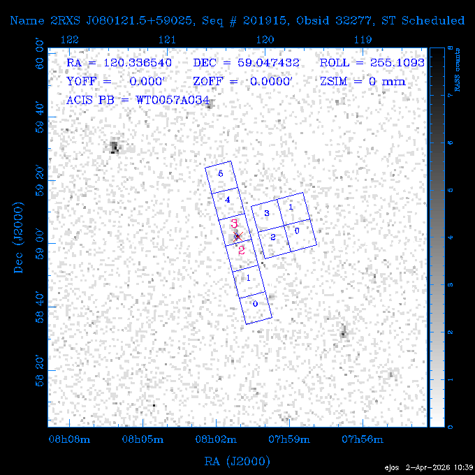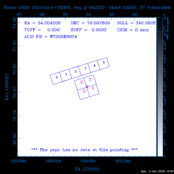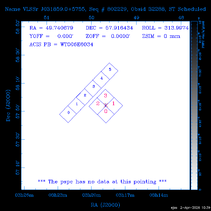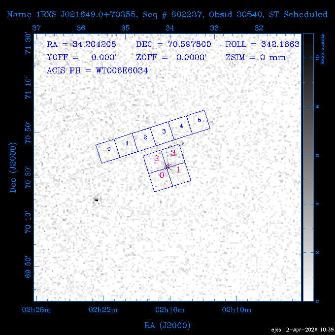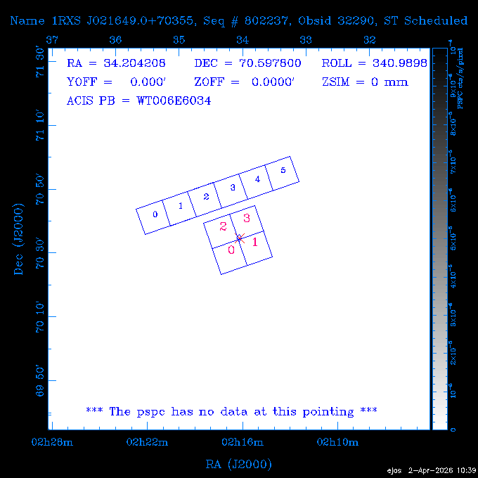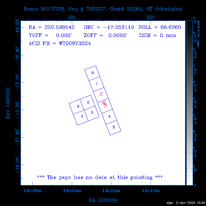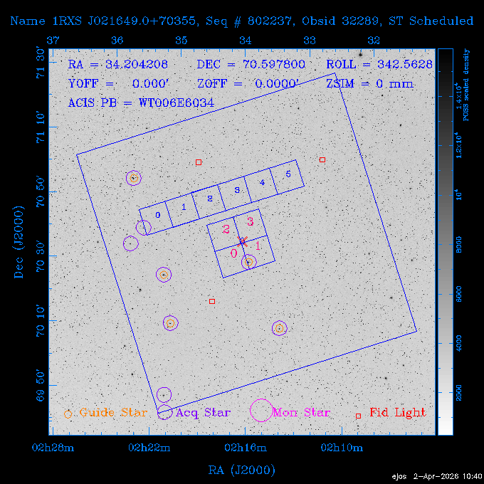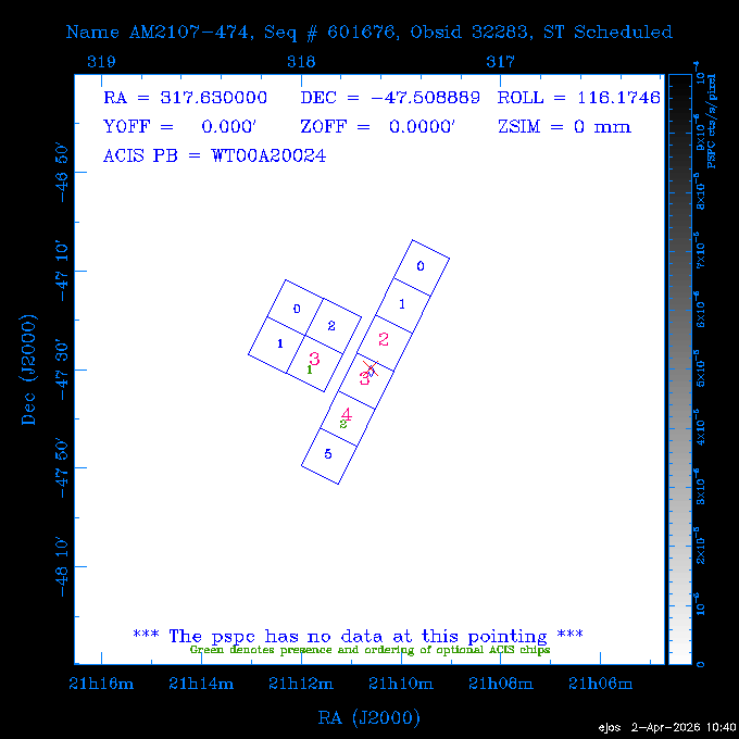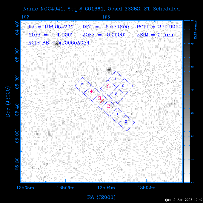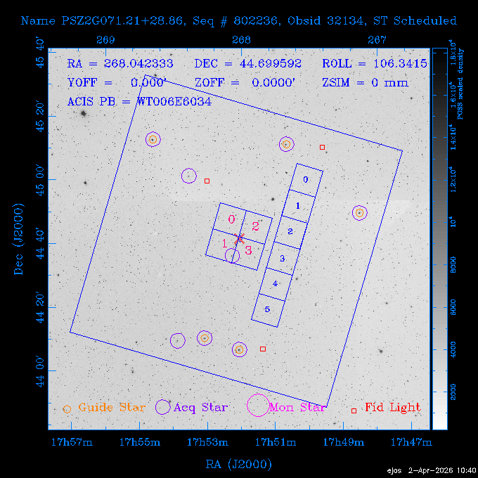 Seq # NB ObsID Constr. Target Start Time SI Grat Active Chips RA Dec Roll Pitch Slew Overlays ------ --- ----- ------- -------------------- --------------------- ----- ------ ---- ----------------- -------- -------- ------ ------ ------ ------------- 402635 TOO 31105 2 EP260321a 2026:095:22:20:38.993 20.0 ACIS-S NONE I3,S2,S3,S4 149.9287 0.4184 260.81 134.97 97.26 dss pspc rass 802236 32134 0 PSZ2G071.21+28.86 2026:096:04:38:16.307 14.0 ACIS-I NONE I0,I1,I2,I3 268.0423 44.6996 106.32 97.28 129.55 dss pspc rass 802207 30423 0 Abell 2255 2026:096:08:50:34.082 29.5 ACIS-I NONE I0,I1,I2,I3 258.2085 64.0529 116.87 95.53 20.28 dss pspc rass 601653 29658 0 NGC4540 2026:096:17:33:33.074 12.0 ACIS-S NONE I3,S2,S3,S4 188.7118 15.5513 194.00 157.02 71.17 dss pspc rass 802229 30487 0 VLSSr J031859.0+5755 2026:096:21:31:04.975 13.0 ACIS-I NONE I0,I1,I2,I3 49.7407 57.9164 314.03 57.82 99.14 dss pspc rass 601653 32278 0 NGC4540 2026:097:01:45:16.875 11.0 ACIS-S NONE I3,S2,S3,S4 188.7118 15.5513 194.00 156.80 99.14 dss pspc rass 802229 32286 0 VLSSr J031859.0+5755 2026:097:05:26:08.775 13.0 ACIS-I NONE I0,I1,I2,I3 49.7407 57.9164 313.03 57.59 99.14 dss pspc rass 601653 32279 0 NGC4540 2026:097:09:40:20.671 11.0 ACIS-S NONE I3,S2,S3,S4 188.7118 15.5513 194.00 156.58 99.14 dss pspc rass 802229 32287 0 VLSSr J031859.0+5755 2026:097:13:21:12.574 12.1 ACIS-I NONE I0,I1,I2,I3 49.7407 57.9164 314.03 57.36 99.14 dss pspc rass ---- 41570 CAL-ER (PER01) 2026:097:17:25:14.296 3.0 -- -- 195.7697 -4.8217 191.49 177.90 120.71 ---- 41569 CAL-ER (CAL01) 2026:097:18:59:53.207 0.9 -- -- 47.8740 45.5983 314.95 47.36 131.17 ---- 41568 CAL-ER (CAL01) 2026:097:21:00:00.000 3.0 -- -- 195.7697 -4.8217 194.28 177.81 131.00 ---- 41567 CAL-ER (PER02) 2026:098:01:00:00.000 0.9 -- -- 47.8740 45.5983 315.13 47.19 131.01 802229 32288 0 VLSSr J031859.0+5755 2026:098:03:04:40.437 11.0 ACIS-I NONE I0,I1,I2,I3 49.7407 57.9164 314.04 56.99 12.38 dss pspc rass 601640 30152 0 NGC2566 2026:098:06:46:47.633 28.0 ACIS-S NONE I3,S2,S3,S4 124.6900 -25.4995 265.99 109.25 104.79 dss pspc rass 300559 30103 0 AN UMa 2026:098:15:08:33.316 28.0 ACIS-S HETG S0,S1,S2,S3,S4,S5 166.1069 45.0539 216.39 120.85 88.18 dss pspc rass 201915 CCT 32277 0 2RXS J080121.5+59025 2026:098:23:21:32.480 20.0 ACIS-S NONE S2,S3 120.3365 59.0474 255.13 90.31 30.68 dss pspc rass 601661 29666 0 NGC4941 2026:099:05:30:03.462 10.5 ACIS-S NONE I3,S2,S3,S4 196.0547 -5.5516 225.40 177.60 88.57 dss pspc rass 802237 30539 0 1RXS J021649.0+70355 2026:099:09:06:57.827 18.5 ACIS-I NONE I0,I1,I2,I3 34.2042 70.5978 337.05 63.99 118.83 dss pspc rass 601661 32281 0 NGC4941 2026:099:14:56:59.466 13.0 ACIS-S NONE I3,S2,S3,S4 196.0547 -5.5516 221.00 177.24 117.87 dss pspc rass 802237 30540 0 1RXS J021649.0+70355 2026:099:19:15:07.863 19.0 ACIS-I NONE I0,I1,I2,I3 34.2042 70.5978 342.23 63.78 116.88 dss pspc rass 601661 32282 0 NGC4941 2026:100:01:13:16.236 11.9 ACIS-S NONE I3,S2,S3,S4 196.0547 -5.5516 221.00 176.85 116.88 dss pspc rass 802237 32289 0 1RXS J021649.0+70355 2026:100:05:13:03.700 10.1 ACIS-I NONE I0,I1,I2,I3 34.2042 70.5978 342.63 63.57 116.81 dss pspc rass ---- 41566 CAL-ER (PER03) 2026:100:08:31:46.141 3.0 -- -- 68.7621 16.6170 273.80 49.67 70.27 ---- 41565 CAL-ER (CAL01) 2026:100:10:02:52.846 3.0 -- -- 184.1169 -3.4038 252.16 164.86 115.25 ---- 41564 CAL-ER (CAL01) 2026:100:11:33:59.549 0.9 -- -- 68.7621 16.6170 273.76 49.55 115.25 ---- 41563 CAL-ER (CAL01) 2026:100:13:00:00.000 3.0 -- -- 184.1169 -3.4038 252.08 164.75 115.25 ---- 41562 CAL-ER (CAL01) 2026:100:16:25:00.000 0.9 -- -- 68.7621 16.6170 273.74 49.38 115.25 790399 31400 3 MKN421 2026:100:18:18:47.646 30.0 ACIS-S LETG S1,S2,S3 166.1133 38.2088 220.65 124.58 85.44 dss pspc rass 705536 CCT 32276 0 RGB_J0710p591_s1 2026:101:03:05:06.810 11.0 ACIS-S NONE S2,S3 107.7882 59.1248 264.01 82.26 42.14 dss pspc rass 601653 32280 0 NGC4540 2026:101:06:40:08.470 10.0 ACIS-S NONE I3,S2,S3,S4 188.7118 15.5513 194.00 154.00 72.87 dss pspc rass 802237 32290 0 1RXS J021649.0+70355 2026:101:10:02:46.034 10.0 ACIS-I NONE I0,I1,I2,I3 34.2042 70.5978 341.06 63.06 92.07 dss pspc rass ---- 41561 CAL-ER (IAT01) 2026:101:13:18:50.949 0.9 -- -- 250.4945 44.0483 125.07 110.47 62.62 705227 30201 0 NGC5728 2026:101:14:10:07.757 10.5 ACIS-S NONE S2,S3 220.5995 -17.2531 68.72 157.78 90.44 dss pspc rass ---- 41560 CAL-ER (IAT02) 2026:101:17:50:30.641 0.9 -- -- 188.5112 -12.1536 287.76 168.18 134.47 601744 DDT 32275 1 AT 2025aarm 2026:101:18:47:59.941 15.0 ACIS-S NONE S2,S3 68.0516 -5.3776 252.00 49.91 118.37 dss pspc rass ---- 41559 CAL-ER (CAL01) 2026:101:23:39:47.942 0.9 -- -- 188.5112 -12.1536 286.98 167.99 118.35 705227 32284 0 NGC5728 2026:102:00:41:00.707 9.5 ACIS-S NONE S2,S3 220.5995 -17.2531 68.64 158.22 135.13 dss pspc rass 601676 30186 0 AM2107-474 2026:102:03:53:21.689 15.0 ACIS-S NONE I3,S2,S3,S4 317.6300 -47.5089 116.36 78.57 83.32 dss pspc rass 705227 32285 0 NGC5728 2026:102:08:37:22.568 10.0 ACIS-S NONE S2,S3 220.5995 -17.2531 68.59 158.55 83.32 dss pspc rass 601676 32283 0 AM2107-474 2026:102:11:58:03.802 15.0 ACIS-S NONE I3,S2,S3,S4 317.6300 -47.5089 116.20 78.86 83.34 dss pspc rass 705435 P1 31288 0 2MASX J07233444-5610 2026:102:16:40:00.038 10.0 ACIS-S NONE S2,S3 110.8932 -56.1786 265.22 97.28 73.97 dss pspc rass 705430 32119 0 SDSS J093401.24+2453 2026:102:20:02:09.578 10.4 ACIS-S NONE S1,S2,S3,S4 143.5051 24.8951 246.46 114.77 89.97 dss pspc rass ---- 41558 CAL-ER (CAL01) 2026:102:23:23:47.143 0.9 -- -- 196.0559 -4.6851 229.70 173.57 59.32