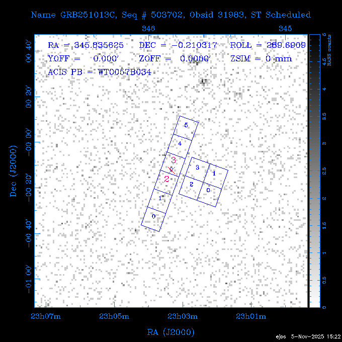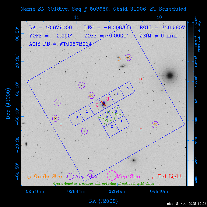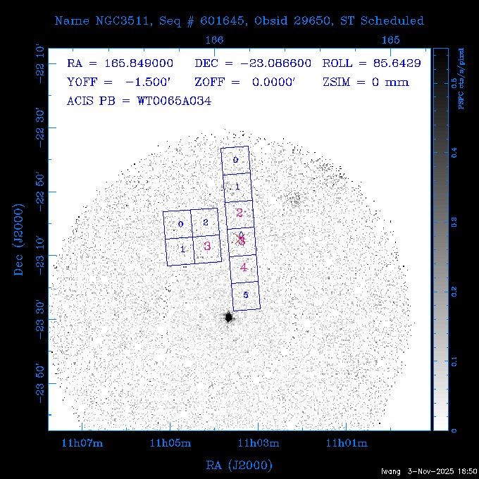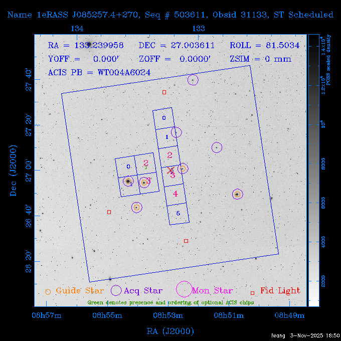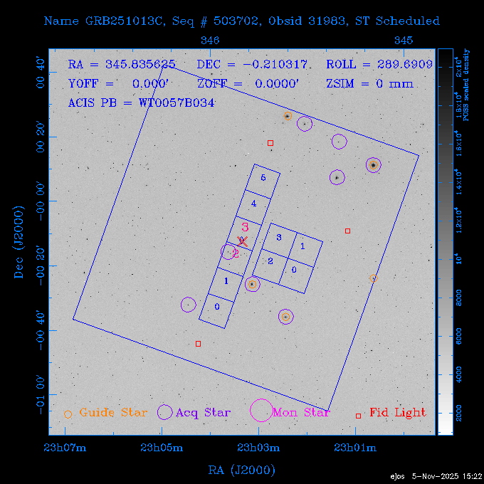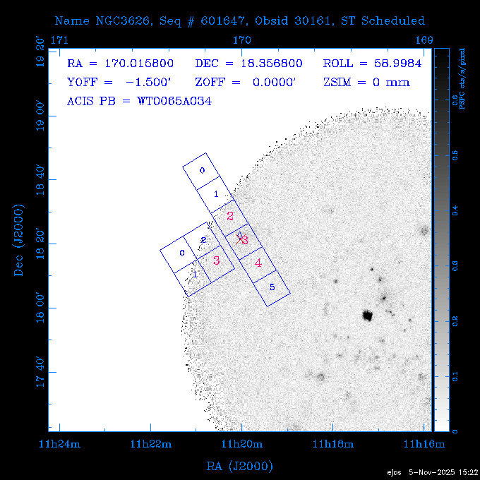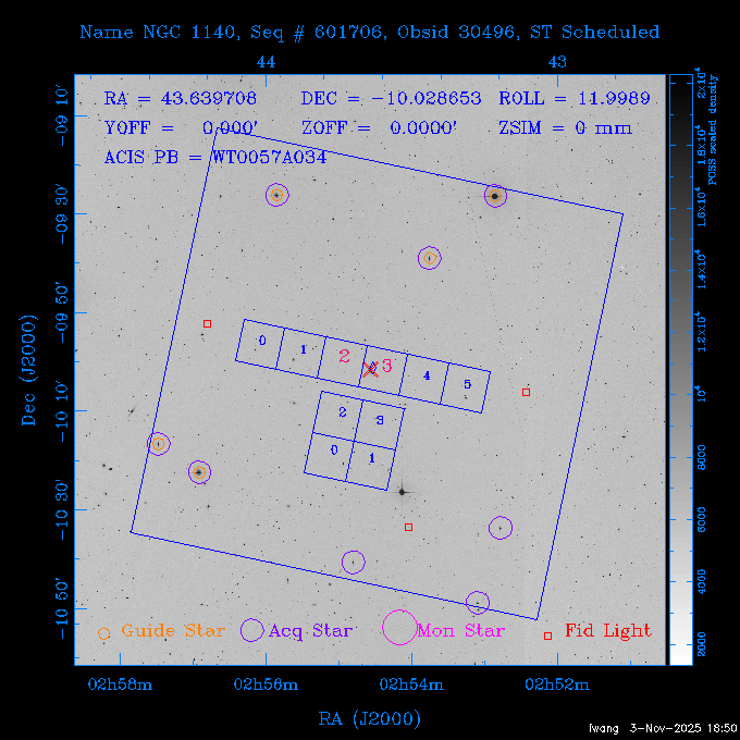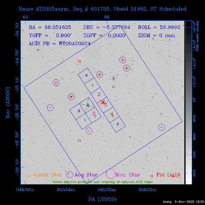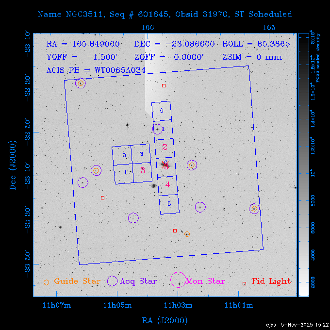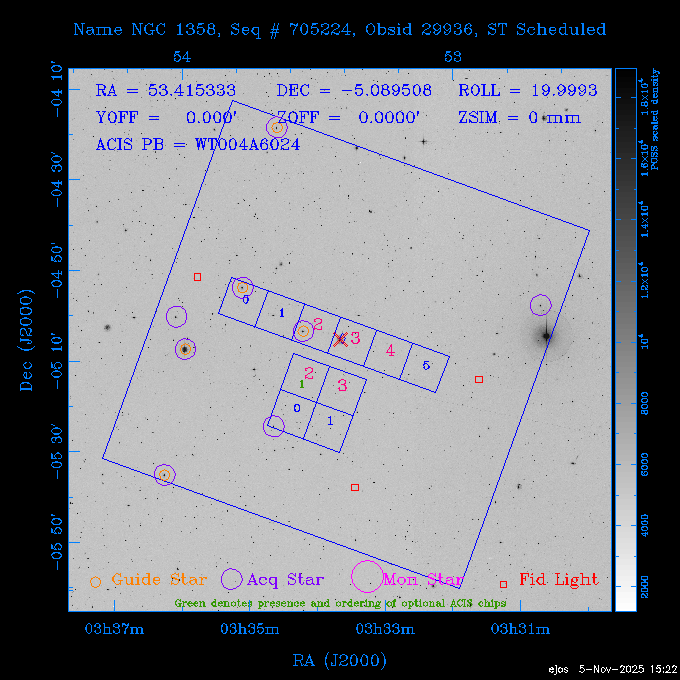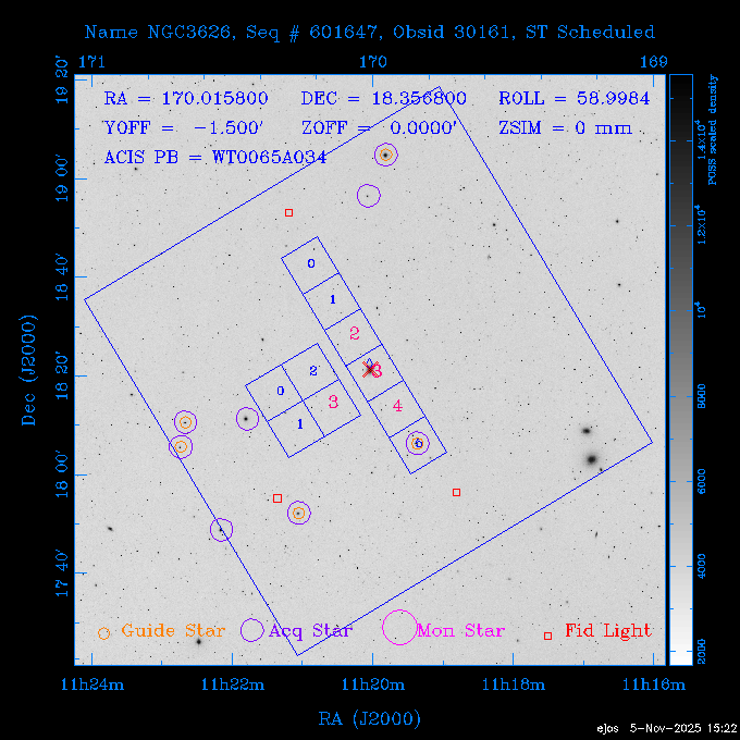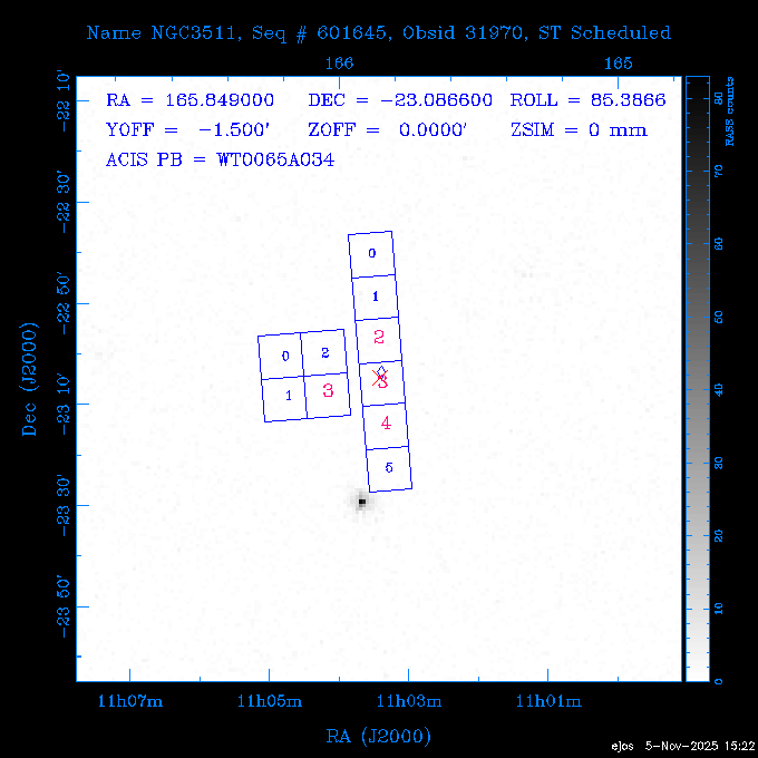 Seq # NB ObsID Constr. Target Start Time SI Grat Active Chips RA Dec Roll Pitch Slew Overlays ------ --- ----- ------- -------------------- --------------------- ----- ------ ---- ----------------- -------- -------- ------ ------ ------ ------------- ---- 41979 CAL-ER (PER06) 2025:309:17:30:00.000 2.0 -- -- 48.0000 19.0000 113.62 172.38 125.59 601644 29649 0 NGC3239 2025:309:19:01:16.422 13.0 ACIS-S NONE I3,S2,S3,S4 156.2703 17.1637 66.21 71.65 100.80 dss pspc rass 601735 DDT 31982 2 AT2025aarm 2025:309:23:13:50.132 25.0 ACIS-S NONE I3,S2,S3,S4 68.0516 -5.3777 57.00 145.77 91.78 dss pspc rass 705314 31973 0 Center of COSMOS-Web 2025:310:06:44:15.593 14.0 ACIS-I NONE I0,I1,I2,I3 149.9162 2.3085 62.00 72.78 82.16 dss pspc rass 802230 31978 0 PSZ2G144.99-24.64 2025:310:11:19:26.891 10.0 ACIS-I NONE I0,I1,I2,I3 37.1891 34.0270 174.99 161.62 118.60 dss pspc rass 503611 P1 31133 0 1eRASS J085257.4+270 2025:310:14:40:41.375 15.0 ACIS-S NONE I2,I3,S2,S3,S4 133.2400 27.0036 81.50 95.80 85.84 dss pspc rass 601706 30496 0 NGC 1140 2025:310:19:33:02.714 10.0 ACIS-S NONE S2,S3 43.6397 -10.0287 12.00 153.73 120.85 dss pspc rass 300558 30099 0 VV Pup 2025:310:22:53:56.635 28.0 ACIS-S HETG S1,S2,S3,S4 123.7783 -19.0549 72.04 92.14 84.29 dss pspc rass 601706 31979 0 NGC 1140 2025:311:07:14:50.549 11.0 ACIS-S NONE S2,S3 43.6397 -10.0287 12.00 153.62 84.29 dss pspc rass 601666 29671 0 IC5273 2025:311:10:49:34.545 20.0 ACIS-S NONE I3,S2,S3,S4 344.8613 -37.7029 303.56 103.60 71.55 dss pspc rass 705402 31680 0 SDSS J014837.63+0600 2025:311:16:51:40.792 16.2 ACIS-I NONE I0,I1,I2,I3 27.1568 6.0056 305.63 161.58 59.72 dss pspc rass ---- 41978 CAL-ER (CAL01) 2025:311:22:02:20.374 3.0 -- -- 274.0000 -37.0000 259.66 49.35 112.04 ---- 41977 CAL-ER (PER08) 2025:312:00:00:00.000 1.0 -- -- 40.0000 15.0000 297.62 176.77 127.64 ---- 41976 CAL-ER (PER09) 2025:312:01:15:00.000 1.0 -- -- 274.0000 -37.0000 259.59 49.22 127.64 ---- 41975 CAL-ER (PER10) 2025:312:02:30:00.000 2.0 -- -- 230.2000 32.0000 350.95 48.98 116.99 ---- 41974 CAL-ER (PER11) 2025:312:04:40:00.000 3.0 -- -- 19.0000 48.0000 220.53 142.80 95.29 ---- 41973 CAL-ER (PER12) 2025:312:06:45:00.000 1.0 -- -- 223.7000 71.2000 359.61 87.76 60.77 ---- 41972 CAL-ER (PER13) 2025:312:07:50:00.000 1.0 -- -- 43.1000 19.9000 183.99 176.67 88.96 ---- 41971 CAL-ER (PER14) 2025:312:09:00:00.000 1.0 -- -- 47.3000 14.9000 65.23 175.87 117.62 601645 29650 0 NGC3511 2025:312:10:08:00.040 15.5 ACIS-S NONE I3,S2,S3,S4 165.8490 -23.0866 85.65 54.21 121.81 dss pspc rass 705504 CCT 31967 0 1RXS J031639.0+15543 2025:312:15:08:35.989 10.0 ACIS-S NONE S2,S3 49.1647 15.9097 80.63 174.63 120.45 dss pspc rass 601645 31970 0 NGC3511 2025:312:18:37:32.079 16.5 ACIS-S NONE I3,S2,S3,S4 165.8490 -23.0866 85.39 54.49 120.46 dss pspc rass 601706 31980 0 NGC 1140 2025:312:23:53:44.415 12.0 ACIS-S NONE S2,S3 43.6397 -10.0287 10.00 153.15 115.68 dss pspc rass 601666 31971 0 IC5273 2025:313:03:45:00.425 27.0 ACIS-S NONE I3,S2,S3,S4 344.8613 -37.7029 302.70 102.08 70.95 dss pspc rass 705214 29926 0 SDSS J022226.11-0857 2025:313:11:42:59.390 23.0 ACIS-S NONE S2,S3 35.6088 -8.9504 341.23 152.65 56.17 dss pspc rass 705505 CCT 31968 0 2MASS J17422050-5146 2025:313:18:45:19.746 10.0 ACIS-S NONE S2,S3 265.5855 -51.7728 238.25 47.33 105.78 dss pspc rass 705402 31981 0 SDSS J014837.63+0600 2025:313:22:12:52.469 12.0 ACIS-I NONE I0,I1,I2,I3 27.1568 6.0056 303.95 159.41 114.20 dss pspc rass