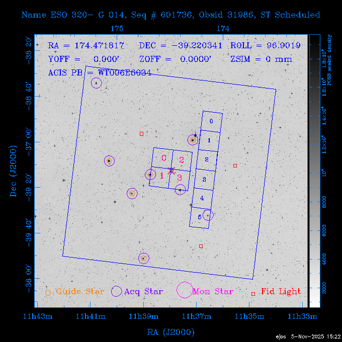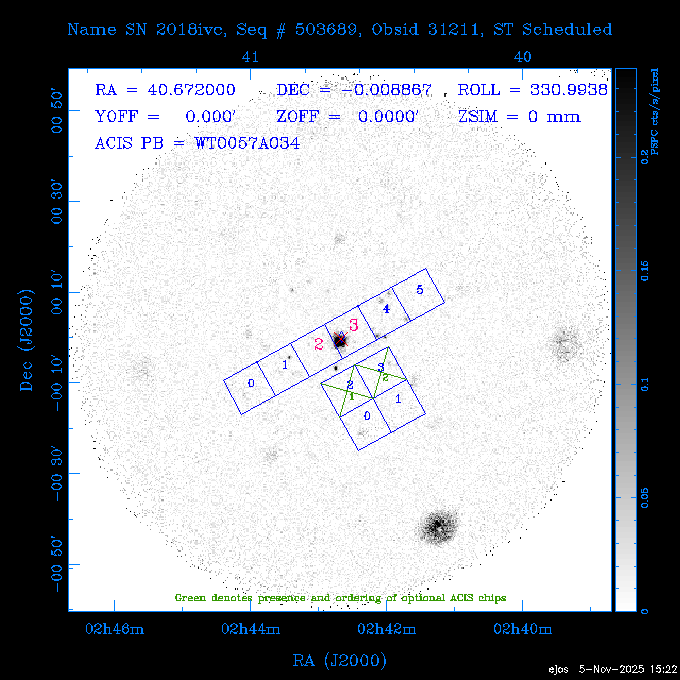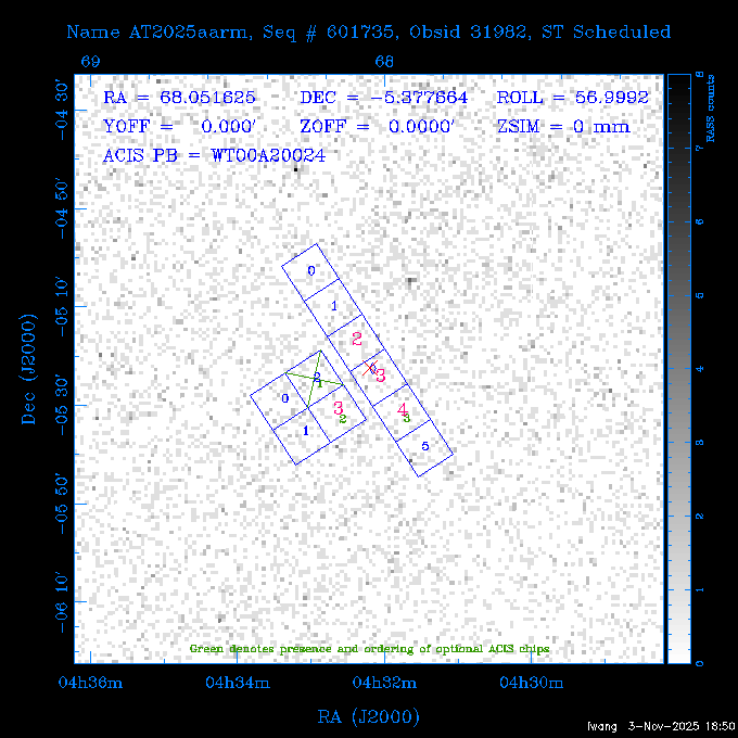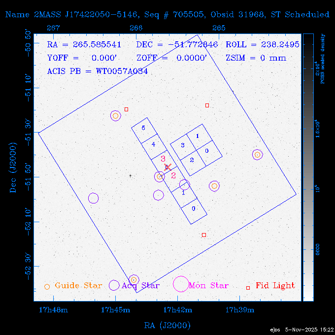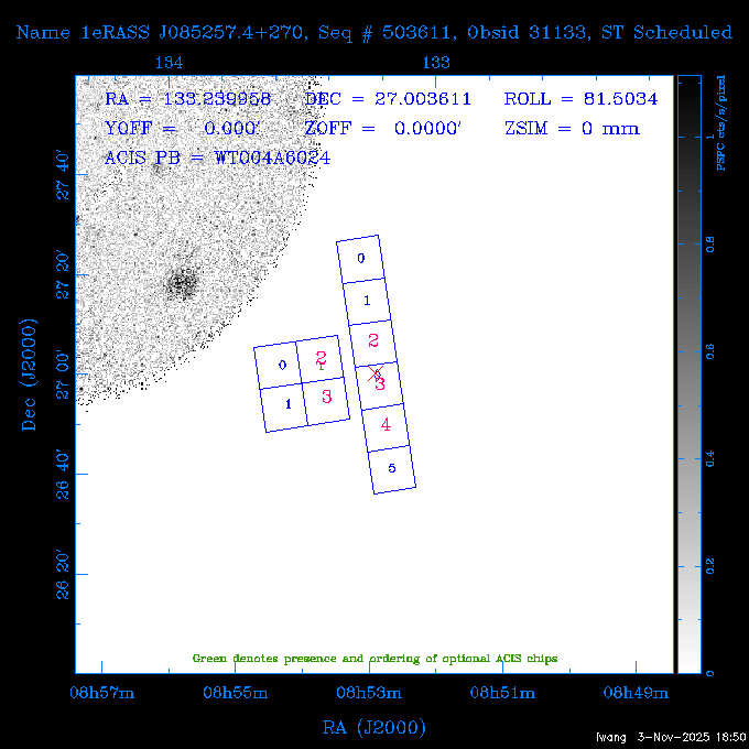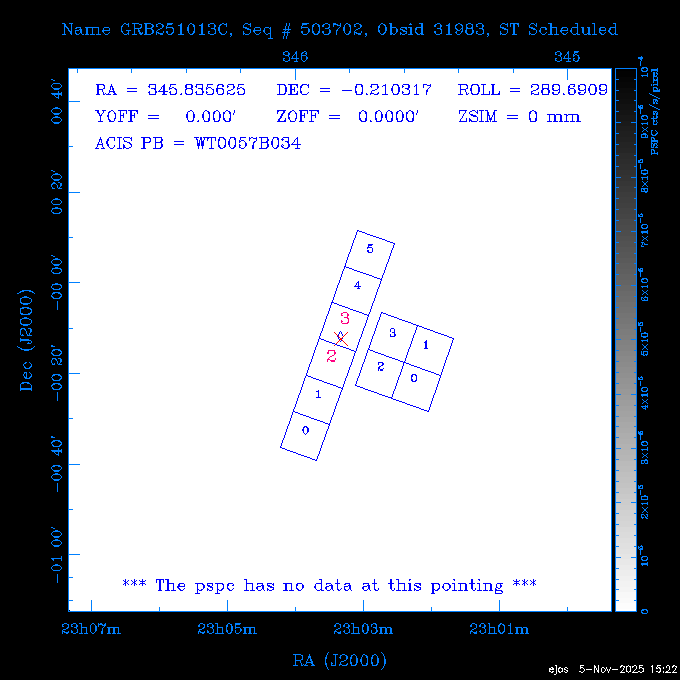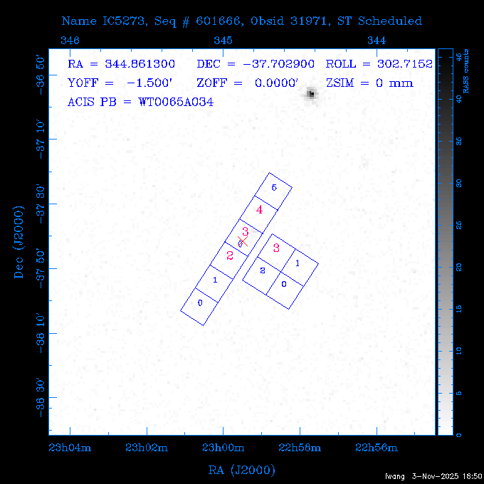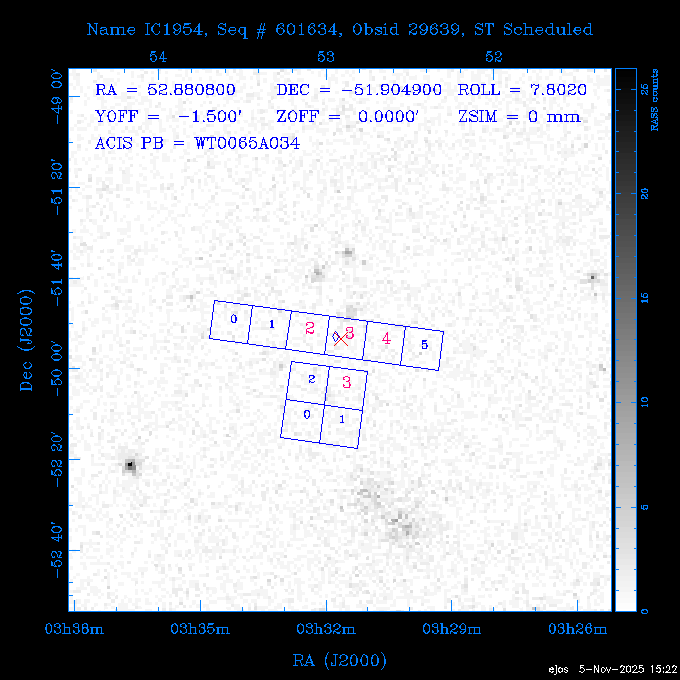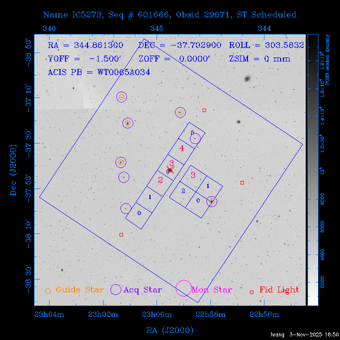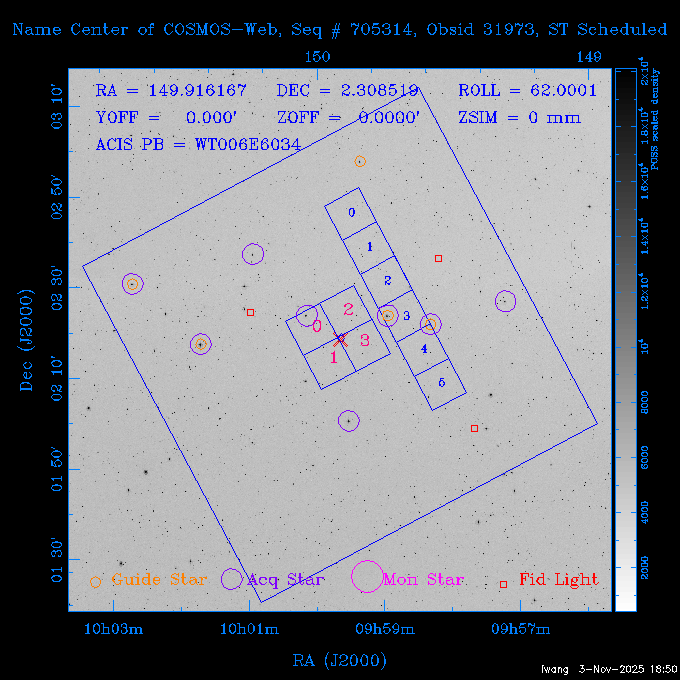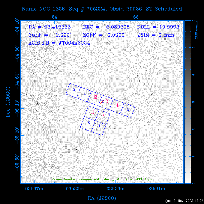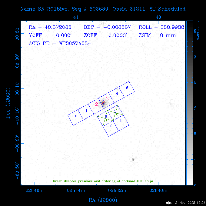 Seq # NB ObsID Constr. Target Start Time SI Grat Active Chips RA Dec Roll Pitch Slew Overlays ------ --- ----- ------- -------------------- --------------------- ----- ------ ---- ----------------- -------- -------- ------ ------ ------ ------------- ---- 41979 CAL-ER (PER06) 2025:309:17:30:00.000 2.0 -- -- 48.0000 19.0000 113.62 172.38 125.59 601644 29649 0 NGC3239 2025:309:19:01:16.422 13.0 ACIS-S NONE I3,S2,S3,S4 156.2703 17.1637 66.21 71.65 100.80 dss pspc rass 601735 DDT 31982 2 AT2025aarm 2025:309:23:13:50.132 25.0 ACIS-S NONE I3,S2,S3,S4 68.0516 -5.3777 57.00 145.77 91.78 dss pspc rass 705314 31973 0 Center of COSMOS-Web 2025:310:06:44:15.593 14.0 ACIS-I NONE I0,I1,I2,I3 149.9162 2.3085 62.00 72.78 82.16 dss pspc rass 802230 31978 0 PSZ2G144.99-24.64 2025:310:11:19:26.891 10.0 ACIS-I NONE I0,I1,I2,I3 37.1891 34.0270 174.99 161.62 118.60 dss pspc rass 503611 P1 31133 0 1eRASS J085257.4+270 2025:310:14:40:41.375 15.0 ACIS-S NONE I2,I3,S2,S3,S4 133.2400 27.0036 81.50 95.80 85.84 dss pspc rass 601706 30496 0 NGC 1140 2025:310:19:33:02.714 10.0 ACIS-S NONE S2,S3 43.6397 -10.0287 12.00 153.73 120.85 dss pspc rass 300558 30099 0 VV Pup 2025:310:22:53:56.635 28.0 ACIS-S HETG S1,S2,S3,S4 123.7783 -19.0549 72.04 92.14 84.29 dss pspc rass 601706 31979 0 NGC 1140 2025:311:07:14:50.549 11.0 ACIS-S NONE S2,S3 43.6397 -10.0287 12.00 153.62 84.29 dss pspc rass 601666 29671 0 IC5273 2025:311:10:49:34.545 20.0 ACIS-S NONE I3,S2,S3,S4 344.8613 -37.7029 303.56 103.60 71.55 dss pspc rass 705402 31680 0 SDSS J014837.63+0600 2025:311:16:51:40.792 16.2 ACIS-I NONE I0,I1,I2,I3 27.1568 6.0056 305.63 161.58 59.72 dss pspc rass ---- 41978 CAL-ER (CAL01) 2025:311:22:02:20.374 3.0 -- -- 274.0000 -37.0000 259.66 49.35 112.04 ---- 41977 CAL-ER (PER08) 2025:312:00:00:00.000 1.0 -- -- 40.0000 15.0000 297.62 176.77 127.64 ---- 41976 CAL-ER (PER09) 2025:312:01:15:00.000 1.0 -- -- 274.0000 -37.0000 259.59 49.22 127.64 ---- 41975 CAL-ER (PER10) 2025:312:02:30:00.000 2.0 -- -- 230.2000 32.0000 350.95 48.98 116.99 ---- 41974 CAL-ER (PER11) 2025:312:04:40:00.000 3.0 -- -- 19.0000 48.0000 220.53 142.80 95.29 ---- 41973 CAL-ER (PER12) 2025:312:06:45:00.000 1.0 -- -- 223.7000 71.2000 359.61 87.76 60.77 ---- 41972 CAL-ER (PER13) 2025:312:07:50:00.000 1.0 -- -- 43.1000 19.9000 183.99 176.67 88.96 ---- 41971 CAL-ER (PER14) 2025:312:09:00:00.000 1.0 -- -- 47.3000 14.9000 65.23 175.87 117.62 601645 29650 0 NGC3511 2025:312:10:08:00.040 15.5 ACIS-S NONE I3,S2,S3,S4 165.8490 -23.0866 85.65 54.21 121.81 dss pspc rass 705504 CCT 31967 0 1RXS J031639.0+15543 2025:312:15:08:35.989 10.0 ACIS-S NONE S2,S3 49.1647 15.9097 80.63 174.63 120.45 dss pspc rass 601645 31970 0 NGC3511 2025:312:18:37:32.079 16.5 ACIS-S NONE I3,S2,S3,S4 165.8490 -23.0866 85.39 54.49 120.46 dss pspc rass 601706 31980 0 NGC 1140 2025:312:23:53:44.415 12.0 ACIS-S NONE S2,S3 43.6397 -10.0287 10.00 153.15 115.68 dss pspc rass 601666 31971 0 IC5273 2025:313:03:45:00.425 27.0 ACIS-S NONE I3,S2,S3,S4 344.8613 -37.7029 302.70 102.08 70.95 dss pspc rass 705214 29926 0 SDSS J022226.11-0857 2025:313:11:42:59.390 23.0 ACIS-S NONE S2,S3 35.6088 -8.9504 341.23 152.65 56.17 dss pspc rass 705505 CCT 31968 0 2MASS J17422050-5146 2025:313:18:45:19.746 10.0 ACIS-S NONE S2,S3 265.5855 -51.7728 238.25 47.33 105.78 dss pspc rass 705402 31981 0 SDSS J014837.63+0600 2025:313:22:12:52.469 12.0 ACIS-I NONE I0,I1,I2,I3 27.1568 6.0056 303.95 159.41 114.20 dss pspc rass