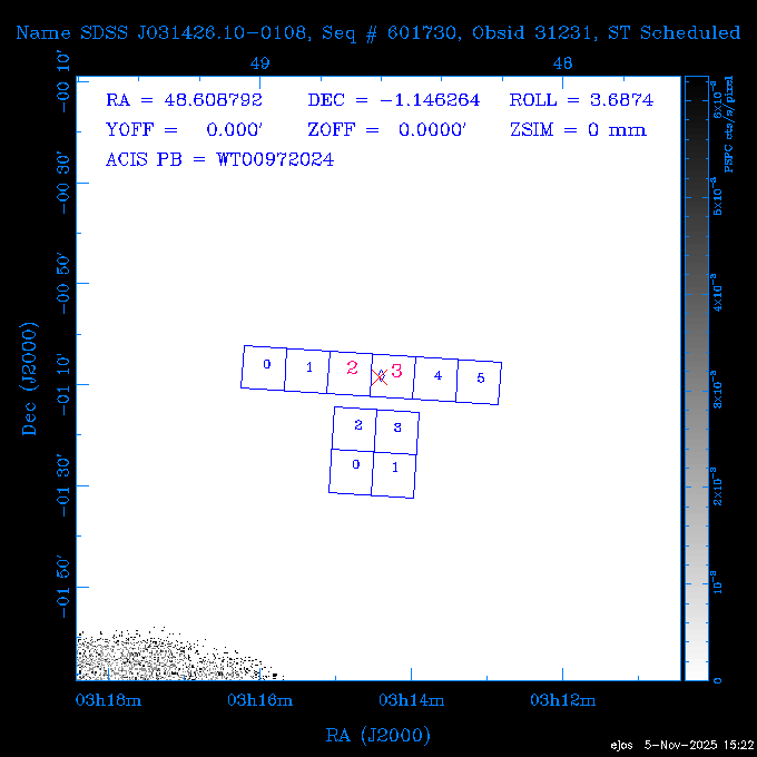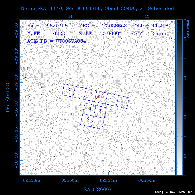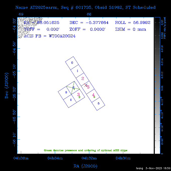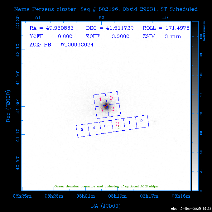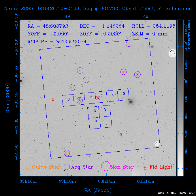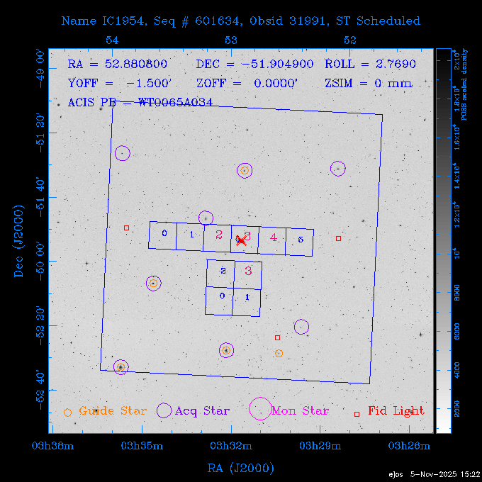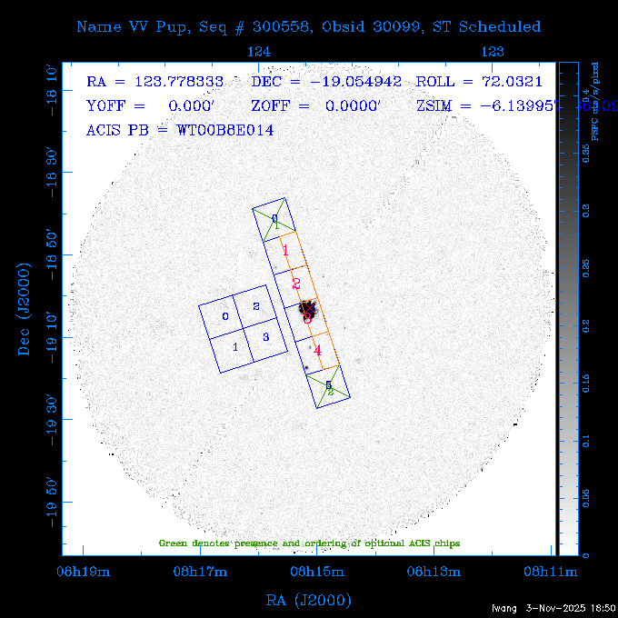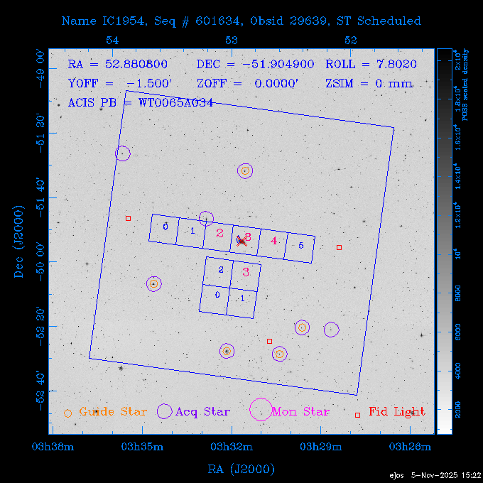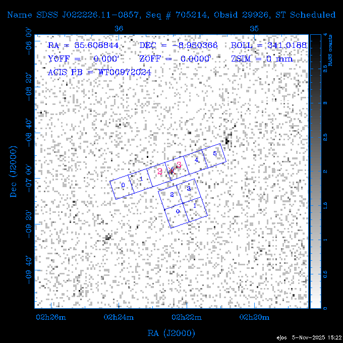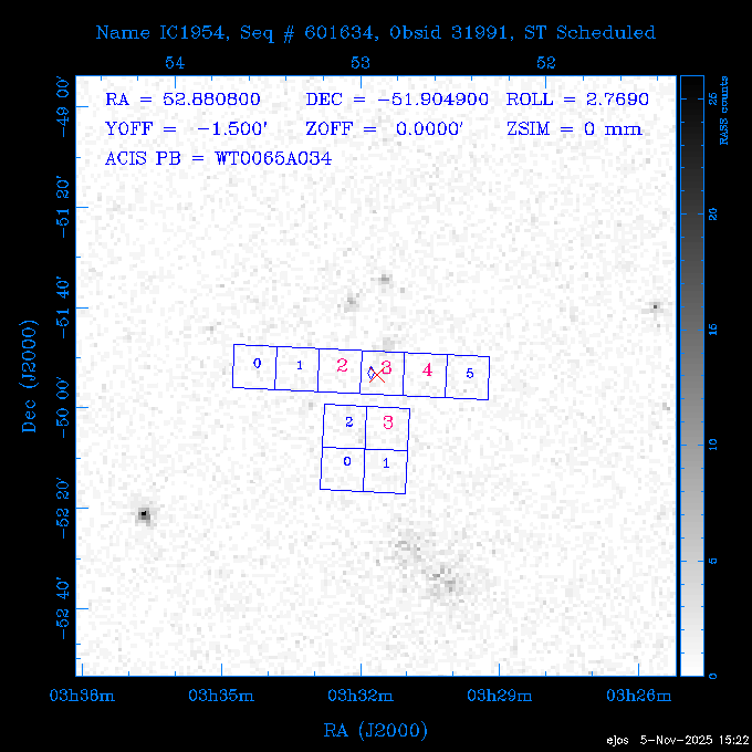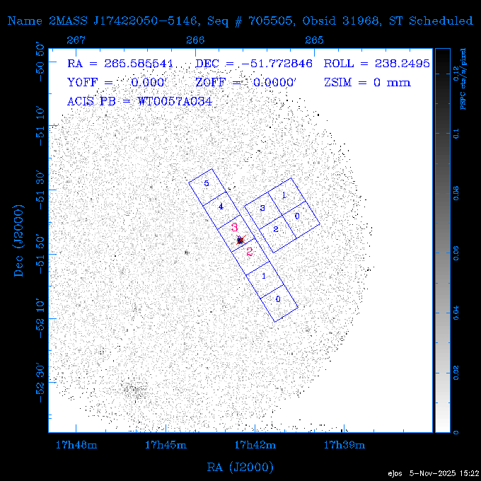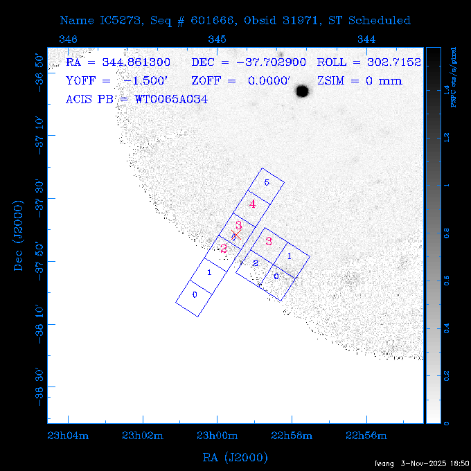 Seq # NB ObsID Constr. Target Start Time SI Grat Active Chips RA Dec Roll Pitch Slew Overlays ------ --- ----- ------- -------------------- --------------------- ----- ------ ---- ----------------- -------- -------- ------ ------ ------ ------------- ---- 41979 CAL-ER (PER06) 2025:309:17:30:00.000 2.0 -- -- 48.0000 19.0000 113.62 172.38 125.59 601644 29649 0 NGC3239 2025:309:19:01:16.422 13.0 ACIS-S NONE I3,S2,S3,S4 156.2703 17.1637 66.21 71.65 100.80 dss pspc rass 601735 DDT 31982 2 AT2025aarm 2025:309:23:13:50.132 25.0 ACIS-S NONE I3,S2,S3,S4 68.0516 -5.3777 57.00 145.77 91.78 dss pspc rass 705314 31973 0 Center of COSMOS-Web 2025:310:06:44:15.593 14.0 ACIS-I NONE I0,I1,I2,I3 149.9162 2.3085 62.00 72.78 82.16 dss pspc rass 802230 31978 0 PSZ2G144.99-24.64 2025:310:11:19:26.891 10.0 ACIS-I NONE I0,I1,I2,I3 37.1891 34.0270 174.99 161.62 118.60 dss pspc rass 503611 P1 31133 0 1eRASS J085257.4+270 2025:310:14:40:41.375 15.0 ACIS-S NONE I2,I3,S2,S3,S4 133.2400 27.0036 81.50 95.80 85.84 dss pspc rass 601706 30496 0 NGC 1140 2025:310:19:33:02.714 10.0 ACIS-S NONE S2,S3 43.6397 -10.0287 12.00 153.73 120.85 dss pspc rass 300558 30099 0 VV Pup 2025:310:22:53:56.635 28.0 ACIS-S HETG S1,S2,S3,S4 123.7783 -19.0549 72.04 92.14 84.29 dss pspc rass 601706 31979 0 NGC 1140 2025:311:07:14:50.549 11.0 ACIS-S NONE S2,S3 43.6397 -10.0287 12.00 153.62 84.29 dss pspc rass 601666 29671 0 IC5273 2025:311:10:49:34.545 20.0 ACIS-S NONE I3,S2,S3,S4 344.8613 -37.7029 303.56 103.60 71.55 dss pspc rass 705402 31680 0 SDSS J014837.63+0600 2025:311:16:51:40.792 16.2 ACIS-I NONE I0,I1,I2,I3 27.1568 6.0056 305.63 161.58 59.72 dss pspc rass ---- 41978 CAL-ER (CAL01) 2025:311:22:02:20.374 3.0 -- -- 274.0000 -37.0000 259.66 49.35 112.04 ---- 41977 CAL-ER (PER08) 2025:312:00:00:00.000 1.0 -- -- 40.0000 15.0000 297.62 176.77 127.64 ---- 41976 CAL-ER (PER09) 2025:312:01:15:00.000 1.0 -- -- 274.0000 -37.0000 259.59 49.22 127.64 ---- 41975 CAL-ER (PER10) 2025:312:02:30:00.000 2.0 -- -- 230.2000 32.0000 350.95 48.98 116.99 ---- 41974 CAL-ER (PER11) 2025:312:04:40:00.000 3.0 -- -- 19.0000 48.0000 220.53 142.80 95.29 ---- 41973 CAL-ER (PER12) 2025:312:06:45:00.000 1.0 -- -- 223.7000 71.2000 359.61 87.76 60.77 ---- 41972 CAL-ER (PER13) 2025:312:07:50:00.000 1.0 -- -- 43.1000 19.9000 183.99 176.67 88.96 ---- 41971 CAL-ER (PER14) 2025:312:09:00:00.000 1.0 -- -- 47.3000 14.9000 65.23 175.87 117.62 601645 29650 0 NGC3511 2025:312:10:08:00.040 15.5 ACIS-S NONE I3,S2,S3,S4 165.8490 -23.0866 85.65 54.21 121.81 dss pspc rass 705504 CCT 31967 0 1RXS J031639.0+15543 2025:312:15:08:35.989 10.0 ACIS-S NONE S2,S3 49.1647 15.9097 80.63 174.63 120.45 dss pspc rass 601645 31970 0 NGC3511 2025:312:18:37:32.079 16.5 ACIS-S NONE I3,S2,S3,S4 165.8490 -23.0866 85.39 54.49 120.46 dss pspc rass 601706 31980 0 NGC 1140 2025:312:23:53:44.415 12.0 ACIS-S NONE S2,S3 43.6397 -10.0287 10.00 153.15 115.68 dss pspc rass 601666 31971 0 IC5273 2025:313:03:45:00.425 27.0 ACIS-S NONE I3,S2,S3,S4 344.8613 -37.7029 302.70 102.08 70.95 dss pspc rass 705214 29926 0 SDSS J022226.11-0857 2025:313:11:42:59.390 23.0 ACIS-S NONE S2,S3 35.6088 -8.9504 341.23 152.65 56.17 dss pspc rass 705505 CCT 31968 0 2MASS J17422050-5146 2025:313:18:45:19.746 10.0 ACIS-S NONE S2,S3 265.5855 -51.7728 238.25 47.33 105.78 dss pspc rass 705402 31981 0 SDSS J014837.63+0600 2025:313:22:12:52.469 12.0 ACIS-I NONE I0,I1,I2,I3 27.1568 6.0056 303.95 159.41 114.20 dss pspc rass