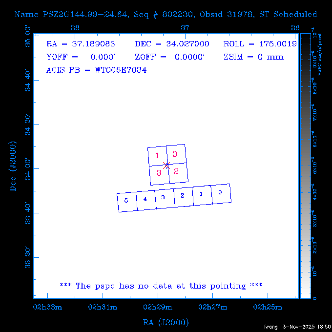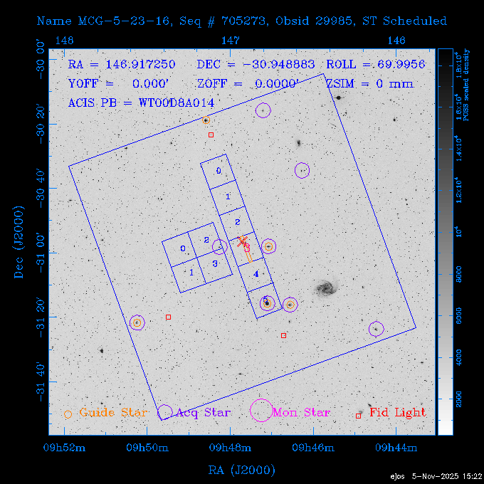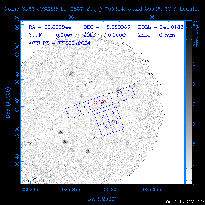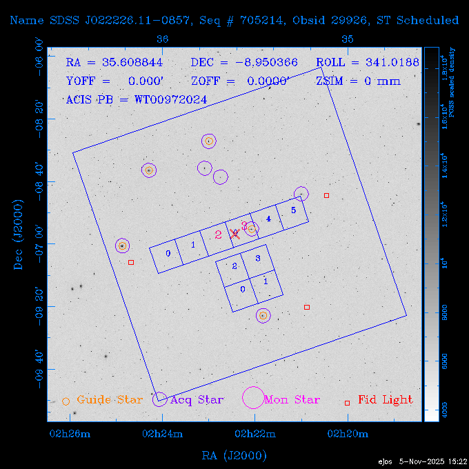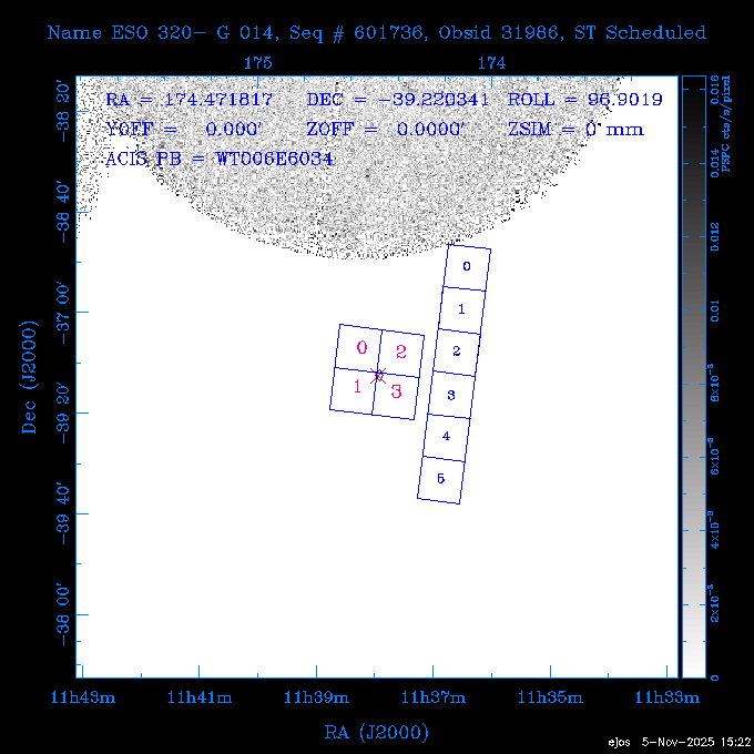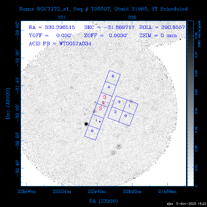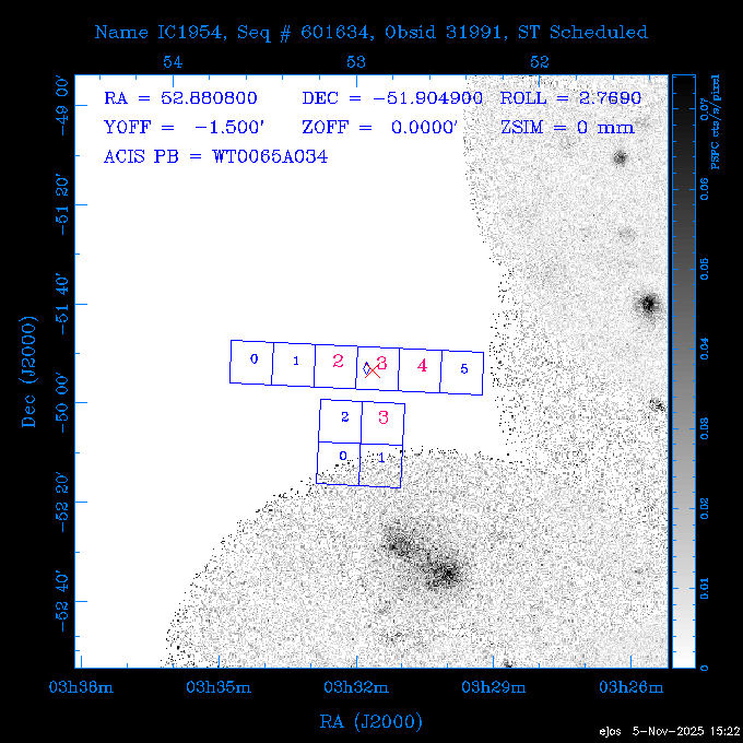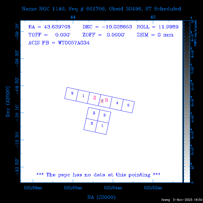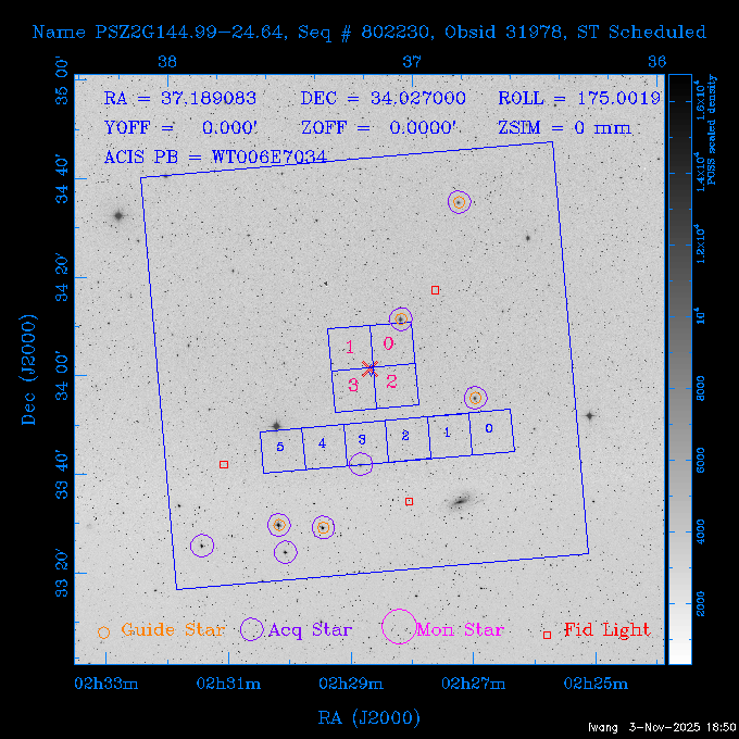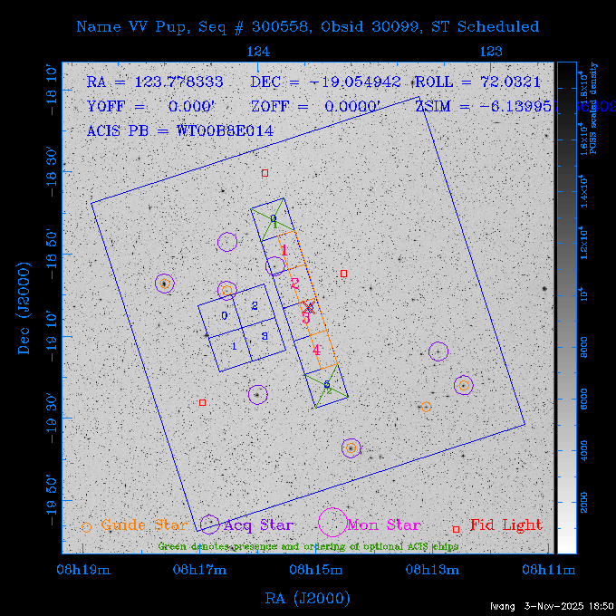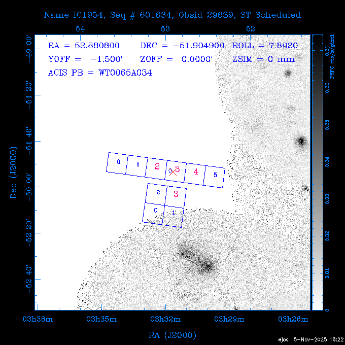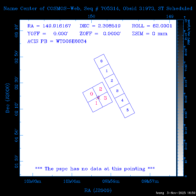 Seq # NB ObsID Constr. Target Start Time SI Grat Active Chips RA Dec Roll Pitch Slew Overlays ------ --- ----- ------- -------------------- --------------------- ----- ------ ---- ----------------- -------- -------- ------ ------ ------ ------------- ---- 41979 CAL-ER (PER06) 2025:309:17:30:00.000 2.0 -- -- 48.0000 19.0000 113.62 172.38 125.59 601644 29649 0 NGC3239 2025:309:19:01:16.422 13.0 ACIS-S NONE I3,S2,S3,S4 156.2703 17.1637 66.21 71.65 100.80 dss pspc rass 601735 DDT 31982 2 AT2025aarm 2025:309:23:13:50.132 25.0 ACIS-S NONE I3,S2,S3,S4 68.0516 -5.3777 57.00 145.77 91.78 dss pspc rass 705314 31973 0 Center of COSMOS-Web 2025:310:06:44:15.593 14.0 ACIS-I NONE I0,I1,I2,I3 149.9162 2.3085 62.00 72.78 82.16 dss pspc rass 802230 31978 0 PSZ2G144.99-24.64 2025:310:11:19:26.891 10.0 ACIS-I NONE I0,I1,I2,I3 37.1891 34.0270 174.99 161.62 118.60 dss pspc rass 503611 P1 31133 0 1eRASS J085257.4+270 2025:310:14:40:41.375 15.0 ACIS-S NONE I2,I3,S2,S3,S4 133.2400 27.0036 81.50 95.80 85.84 dss pspc rass 601706 30496 0 NGC 1140 2025:310:19:33:02.714 10.0 ACIS-S NONE S2,S3 43.6397 -10.0287 12.00 153.73 120.85 dss pspc rass 300558 30099 0 VV Pup 2025:310:22:53:56.635 28.0 ACIS-S HETG S1,S2,S3,S4 123.7783 -19.0549 72.04 92.14 84.29 dss pspc rass 601706 31979 0 NGC 1140 2025:311:07:14:50.549 11.0 ACIS-S NONE S2,S3 43.6397 -10.0287 12.00 153.62 84.29 dss pspc rass 601666 29671 0 IC5273 2025:311:10:49:34.545 20.0 ACIS-S NONE I3,S2,S3,S4 344.8613 -37.7029 303.56 103.60 71.55 dss pspc rass 705402 31680 0 SDSS J014837.63+0600 2025:311:16:51:40.792 16.2 ACIS-I NONE I0,I1,I2,I3 27.1568 6.0056 305.63 161.58 59.72 dss pspc rass ---- 41978 CAL-ER (CAL01) 2025:311:22:02:20.374 3.0 -- -- 274.0000 -37.0000 259.66 49.35 112.04 ---- 41977 CAL-ER (PER08) 2025:312:00:00:00.000 1.0 -- -- 40.0000 15.0000 297.62 176.77 127.64 ---- 41976 CAL-ER (PER09) 2025:312:01:15:00.000 1.0 -- -- 274.0000 -37.0000 259.59 49.22 127.64 ---- 41975 CAL-ER (PER10) 2025:312:02:30:00.000 2.0 -- -- 230.2000 32.0000 350.95 48.98 116.99 ---- 41974 CAL-ER (PER11) 2025:312:04:40:00.000 3.0 -- -- 19.0000 48.0000 220.53 142.80 95.29 ---- 41973 CAL-ER (PER12) 2025:312:06:45:00.000 1.0 -- -- 223.7000 71.2000 359.61 87.76 60.77 ---- 41972 CAL-ER (PER13) 2025:312:07:50:00.000 1.0 -- -- 43.1000 19.9000 183.99 176.67 88.96 ---- 41971 CAL-ER (PER14) 2025:312:09:00:00.000 1.0 -- -- 47.3000 14.9000 65.23 175.87 117.62 601645 29650 0 NGC3511 2025:312:10:08:00.040 15.5 ACIS-S NONE I3,S2,S3,S4 165.8490 -23.0866 85.65 54.21 121.81 dss pspc rass 705504 CCT 31967 0 1RXS J031639.0+15543 2025:312:15:08:35.989 10.0 ACIS-S NONE S2,S3 49.1647 15.9097 80.63 174.63 120.45 dss pspc rass 601645 31970 0 NGC3511 2025:312:18:37:32.079 16.5 ACIS-S NONE I3,S2,S3,S4 165.8490 -23.0866 85.39 54.49 120.46 dss pspc rass 601706 31980 0 NGC 1140 2025:312:23:53:44.415 12.0 ACIS-S NONE S2,S3 43.6397 -10.0287 10.00 153.15 115.68 dss pspc rass 601666 31971 0 IC5273 2025:313:03:45:00.425 27.0 ACIS-S NONE I3,S2,S3,S4 344.8613 -37.7029 302.70 102.08 70.95 dss pspc rass 705214 29926 0 SDSS J022226.11-0857 2025:313:11:42:59.390 23.0 ACIS-S NONE S2,S3 35.6088 -8.9504 341.23 152.65 56.17 dss pspc rass 705505 CCT 31968 0 2MASS J17422050-5146 2025:313:18:45:19.746 10.0 ACIS-S NONE S2,S3 265.5855 -51.7728 238.25 47.33 105.78 dss pspc rass 705402 31981 0 SDSS J014837.63+0600 2025:313:22:12:52.469 12.0 ACIS-I NONE I0,I1,I2,I3 27.1568 6.0056 303.95 159.41 114.20 dss pspc rass