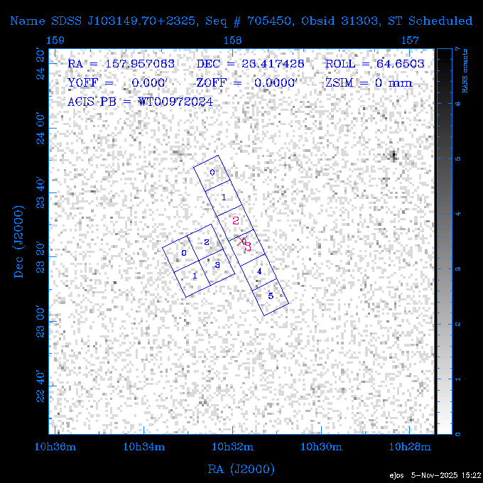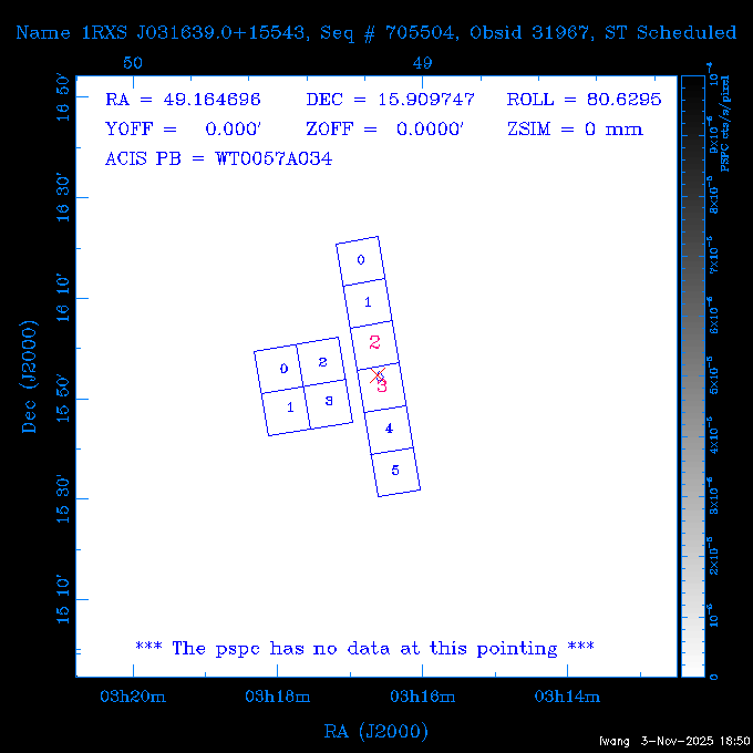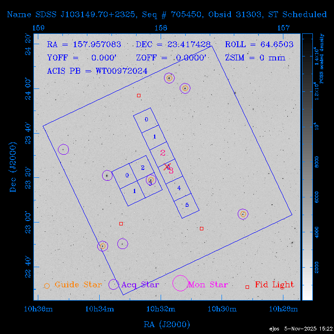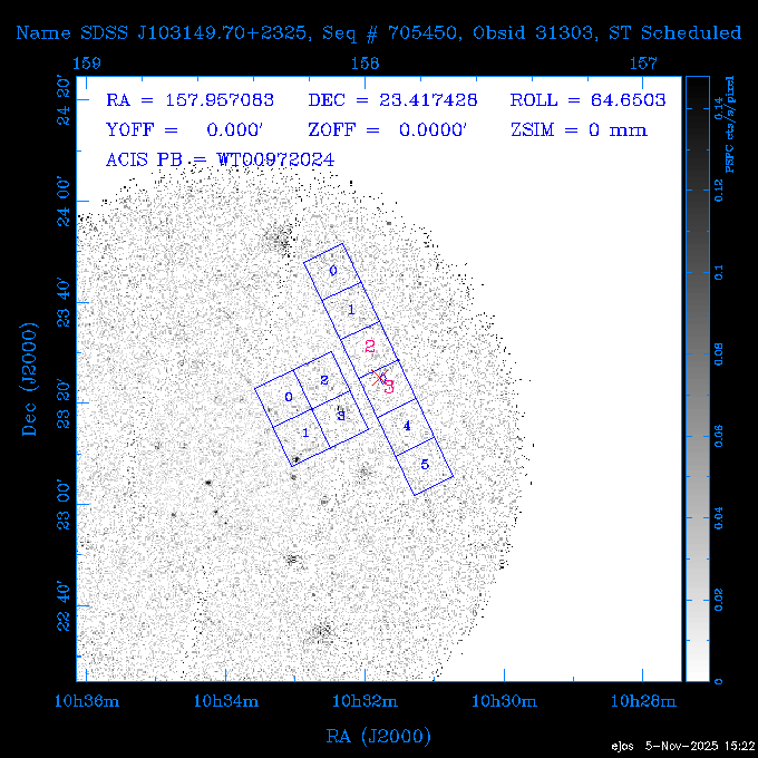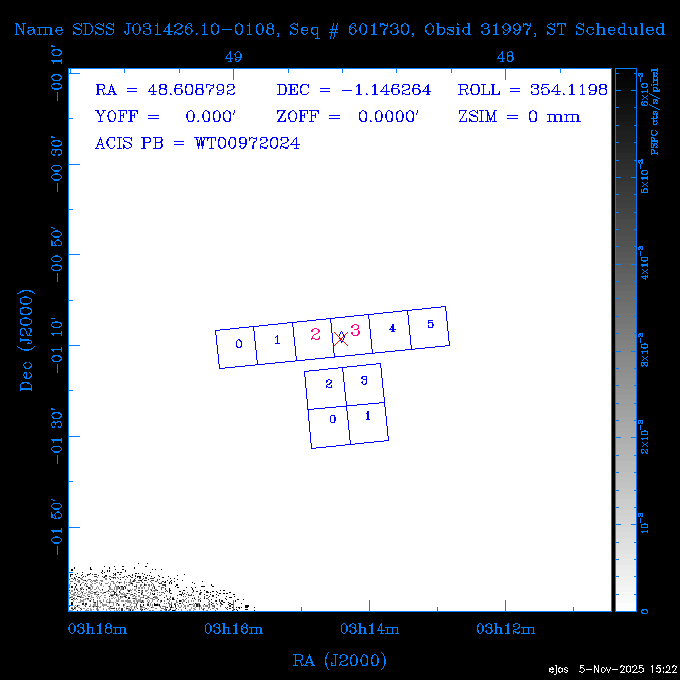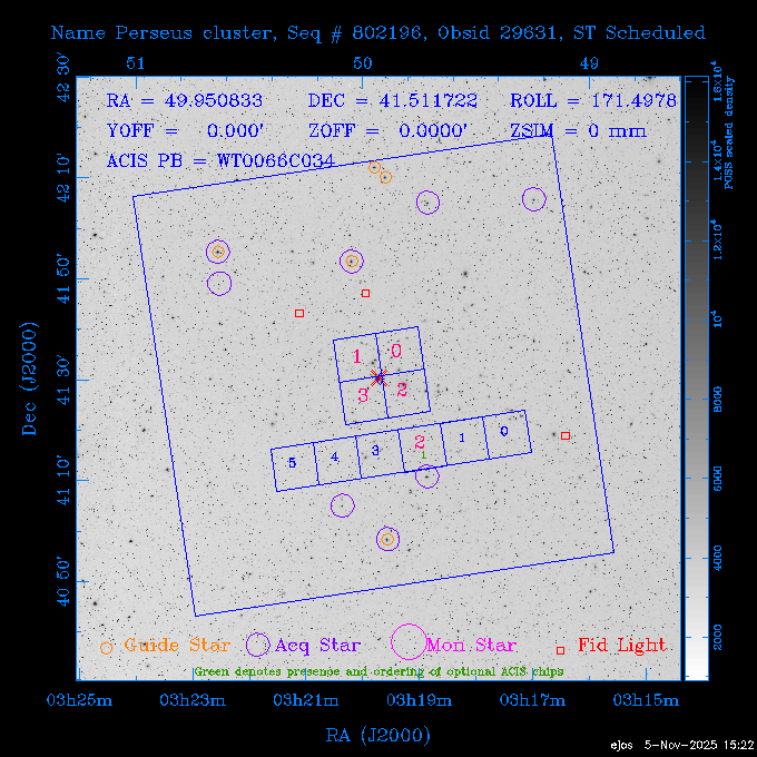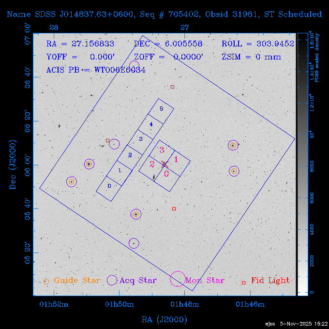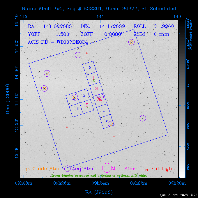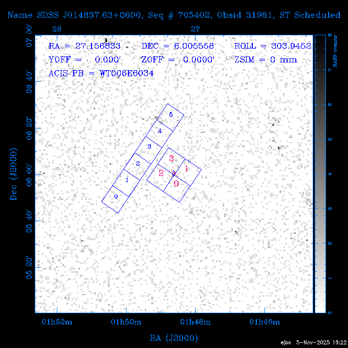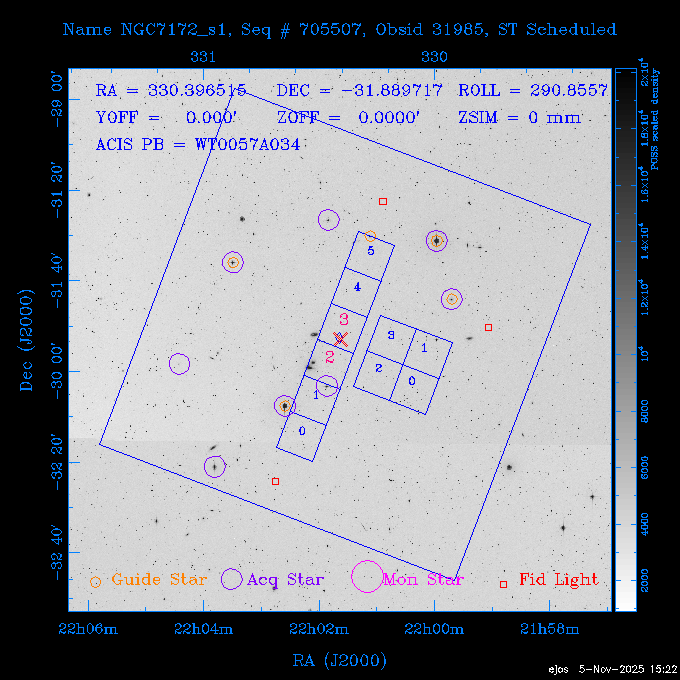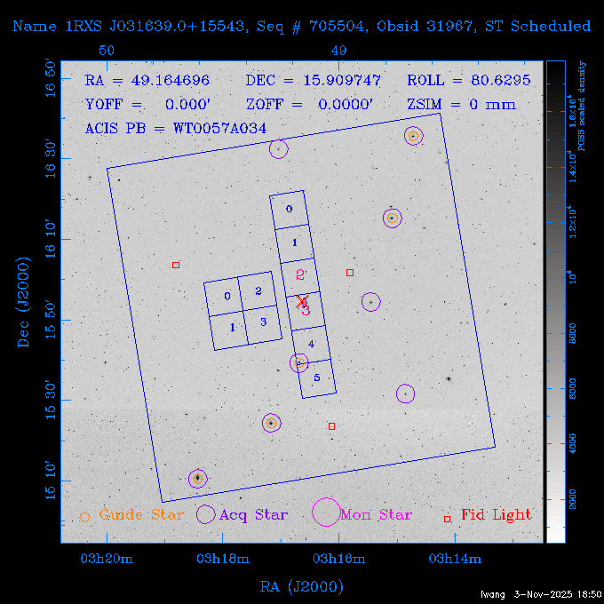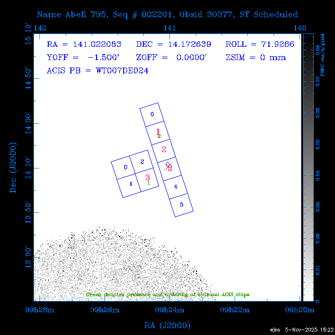 Seq # NB ObsID Constr. Target Start Time SI Grat Active Chips RA Dec Roll Pitch Slew Overlays ------ --- ----- ------- -------------------- --------------------- ----- ------ ---- ----------------- -------- -------- ------ ------ ------ ------------- ---- 41979 CAL-ER (PER06) 2025:309:17:30:00.000 2.0 -- -- 48.0000 19.0000 113.62 172.38 125.59 601644 29649 0 NGC3239 2025:309:19:01:16.422 13.0 ACIS-S NONE I3,S2,S3,S4 156.2703 17.1637 66.21 71.65 100.80 dss pspc rass 601735 DDT 31982 2 AT2025aarm 2025:309:23:13:50.132 25.0 ACIS-S NONE I3,S2,S3,S4 68.0516 -5.3777 57.00 145.77 91.78 dss pspc rass 705314 31973 0 Center of COSMOS-Web 2025:310:06:44:15.593 14.0 ACIS-I NONE I0,I1,I2,I3 149.9162 2.3085 62.00 72.78 82.16 dss pspc rass 802230 31978 0 PSZ2G144.99-24.64 2025:310:11:19:26.891 10.0 ACIS-I NONE I0,I1,I2,I3 37.1891 34.0270 174.99 161.62 118.60 dss pspc rass 503611 P1 31133 0 1eRASS J085257.4+270 2025:310:14:40:41.375 15.0 ACIS-S NONE I2,I3,S2,S3,S4 133.2400 27.0036 81.50 95.80 85.84 dss pspc rass 601706 30496 0 NGC 1140 2025:310:19:33:02.714 10.0 ACIS-S NONE S2,S3 43.6397 -10.0287 12.00 153.73 120.85 dss pspc rass 300558 30099 0 VV Pup 2025:310:22:53:56.635 28.0 ACIS-S HETG S1,S2,S3,S4 123.7783 -19.0549 72.04 92.14 84.29 dss pspc rass 601706 31979 0 NGC 1140 2025:311:07:14:50.549 11.0 ACIS-S NONE S2,S3 43.6397 -10.0287 12.00 153.62 84.29 dss pspc rass 601666 29671 0 IC5273 2025:311:10:49:34.545 20.0 ACIS-S NONE I3,S2,S3,S4 344.8613 -37.7029 303.56 103.60 71.55 dss pspc rass 705402 31680 0 SDSS J014837.63+0600 2025:311:16:51:40.792 16.2 ACIS-I NONE I0,I1,I2,I3 27.1568 6.0056 305.63 161.58 59.72 dss pspc rass ---- 41978 CAL-ER (CAL01) 2025:311:22:02:20.374 3.0 -- -- 274.0000 -37.0000 259.66 49.35 112.04 ---- 41977 CAL-ER (PER08) 2025:312:00:00:00.000 1.0 -- -- 40.0000 15.0000 297.62 176.77 127.64 ---- 41976 CAL-ER (PER09) 2025:312:01:15:00.000 1.0 -- -- 274.0000 -37.0000 259.59 49.22 127.64 ---- 41975 CAL-ER (PER10) 2025:312:02:30:00.000 2.0 -- -- 230.2000 32.0000 350.95 48.98 116.99 ---- 41974 CAL-ER (PER11) 2025:312:04:40:00.000 3.0 -- -- 19.0000 48.0000 220.53 142.80 95.29 ---- 41973 CAL-ER (PER12) 2025:312:06:45:00.000 1.0 -- -- 223.7000 71.2000 359.61 87.76 60.77 ---- 41972 CAL-ER (PER13) 2025:312:07:50:00.000 1.0 -- -- 43.1000 19.9000 183.99 176.67 88.96 ---- 41971 CAL-ER (PER14) 2025:312:09:00:00.000 1.0 -- -- 47.3000 14.9000 65.23 175.87 117.62 601645 29650 0 NGC3511 2025:312:10:08:00.040 15.5 ACIS-S NONE I3,S2,S3,S4 165.8490 -23.0866 85.65 54.21 121.81 dss pspc rass 705504 CCT 31967 0 1RXS J031639.0+15543 2025:312:15:08:35.989 10.0 ACIS-S NONE S2,S3 49.1647 15.9097 80.63 174.63 120.45 dss pspc rass 601645 31970 0 NGC3511 2025:312:18:37:32.079 16.5 ACIS-S NONE I3,S2,S3,S4 165.8490 -23.0866 85.39 54.49 120.46 dss pspc rass 601706 31980 0 NGC 1140 2025:312:23:53:44.415 12.0 ACIS-S NONE S2,S3 43.6397 -10.0287 10.00 153.15 115.68 dss pspc rass 601666 31971 0 IC5273 2025:313:03:45:00.425 27.0 ACIS-S NONE I3,S2,S3,S4 344.8613 -37.7029 302.70 102.08 70.95 dss pspc rass 705214 29926 0 SDSS J022226.11-0857 2025:313:11:42:59.390 23.0 ACIS-S NONE S2,S3 35.6088 -8.9504 341.23 152.65 56.17 dss pspc rass 705505 CCT 31968 0 2MASS J17422050-5146 2025:313:18:45:19.746 10.0 ACIS-S NONE S2,S3 265.5855 -51.7728 238.25 47.33 105.78 dss pspc rass 705402 31981 0 SDSS J014837.63+0600 2025:313:22:12:52.469 12.0 ACIS-I NONE I0,I1,I2,I3 27.1568 6.0056 303.95 159.41 114.20 dss pspc rass