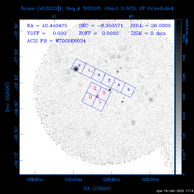 Seq # NB ObsID Constr. Target Start Time SI Grat Active Chips RA Dec Roll Pitch Slew Overlays ------ --- ----- ------- -------------------- --------------------- ----- ------ ---- ----------------- -------- -------- ------ ------ ------ ------------- ---- 42023 CAL-ER (IAT01) 2025:292:22:39:14.030 0.9 -- -- 61.0148 -38.8639 42.72 120.29 161.50 705305 30233 0 [vD2023]1 2025:292:23:18:23.778 10.0 ACIS-I NONE I0,I1,I2,I3 40.4405 -8.3506 40.75 155.56 36.25 dss pspc rass 601733 CCT 31925 0 ESO 567- G 048 2025:293:02:45:09.986 10.0 ACIS-I NONE I0,I1,I2,I3 154.9236 -17.7499 91.84 48.67 110.72 dss pspc rass 705305 31931 0 [vD2023]1 2025:293:06:11:56.852 9.7 ACIS-I NONE I0,I1,I2,I3 40.4405 -8.3506 40.10 155.66 110.77 dss pspc rass ---- 42022 CAL-ER (PER01) 2025:293:09:17:08.419 3.0 -- -- 30.4489 8.4611 70.34 174.21 35.88 ---- 42021 CAL-ER (PER02) 2025:293:15:00:00.000 3.0 -- -- 56.0127 38.9448 127.69 140.40 76.95 ---- 42020 CAL-ER (PER03) 2025:293:18:15:00.000 3.0 -- -- 150.5000 -5.3000 80.88 54.47 97.16 ---- 42019 CAL-ER (PER04) 2025:293:21:00:00.000 0.9 -- -- 32.6476 8.8853 76.28 172.67 118.58 201817 30518 4 WR 11 2025:293:22:58:05.632 20.0 ACIS-S HETG S0,S1,S2,S3,S4,S5 122.3831 -47.3366 87.81 77.56 99.64 dss pspc rass 705305 31932 0 [vD2023]1 2025:294:05:04:21.211 10.0 ACIS-I NONE I0,I1,I2,I3 40.4405 -8.3506 42.00 155.96 78.42 dss pspc rass 601643 29648 0 NGC3137 2025:294:08:29:45.756 12.4 ACIS-S NONE I3,S2,S3,S4 152.2809 -29.0642 97.01 53.07 104.59 dss pspc rass 705305 30236 0 [vD2023]1 2025:294:12:35:12.942 10.5 ACIS-I NONE I0,I1,I2,I3 40.4405 -8.3506 37.11 156.03 104.79 dss pspc rass 601643 31928 0 NGC3137 2025:294:16:09:01.259 12.0 ACIS-S NONE I3,S2,S3,S4 152.2809 -29.0642 98.39 53.26 104.87 dss pspc rass 705305 31933 0 [vD2023]1 2025:294:20:07:50.238 10.0 ACIS-I NONE I0,I1,I2,I3 40.4405 -8.3506 36.38 156.12 104.92 dss pspc rass 601643 31929 0 NGC3137 2025:294:23:33:18.955 12.0 ACIS-S NONE I3,S2,S3,S4 152.2809 -29.0642 98.11 53.46 104.90 dss pspc rass 705305 31934 0 [vD2023]1 2025:295:03:32:08.355 10.0 ACIS-I NONE I0,I1,I2,I3 40.4405 -8.3506 35.66 156.20 104.96 dss pspc rass 601643 31930 0 NGC3137 2025:295:06:57:39.780 12.0 ACIS-S NONE I3,S2,S3,S4 152.2809 -29.0642 100.01 53.66 105.11 dss pspc rass 705402 31683 0 SDSS J014837.63+0600 2025:295:11:01:15.629 10.0 ACIS-I NONE I0,I1,I2,I3 27.1568 6.0056 20.00 174.85 126.44 dss pspc rass 201896 CCT 31926 0 V* CE Ant 2025:295:14:32:21.820 5.0 ACIS-S NONE S2,S3 160.6248 -33.6713 106.81 47.86 130.21 dss pspc rass 601635 30147 0 NGC1546 2025:295:16:26:01.312 28.9 ACIS-S NONE I3,S2,S3,S4 63.6518 -56.0609 37.50 106.17 66.71 dss pspc rass ---- 42018 CAL-ER (CAL01) 2025:296:00:59:31.782 3.0 -- -- 30.4489 8.4611 46.08 175.88 73.85 ---- 42017 CAL-ER (PER05) 2025:296:07:00:00.000 3.0 -- -- 85.6457 -20.1700 66.31 114.84 62.78 ---- 42016 CAL-ER (PER06) 2025:296:08:05:26.608 3.0 -- -- 77.9432 -27.1745 58.46 117.89 11.01 ---- 42015 CAL-ER (CAL01) 2025:296:11:00:00.000 3.0 -- -- 150.5000 -5.3000 79.77 56.99 72.11 ---- 42014 CAL-ER (CAL01) 2025:296:12:32:09.275 0.9 -- -- 32.6476 8.8853 60.42 174.66 119.95 201818 30519 4 WR 11 2025:296:14:21:34.515 18.5 ACIS-S HETG S0,S1,S2,S3,S4,S5 122.3831 -47.3366 85.33 78.58 97.34 dss pspc rass 705402 31946 0 SDSS J014837.63+0600 2025:296:20:08:23.390 9.6 ACIS-I NONE I0,I1,I2,I3 27.1568 6.0056 0.00 174.28 103.42 dss pspc rass 300557 TOO 31939 2 V1935 Cen 2025:296:23:32:00.451 10.0 ACIS-S HETG S0,S1,S2,S3,S4,S5 219.3408 -58.7948 194.68 47.84 126.53 dss pspc rass 705402 31947 0 SDSS J014837.63+0600 2025:297:03:02:16.081 9.6 ACIS-I NONE I0,I1,I2,I3 27.1568 6.0056 347.20 174.13 126.42 dss pspc rass 300557 TOO 31940 2 V1935 Cen 2025:297:06:25:51.636 10.0 ACIS-S HETG S0,S1,S2,S3,S4,S5 219.3408 -58.7948 194.36 47.71 126.42 dss pspc rass 705402 31948 0 SDSS J014837.63+0600 2025:297:09:56:07.869 9.6 ACIS-I NONE I0,I1,I2,I3 27.1568 6.0056 344.99 173.97 126.47 dss pspc rass 300557 TOO 31941 2 V1935 Cen 2025:297:13:19:43.987 10.0 ACIS-S HETG S0,S1,S2,S3,S4,S5 219.3408 -58.7948 194.03 47.57 126.46 dss pspc rass 705402 31949 0 SDSS J014837.63+0600 2025:297:16:50:00.986 9.6 ACIS-I NONE I0,I1,I2,I3 27.1568 6.0056 342.87 173.80 126.53 dss pspc rass 300557 TOO 31942 2 V1935 Cen 2025:297:20:13:37.832 10.0 ACIS-S HETG S0,S1,S2,S3,S4,S5 219.3408 -58.7948 193.69 47.44 126.51 dss pspc rass 705402 31937 0 SDSS J014837.63+0600 2025:297:23:44:05.418 9.6 ACIS-I NONE I0,I1,I2,I3 27.1568 6.0056 330.00 173.63 127.32 dss pspc rass 300557 TOO 29799 2 V1935 Cen 2025:298:03:07:52.595 10.6 ACIS-S HETG S0,S1,S2,S3,S4,S5 219.3408 -58.7948 193.35 47.32 127.29 dss pspc rass 705402 31950 0 SDSS J014837.63+0600 2025:298:06:48:11.551 10.0 ACIS-I NONE I0,I1,I2,I3 27.1568 6.0056 338.81 173.44 126.67 dss pspc rass 300557 TOO 31943 2 V1935 Cen 2025:298:10:18:29.922 19.9 ACIS-S HETG S0,S1,S2,S3,S4,S5 219.3408 -58.7948 192.45 47.19 126.63 dss pspc rass ---- 42013 CAL-ER (CAL01) 2025:298:16:35:09.895 3.0 -- -- 30.9395 8.2226 13.59 175.88 129.68 ---- 42012 CAL-ER (PER07) 2025:298:23:00:00.000 3.0 -- -- 343.2184 -44.6733 310.94 108.90 80.14 ---- 42011 CAL-ER (CAL01) 2025:299:01:55:00.000 0.9 -- -- 30.9395 8.2226 7.78 175.82 77.42 ---- 42010 CAL-ER (CAL01) 2025:299:02:54:27.236 3.0 -- -- 166.2000 -47.0000 118.25 50.63 127.22 ---- 42009 CAL-ER (PER08) 2025:299:04:32:05.063 0.9 -- -- 256.3285 3.7973 290.31 48.37 144.59 802205 31935 0 MACS J0018.5+1626 2025:299:06:22:05.286 10.0 ACIS-I NONE I0,I1,I2,I3 4.6388 16.4433 264.33 154.61 106.36 dss pspc rass 705501 CCT 31923 0 2MASXiJ1802473-14545 2025:299:09:46:04.570 10.0 ACIS-S NONE S2,S3,S4 270.6974 -14.9152 275.66 58.19 98.20 dss pspc rass 802205 31936 0 MACS J0018.5+1626 2025:299:13:10:03.503 10.0 ACIS-I NONE I0,I1,I2,I3 4.6388 16.4433 264.70 154.39 98.17 dss pspc rass 201897 CCT 31927 0 HEP G355.212-00.921 2025:299:16:36:18.304 10.0 ACIS-I NONE I0,I1,I2,I3 264.3604 -33.4878 259.97 52.74 108.36 dss pspc rass 705402 31938 0 SDSS J014837.63+0600 2025:299:20:05:28.292 10.0 ACIS-I NONE I0,I1,I2,I3 27.1568 6.0056 330.08 172.31 121.50 d